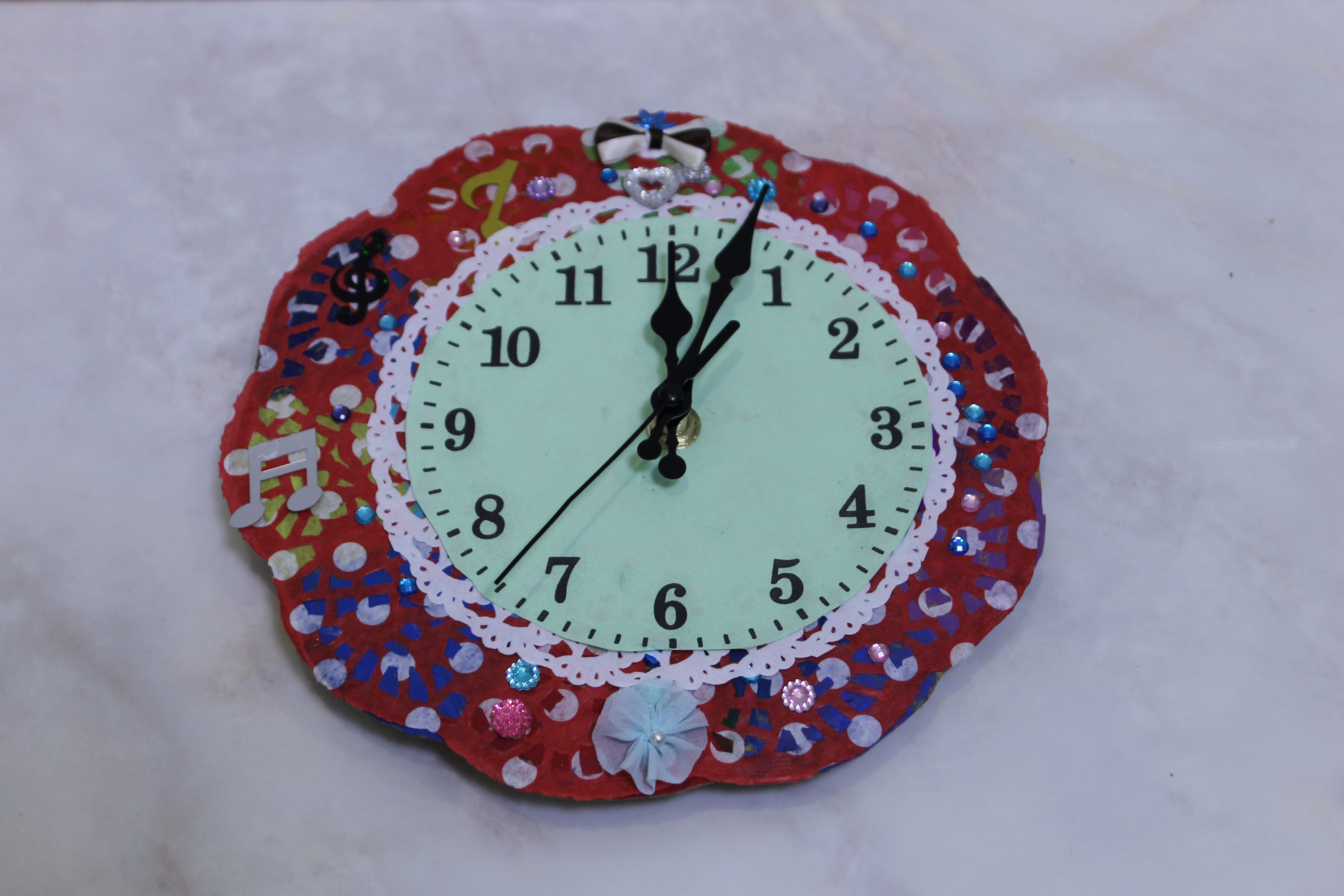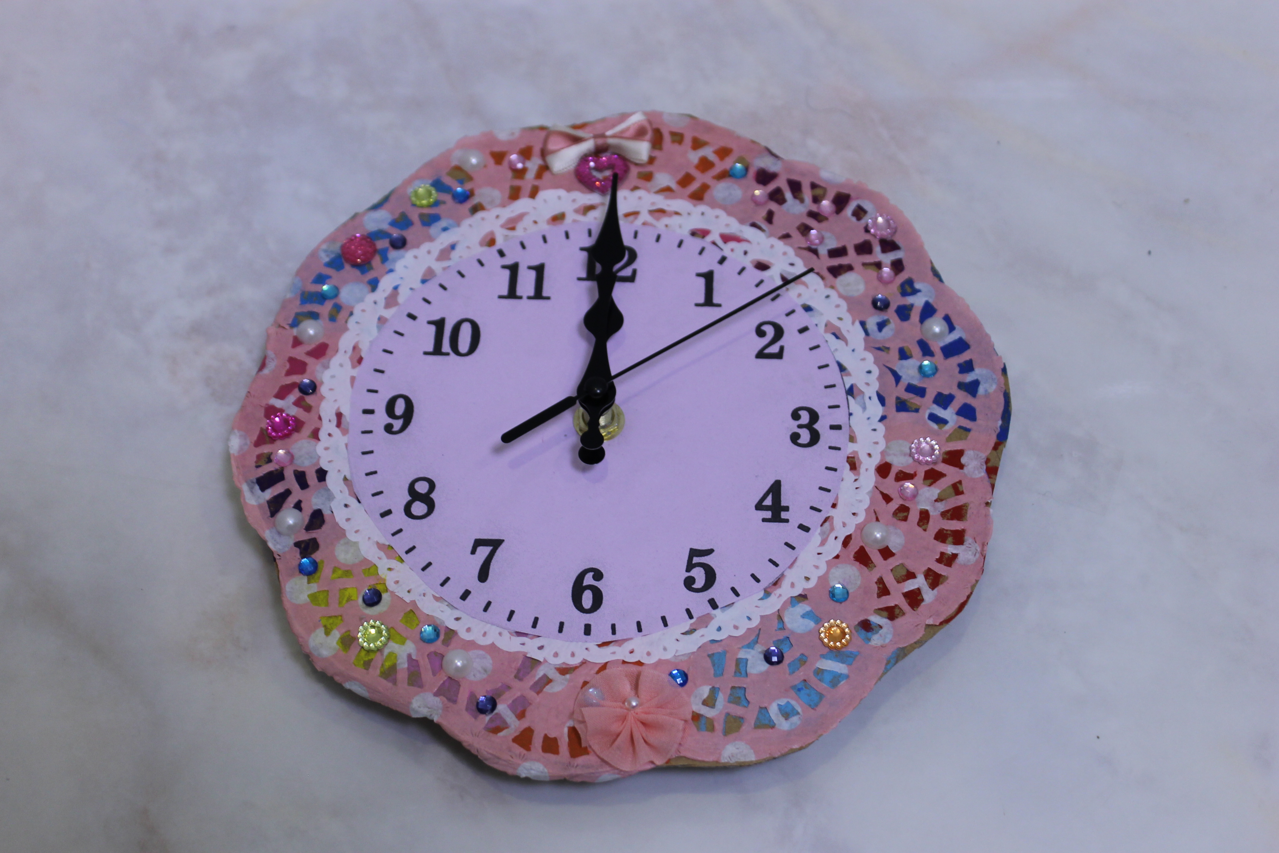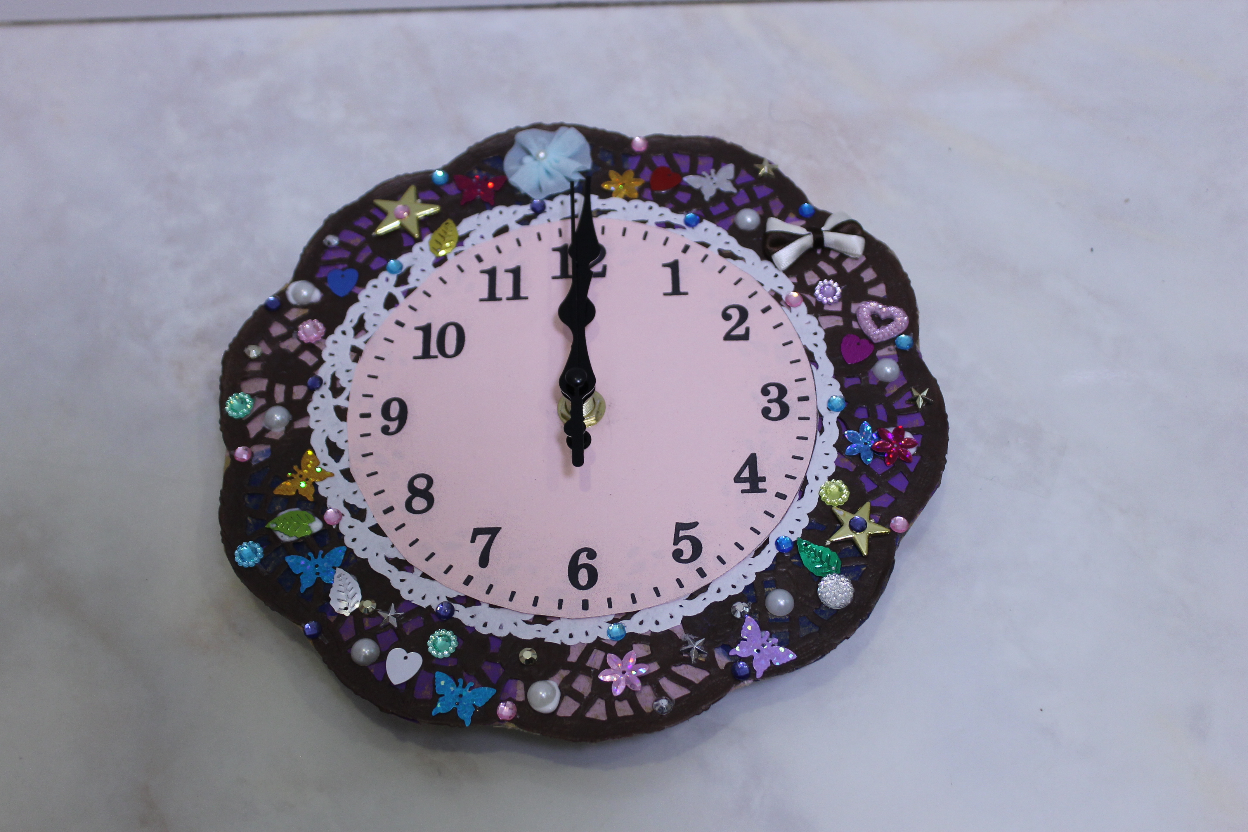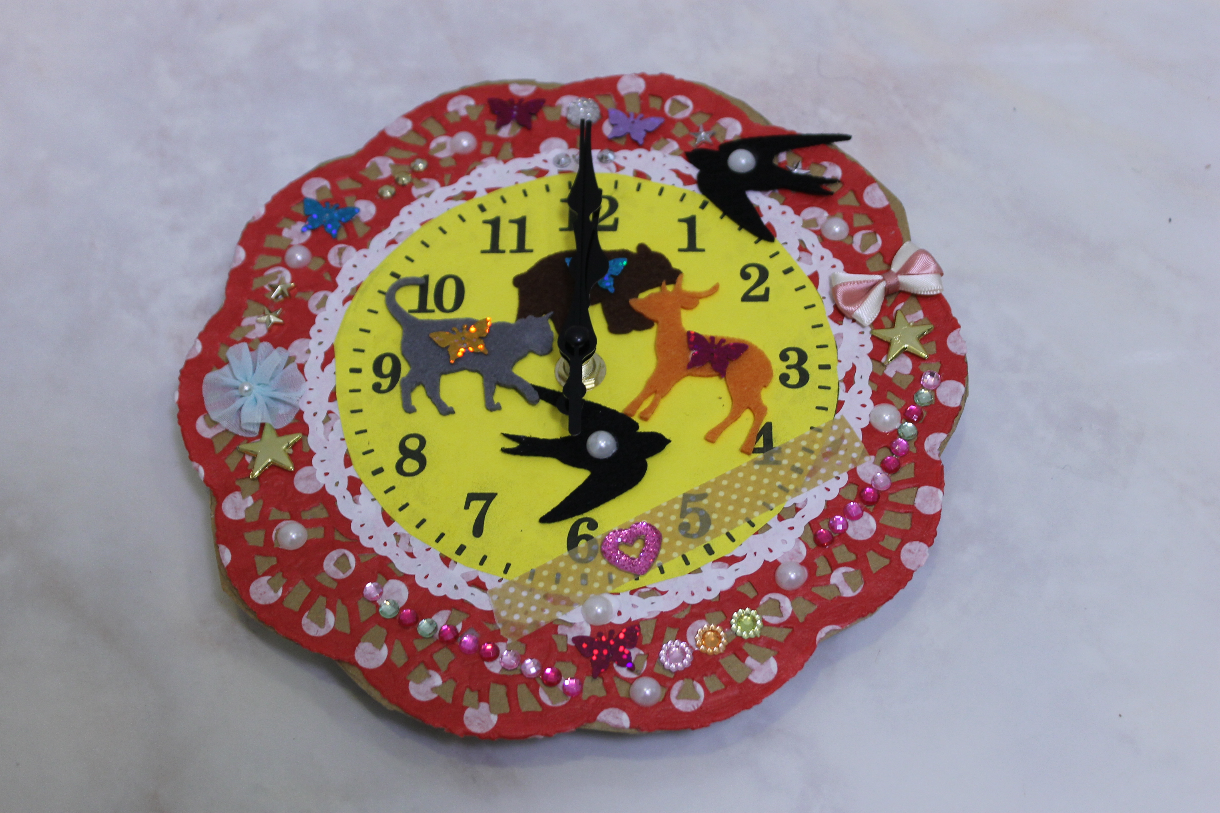 出来上がりのお写真がカメラの設定を間違え少し暗くて申し訳ないのですが、デザイン的には、女のお子さんだけでしたのでとても可愛らしいものが多かったです。ご自宅のインテリアを素敵に飾ってくれる時計ができたのではないでしょうか。
