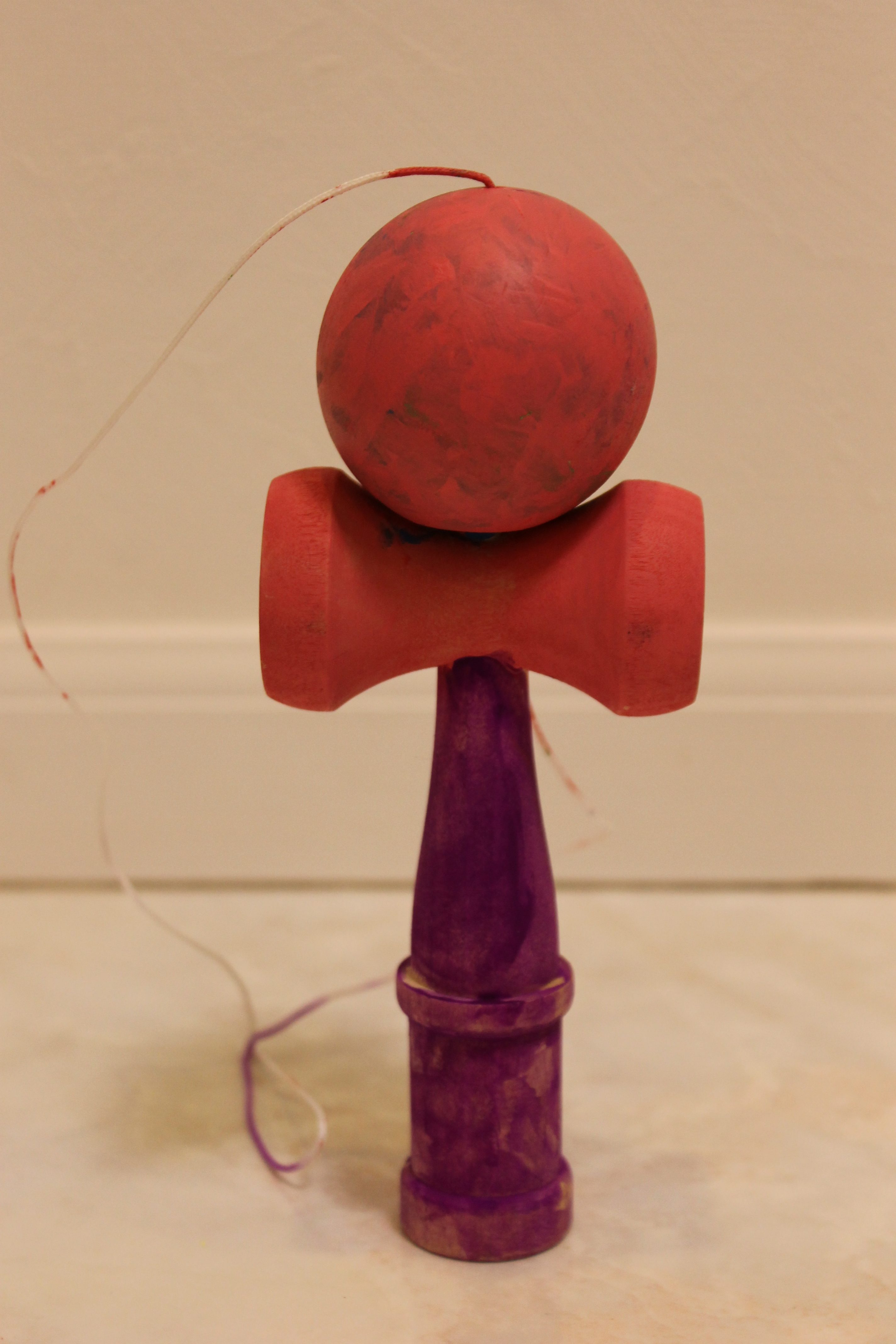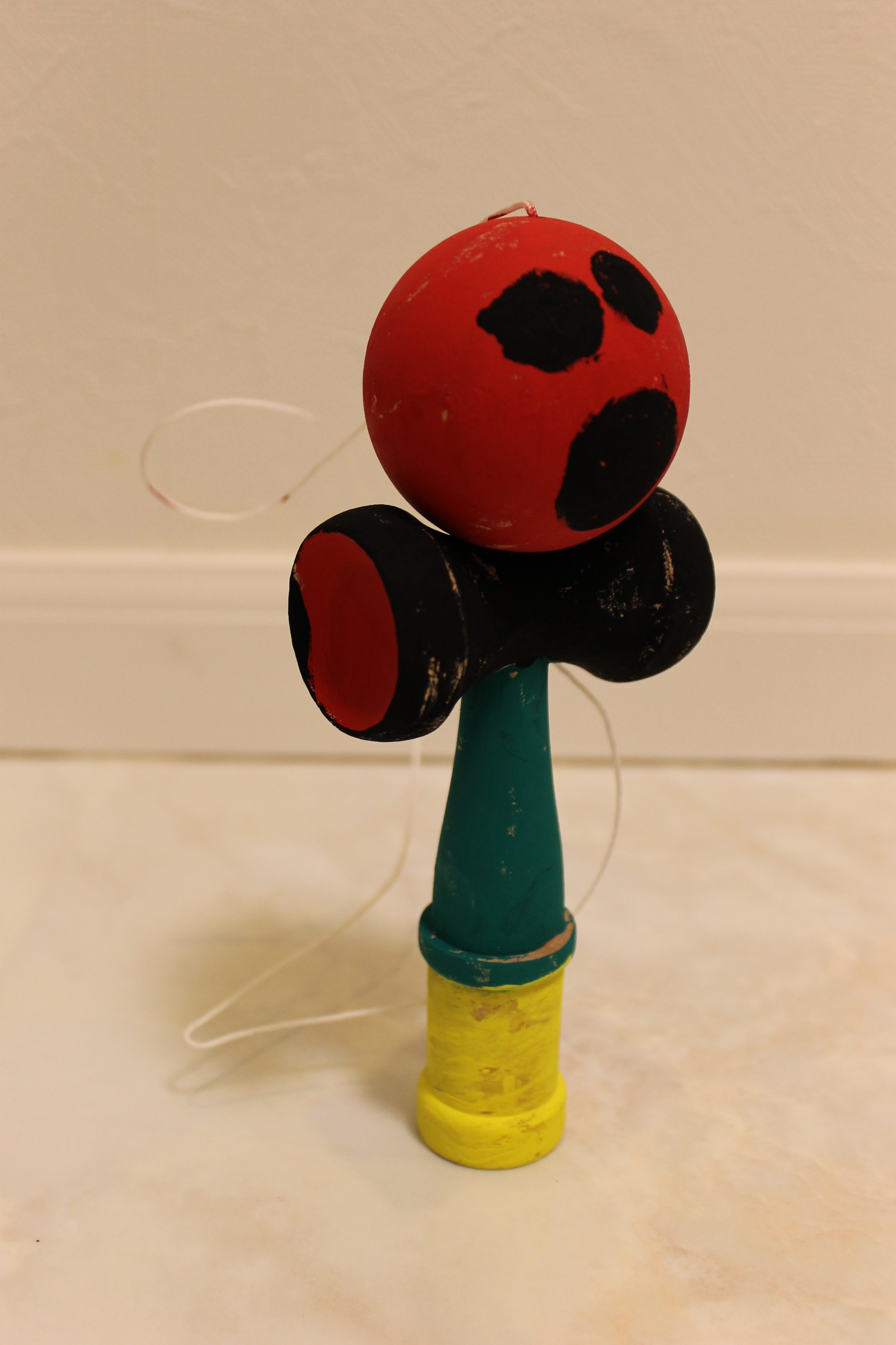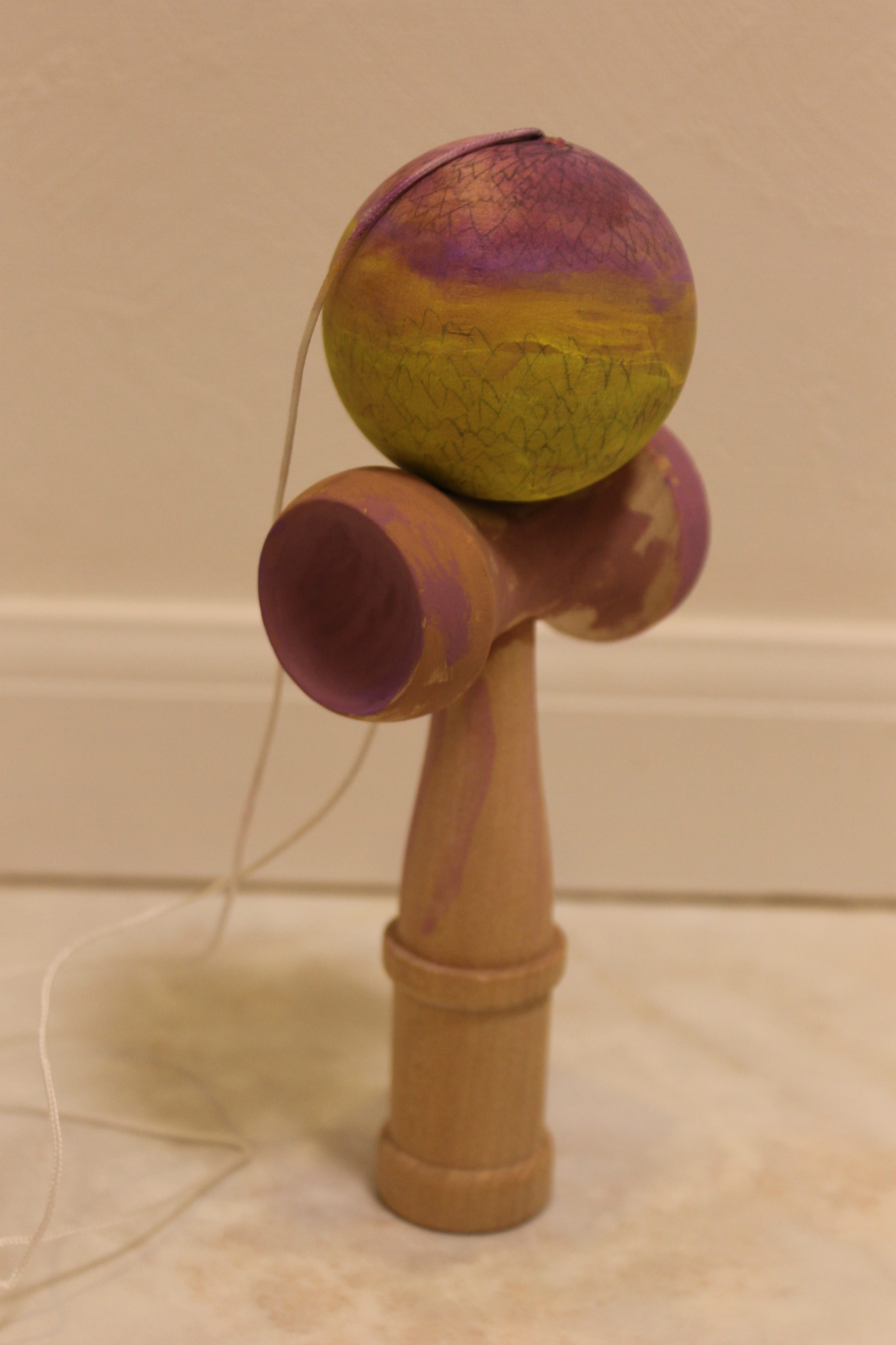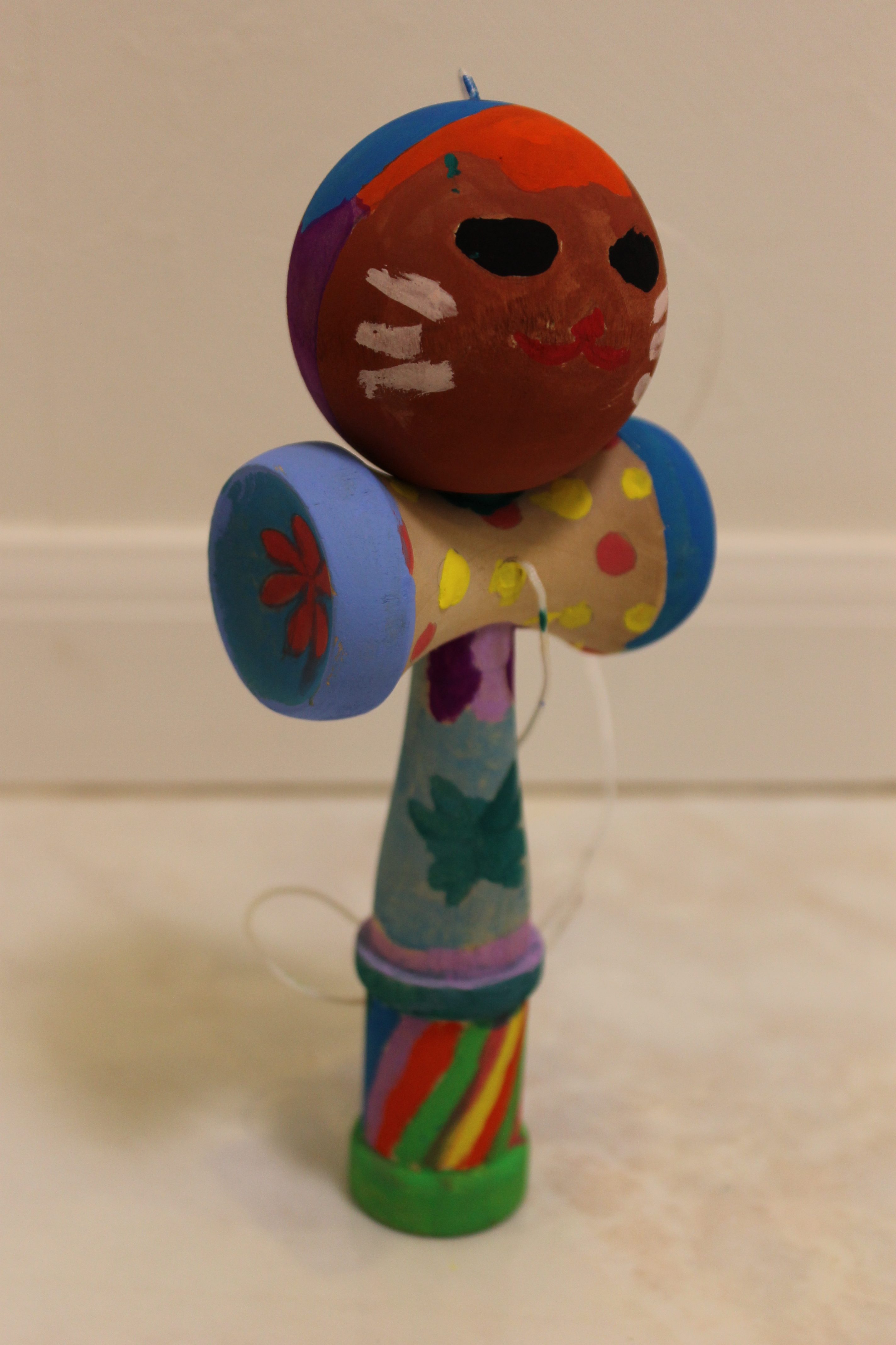 以前にお友達が、どこかでお子さんが体験されたワークショップのことについて゛立体に色付けをしたのだけど平面と違うのでとても面白かったみたい”と、おっしゃっていたので、立体に色付けをする工作を行ってみたいと思っていました。少し前の朝日小学生新聞の裏面に女子美術大学付属中学の宣伝が載っており、とても綺麗で楽しいアイディアに彩られた沢山のけん玉の写真があったので、けん玉に色付けをしてみることにいたしました。