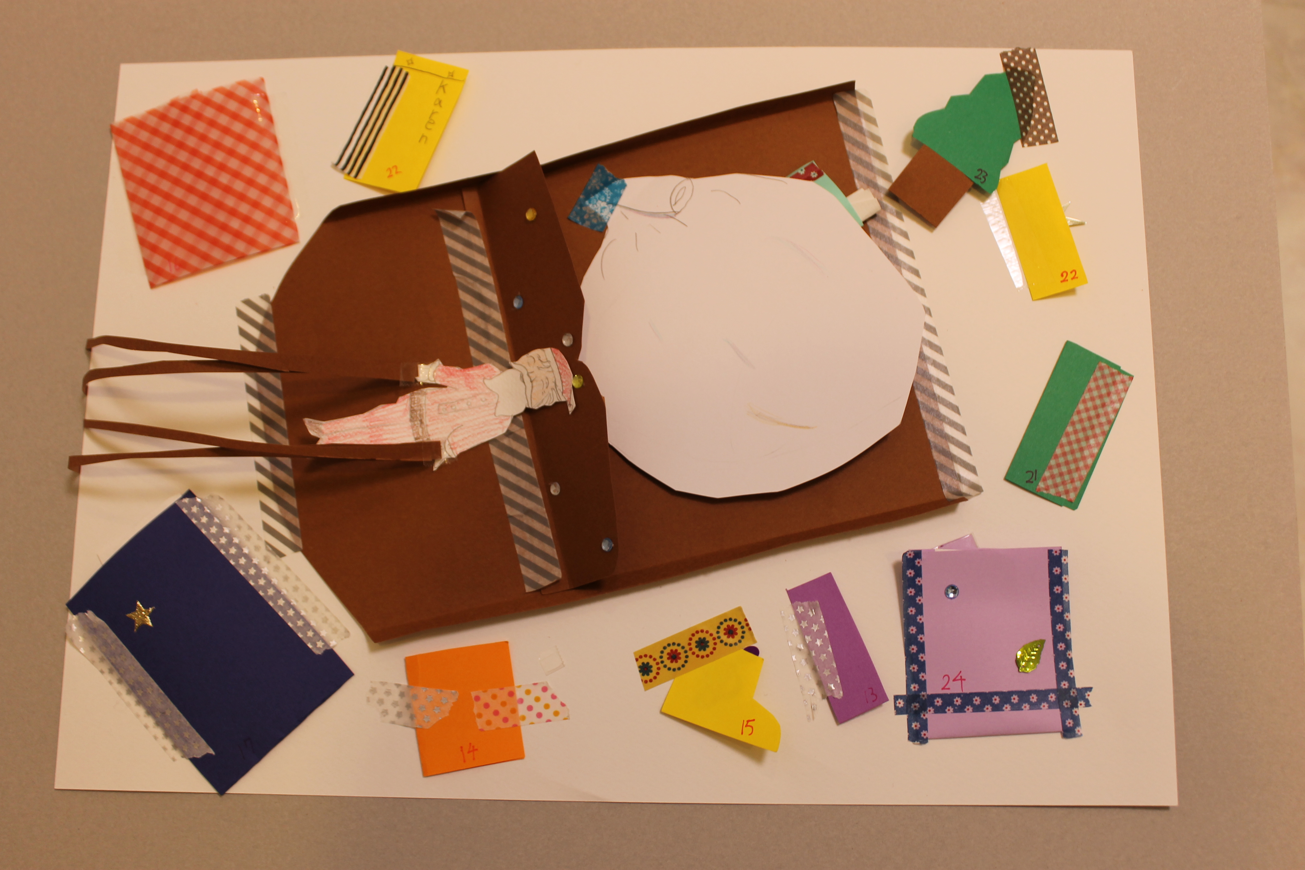 アドベント・カレンダーは、12月1日から24日までのカレンダーです。今回は一時間半で制作するので24日分ではなく、24日から日にちを書いていって、制作時間内に終わった日にちから始まるアドベント・カレンダーを造って頂きました。