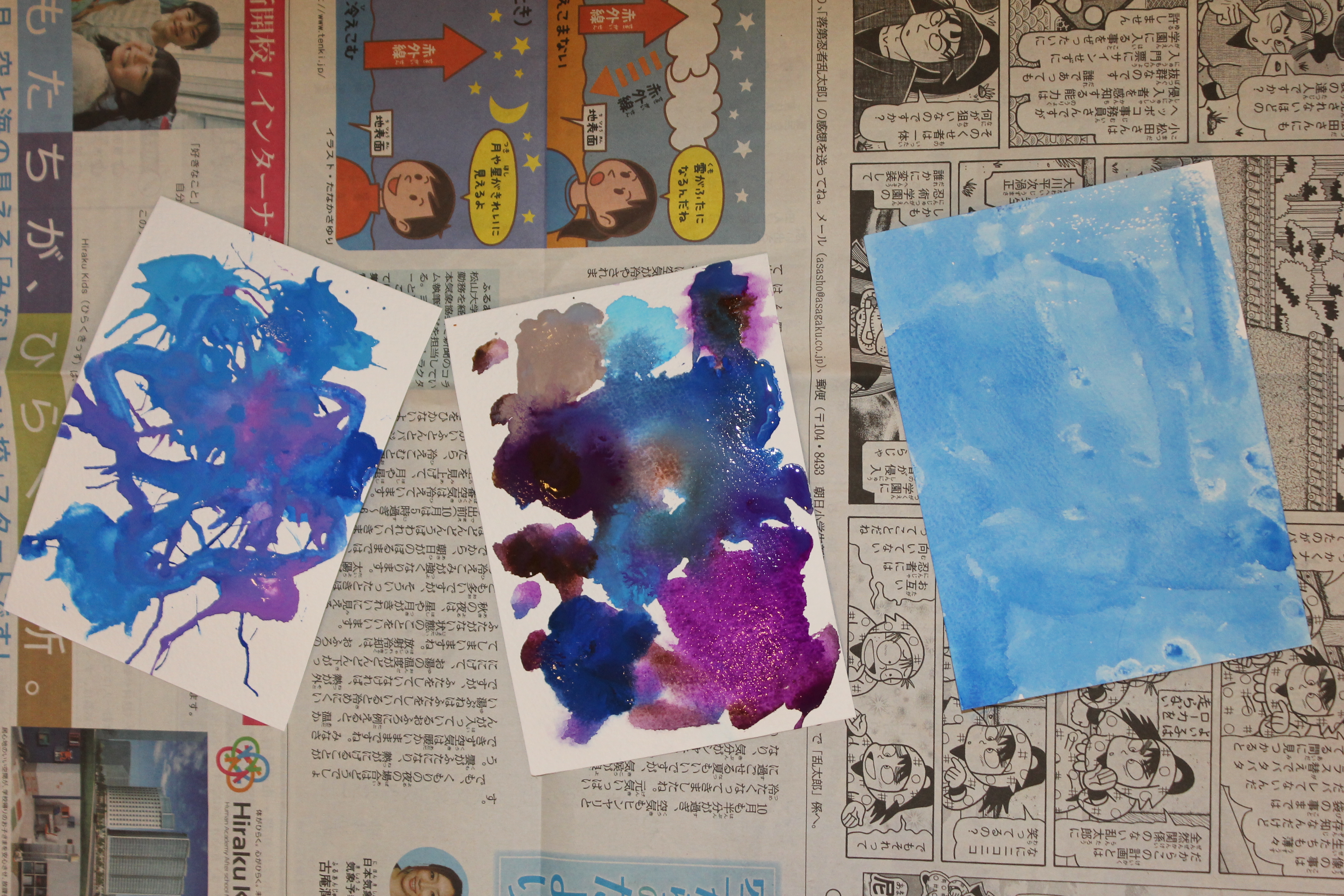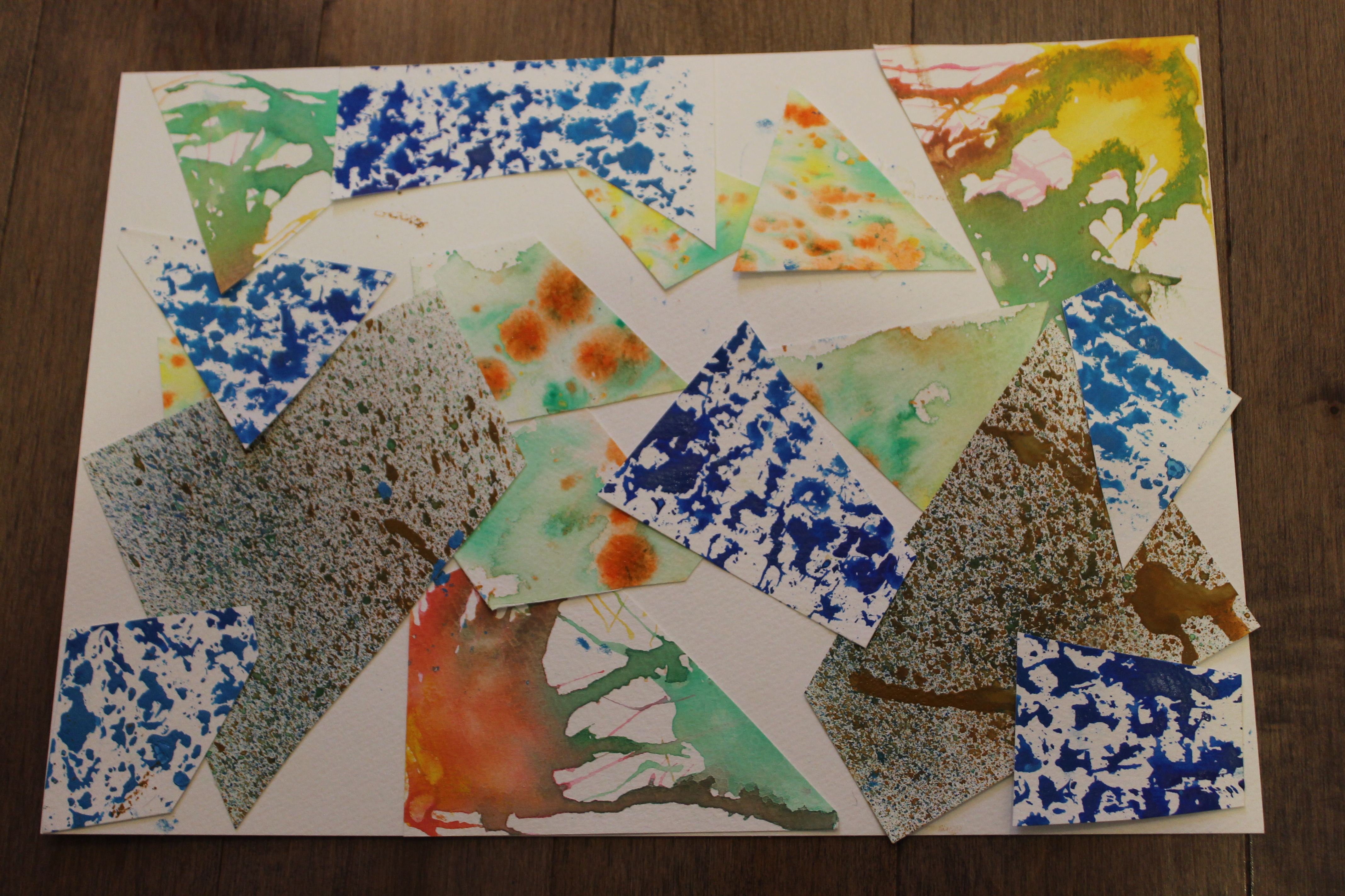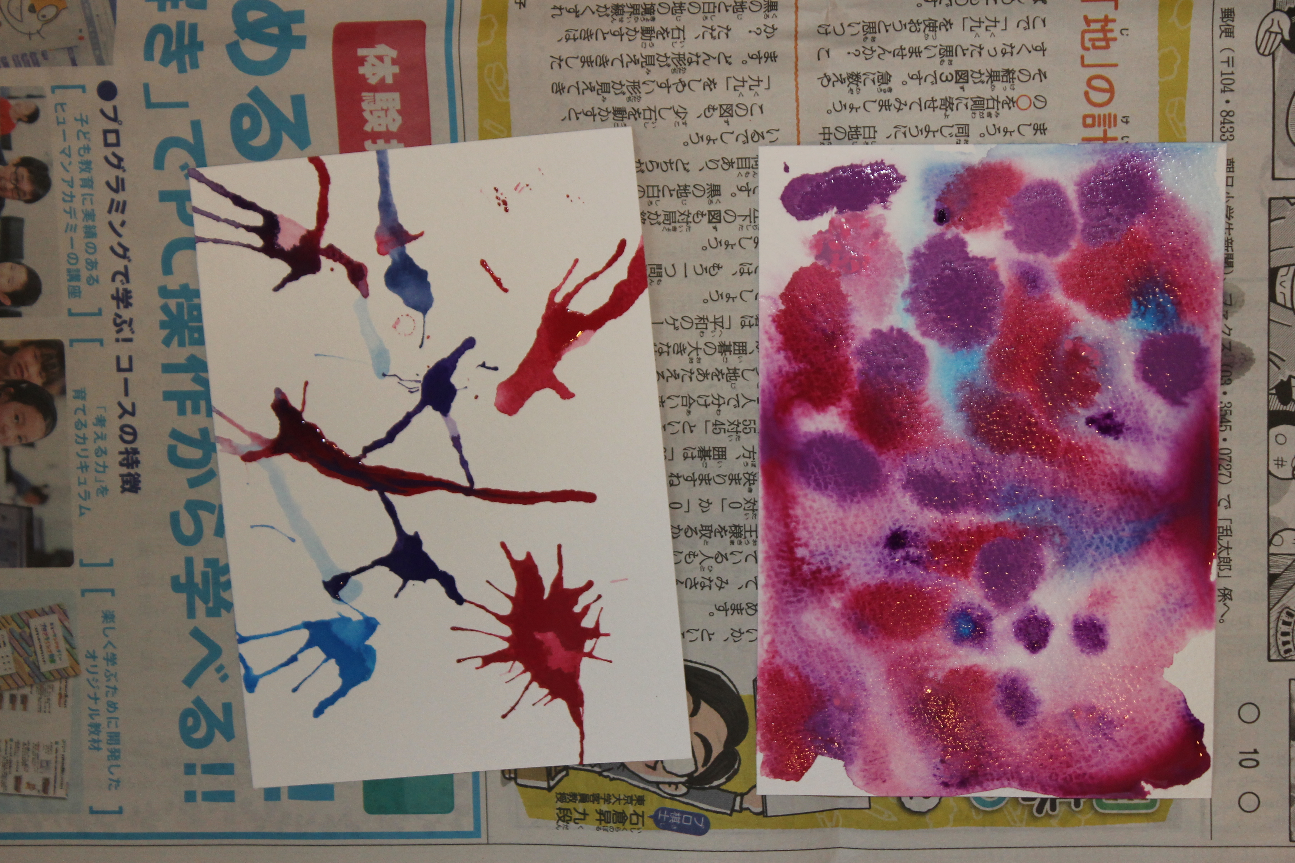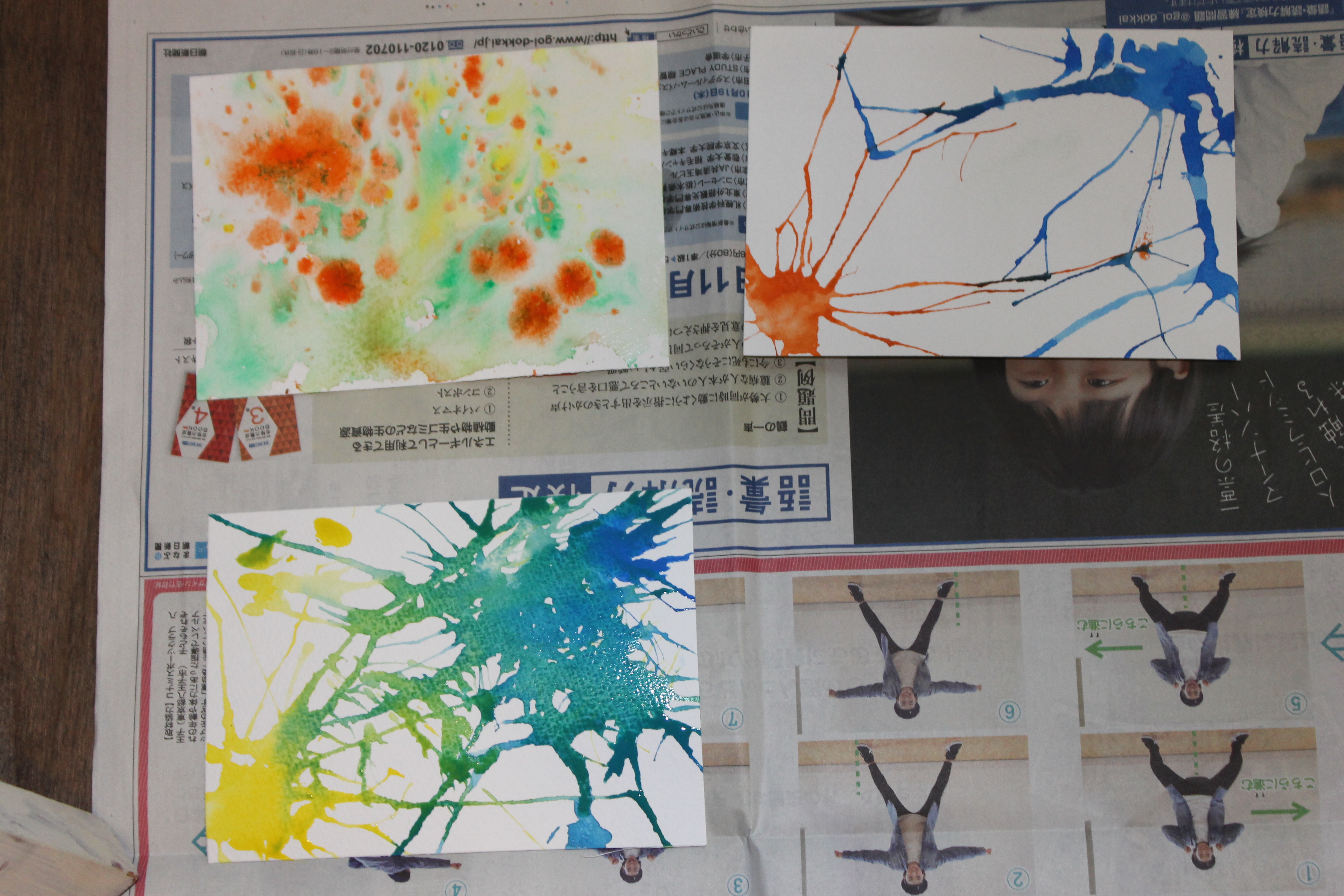 にじみたらし込み、吹き流し(ドリッピング)、霧吹き(スパッタリング)、型押し(スタンピング)という技法を小さな紙に練習してみました。そして、最後にその紙を切り、組み合わせるコラージュを行いました。