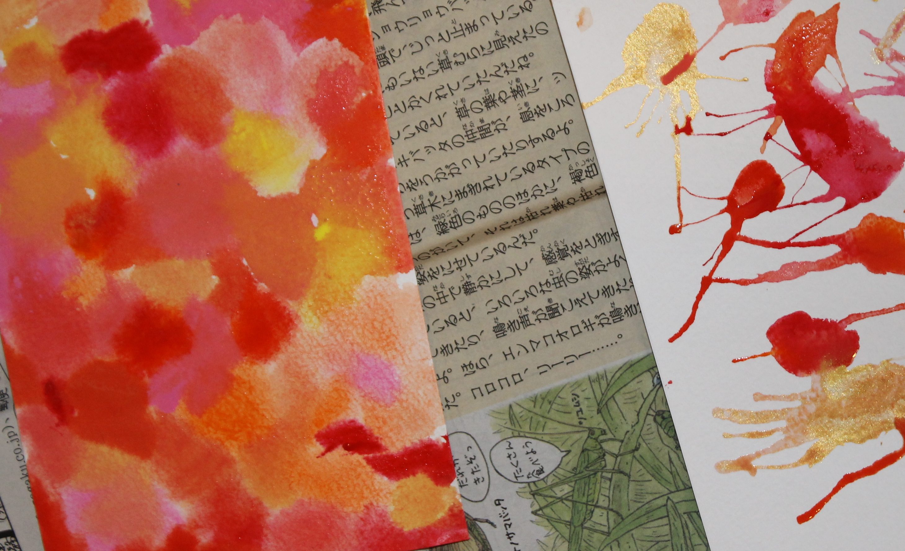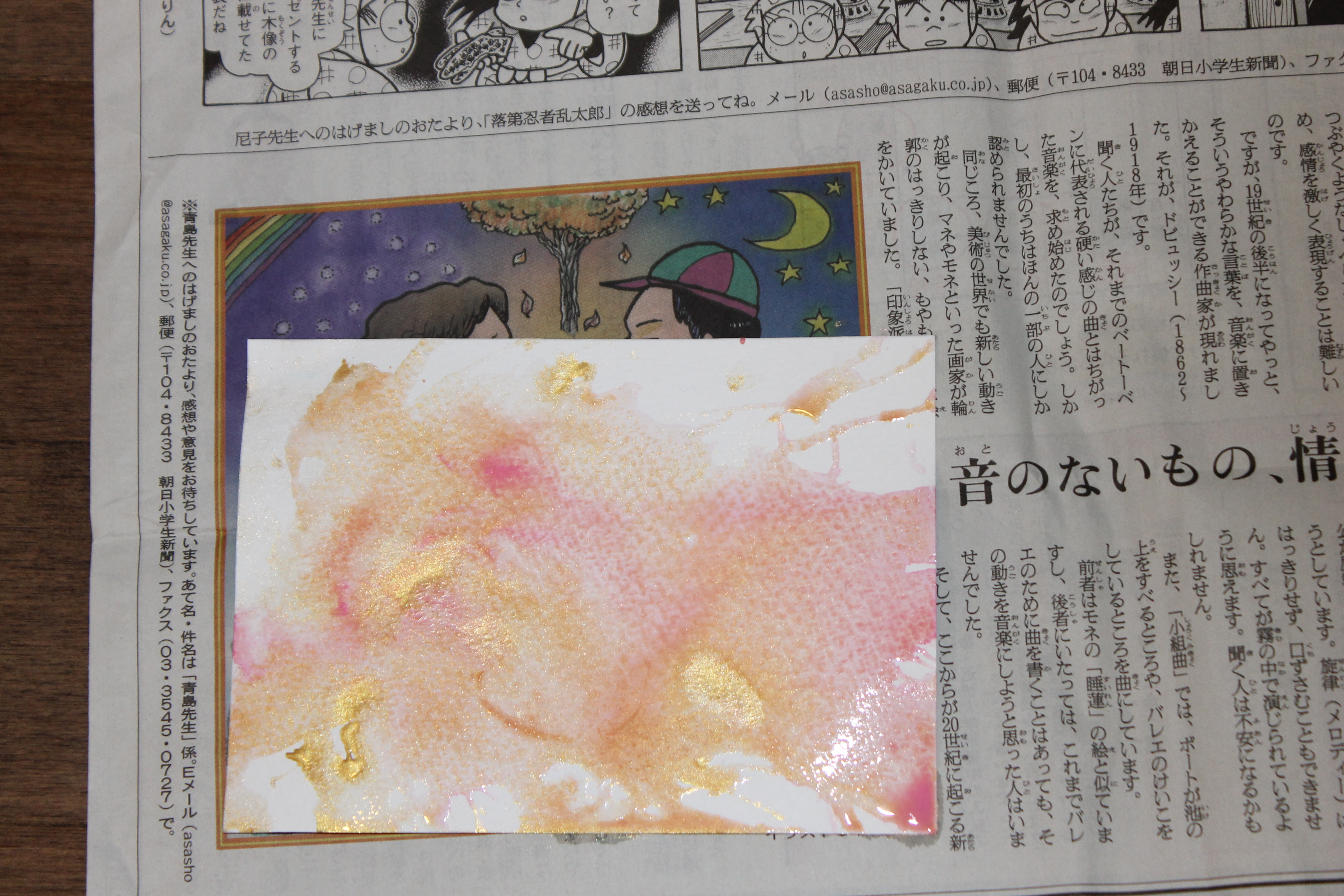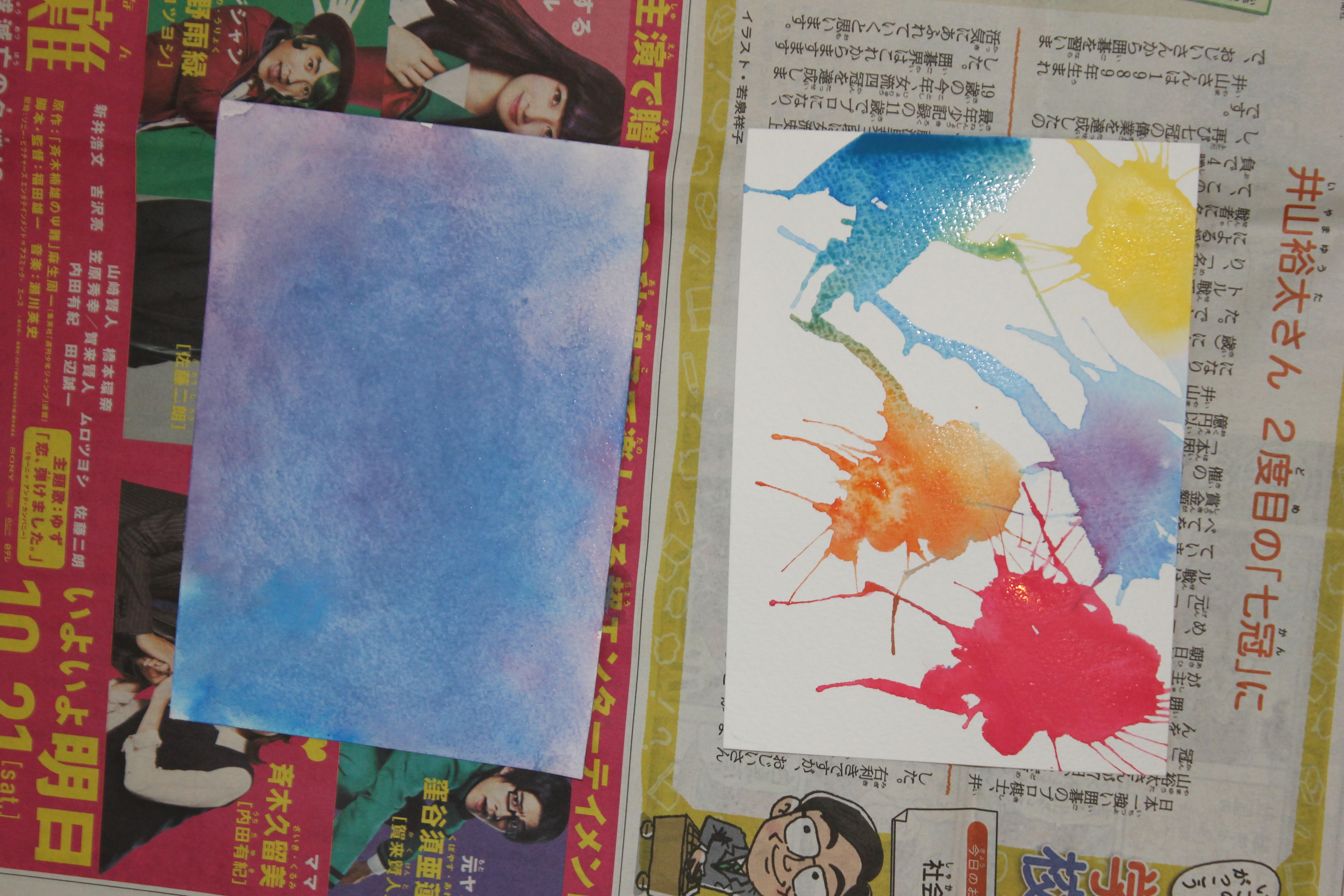 にじみたらし込み、吹き流し(ドリッピング)、霧吹き(スパッタリング)、型押し(スタンピング)という技法を小さな紙に練習してみました。そして、最後にその紙を切り、組み合わせるコラージュを行いました。