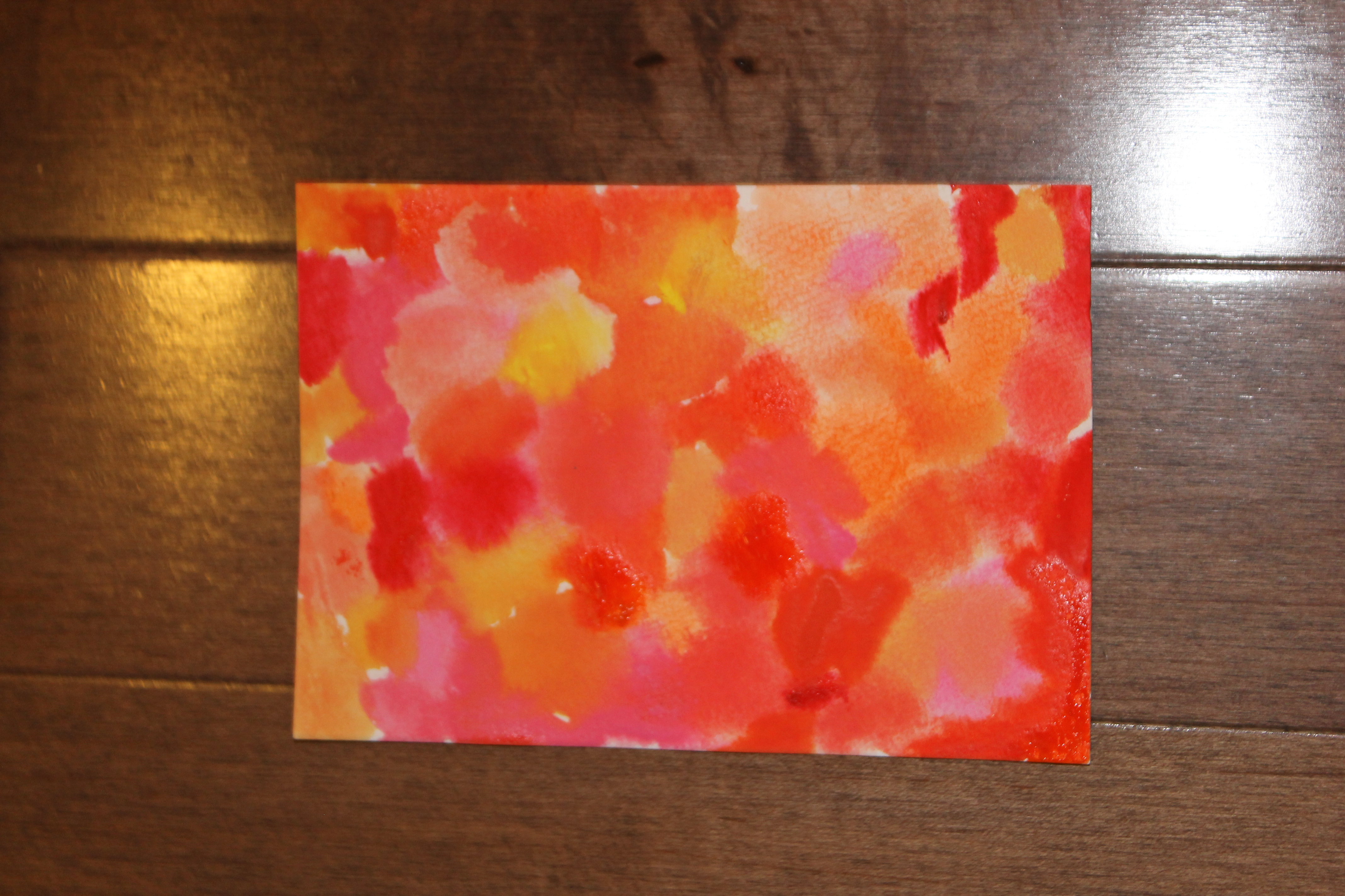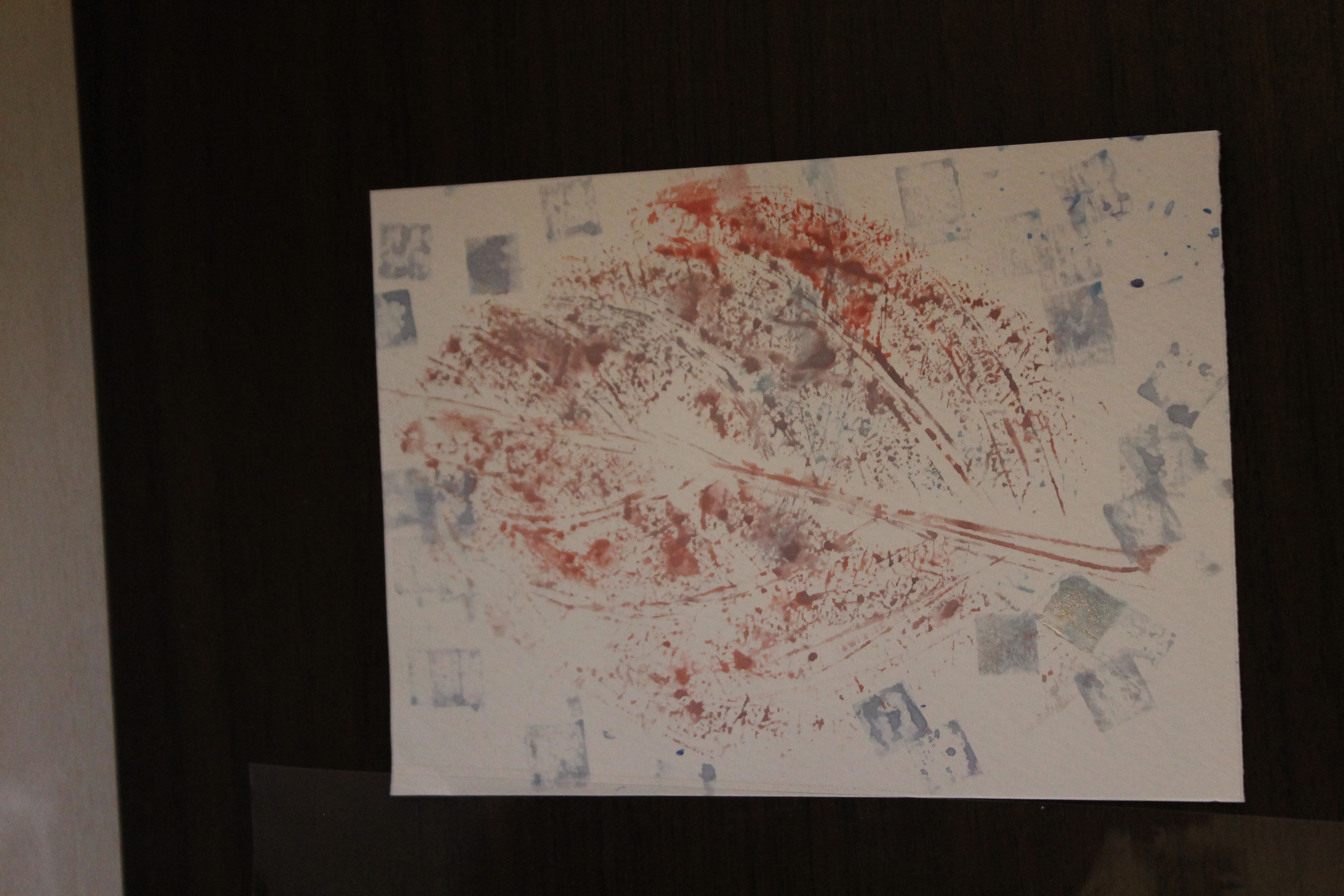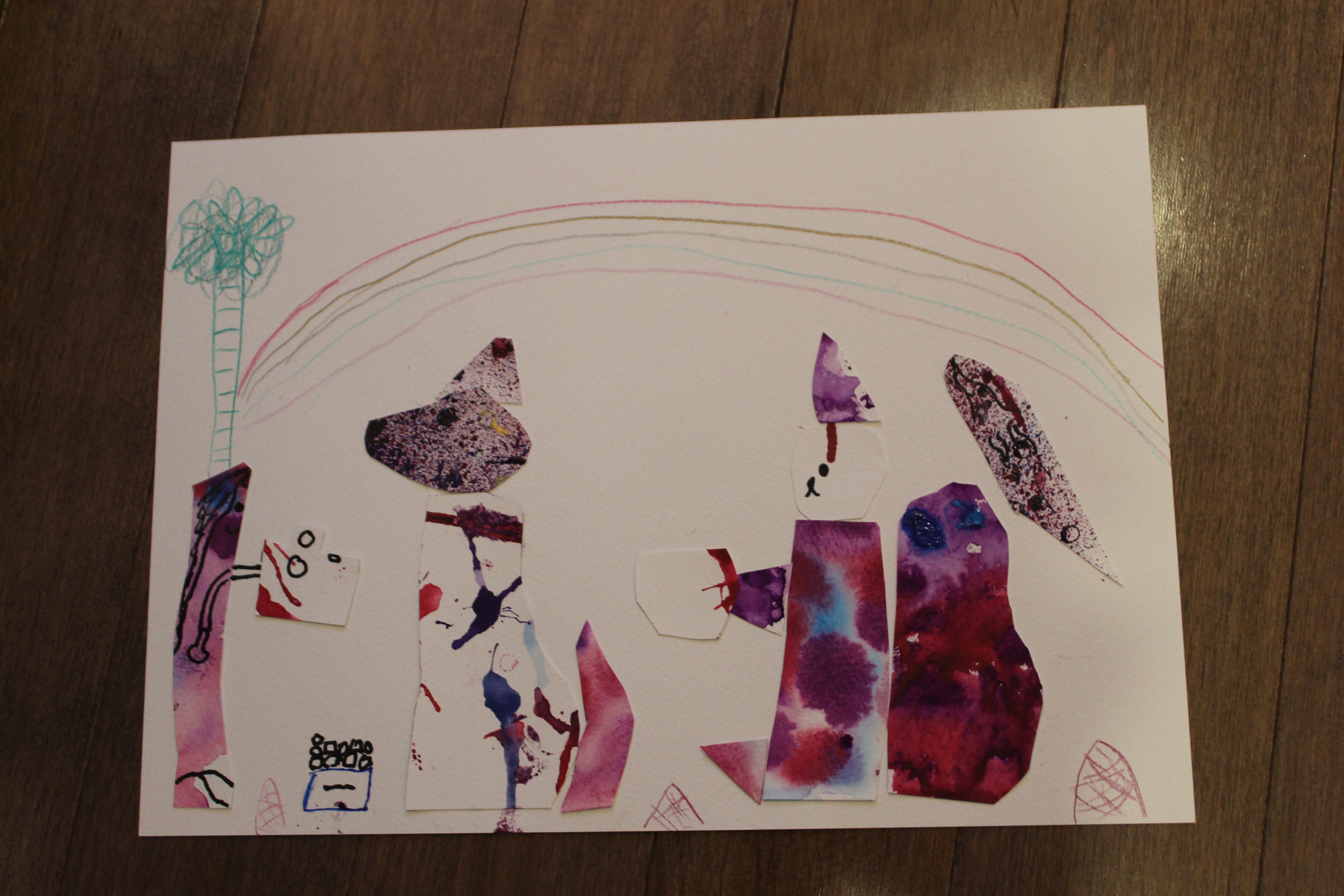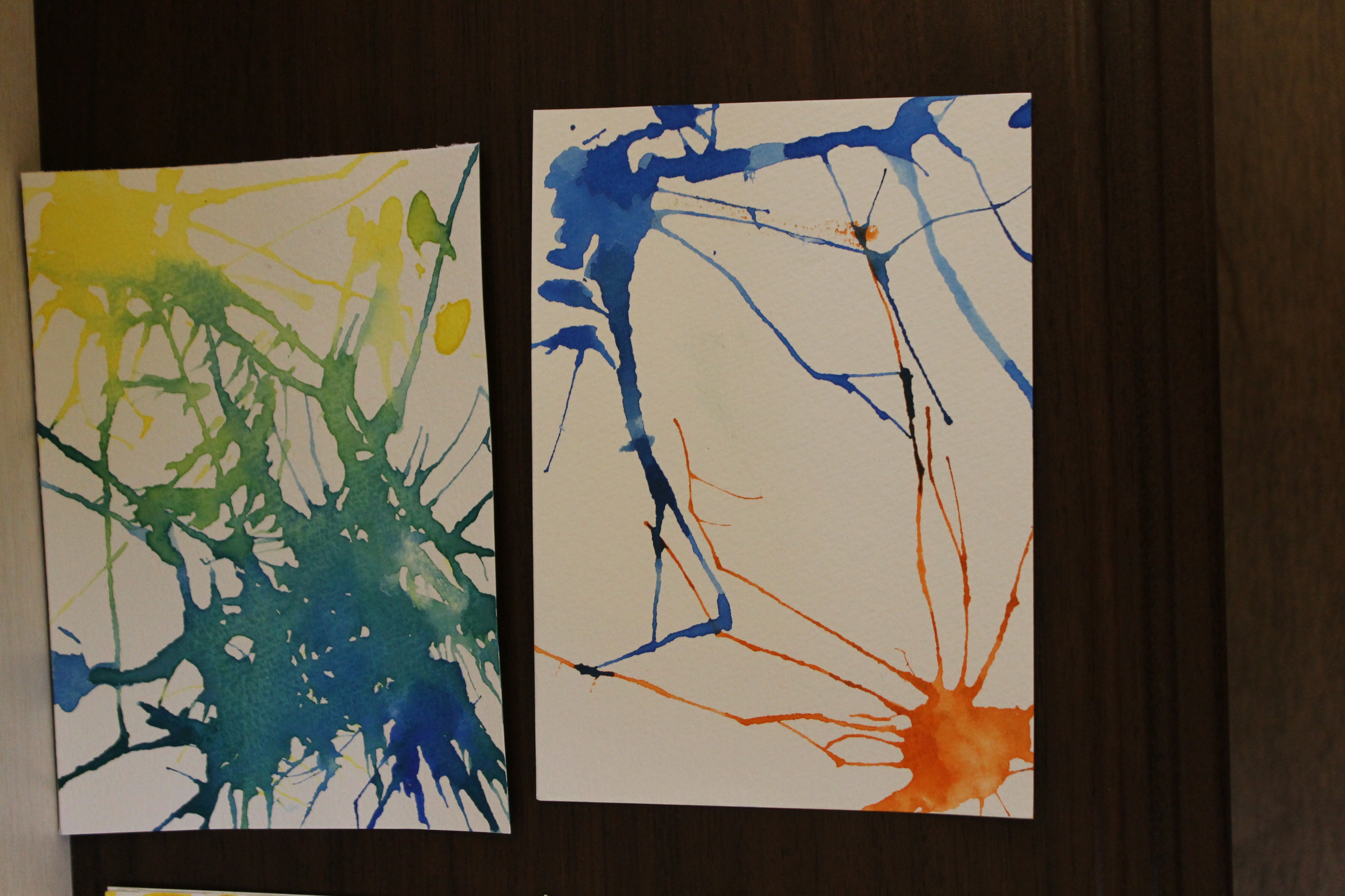 にじみたらし込み、吹き流し(ドリッピング)、霧吹き(スパッタリング)、型押し(スタンピング)という技法を小さな紙に練習してみました。そして、最後にその紙を切り、組み合わせるコラージュを行いました。