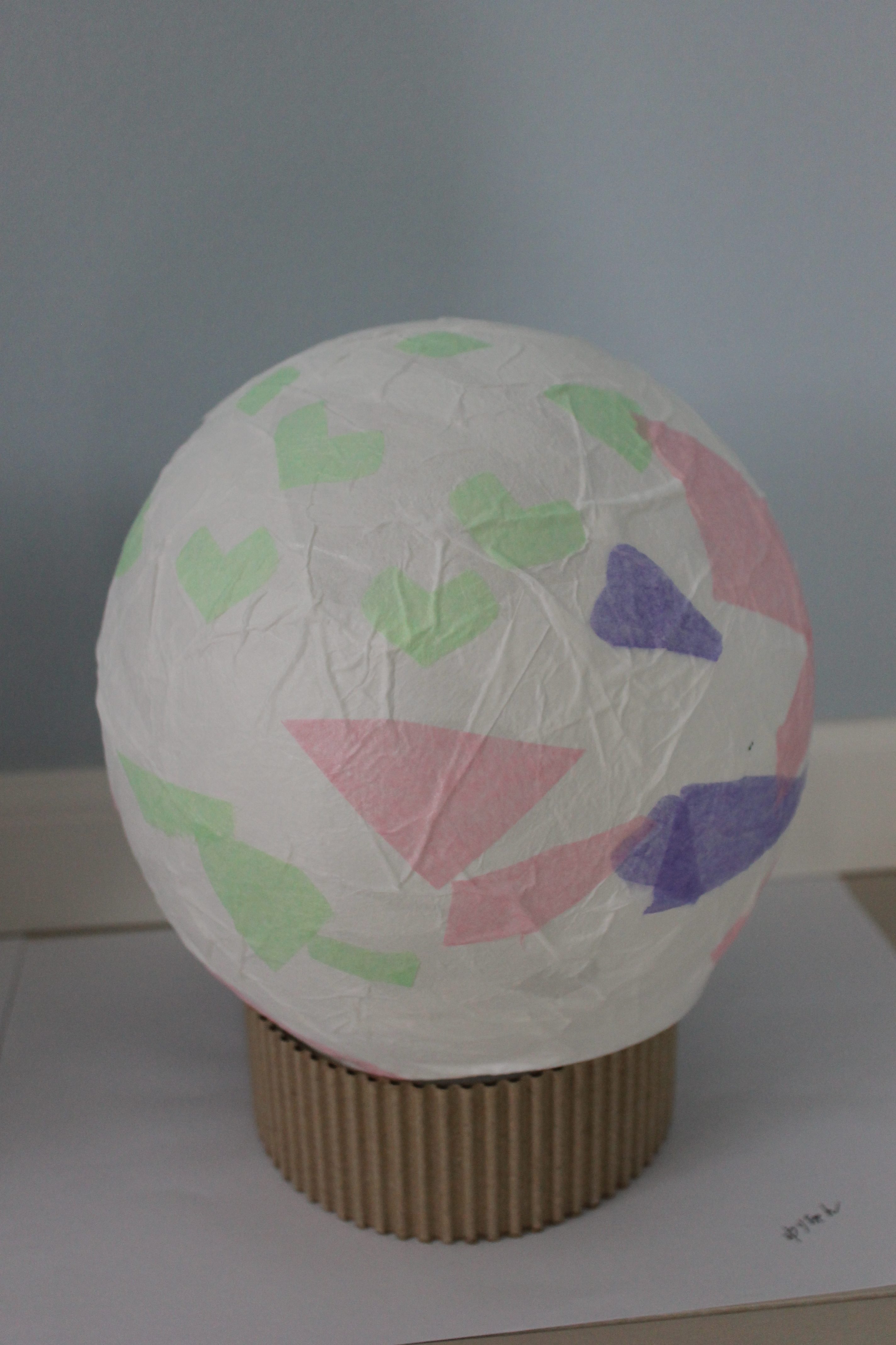 このクラスの生徒さんにとっては、風船を土台にして雲竜紙をちぎってペタペタと貼る作業は割合楽しい作業だったようです。楽しくお話をしながら、作業はどんどん進みました。