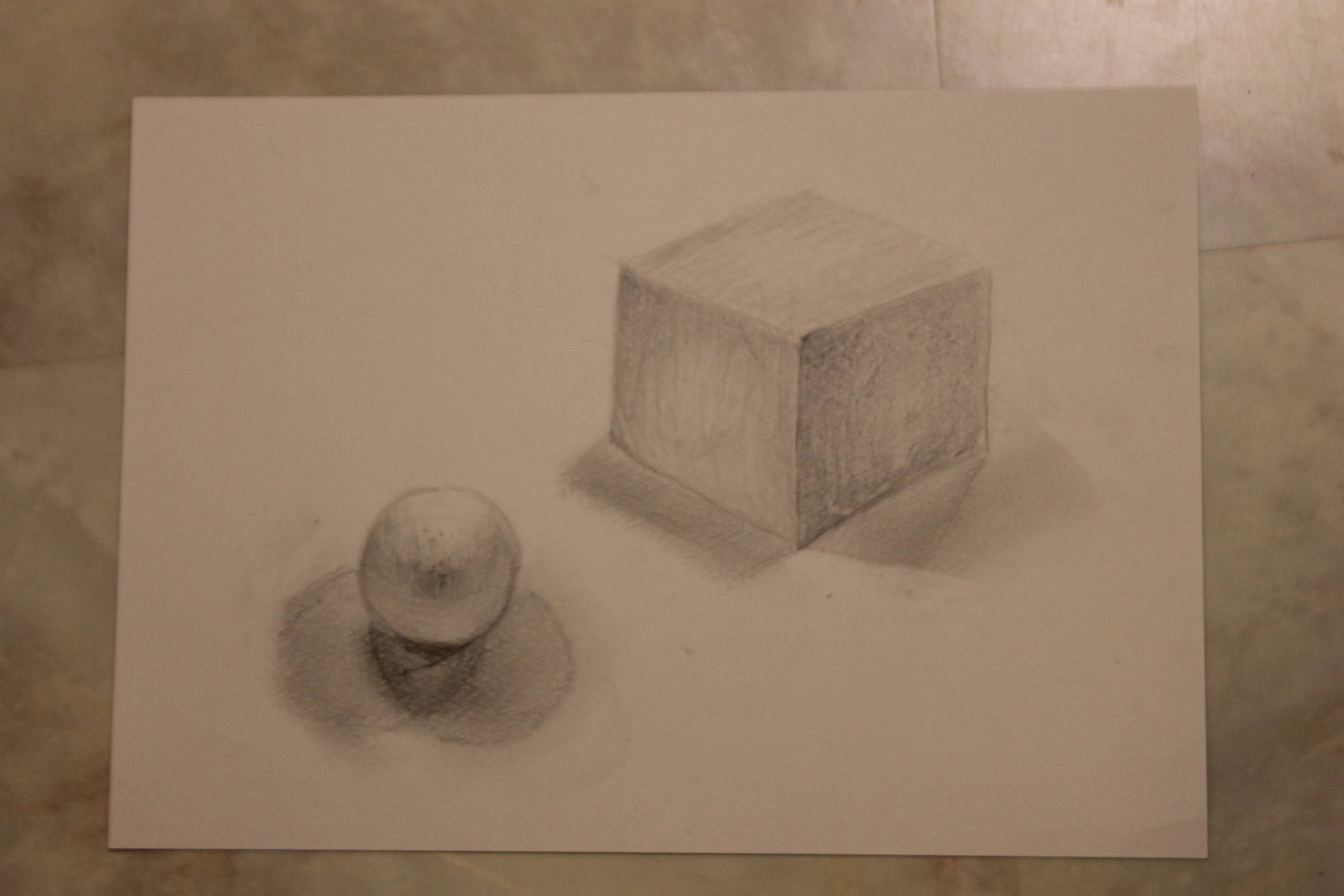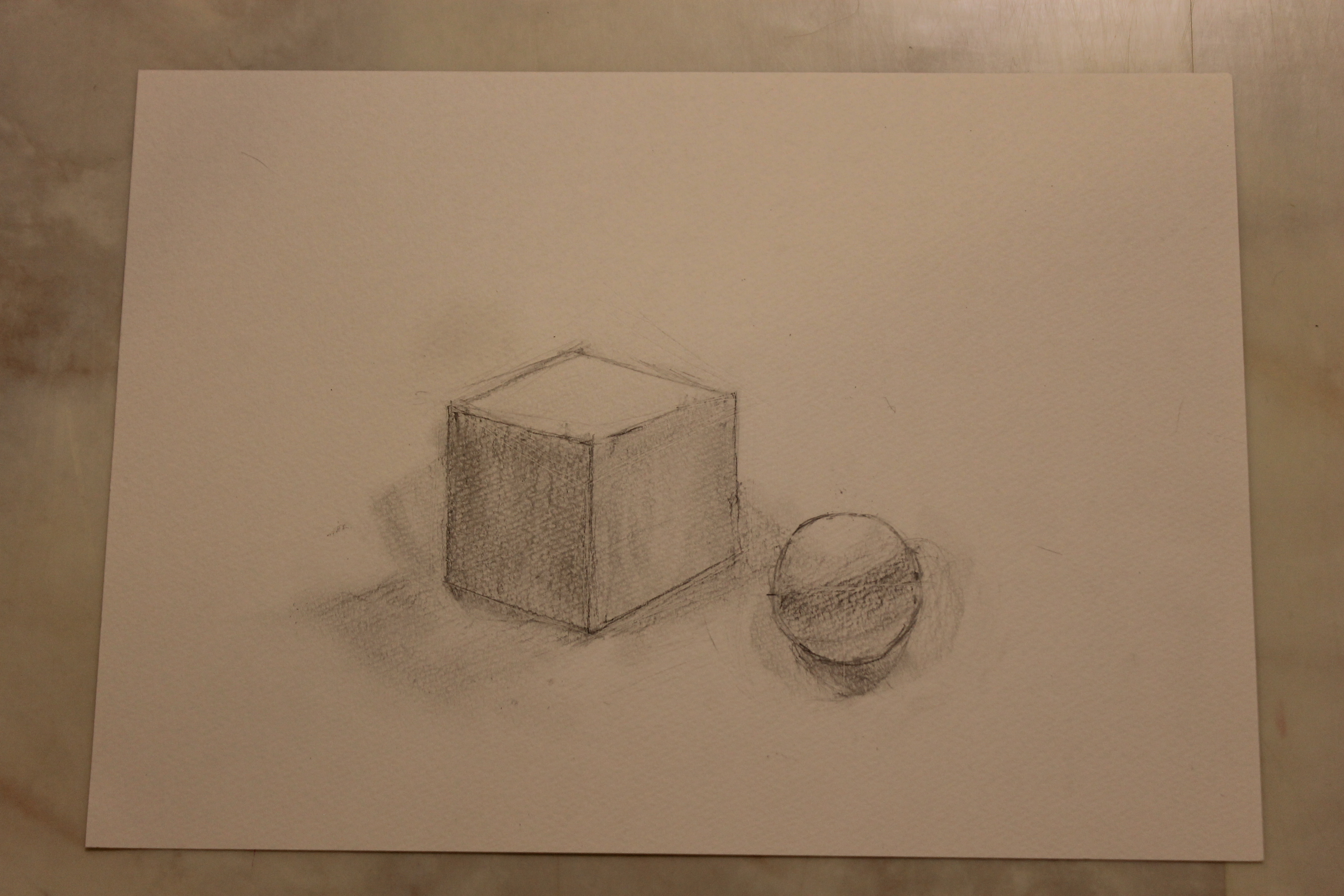 中学生は学校の美術の授業の内容が、小学生と比べて色々な美術の知識を交えた内容になります。それに沿ったかたちで理論的な方法でも絵を描いて頂こうと、今回は木の立方体と発砲スチロールの円球のデッサンを描きました。