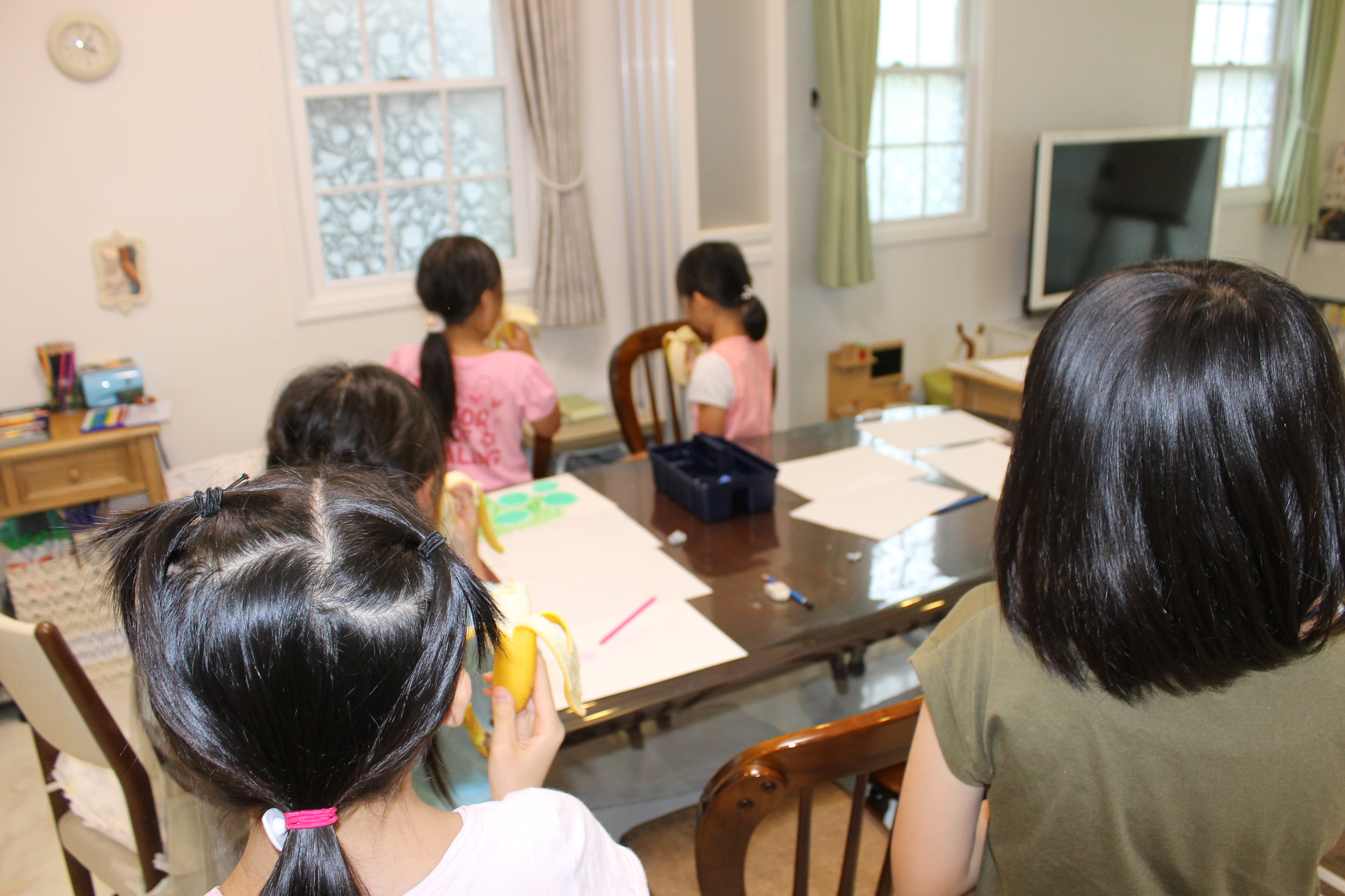 絵を描き終わった後には、みんなでバナナをいただきました。みんなでバナナを食べている不思議な光景に、お互いに可笑しくなっていらっしゃいました。バナナの味や香りを感じさせるような作品になりましたでしょうか。