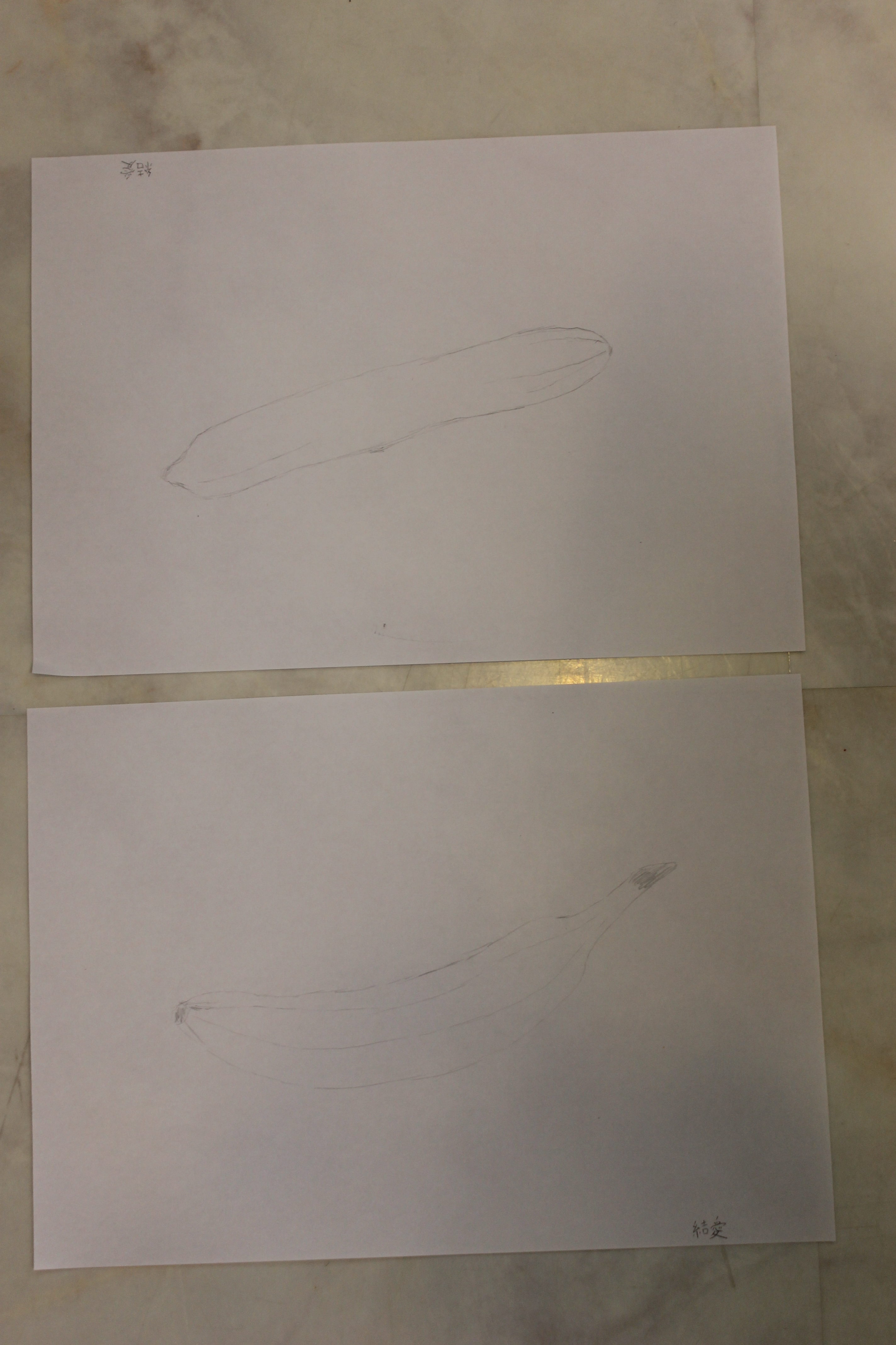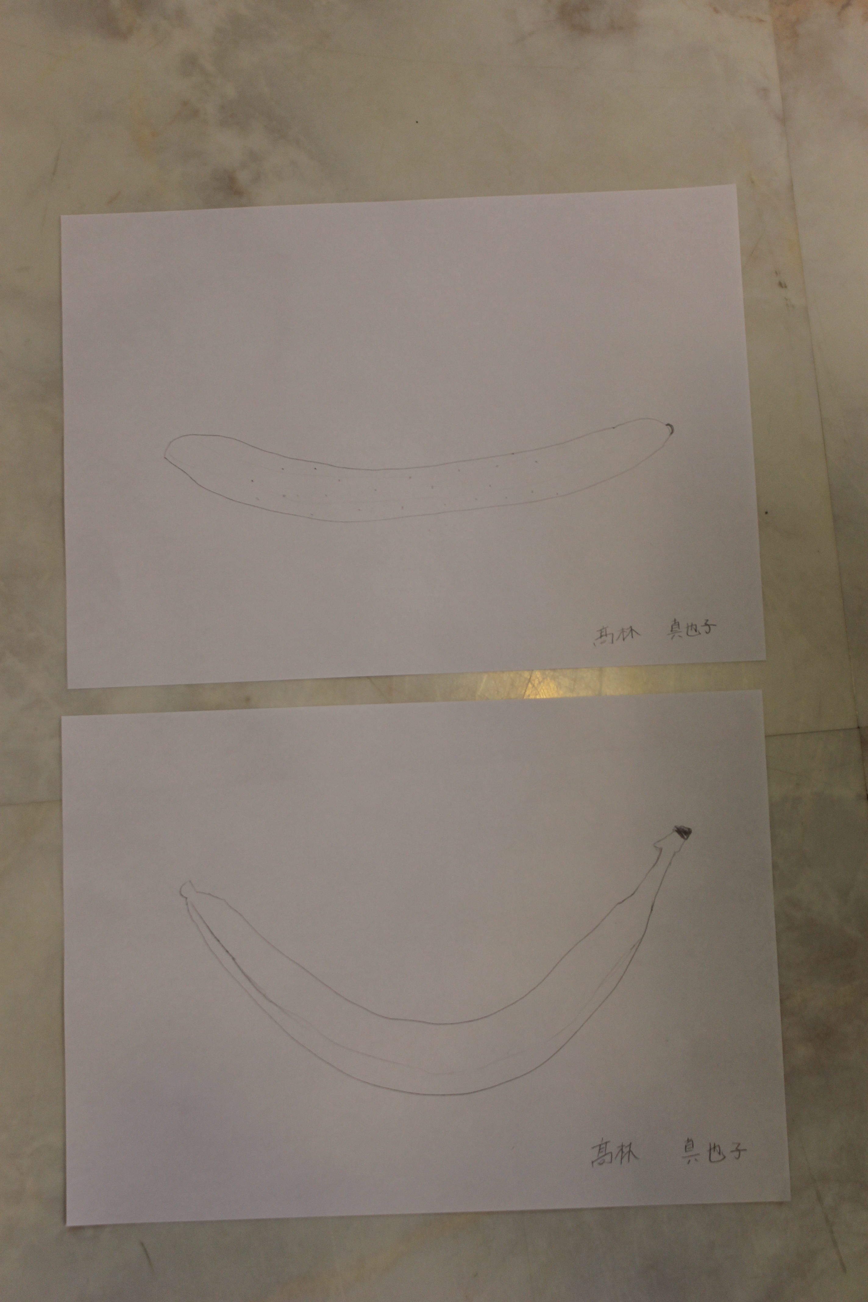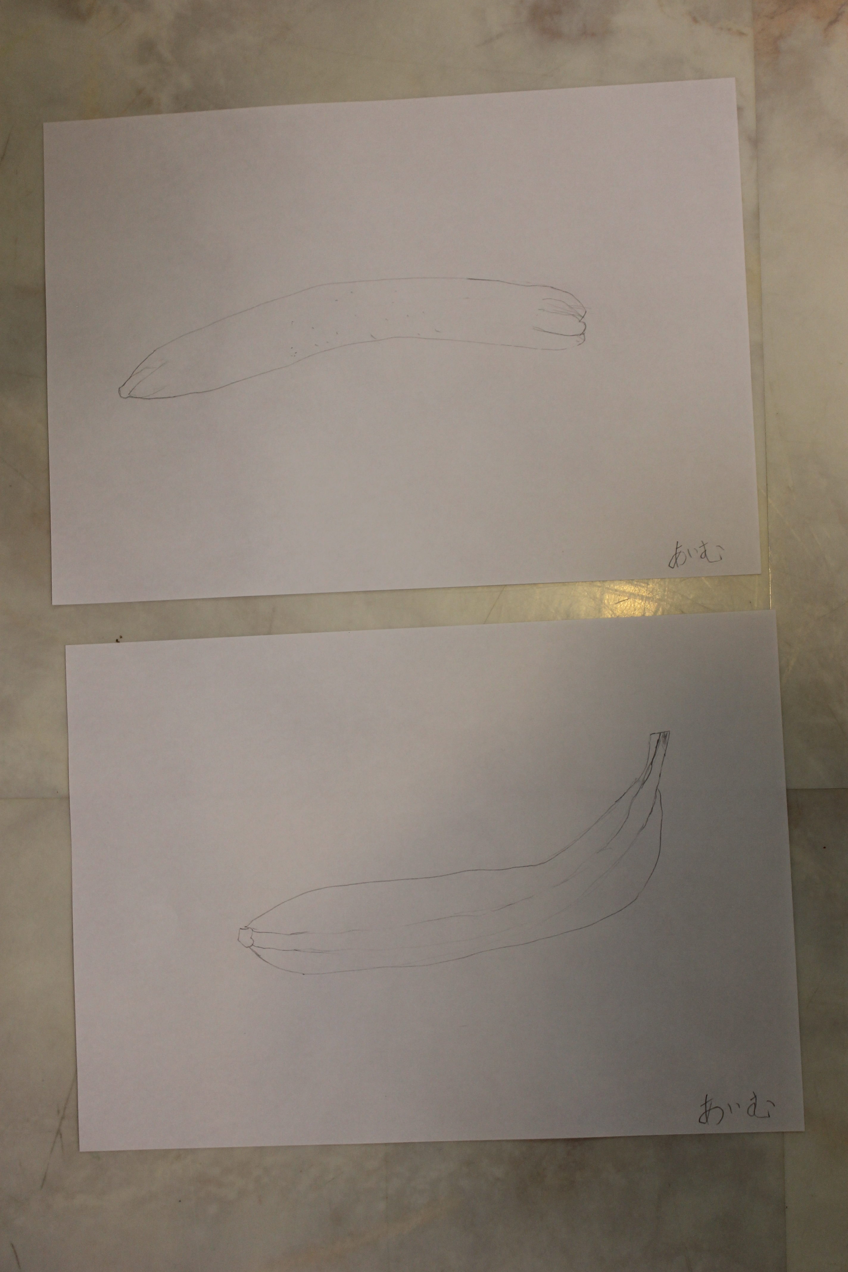 バナナは色が明るいので鉛筆の色をのせるのに抵抗があるお子さんが多いなか、黄色い色味を白い紙と同じ色にならないように注意深く描く生徒さんもいらっしゃいました。小学生は本当にデッサンが上手で驚きます。