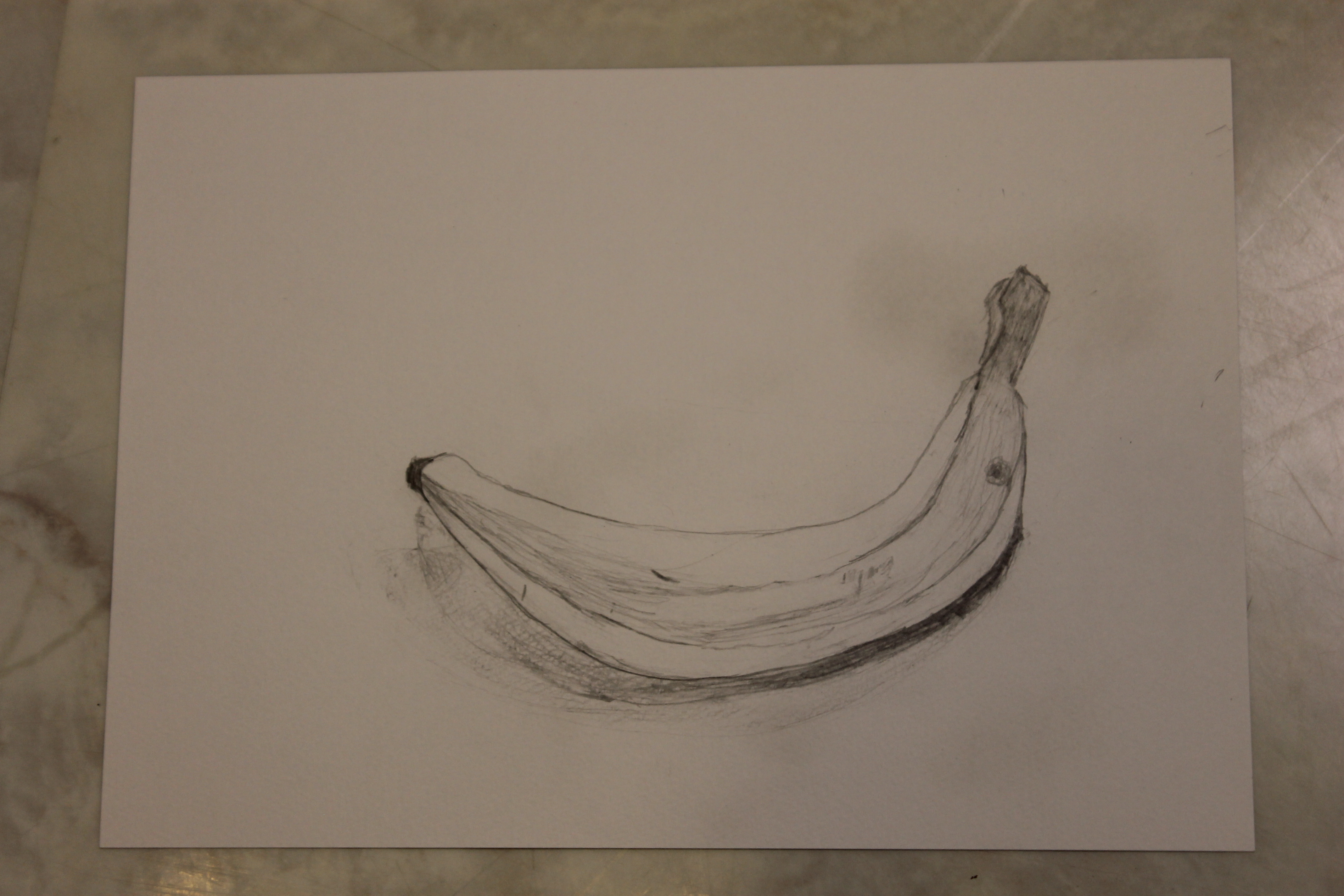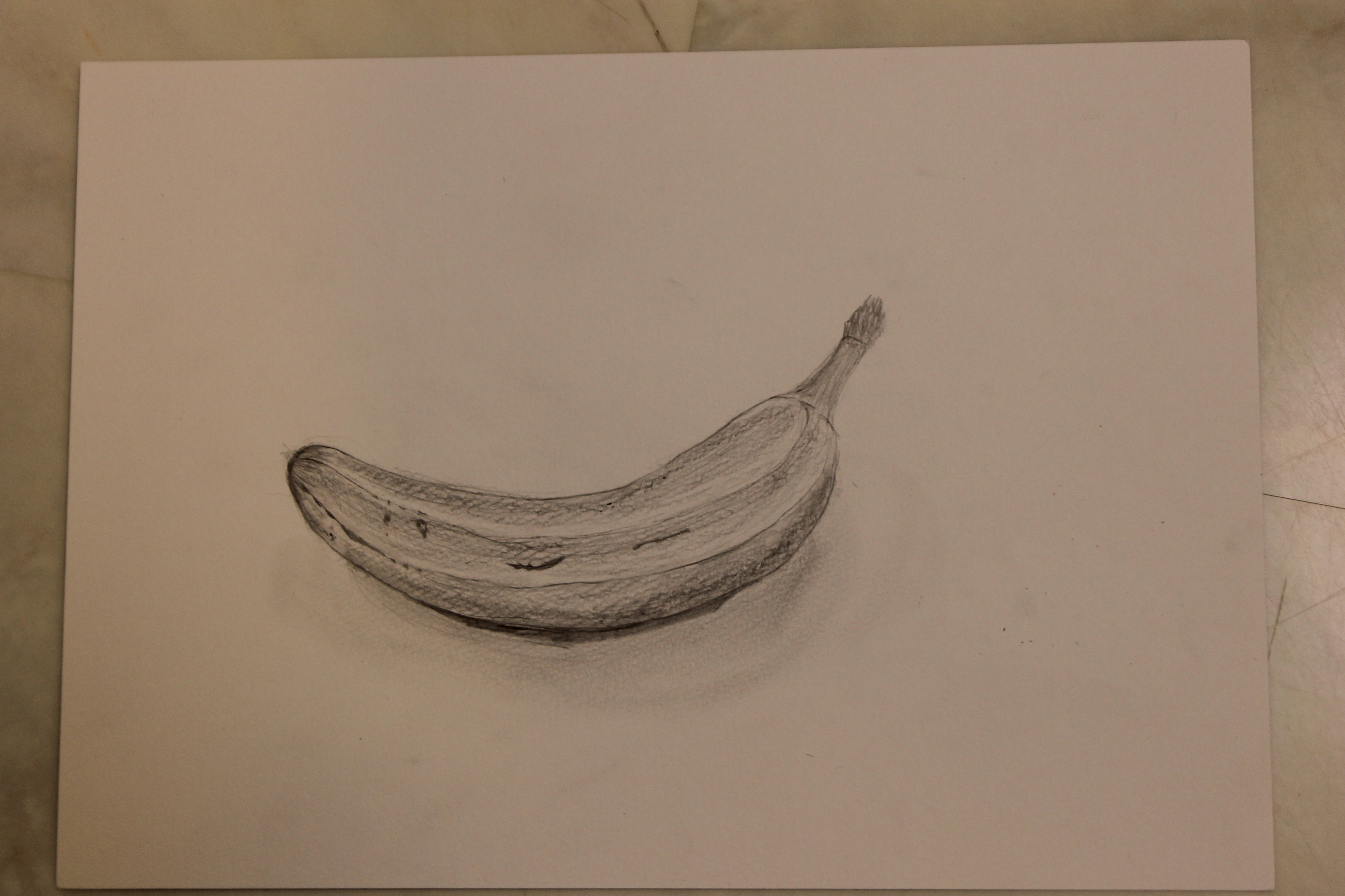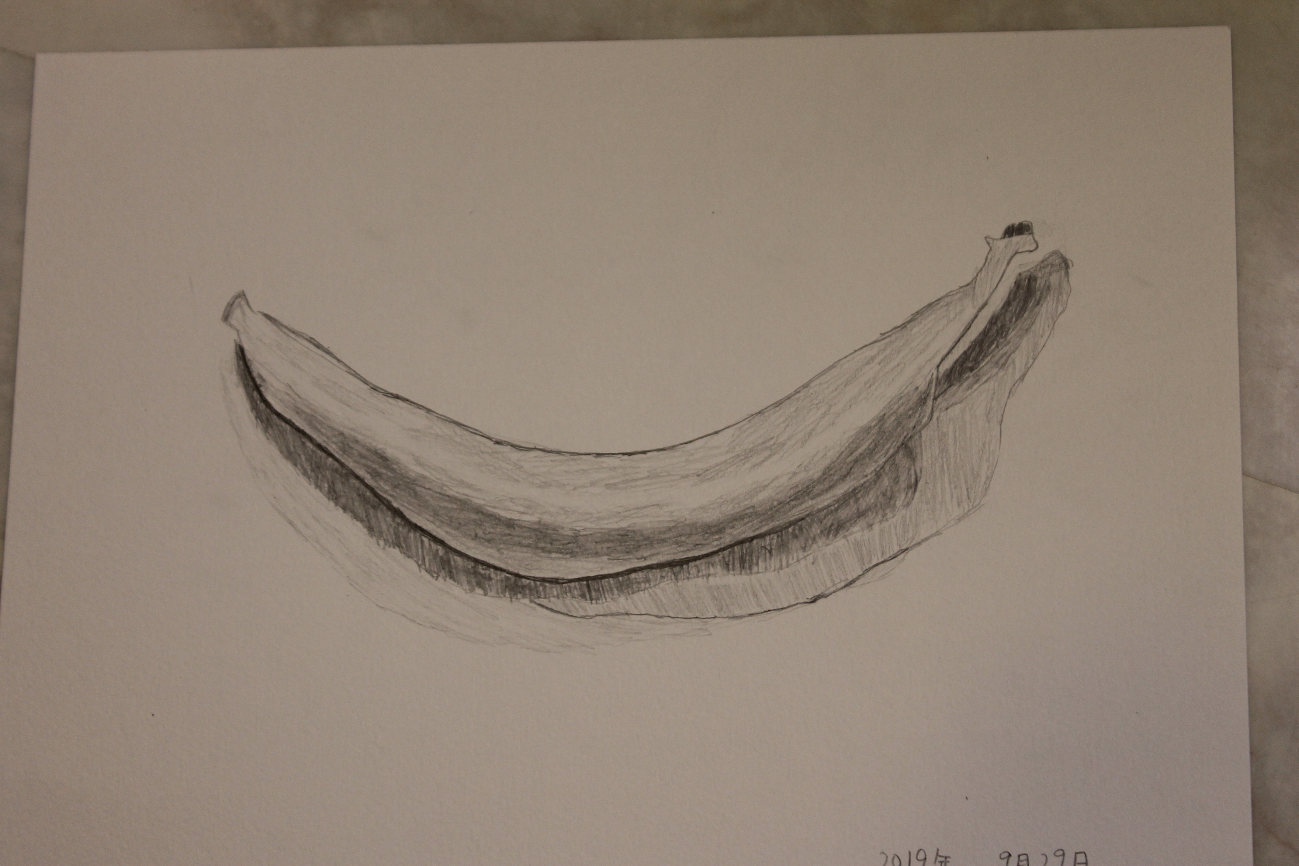 バナナは色が明るいので鉛筆の色をのせるのに抵抗があるお子さんが多いなか、黄色い色味を白い紙と同じ色にならないように注意深く描く生徒さんもいらっしゃいました。小学生は本当にデッサンが上手で驚きます。