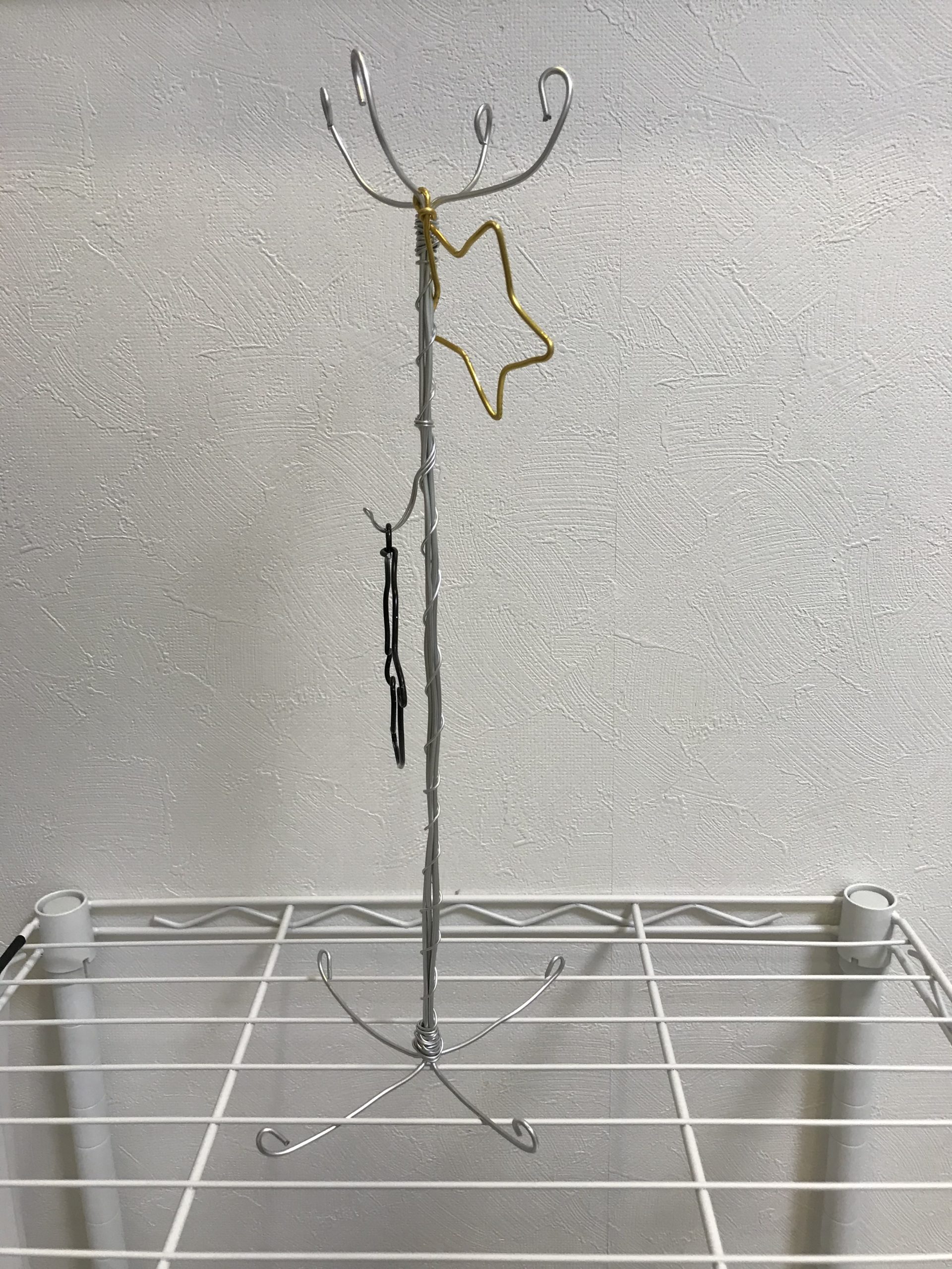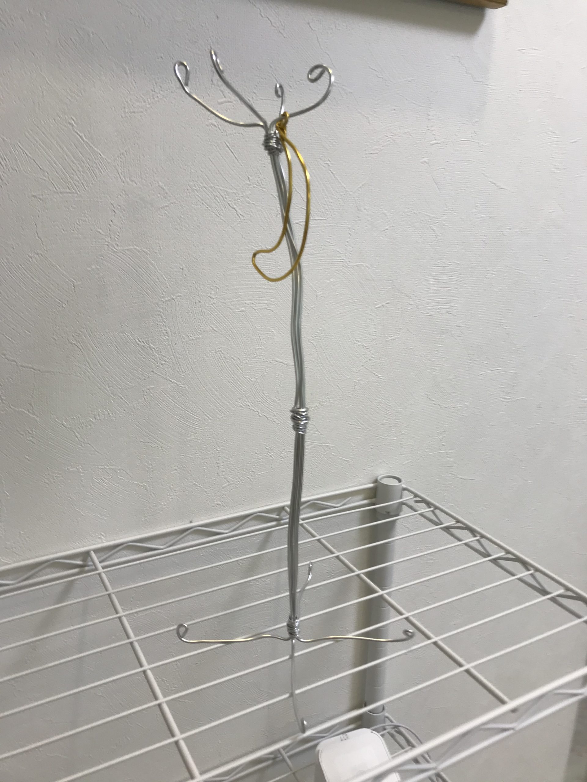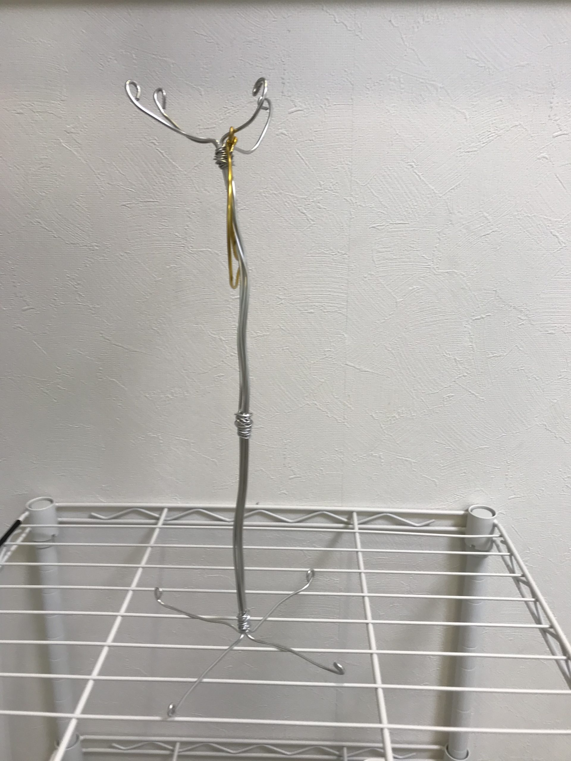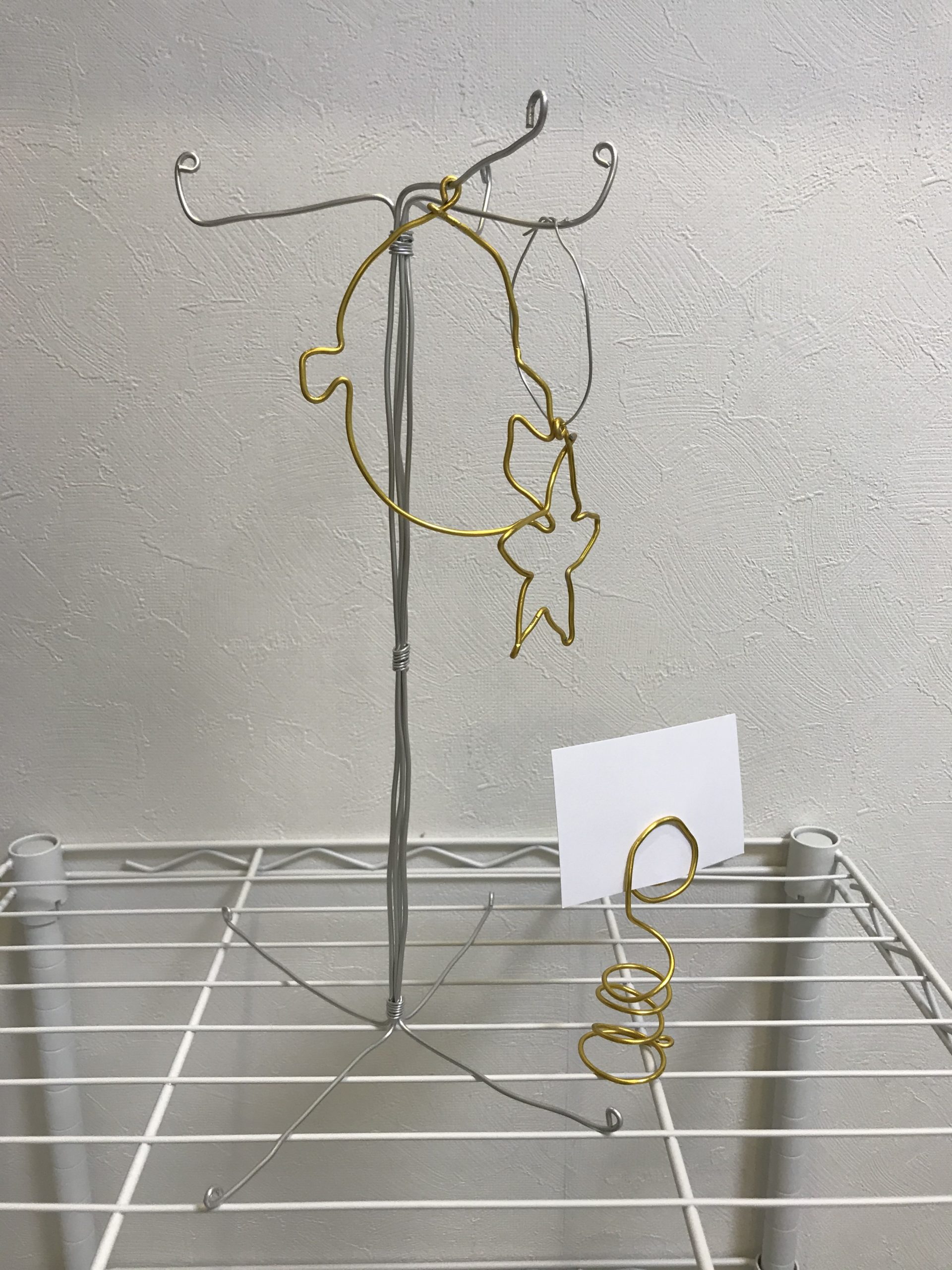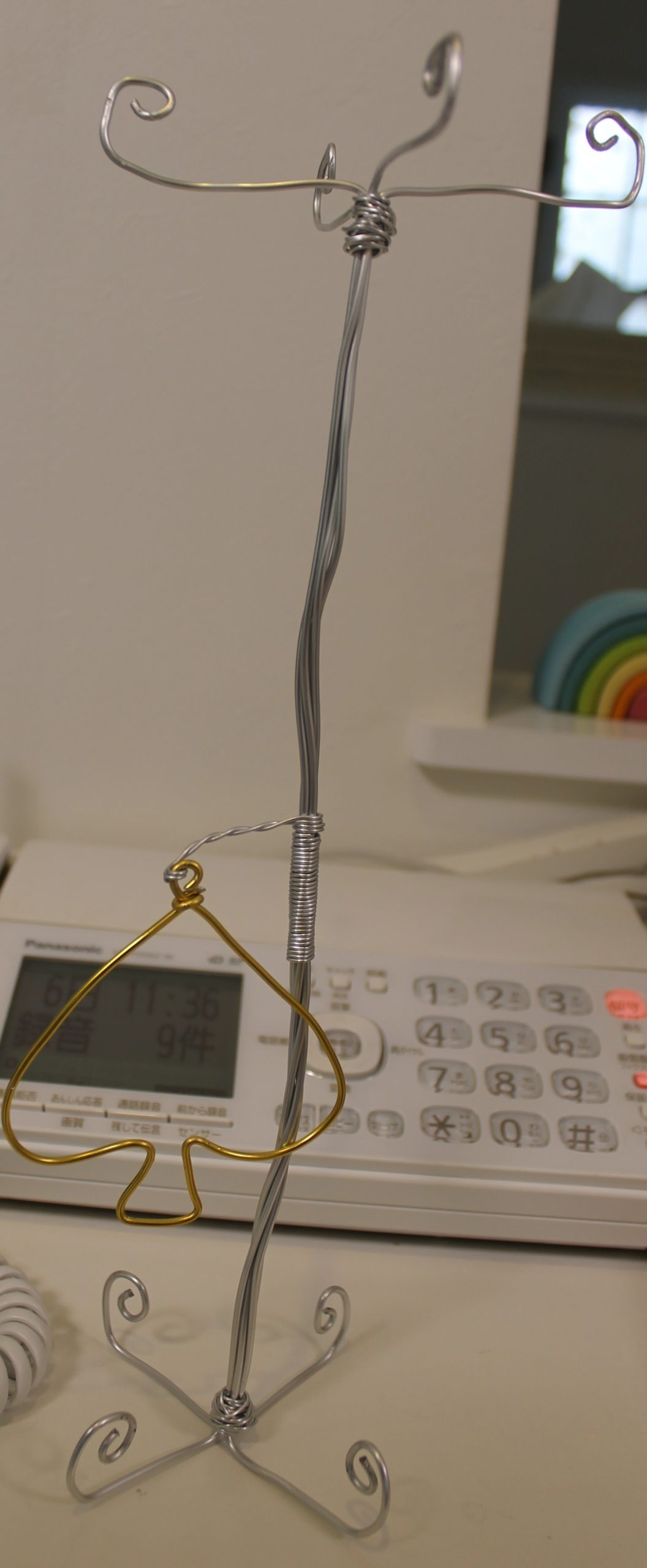 お教室では、お子さんが自ら考え創造的な活動ができるよう、なるべく作り方や手順や方法を教え込むような指導はしないように心がけておりますが、今回のワイヤークラフトに関してはお子さん達が初めて手にする道具と素材なので、まずは扱い方に慣れて頂くため、道具の使い方などをお伝えしながら同じ形のマスクスタンドを作ってみました。
