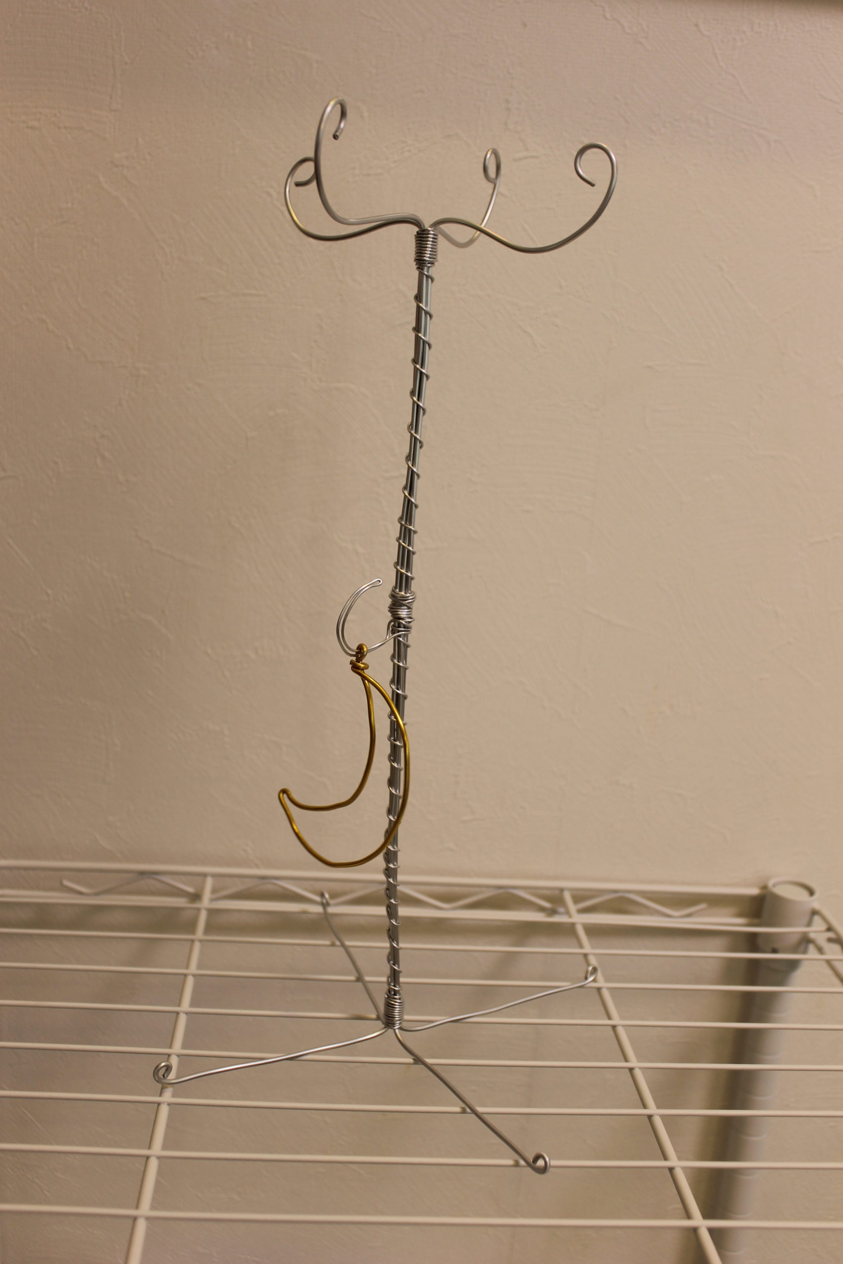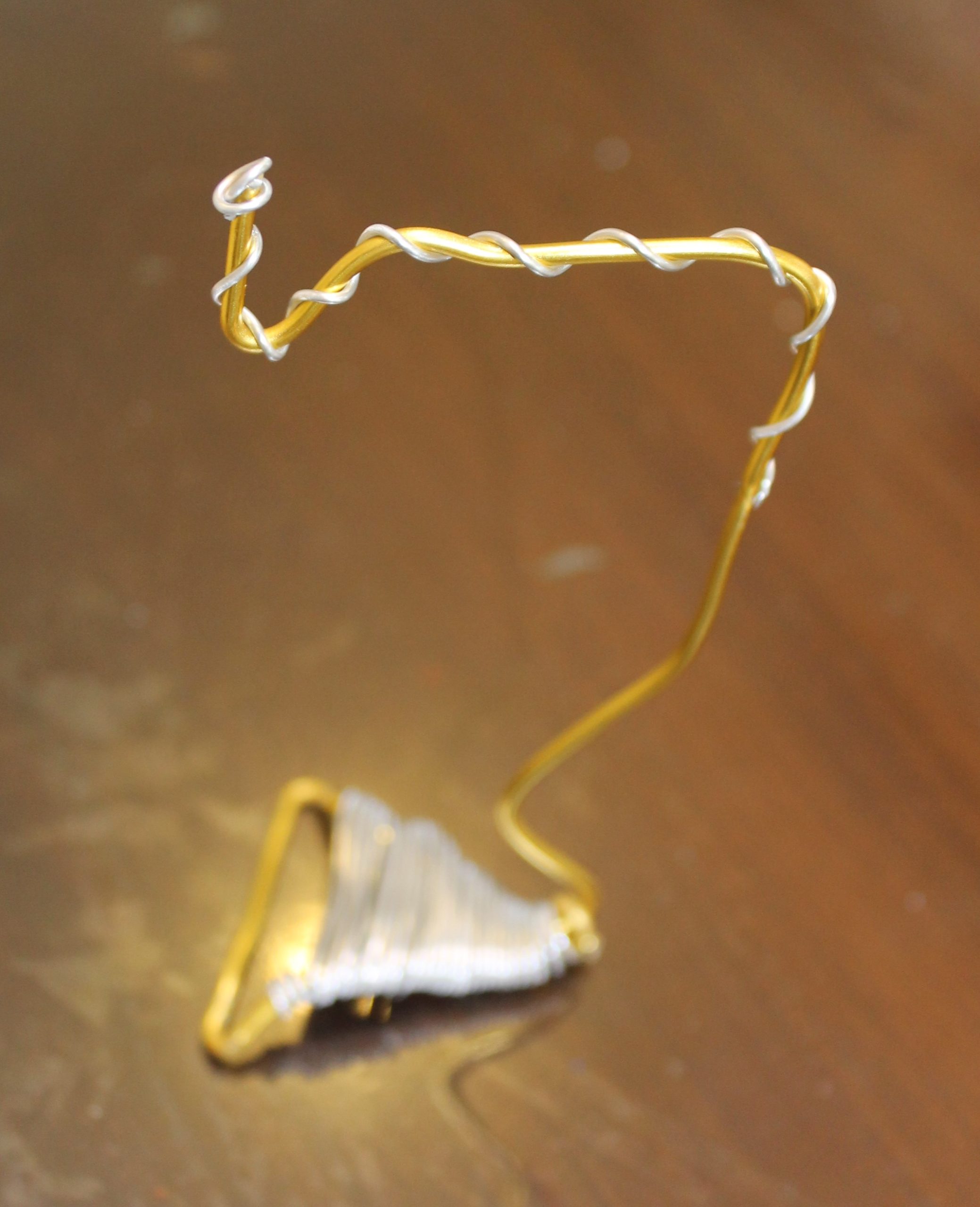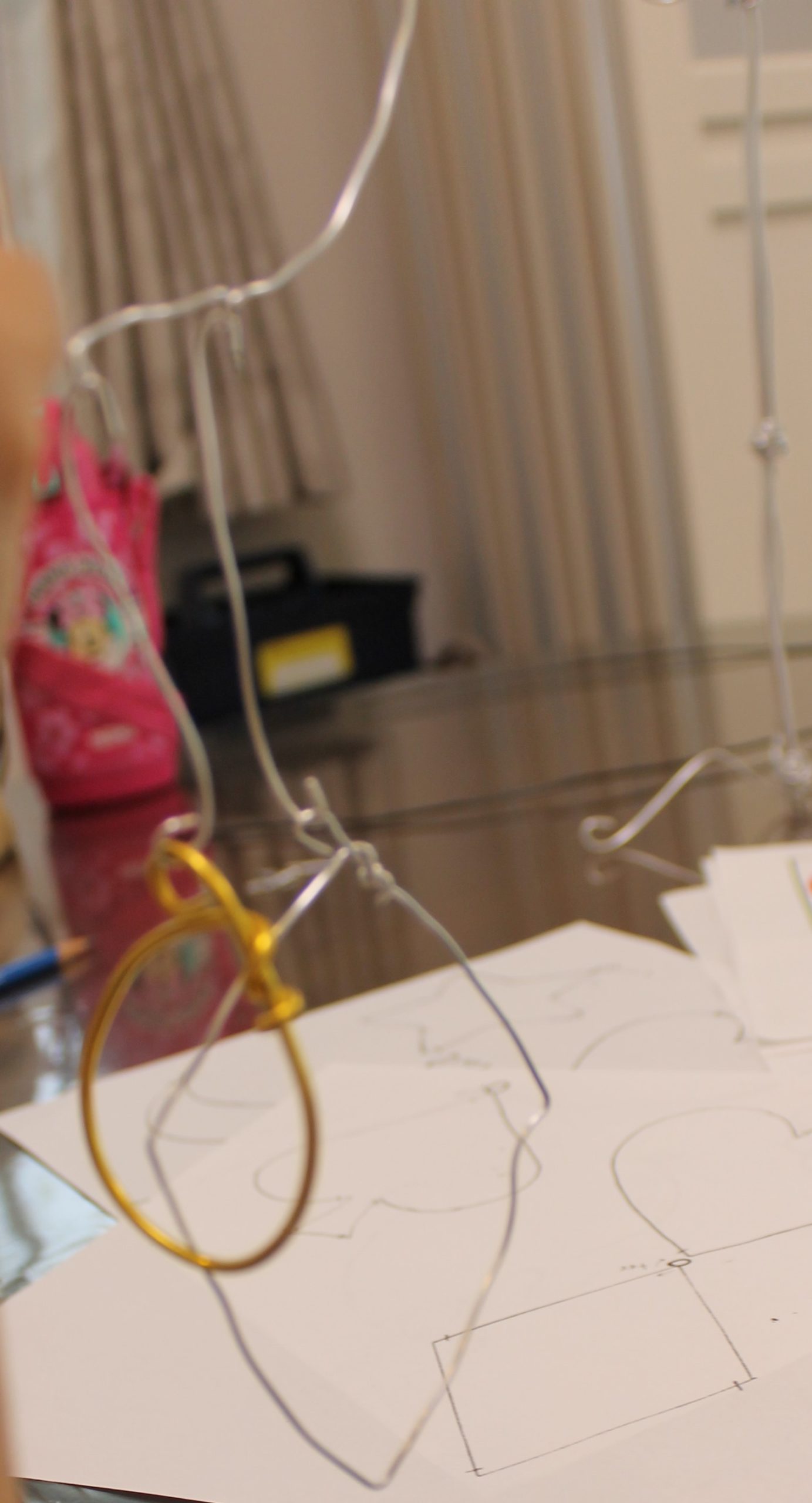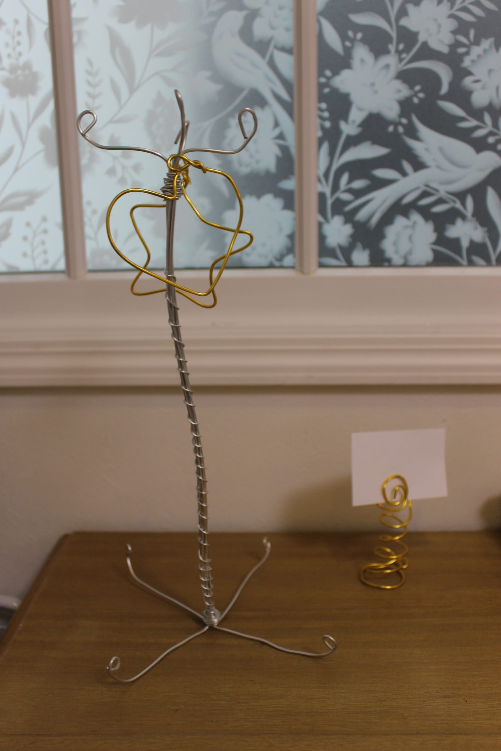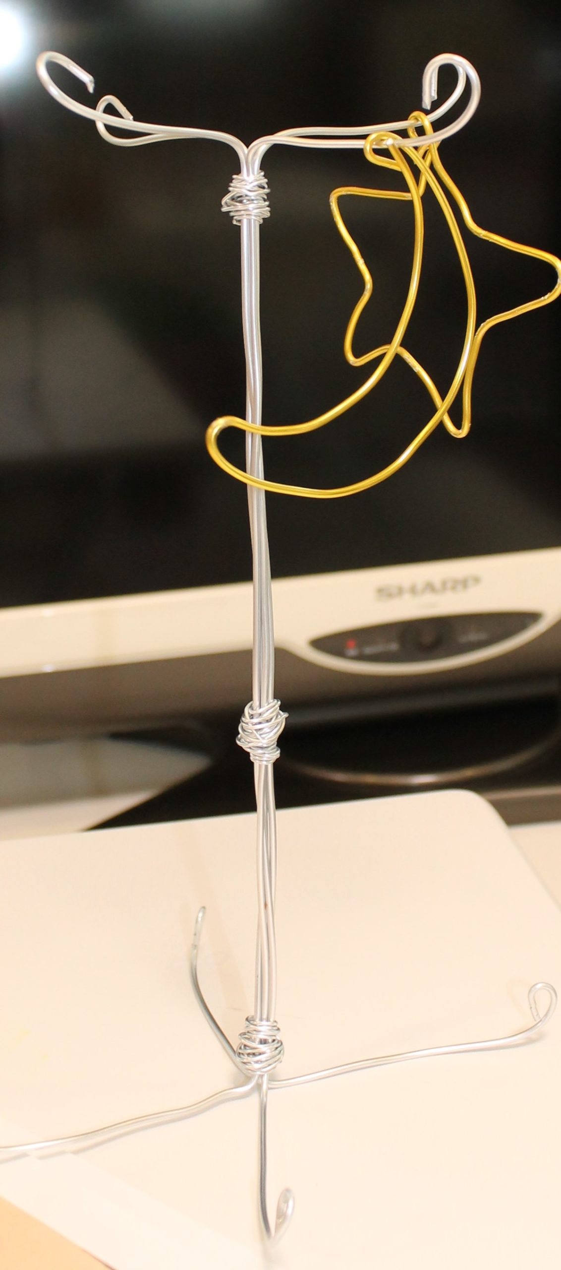お教室では、お子さんが自ら考え創造的な活動ができるよう、なるべく作り方や手順や方法を教え込むような指導はしないように心がけておりますが、今回のワイヤークラフトに関してはお子さん達が初めて手にする道具と素材なので、まずは扱い方に慣れて頂くため、道具の使い方などをお伝えしながら同じ形のマスクスタンドを作ってみました。