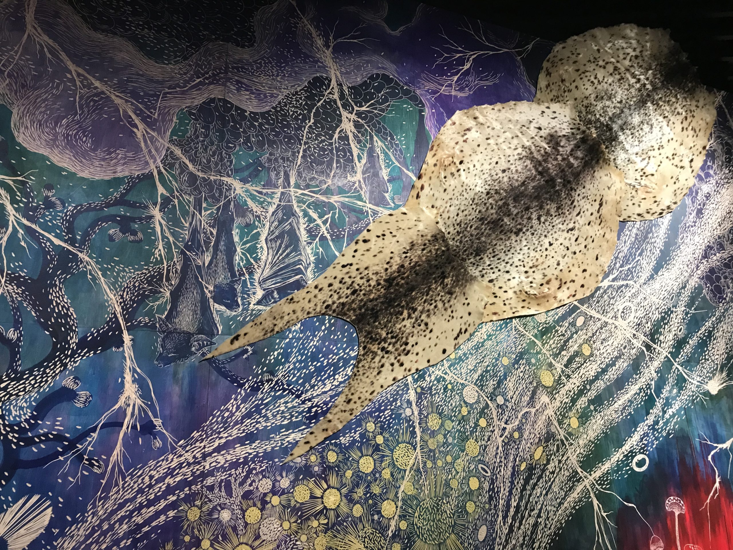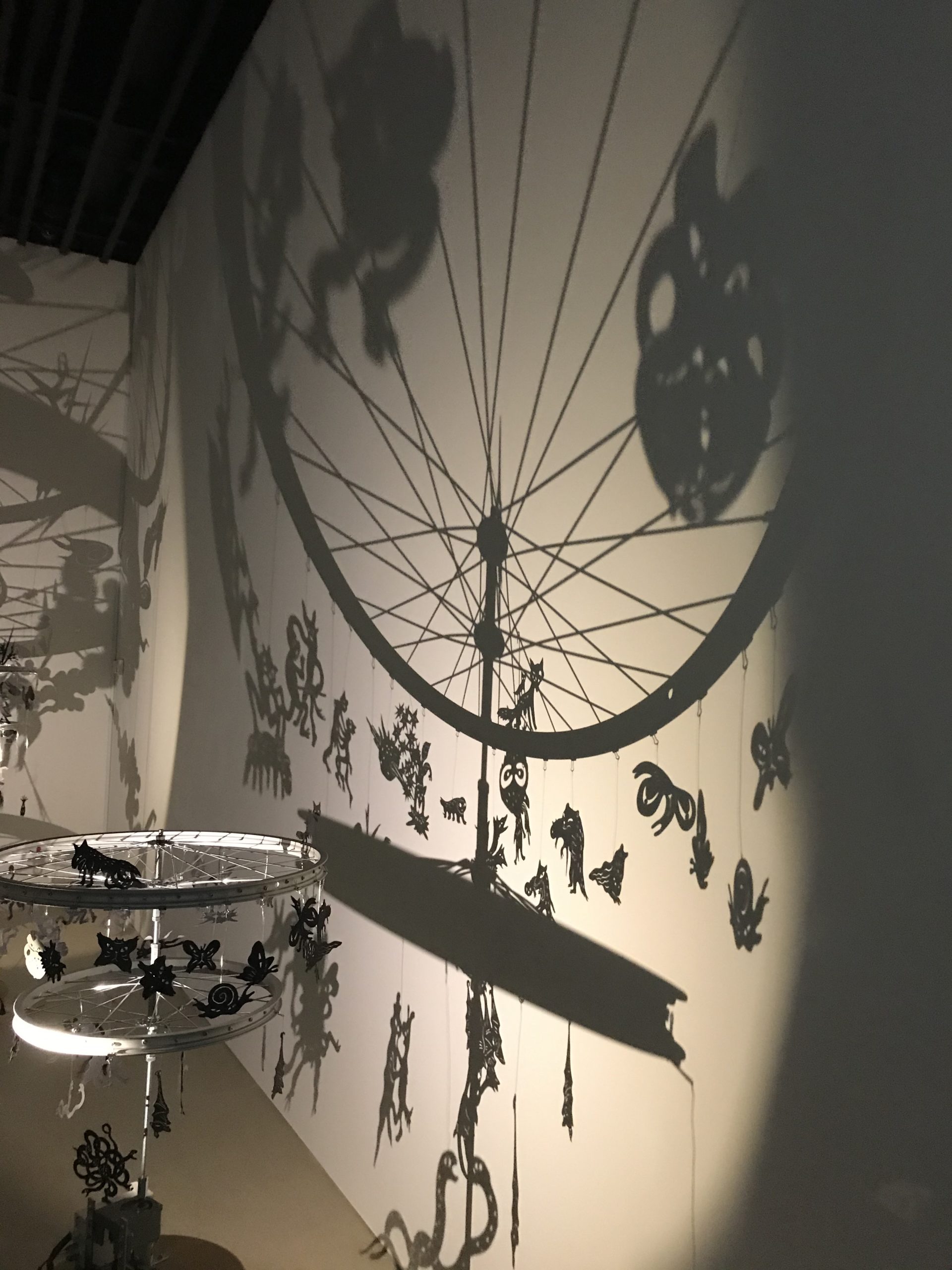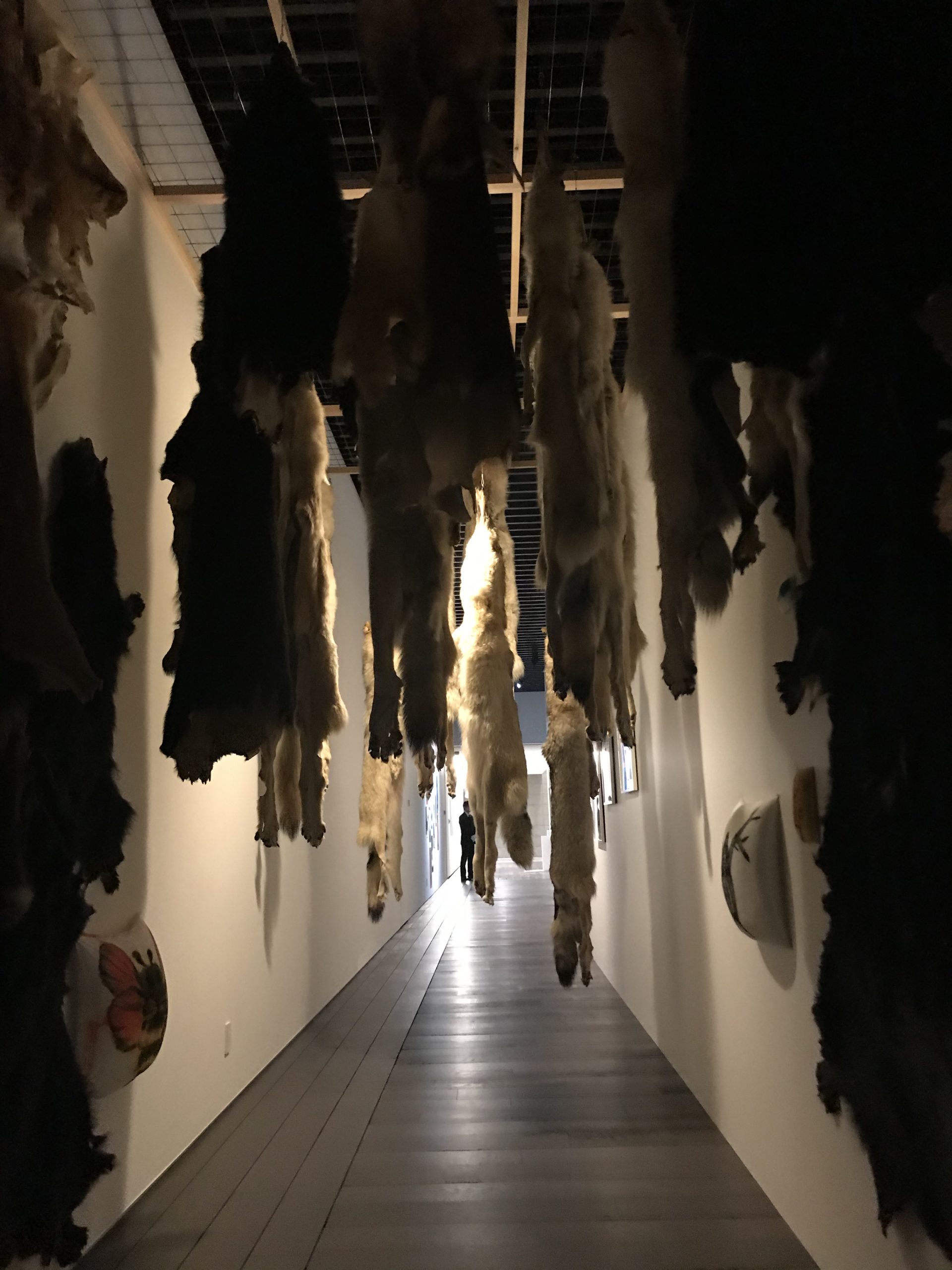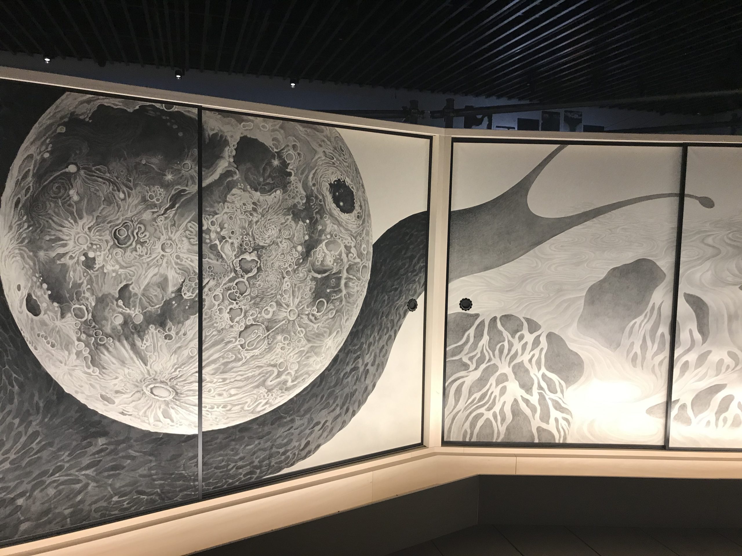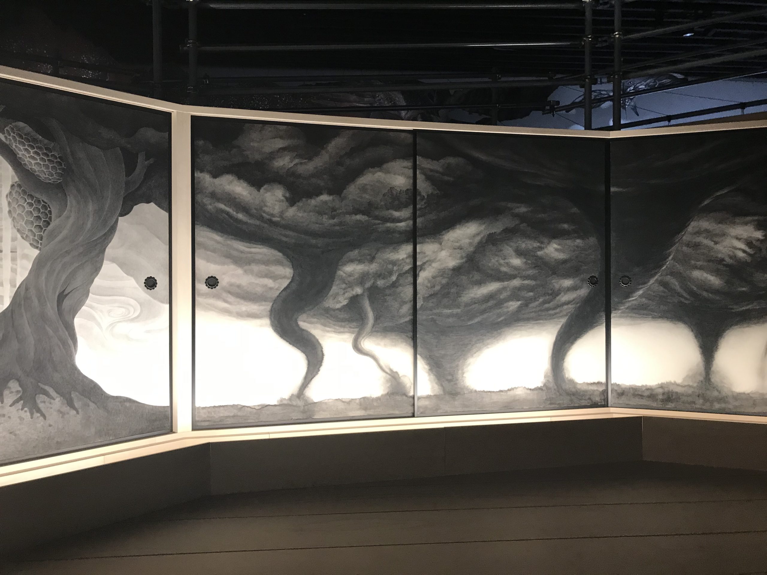 動物の毛皮が吊るされた作品、実際に滑ることができるすべり台の先に襖絵がある大型の作品、動く影絵の作品、立体作品映像作品など、感性を強く動かされ圧倒される鴻池さんの作品に、生徒さん達は少し怖がりながらもとても興味を持って下さり、作品を食い入るようにご覧になっていました。