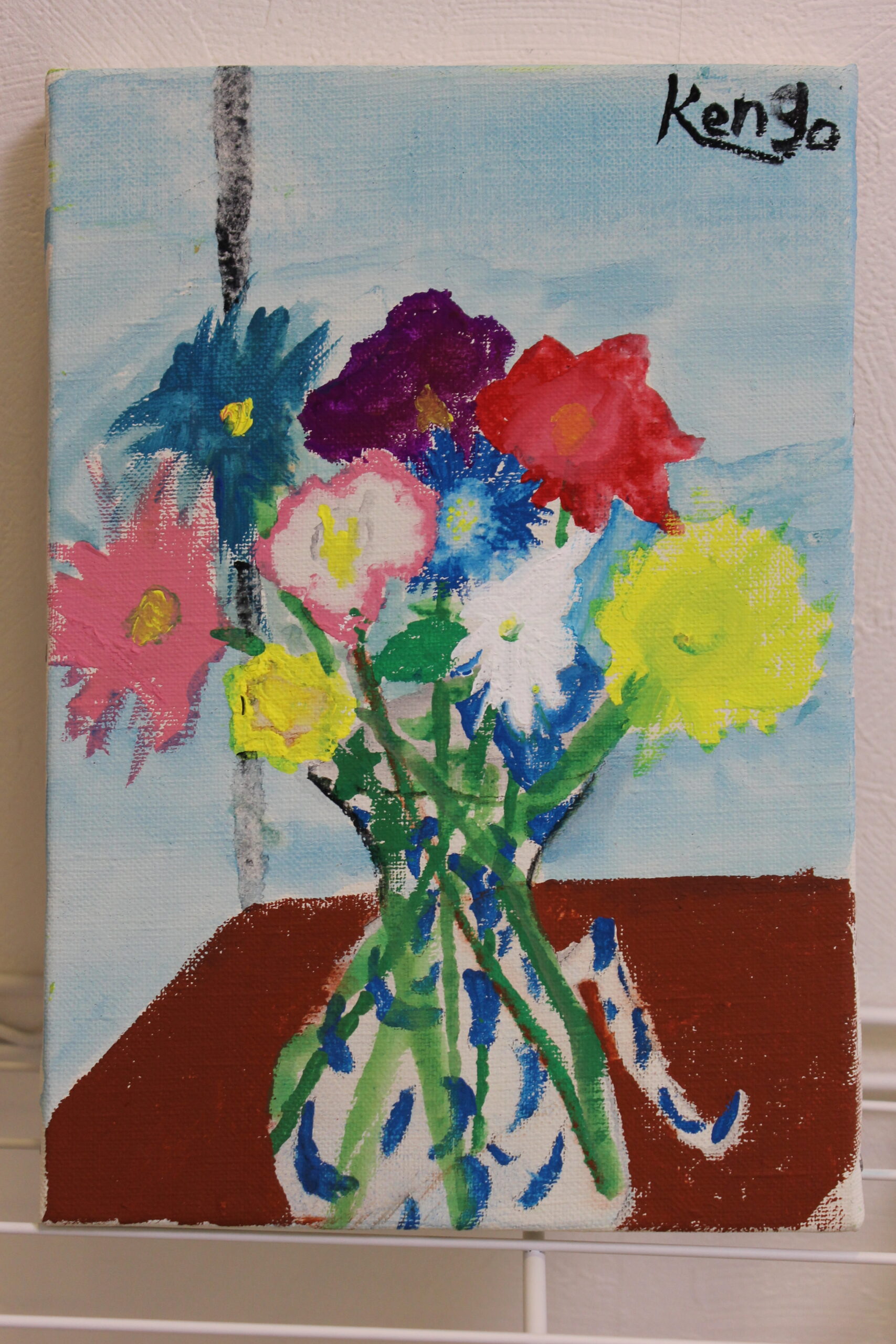 今月のこどもクラスでは、キャンバスにアクリル絵の具で春らしい花を描いています。