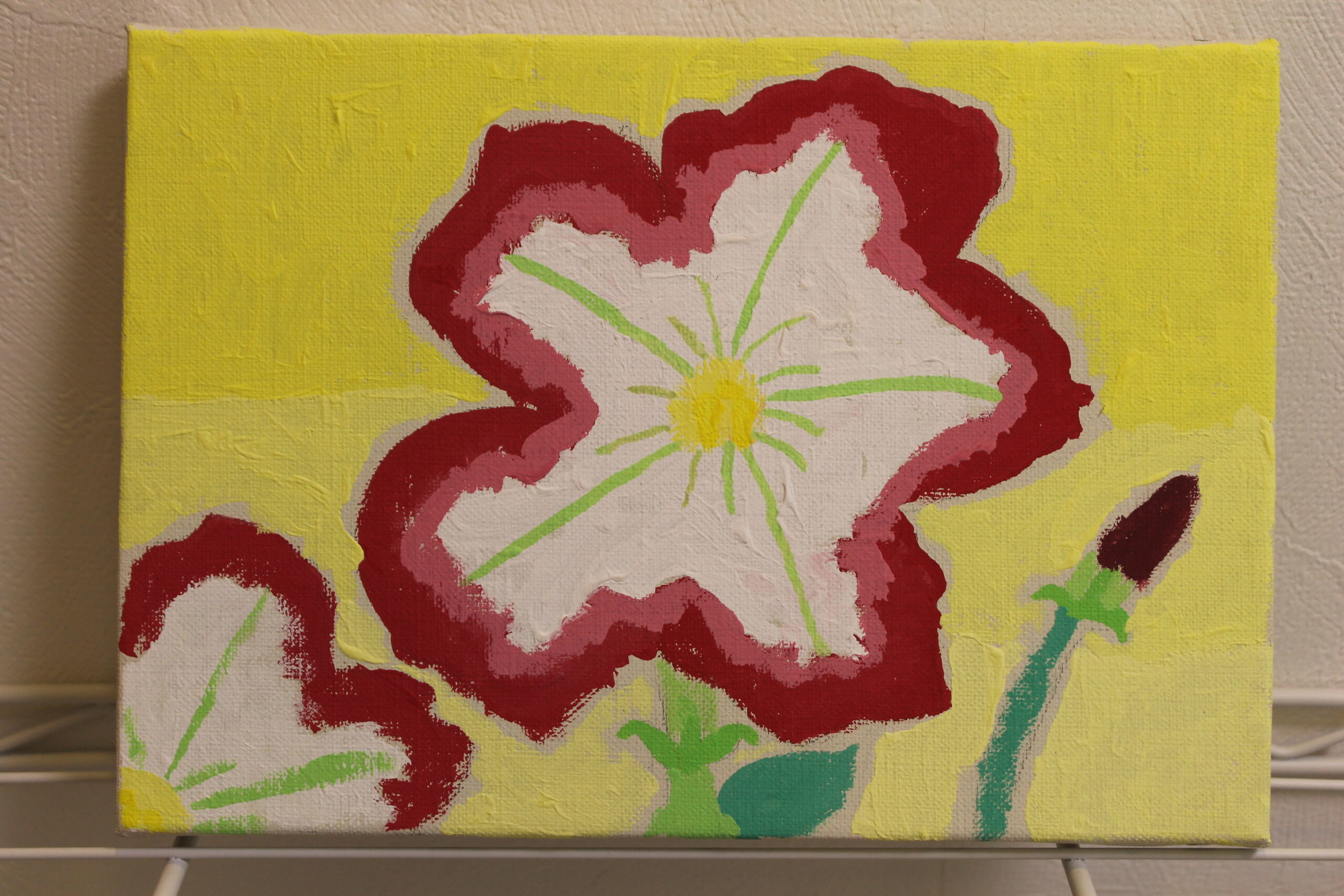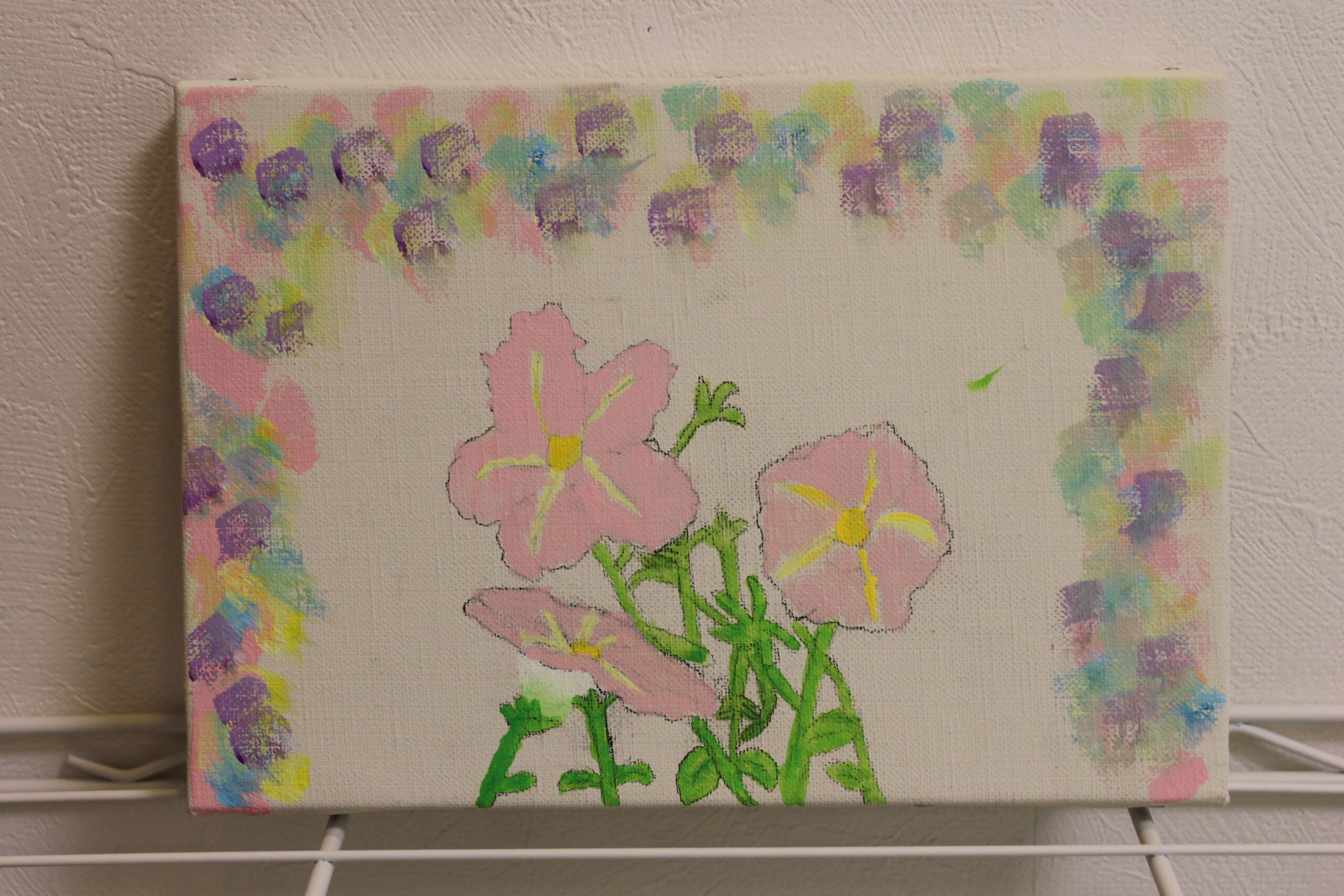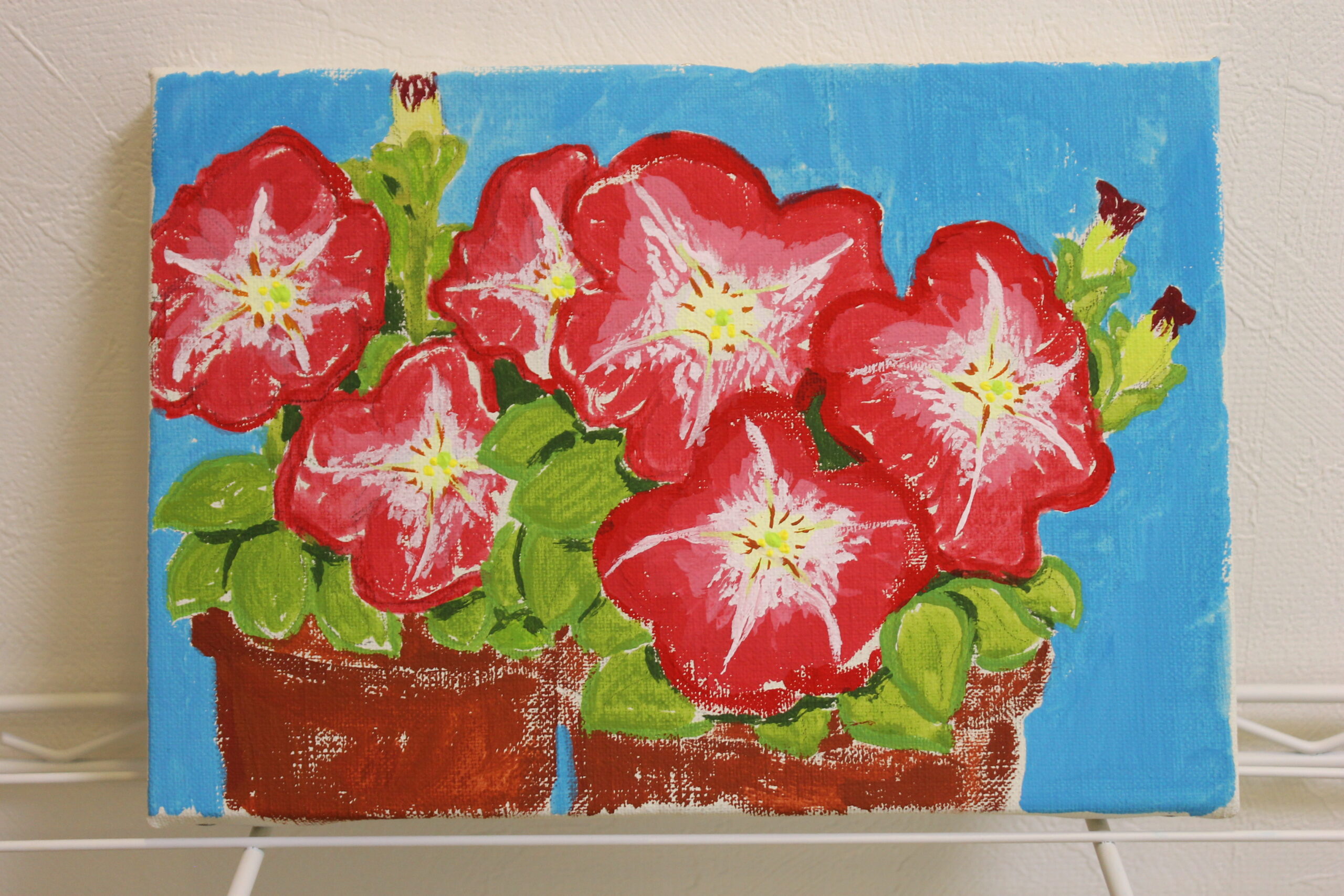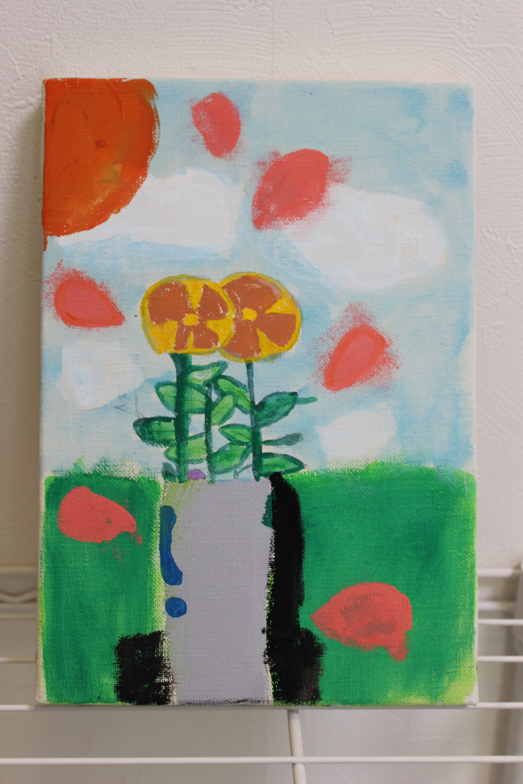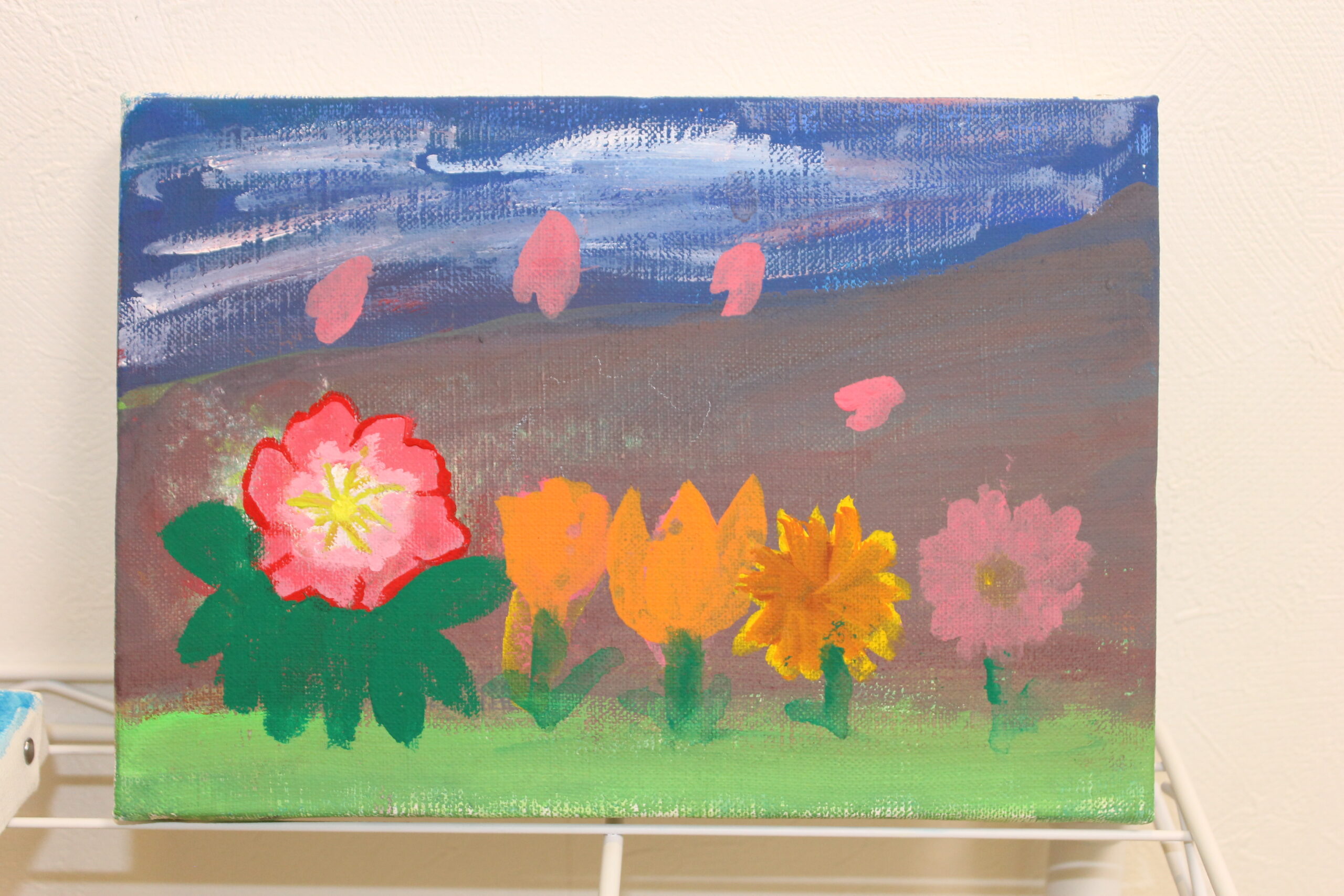 今月のこどもクラスでは、キャンバスにアクリル絵の具で春らしい花を描いています。