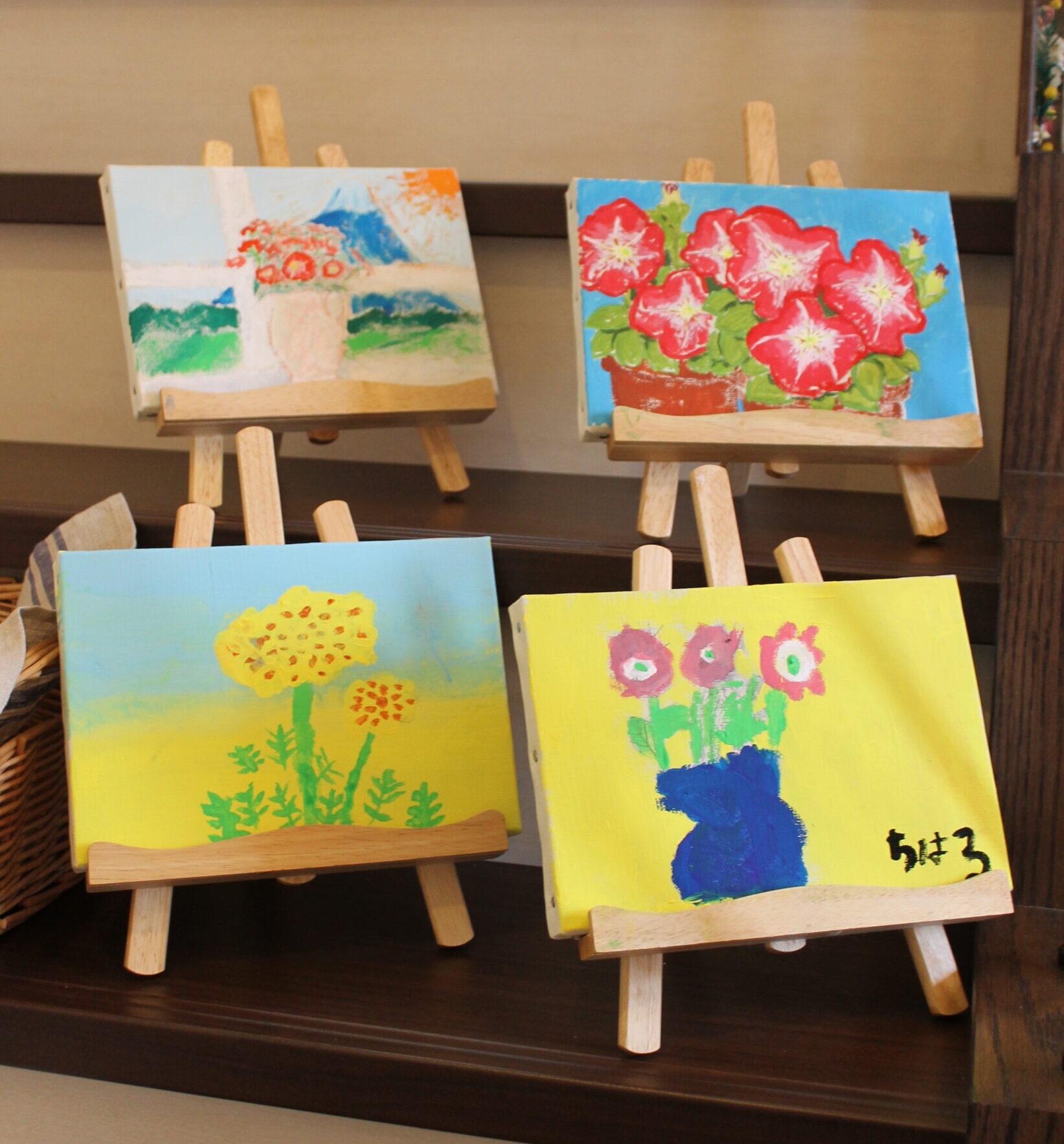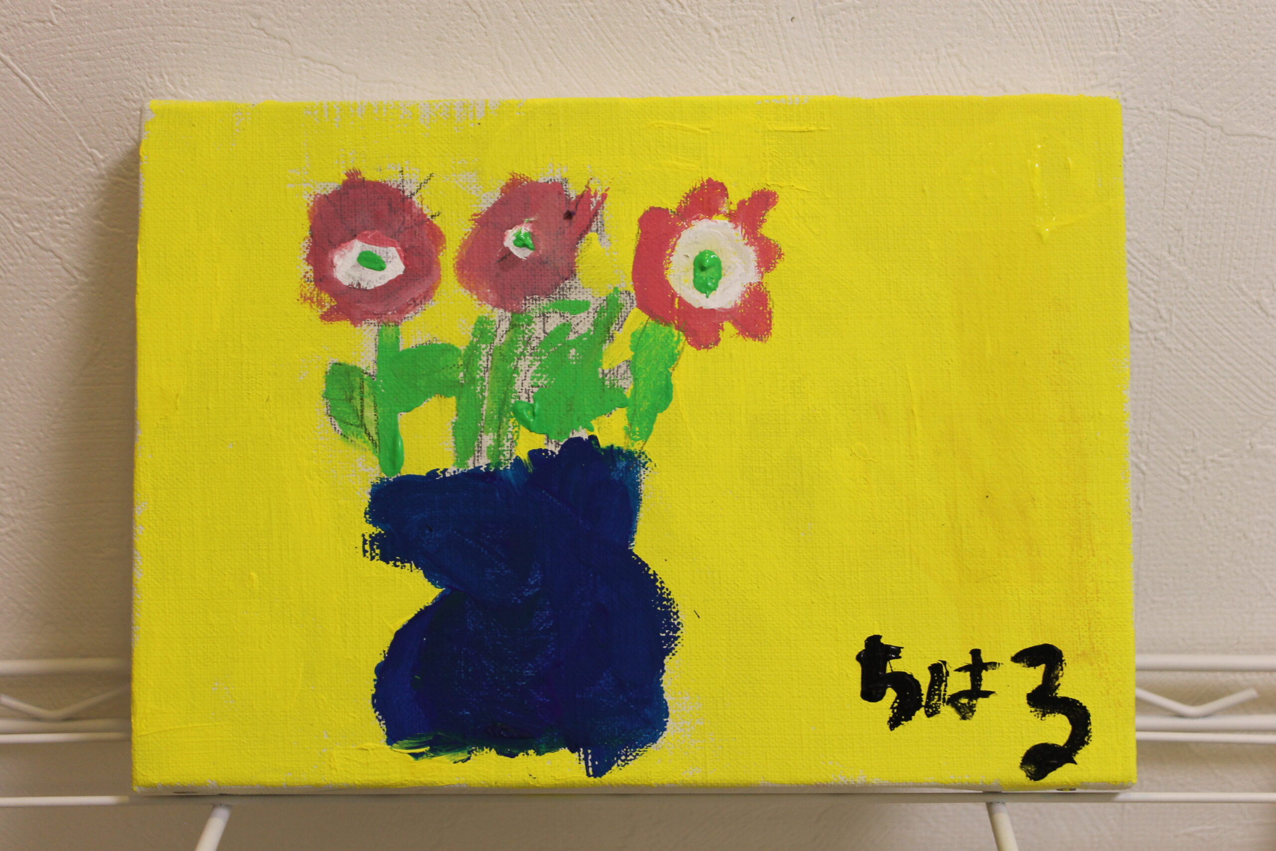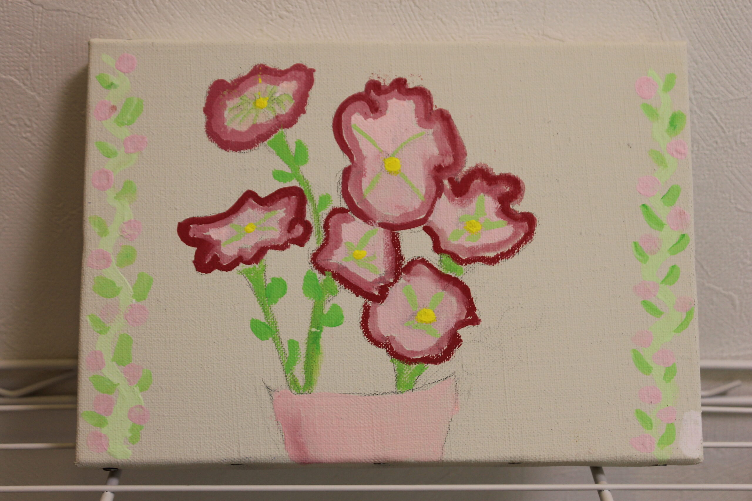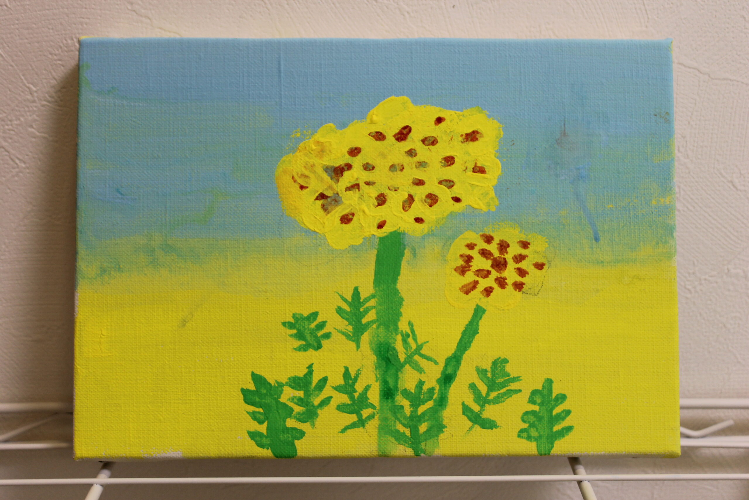 今月のこどもクラスでは、キャンバスにアクリル絵の具で春らしい花を描いています。