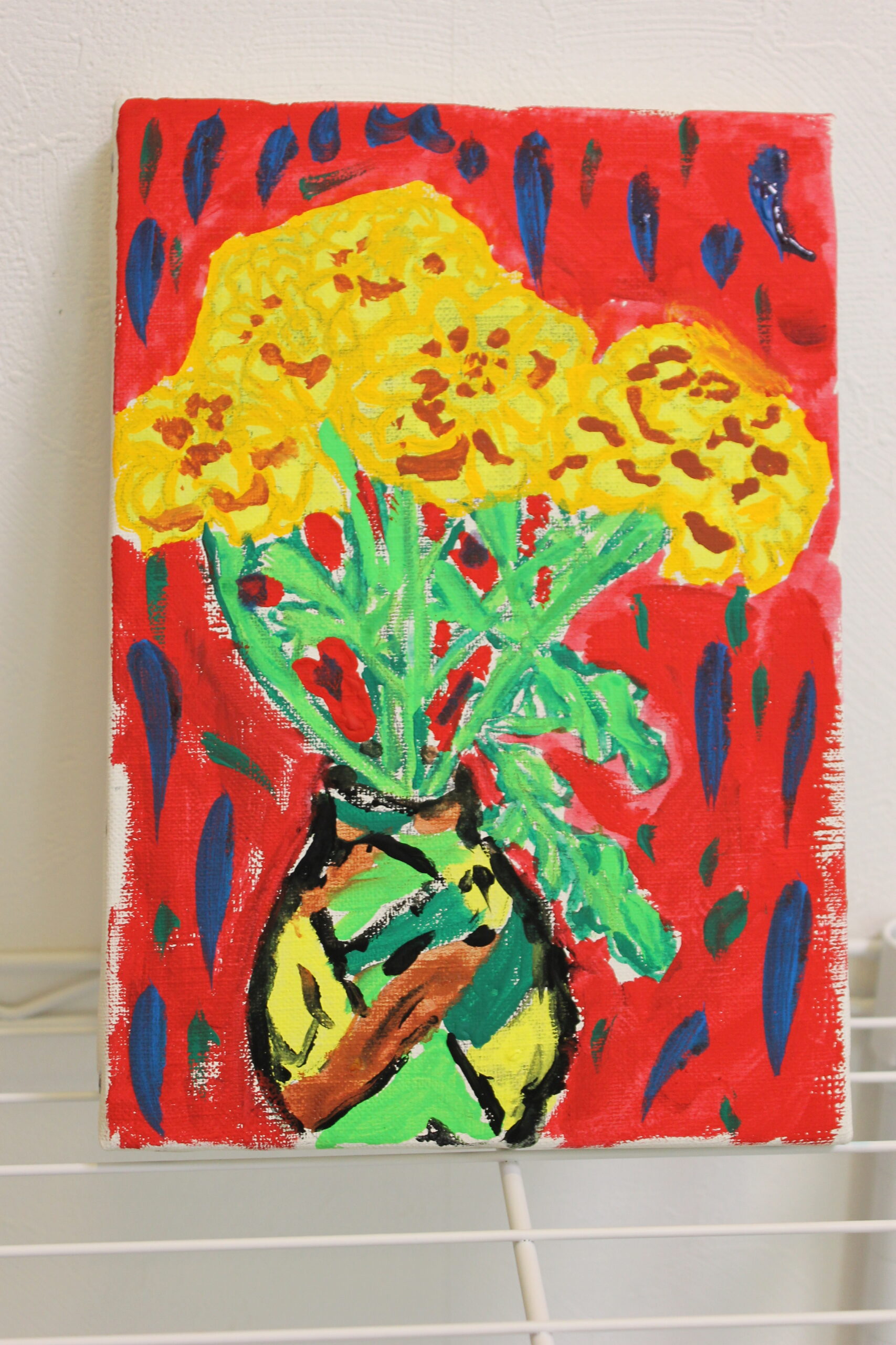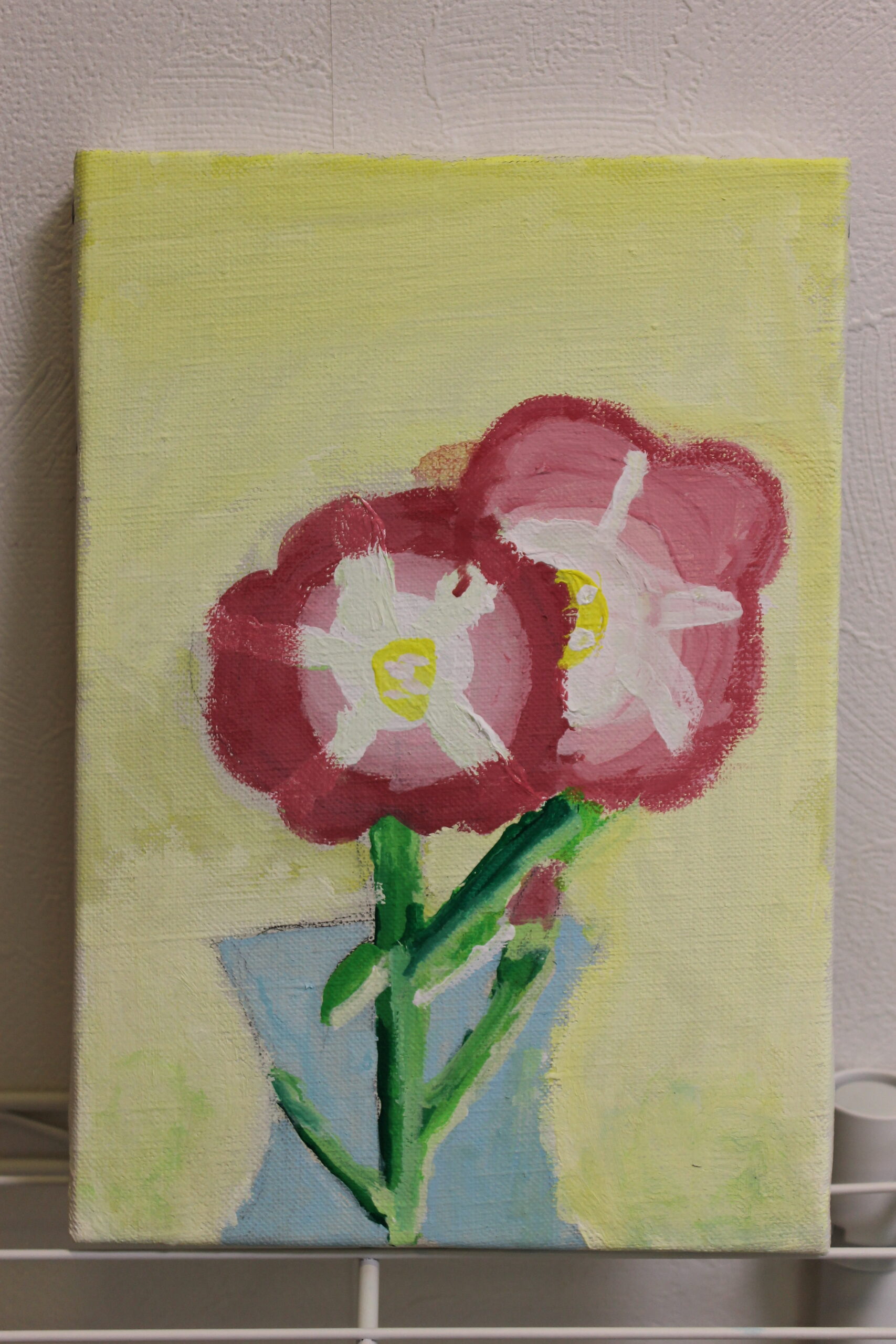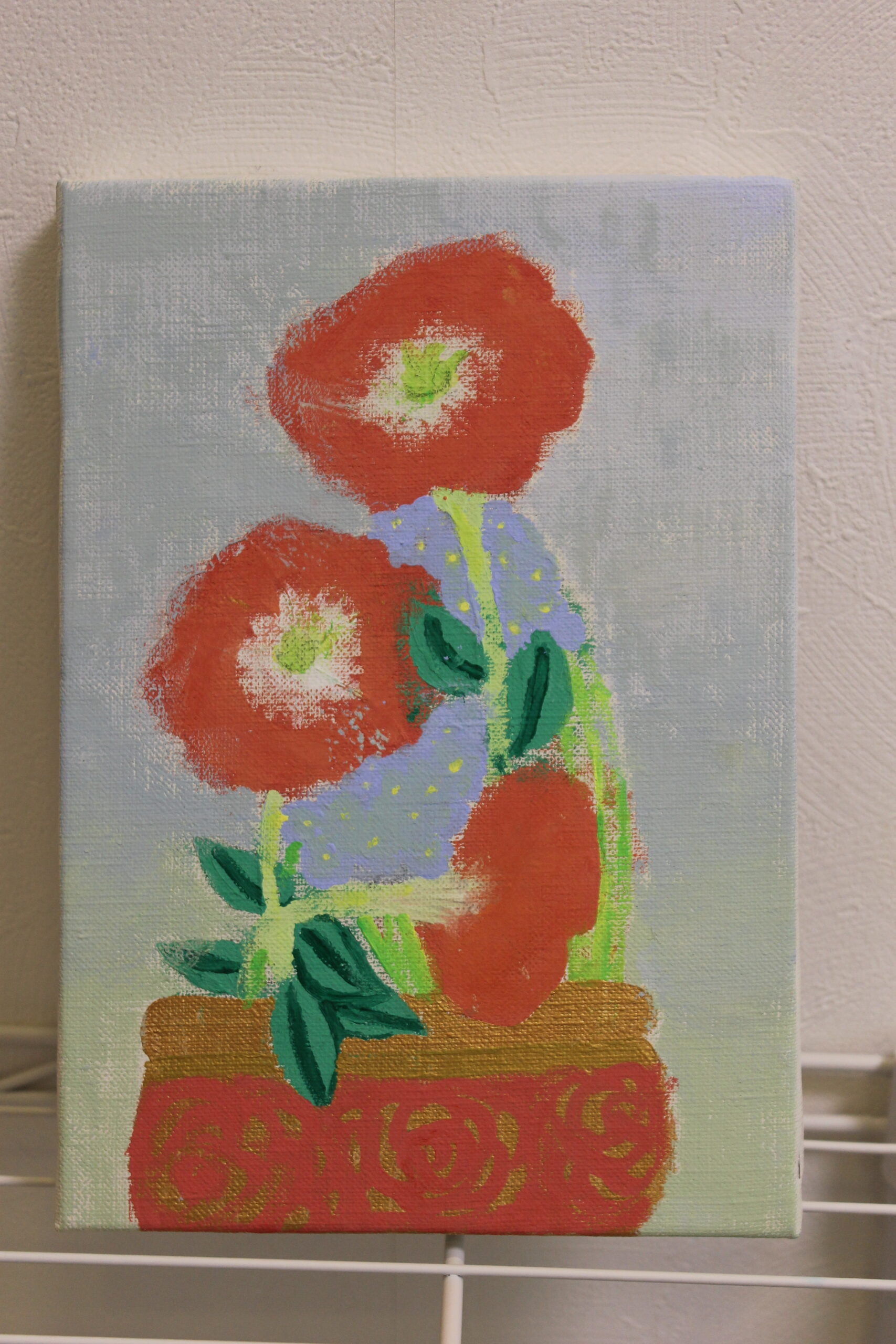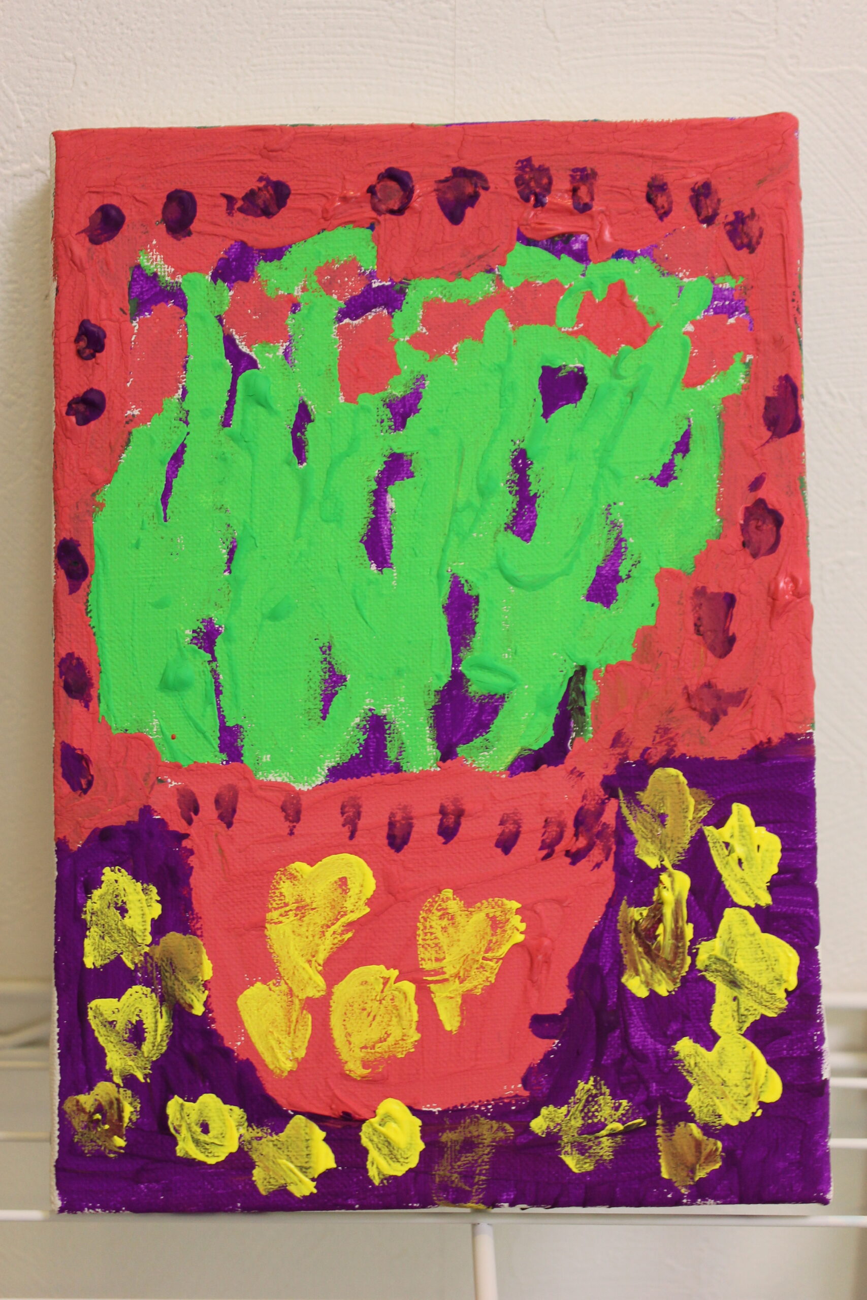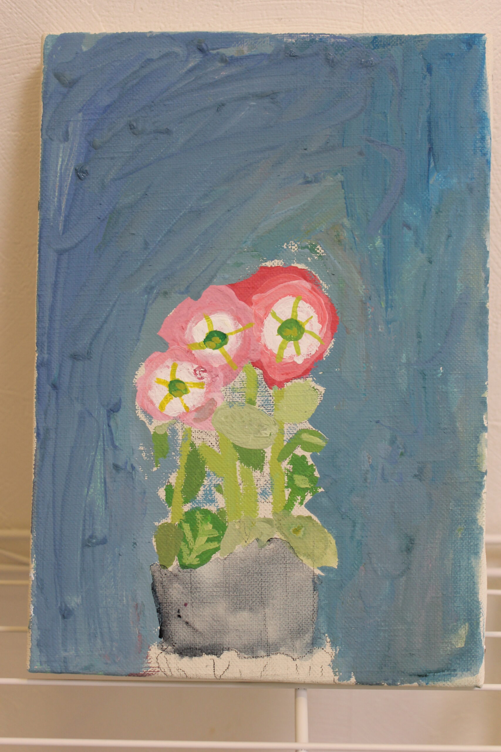 今月のこどもクラスでは、キャンバスにアクリル絵の具で春らしい花を描いています。