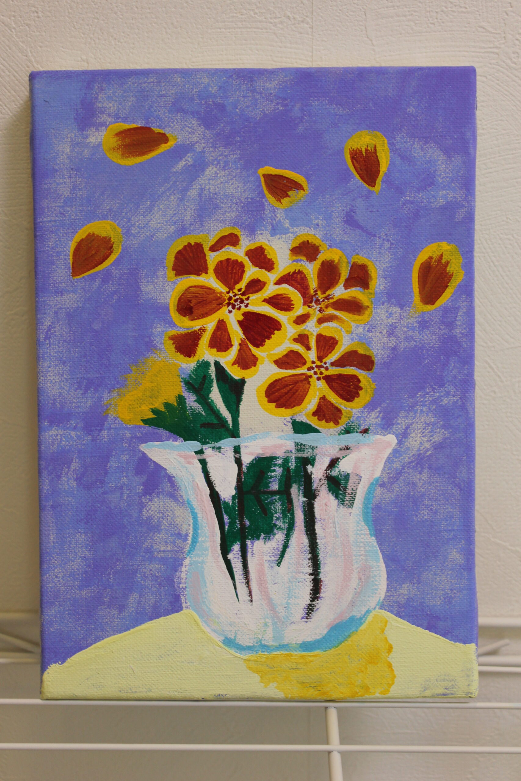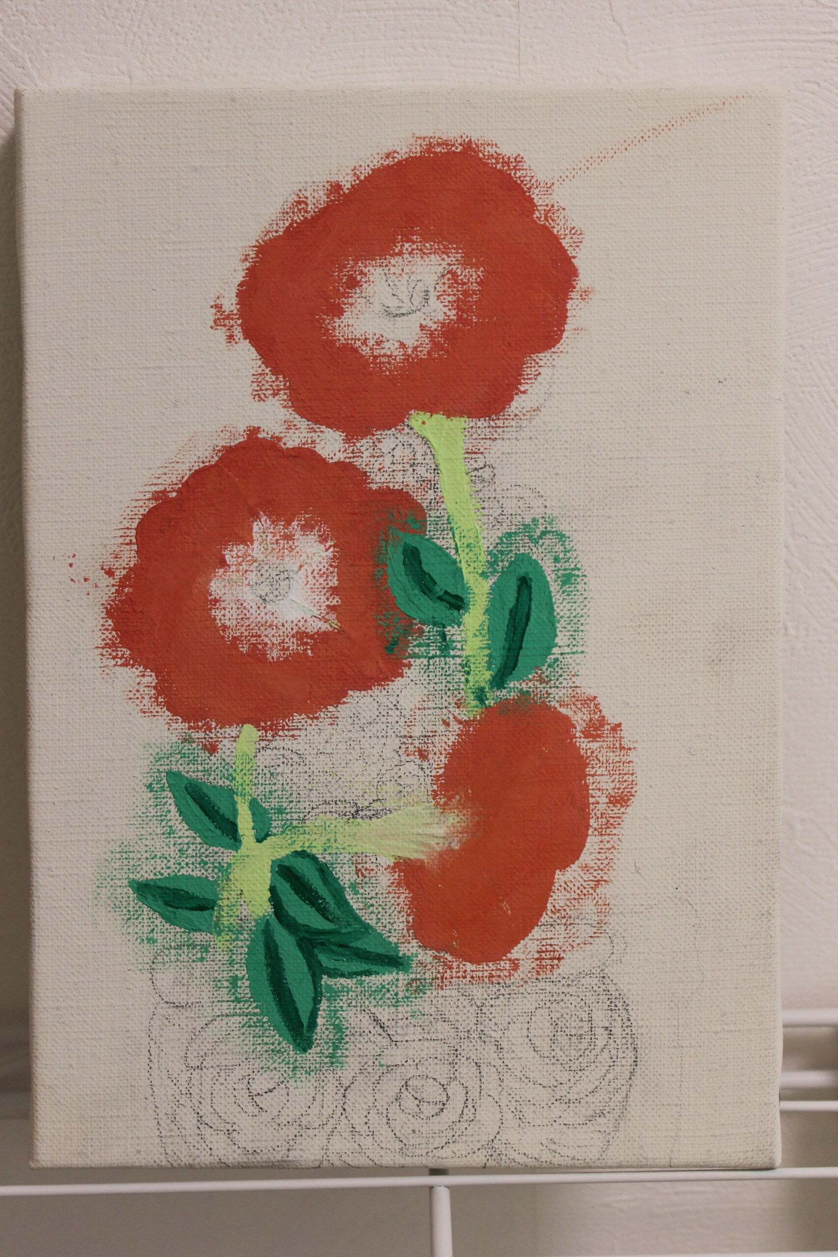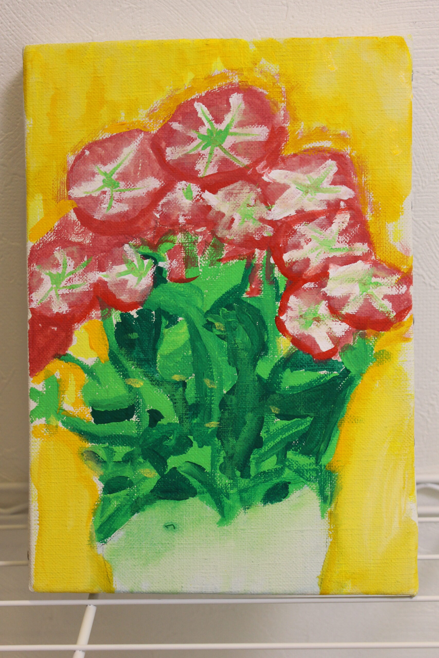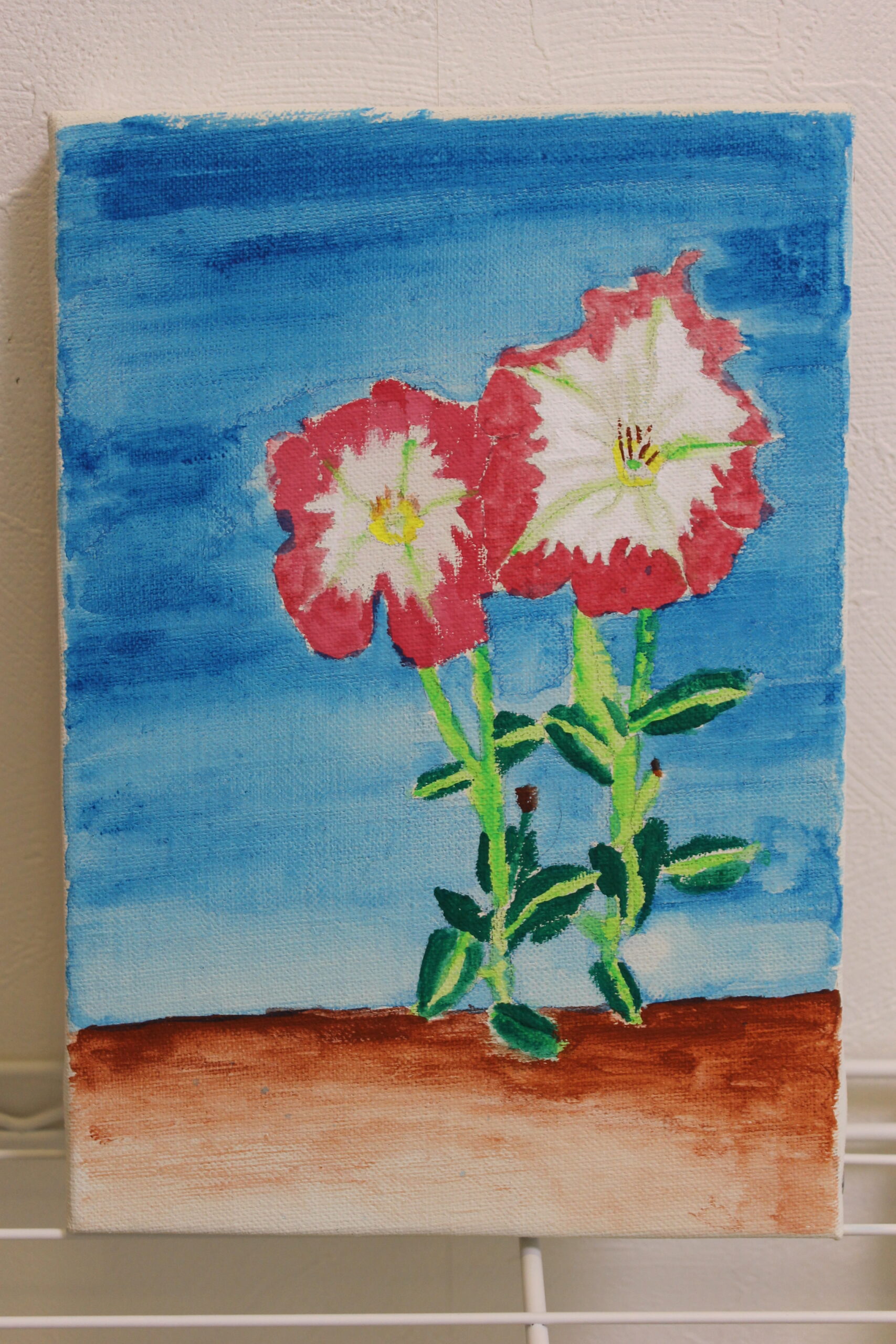 今月のこどもクラスでは、キャンバスにアクリル絵の具で春らしい花を描いています。