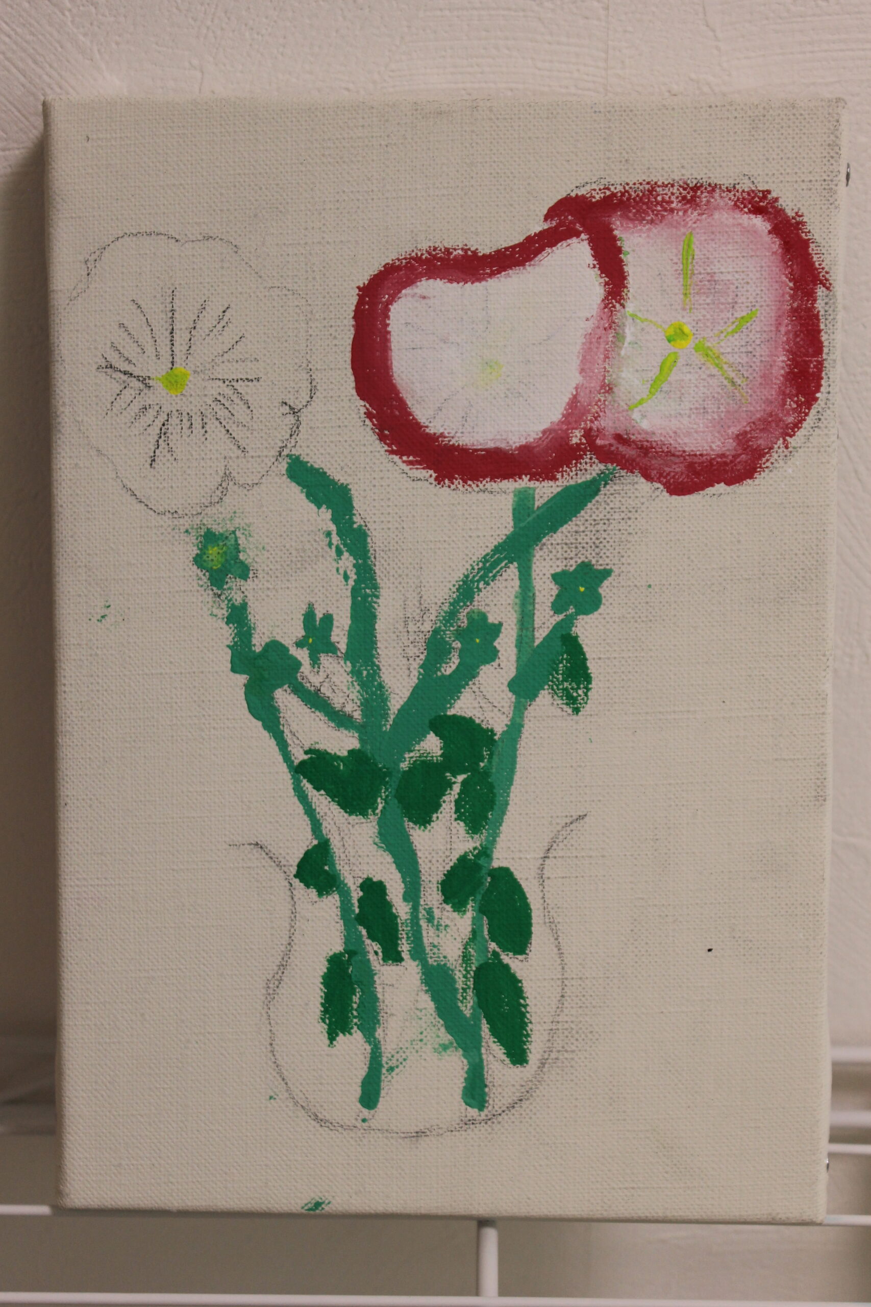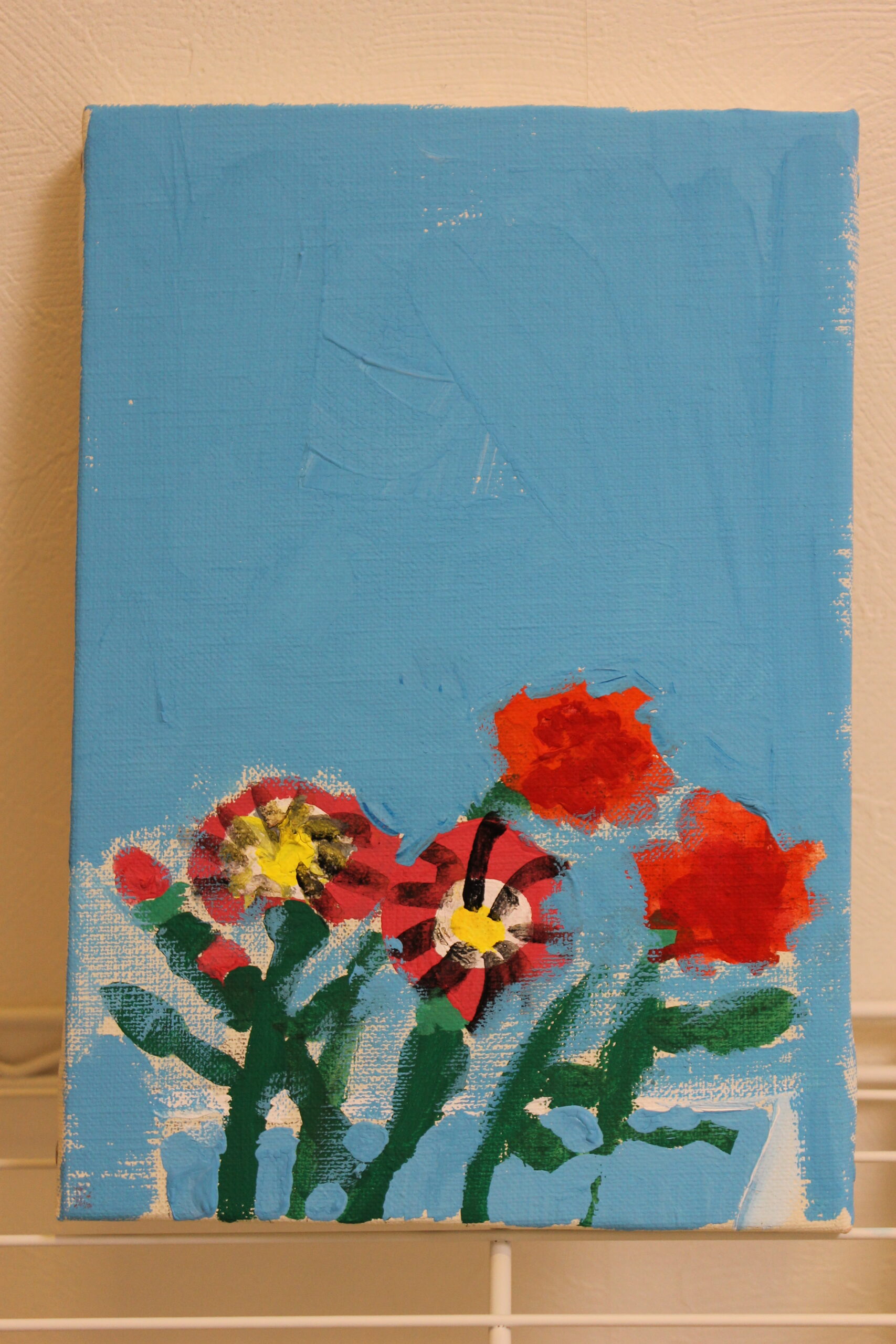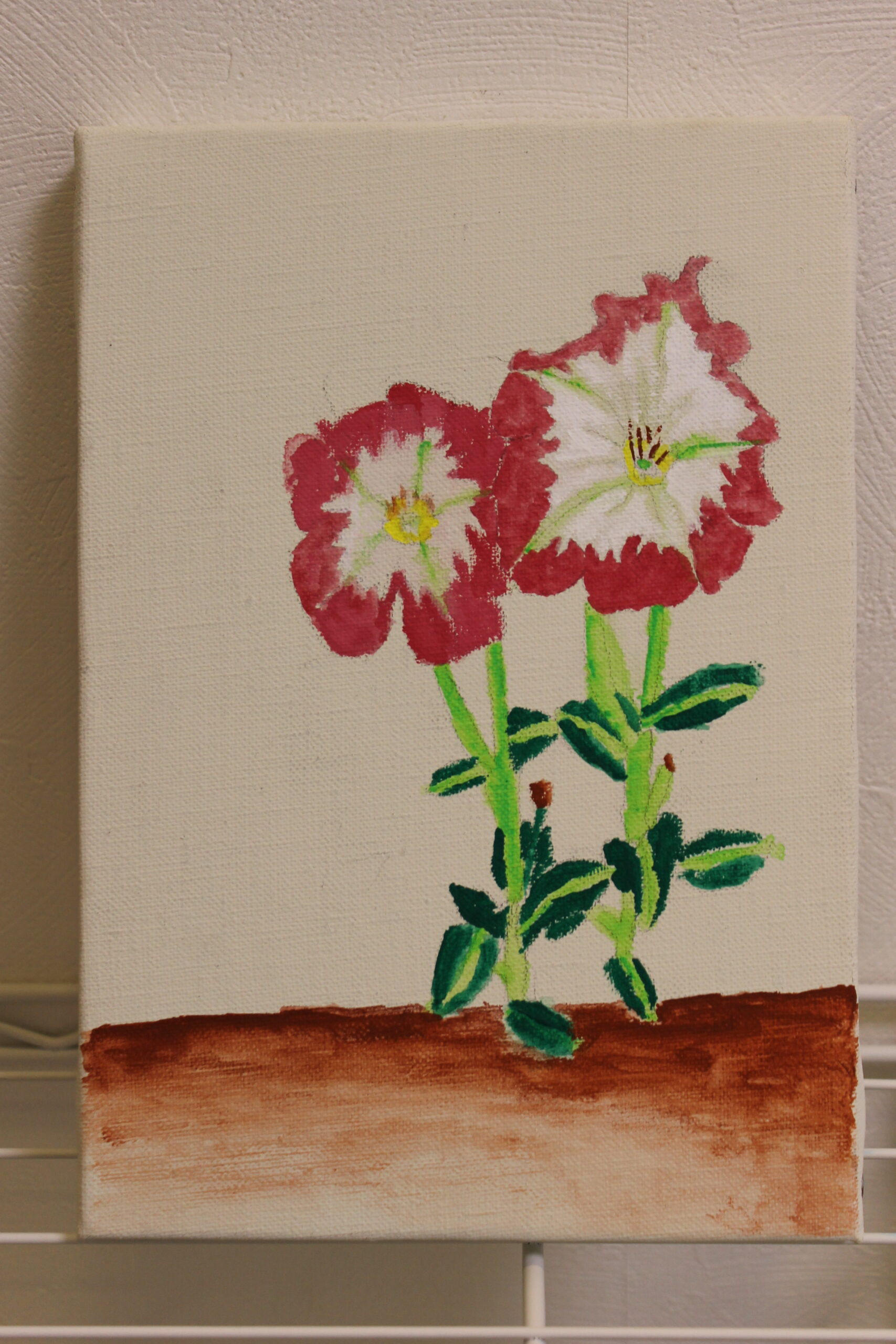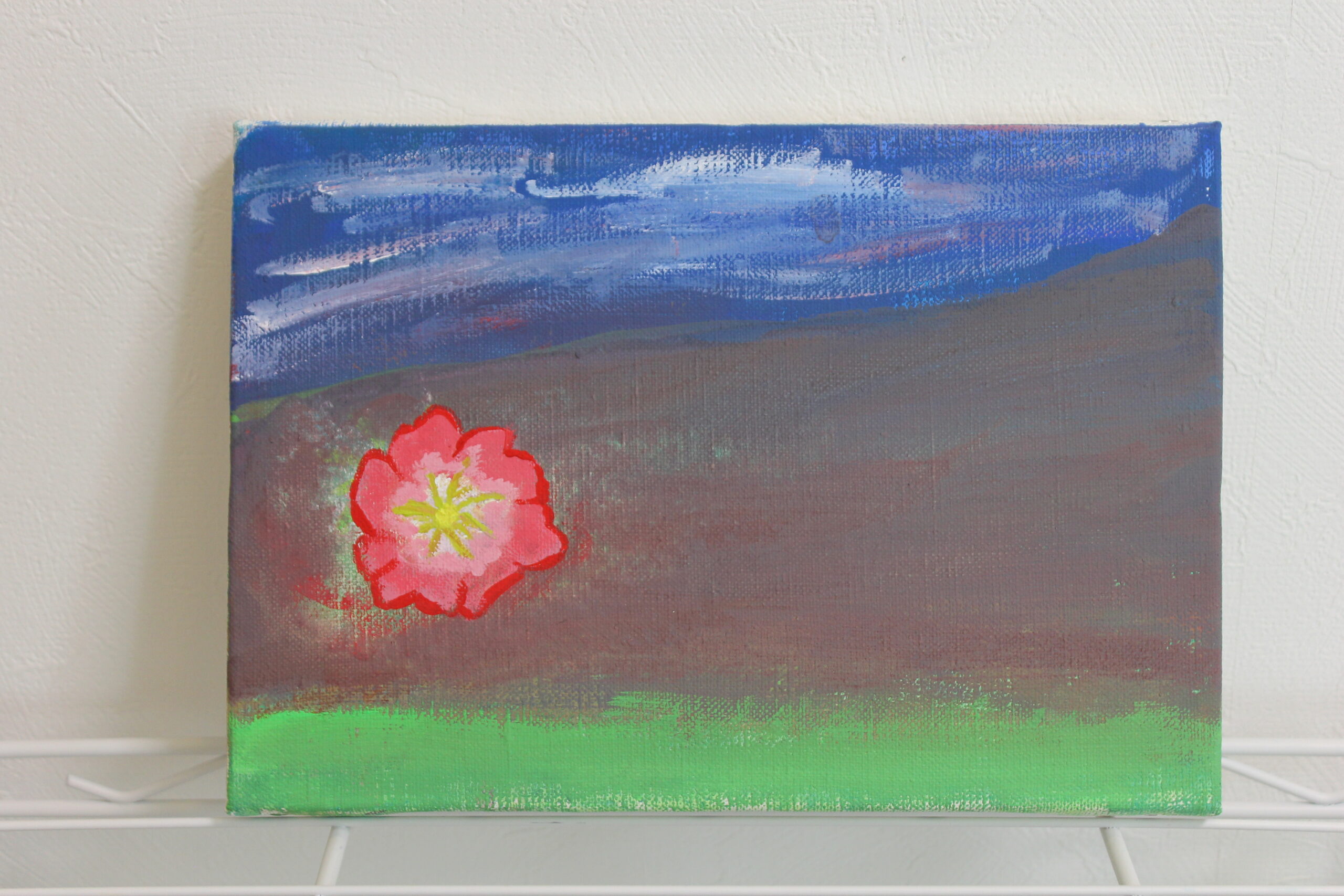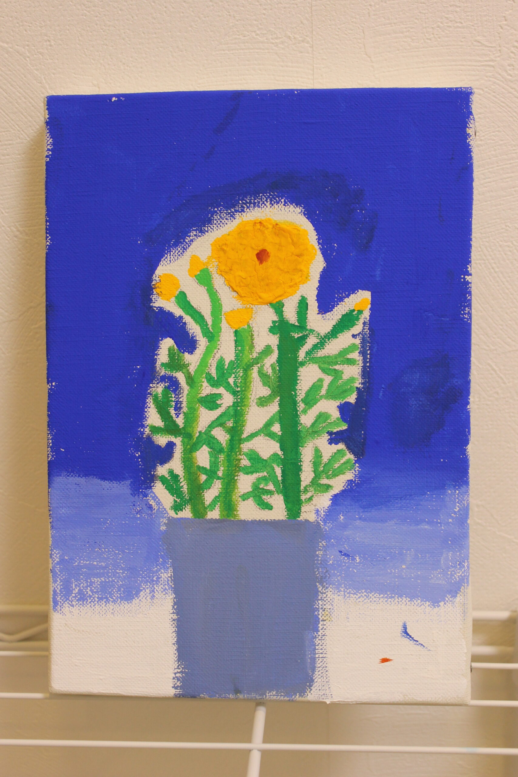 今月のこどもクラスでは、キャンバスにアクリル絵の具で春らしい花を描いています。