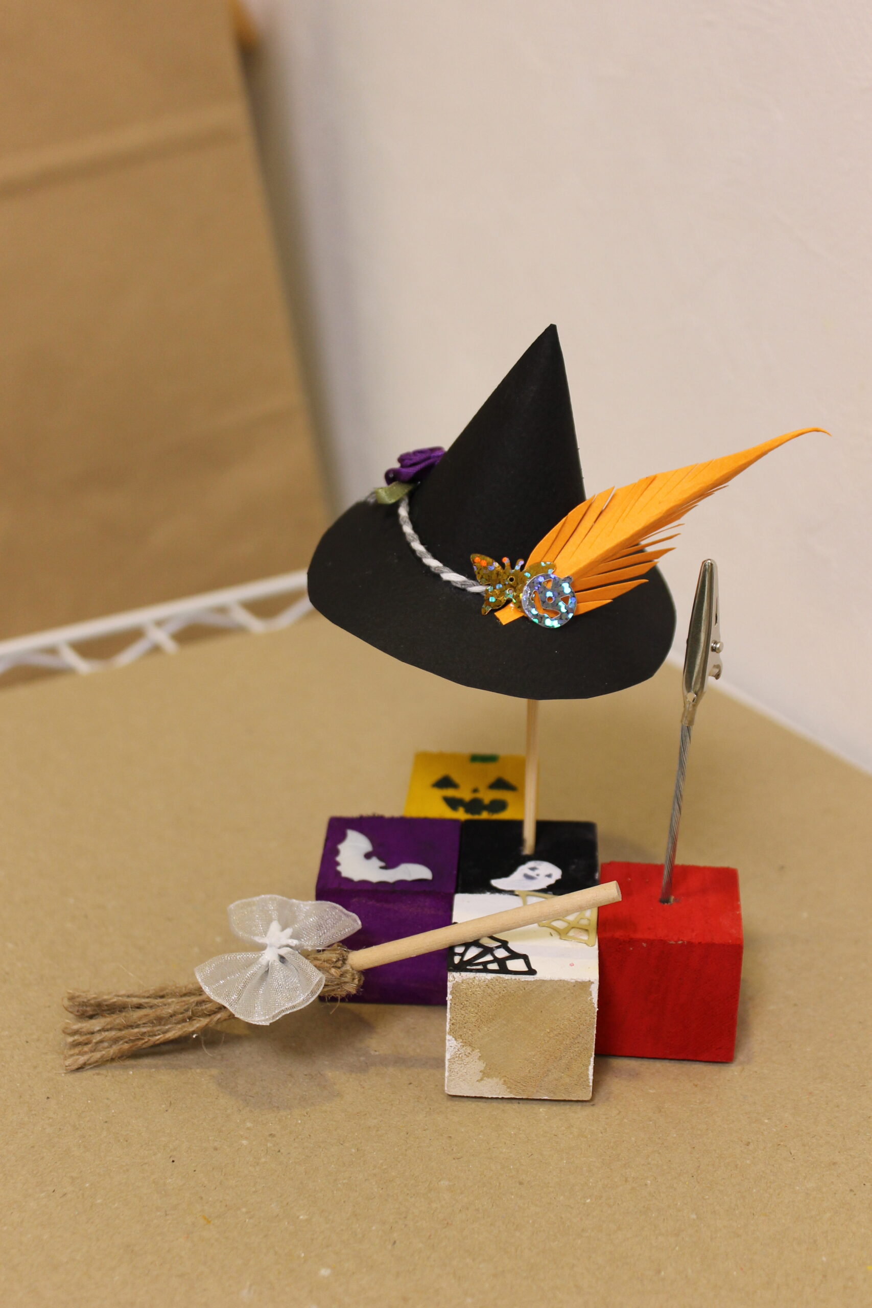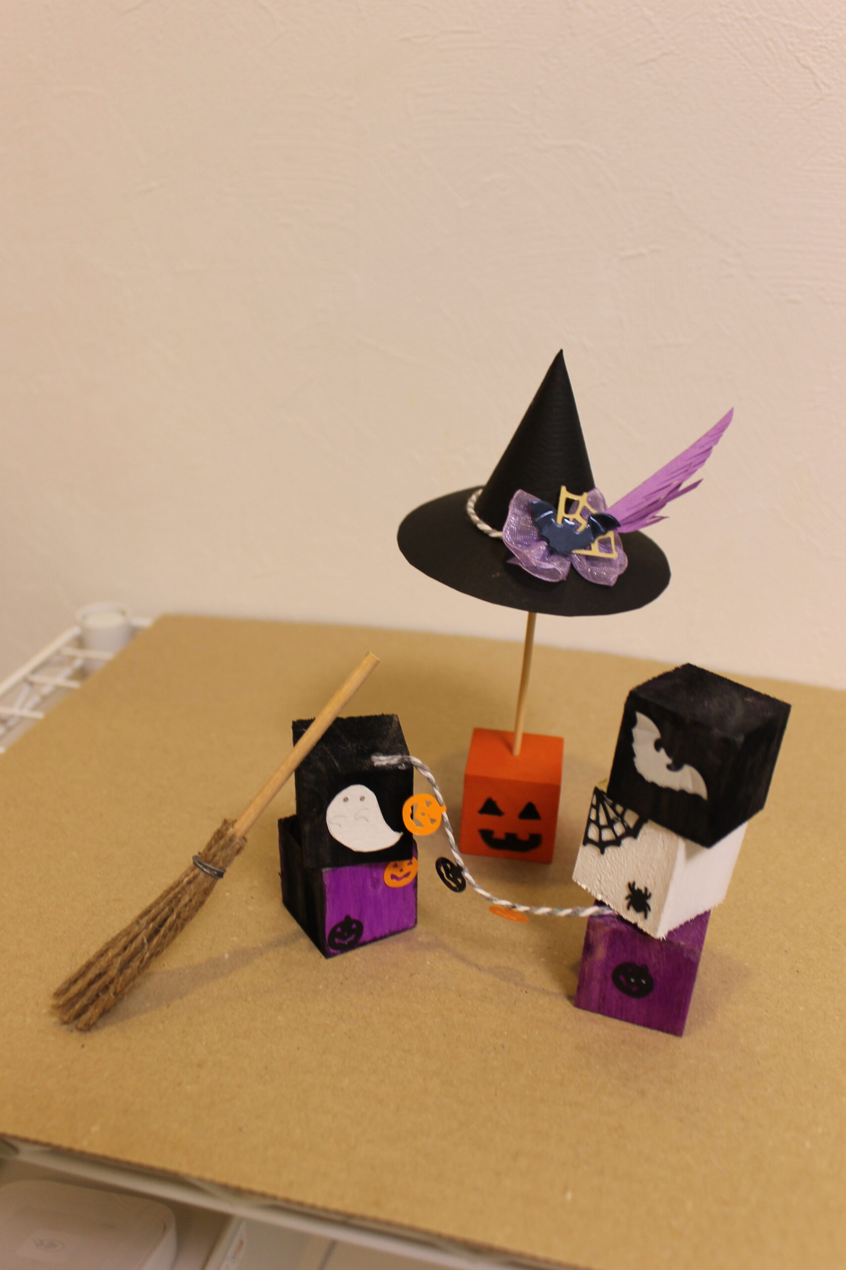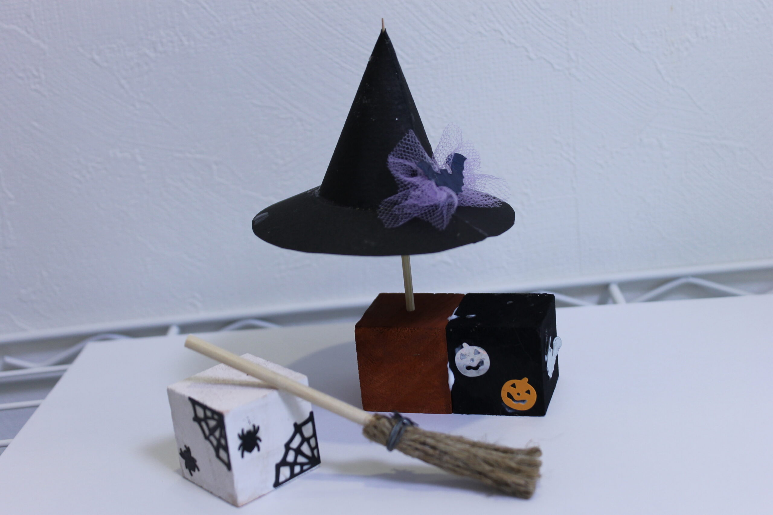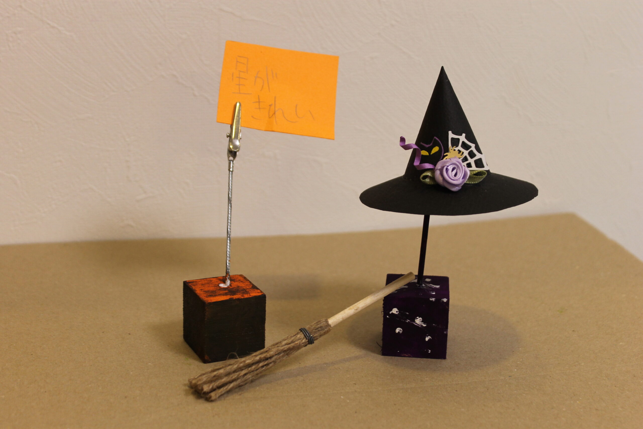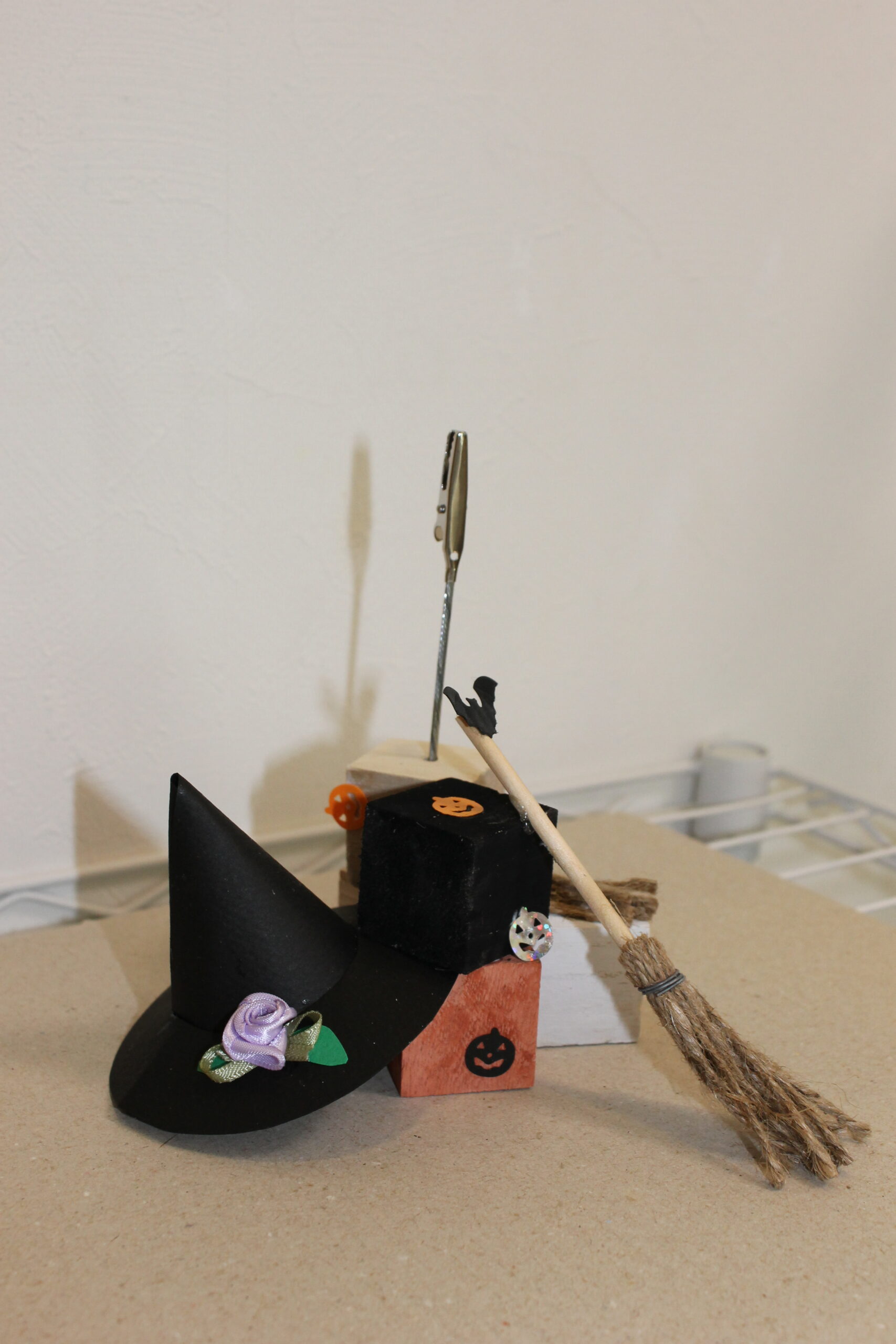 今回の工作では、ハロウィンの帽子と箒の作り方をお伝えし、その帽子と箒をディスプレイデザインしていただくことにしました。