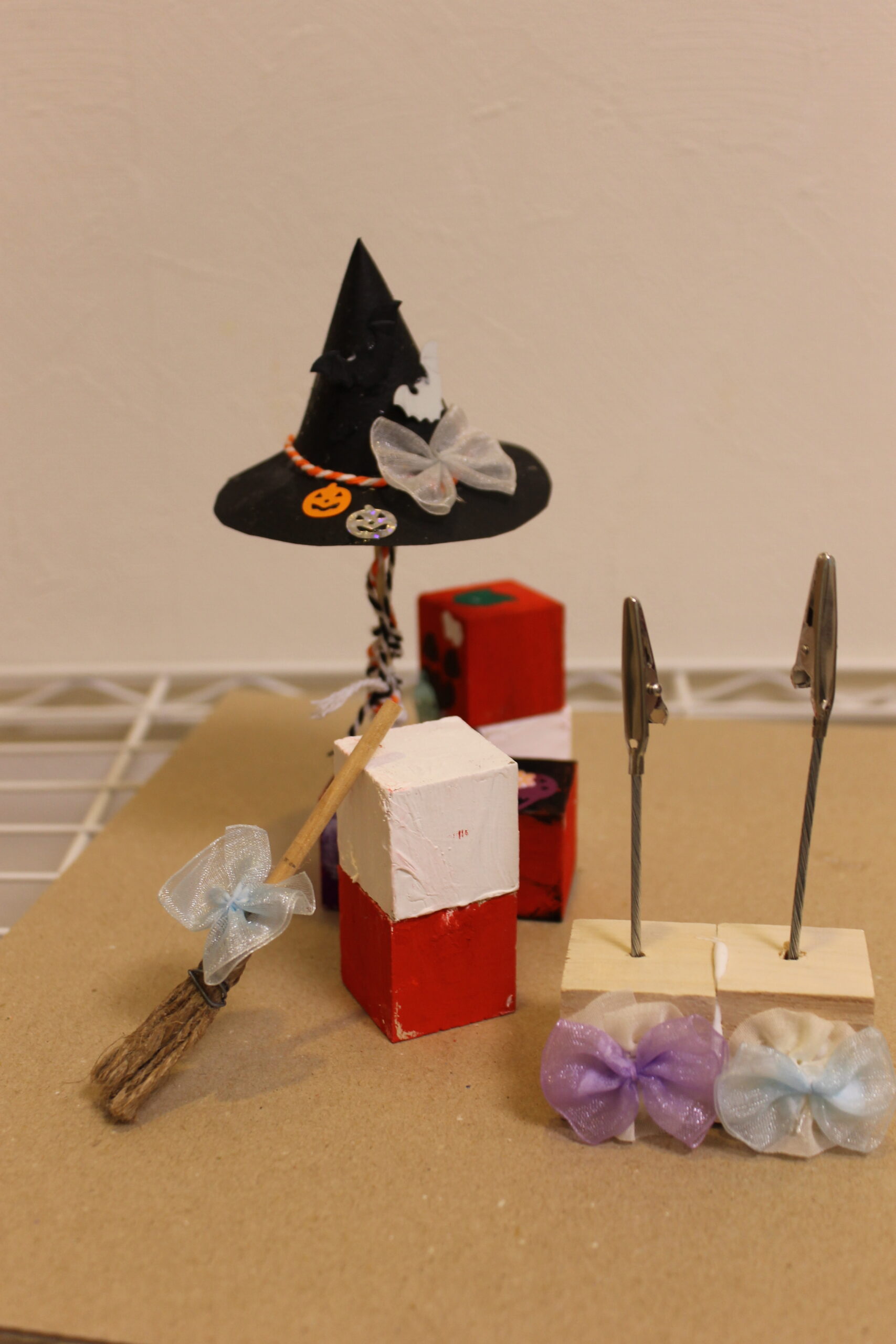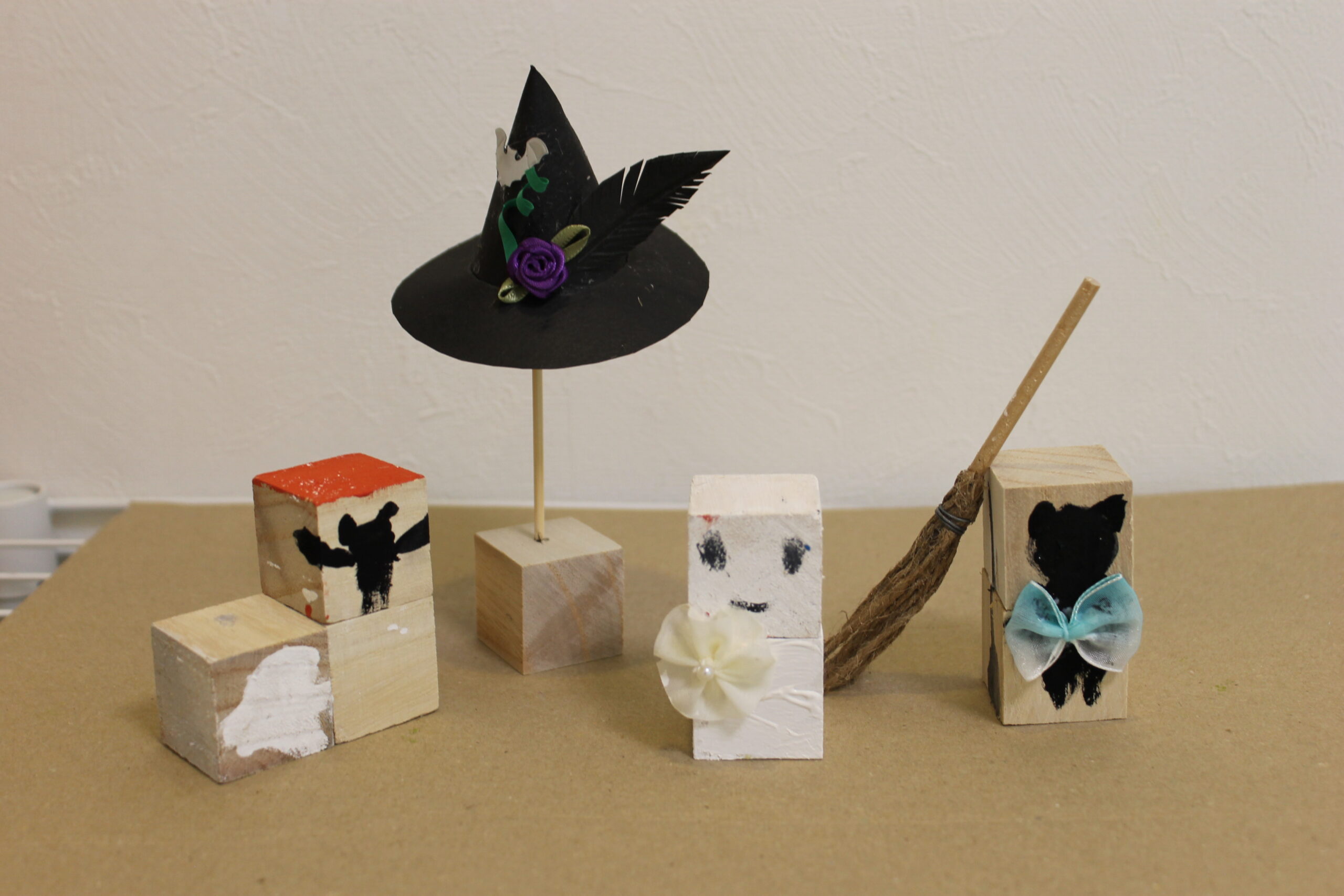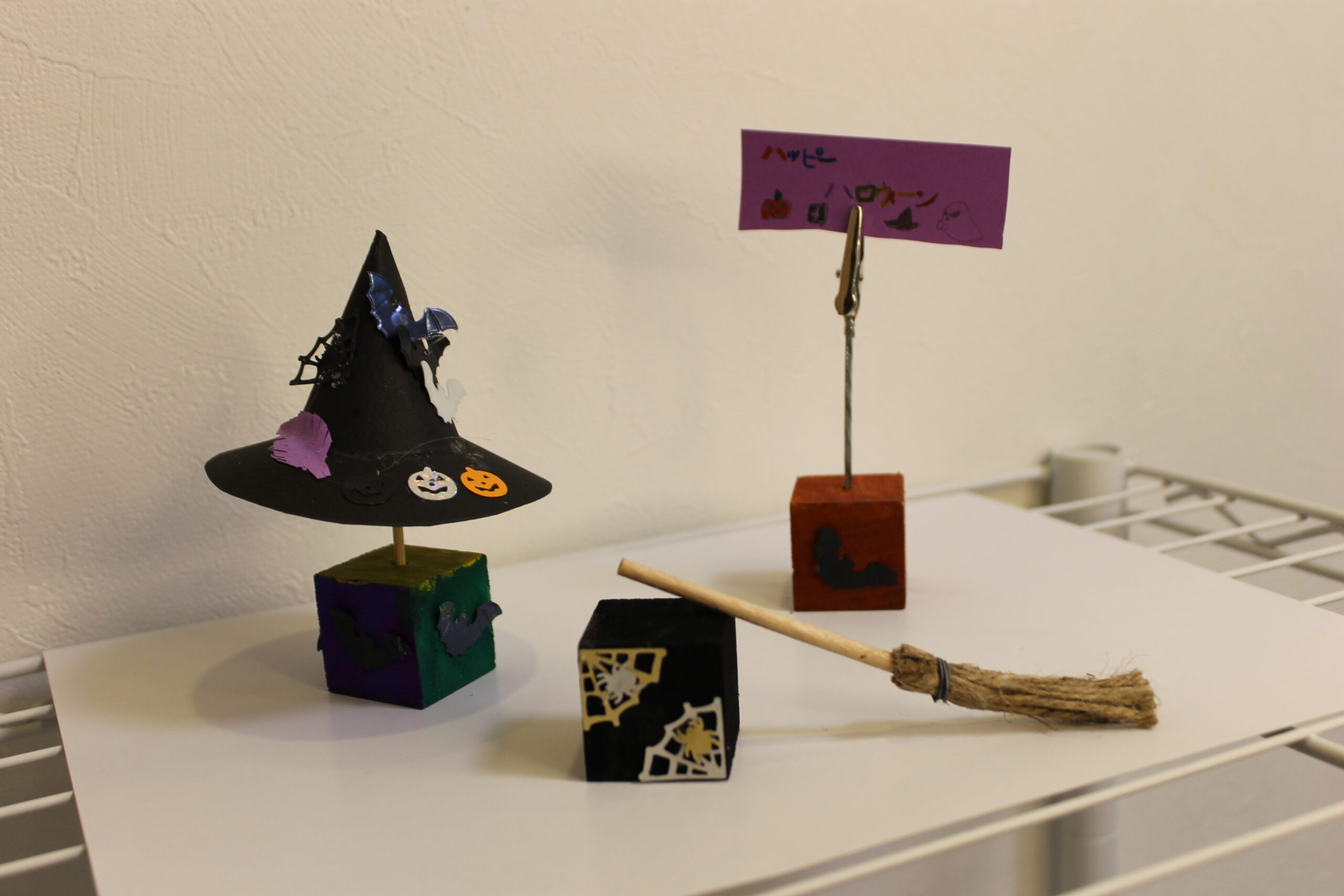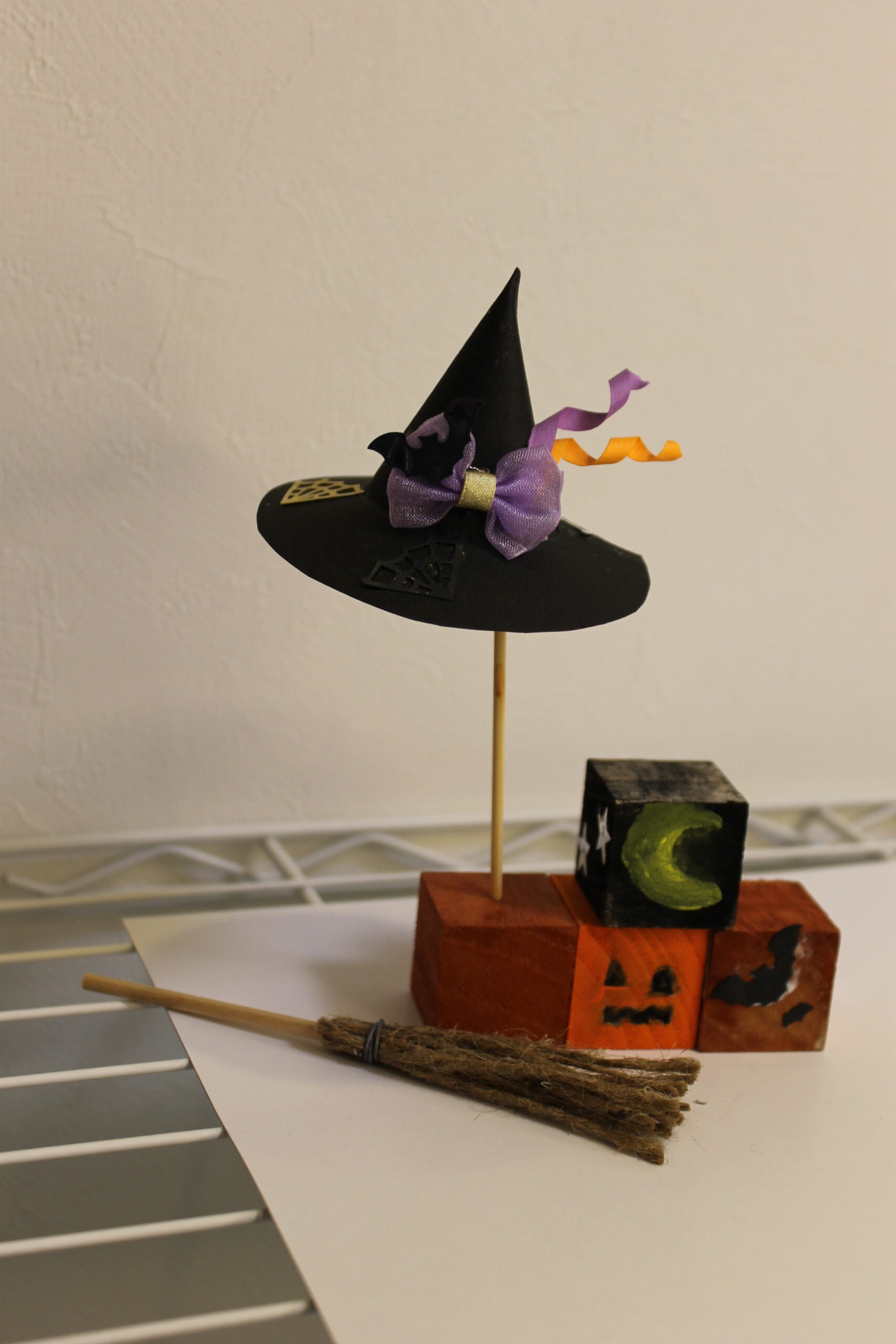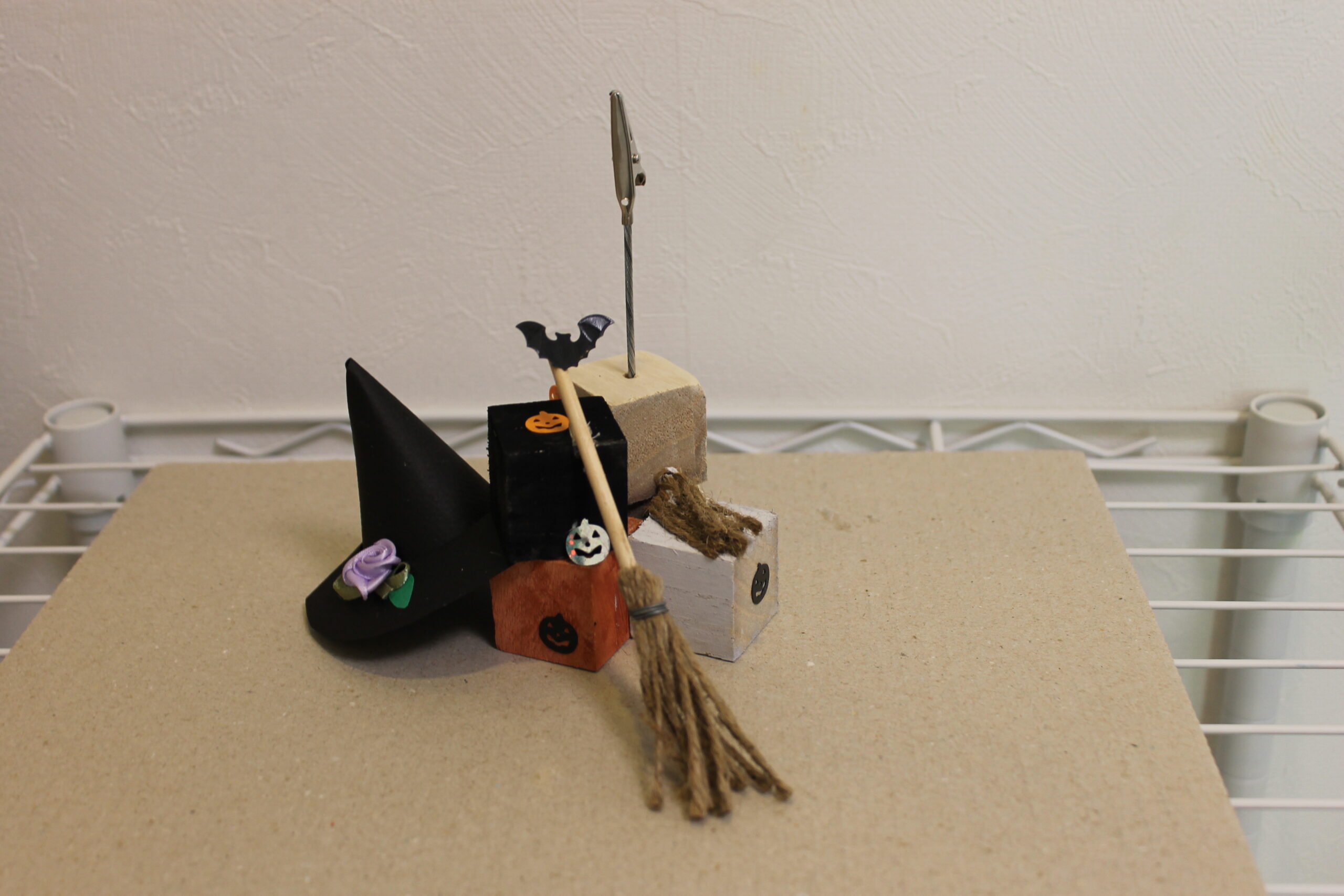 今回の工作では、ハロウィンの帽子と箒の作り方をお伝えし、その帽子と箒をディスプレイデザインしていただくことにしました。