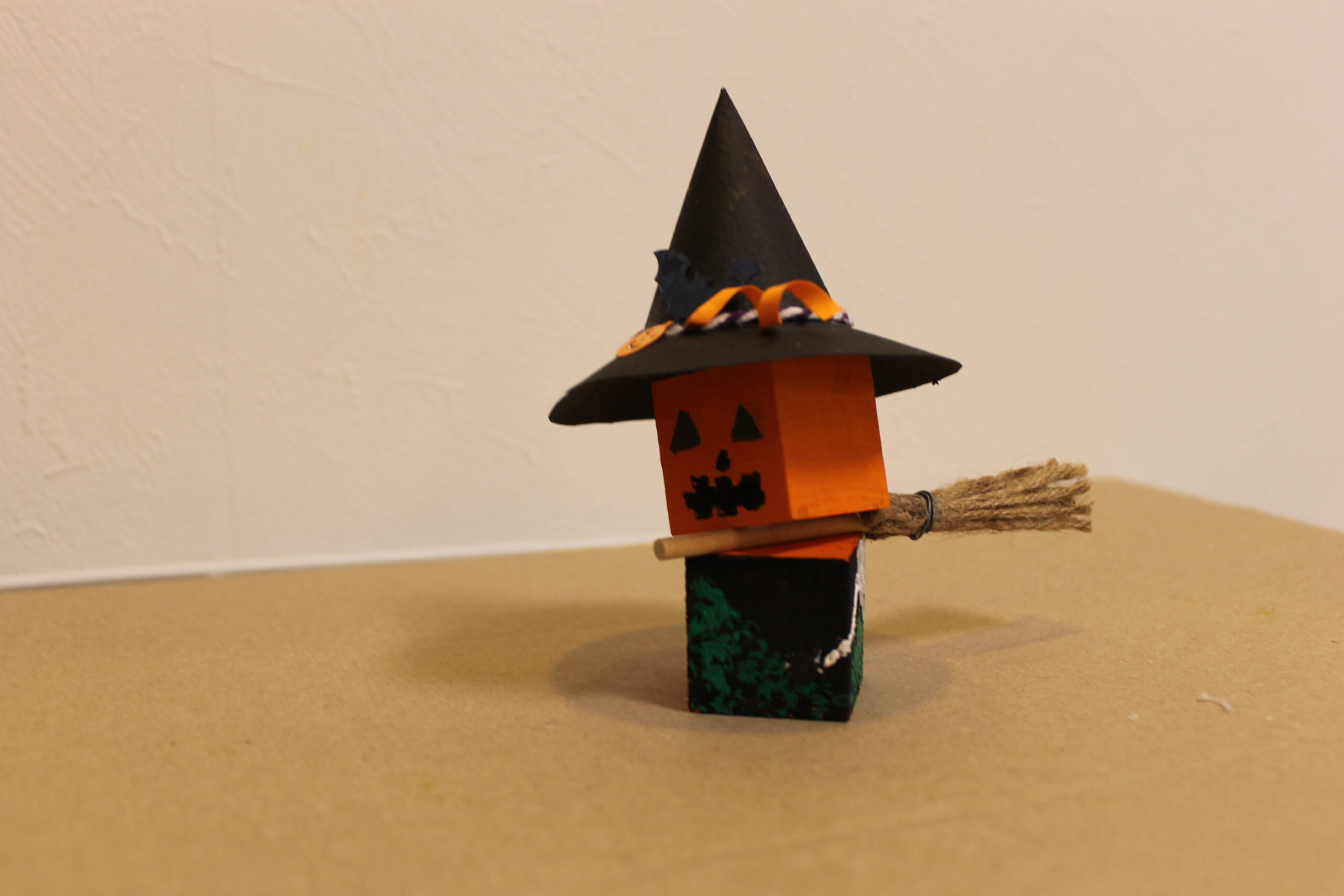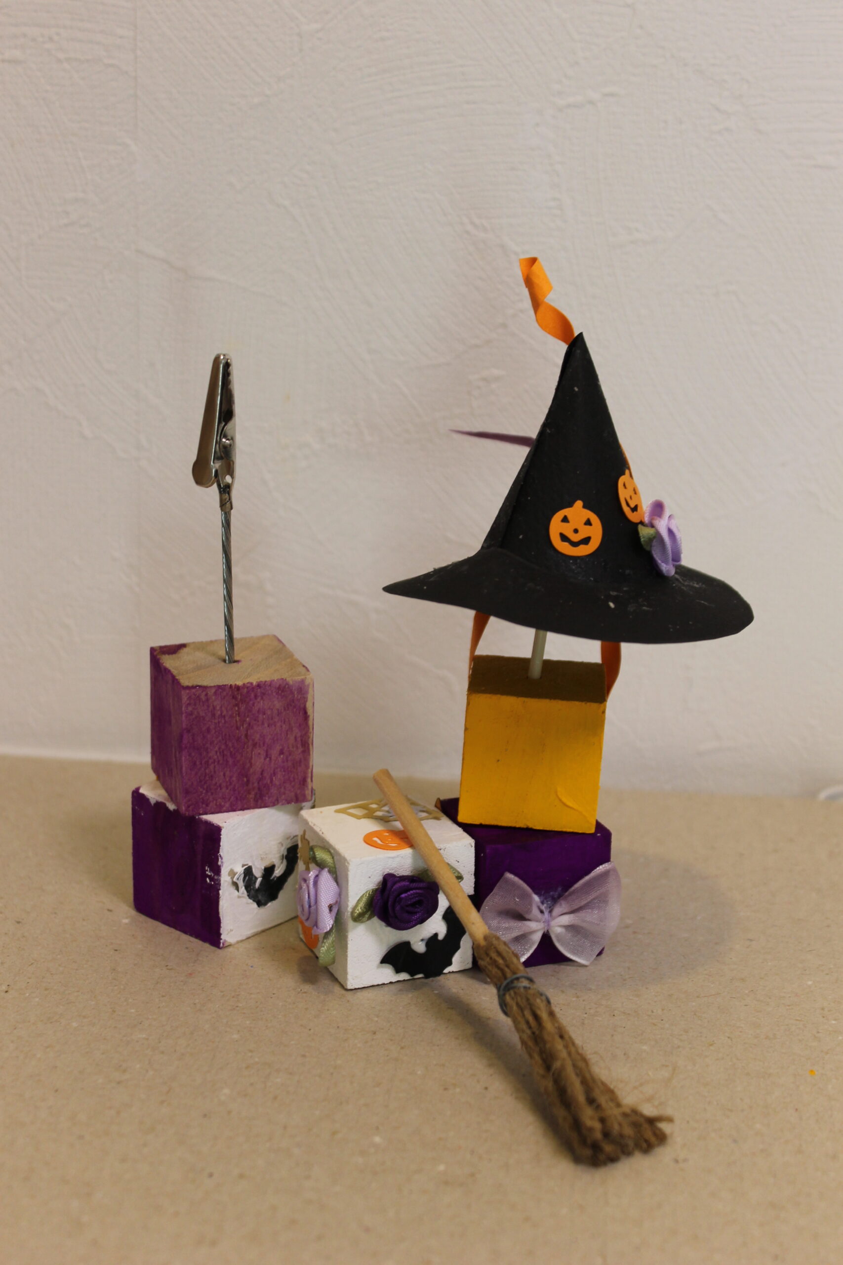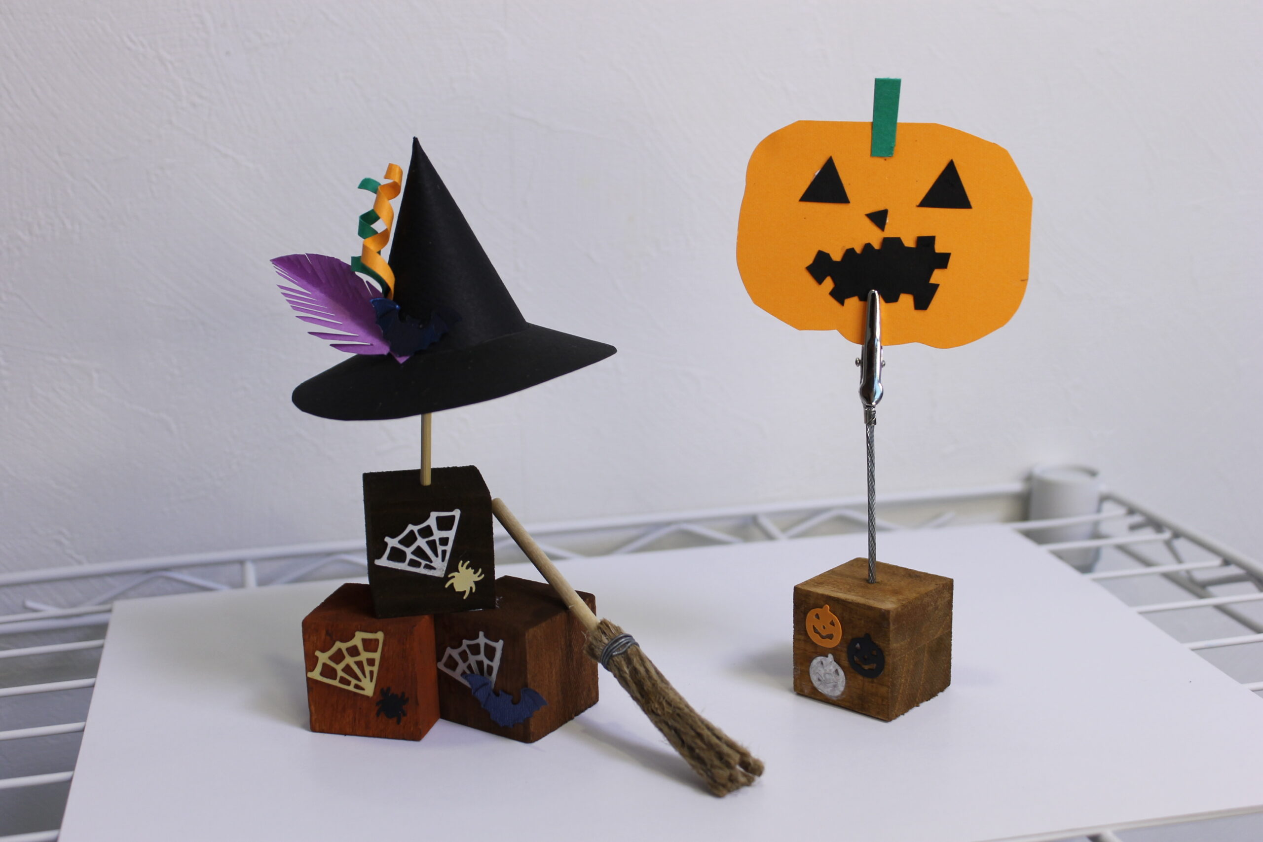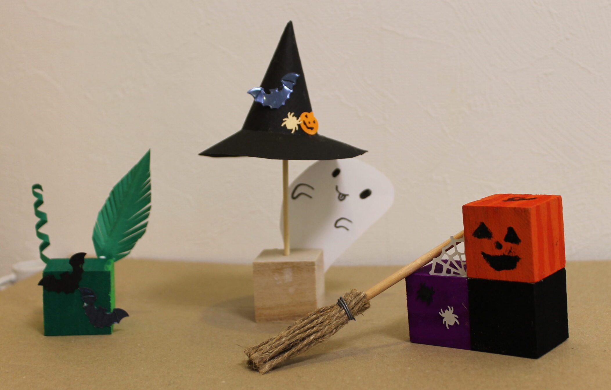 今回の工作では、ハロウィンの帽子と箒の作り方をお伝えし、その帽子と箒をディスプレイデザインしていただくことにしました。