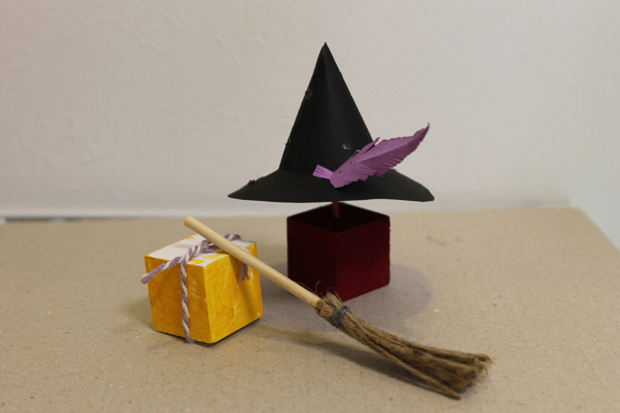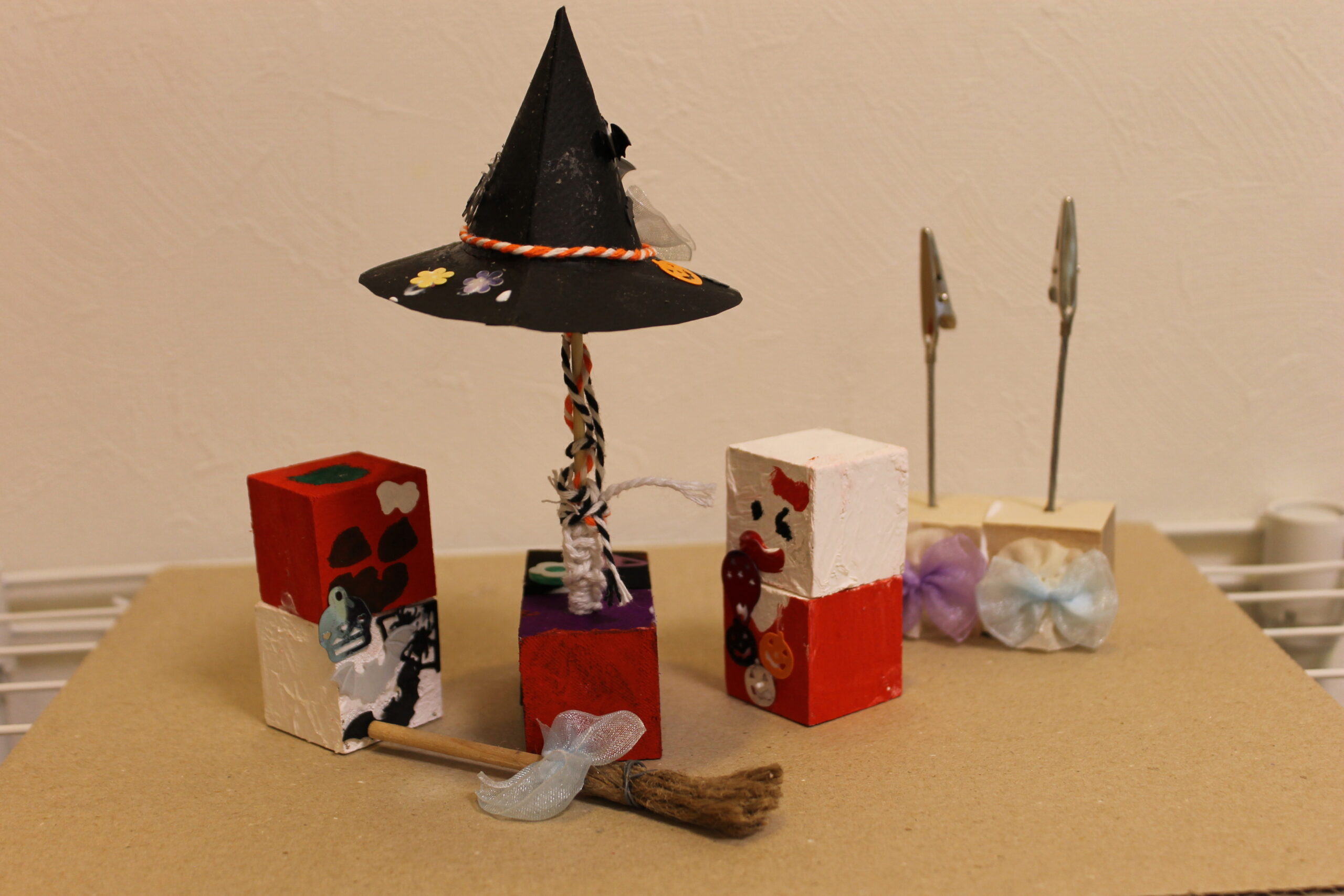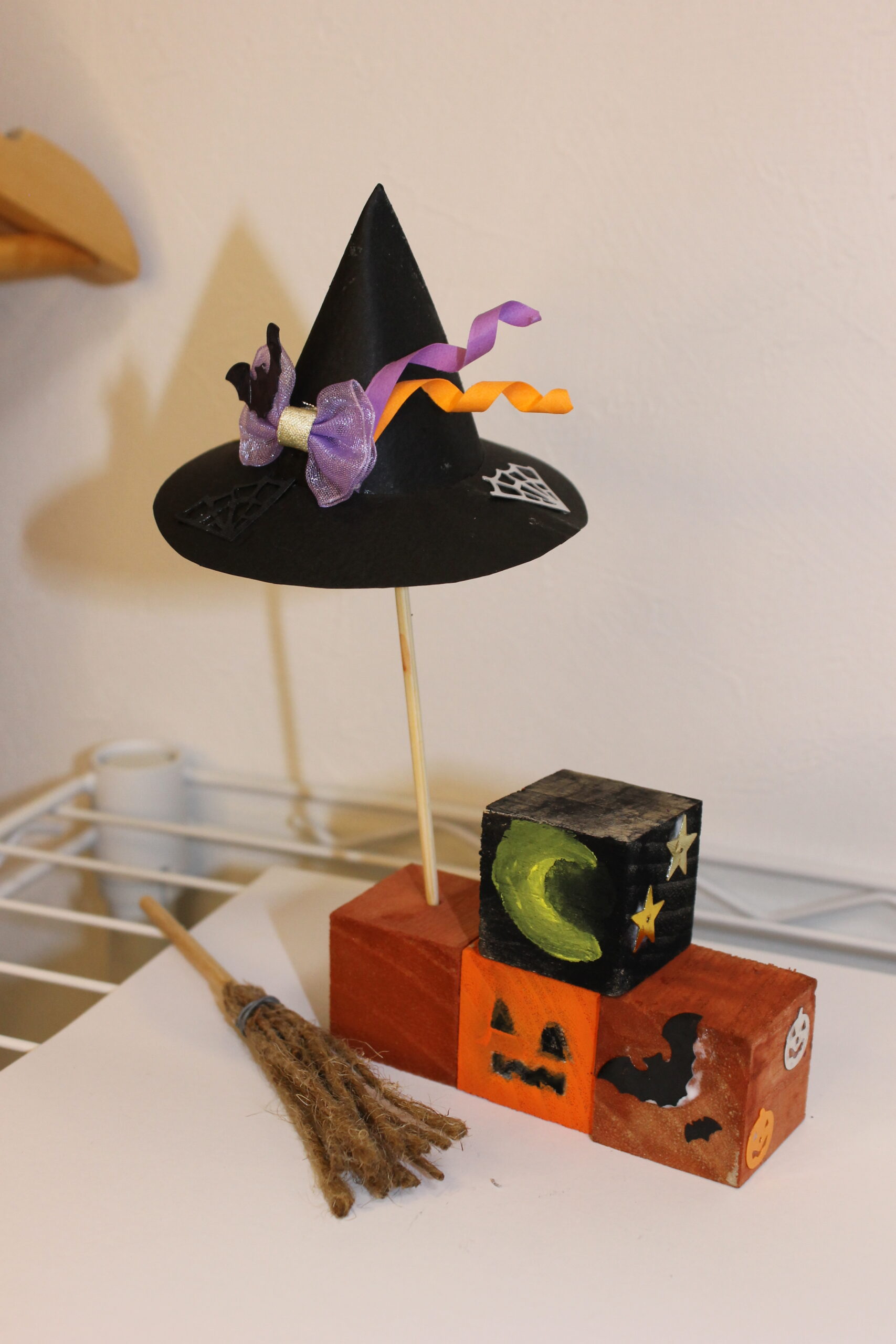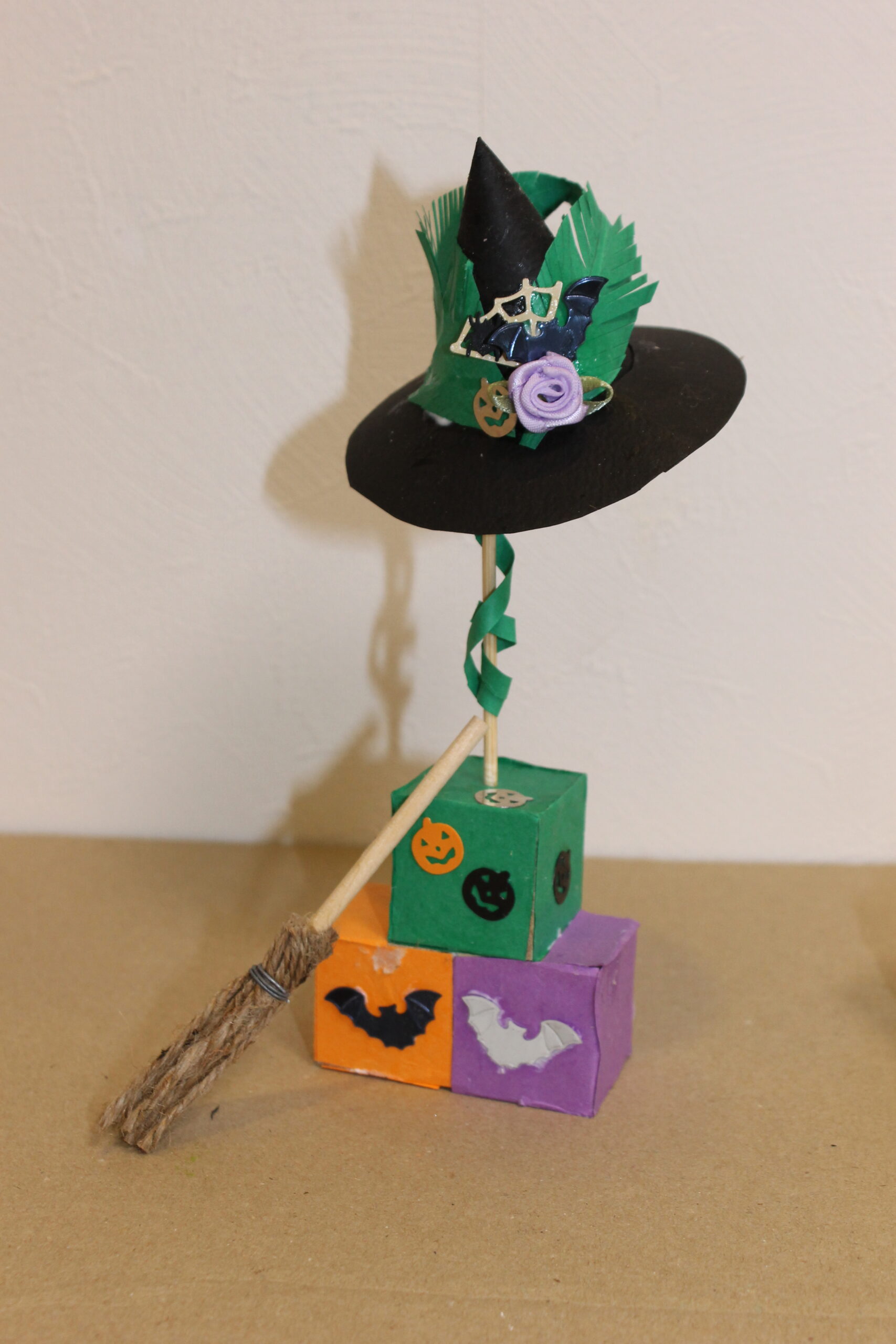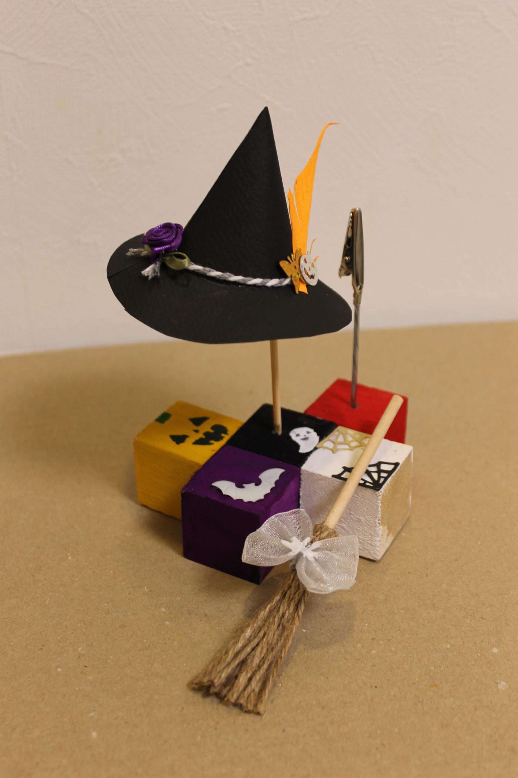 今回の工作では、ハロウィンの帽子と箒の作り方をお伝えし、その帽子と箒をディスプレイデザインしていただくことにしました。