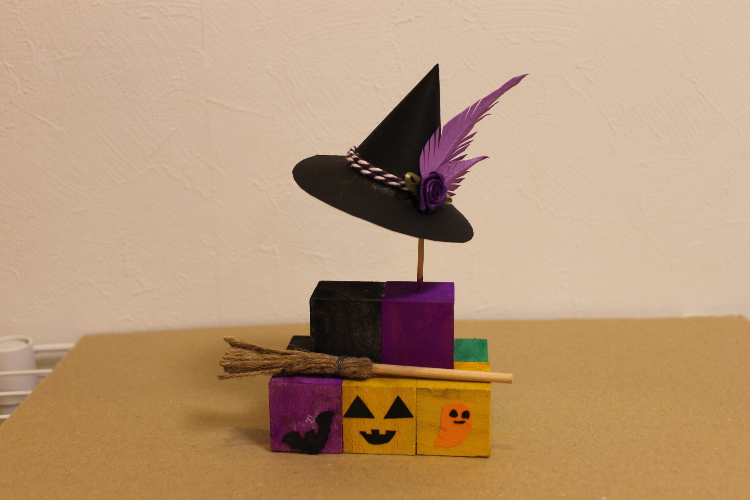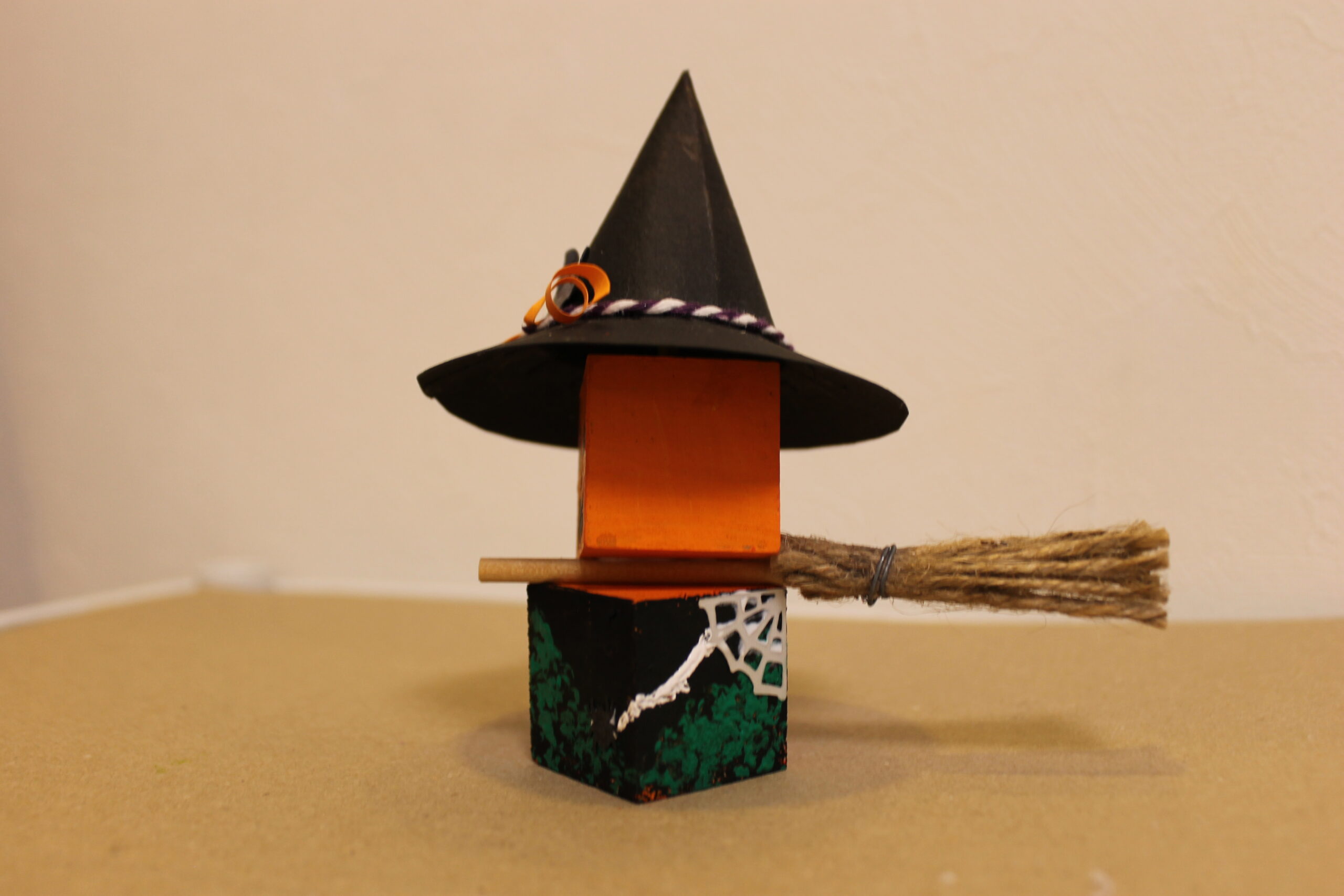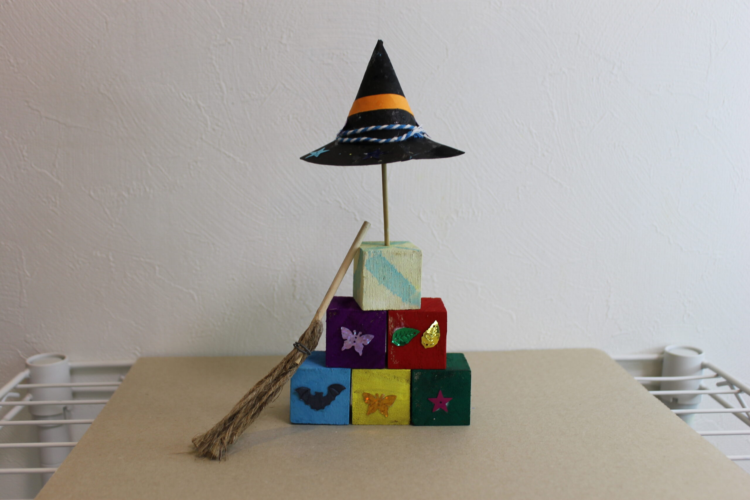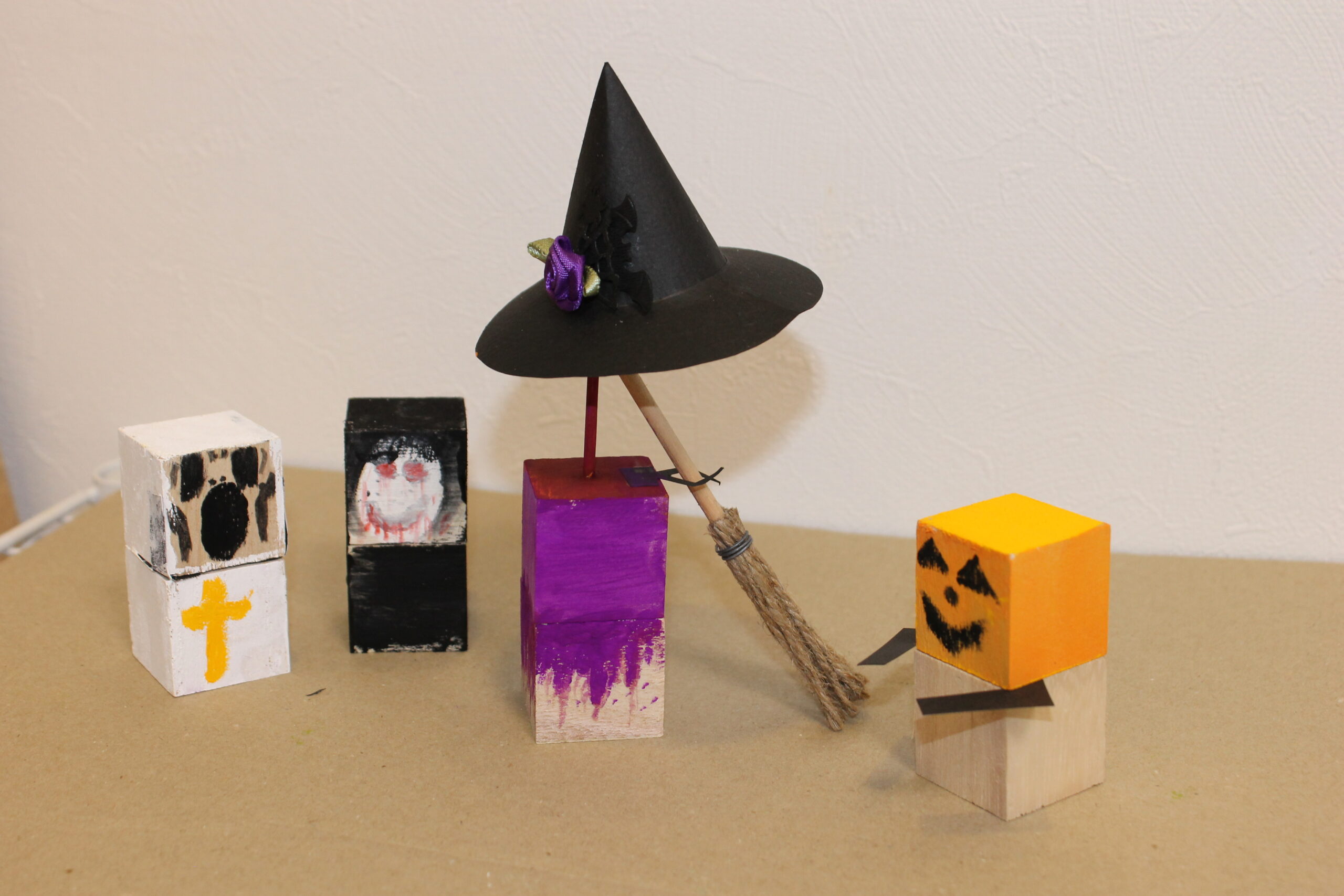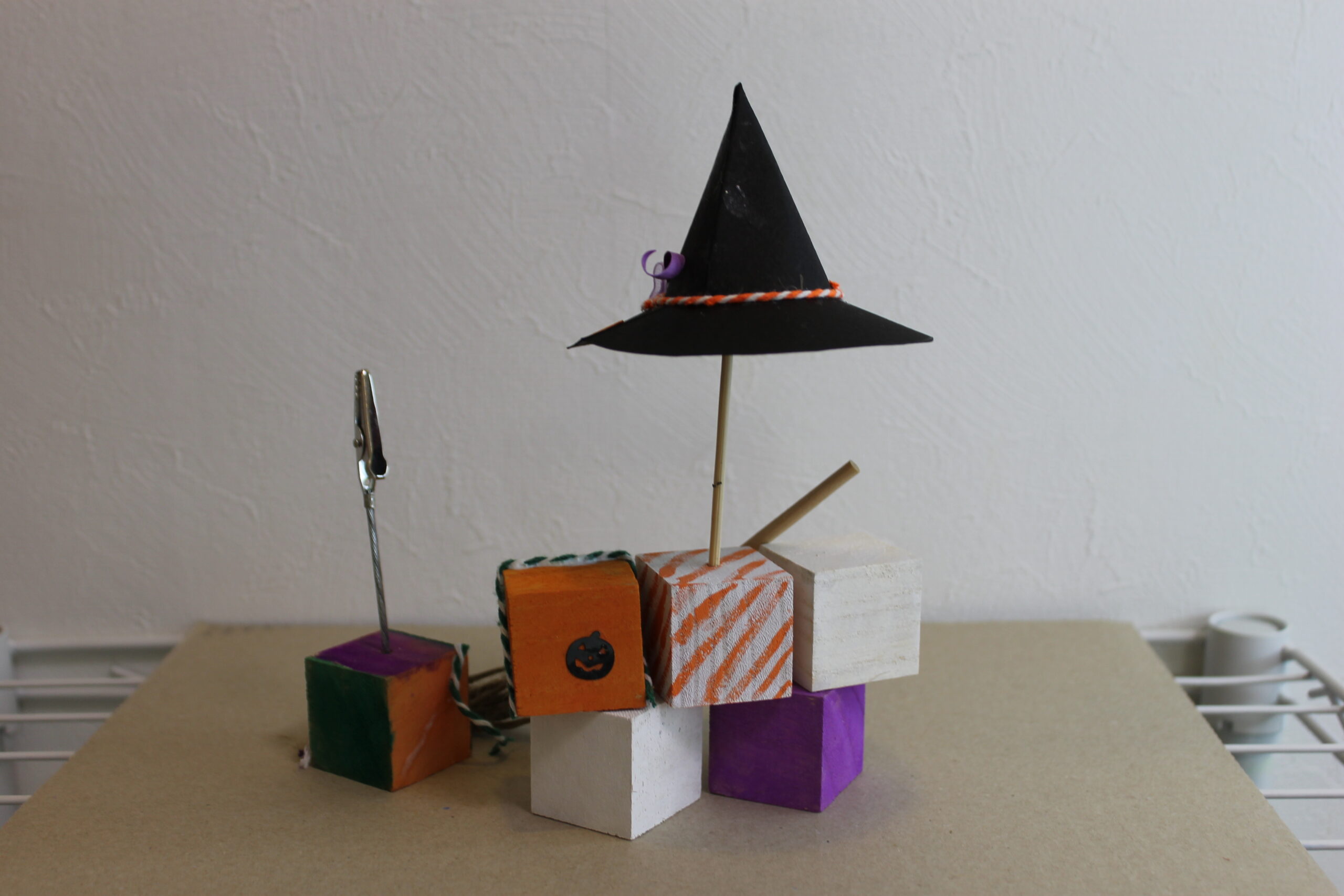 今回の工作では、ハロウィンの帽子と箒の作り方をお伝えし、その帽子と箒をディスプレイデザインしていただくことにしました。
