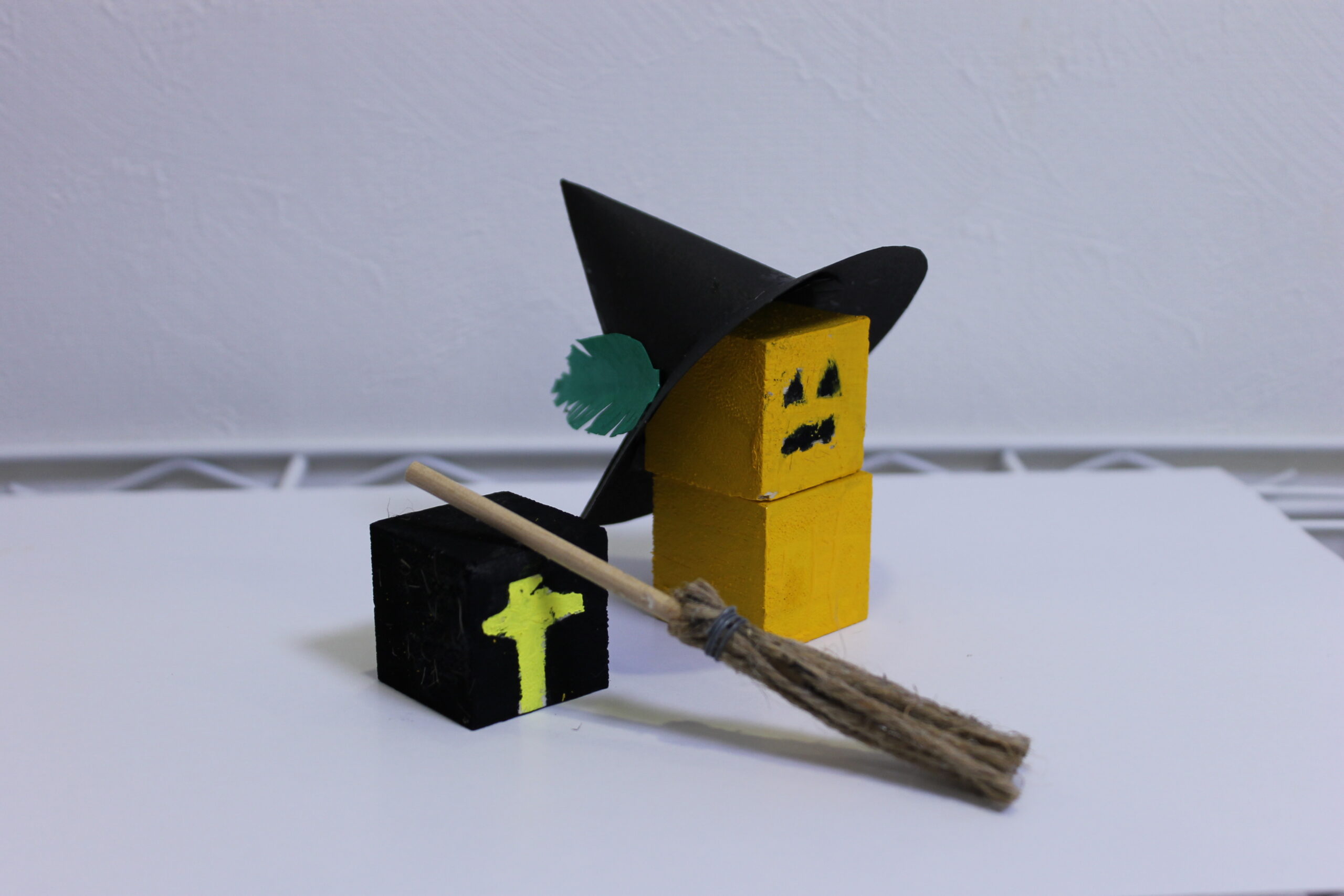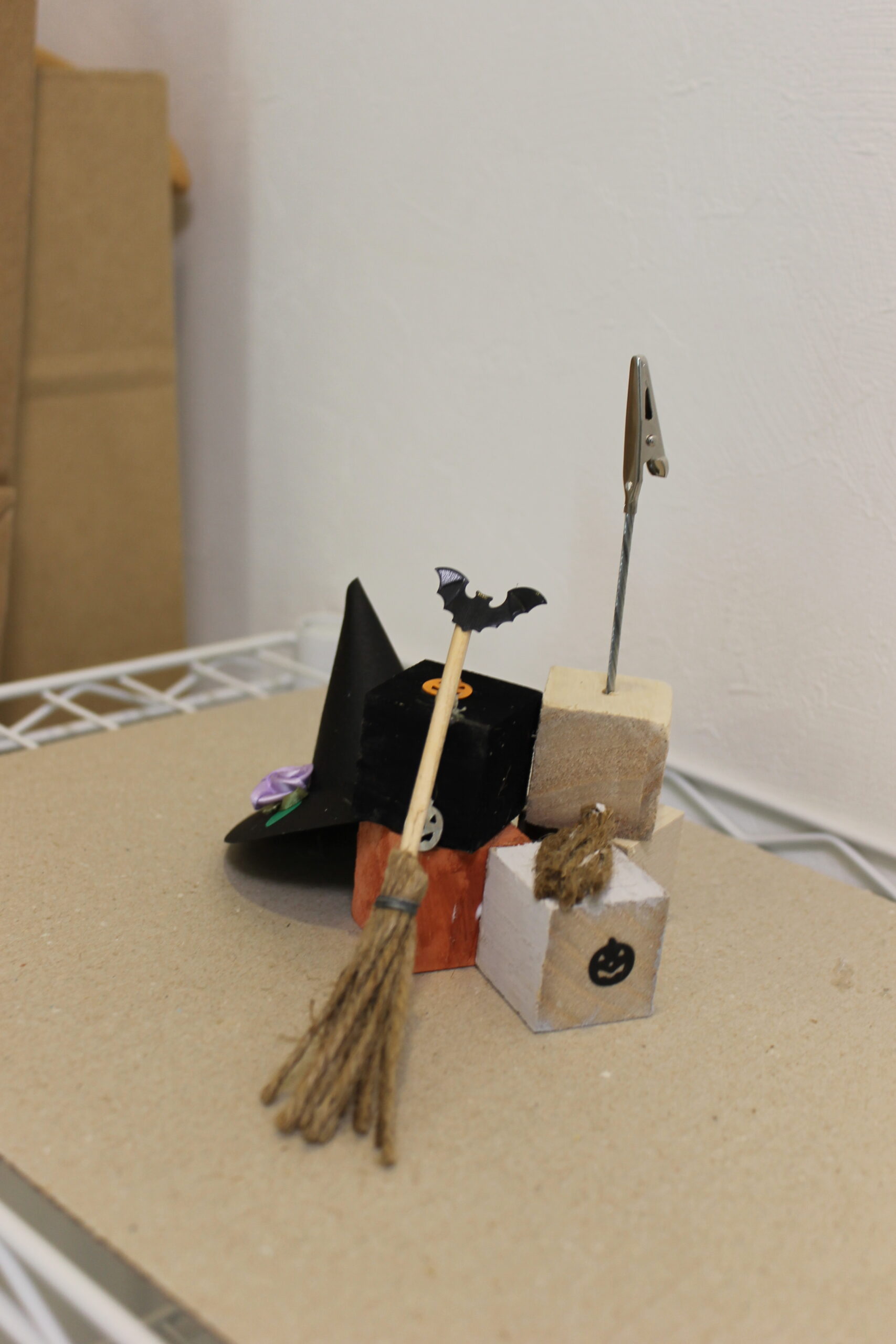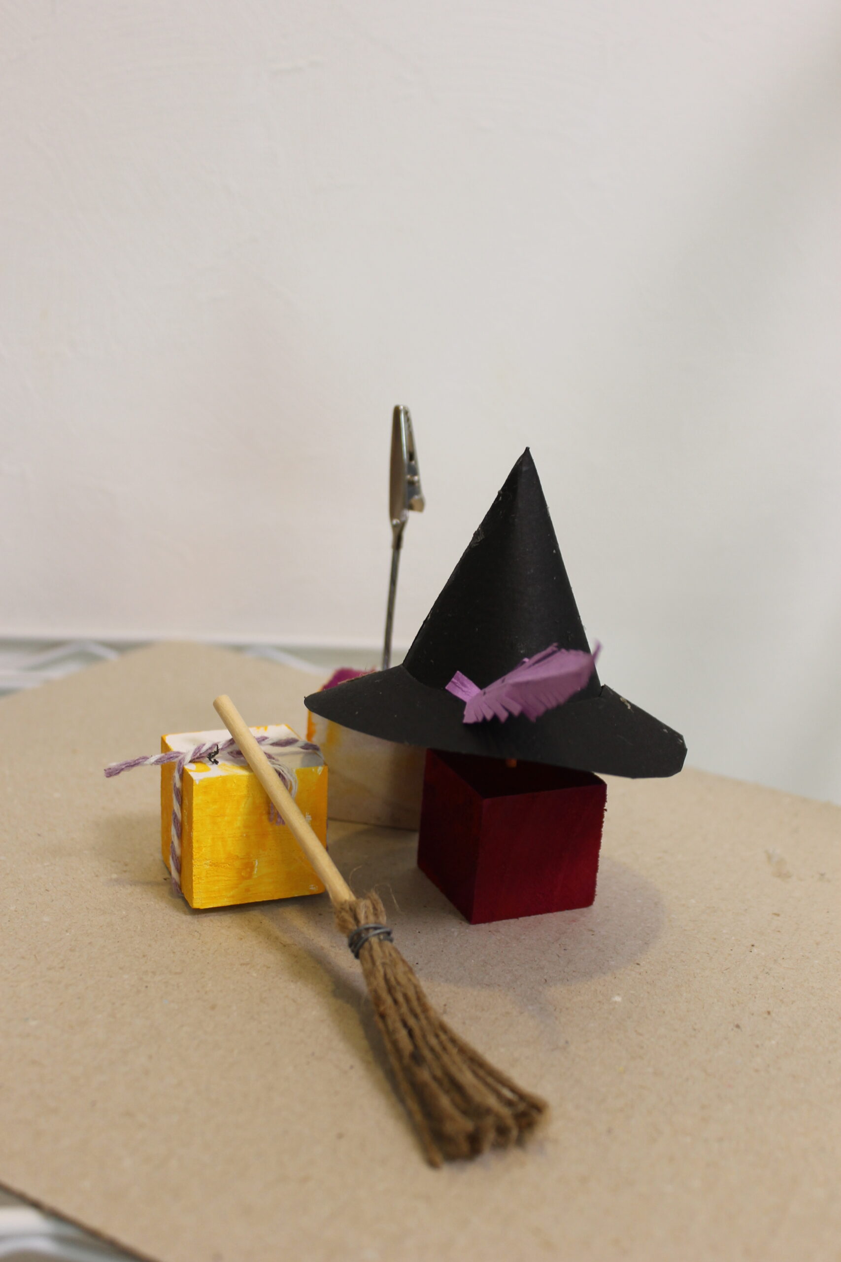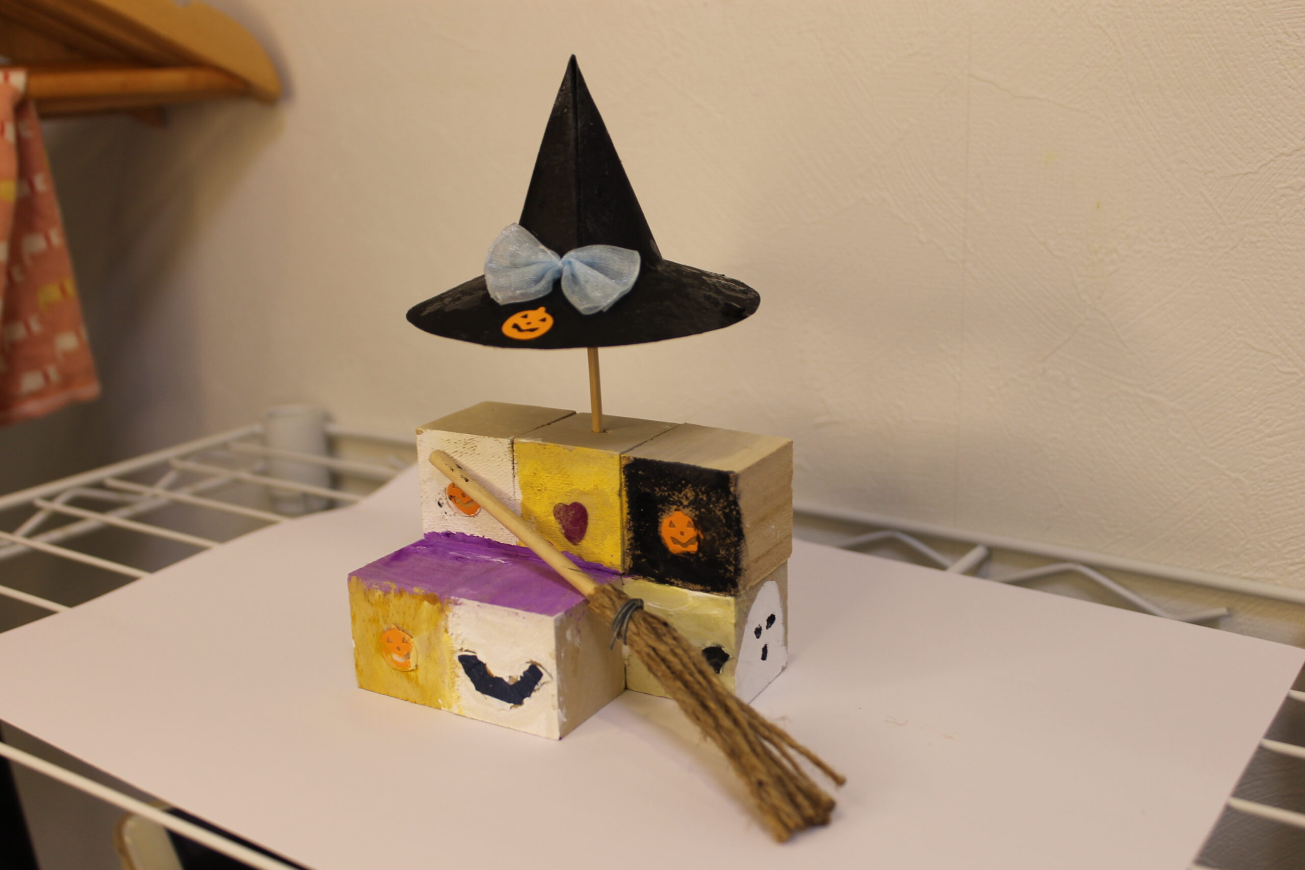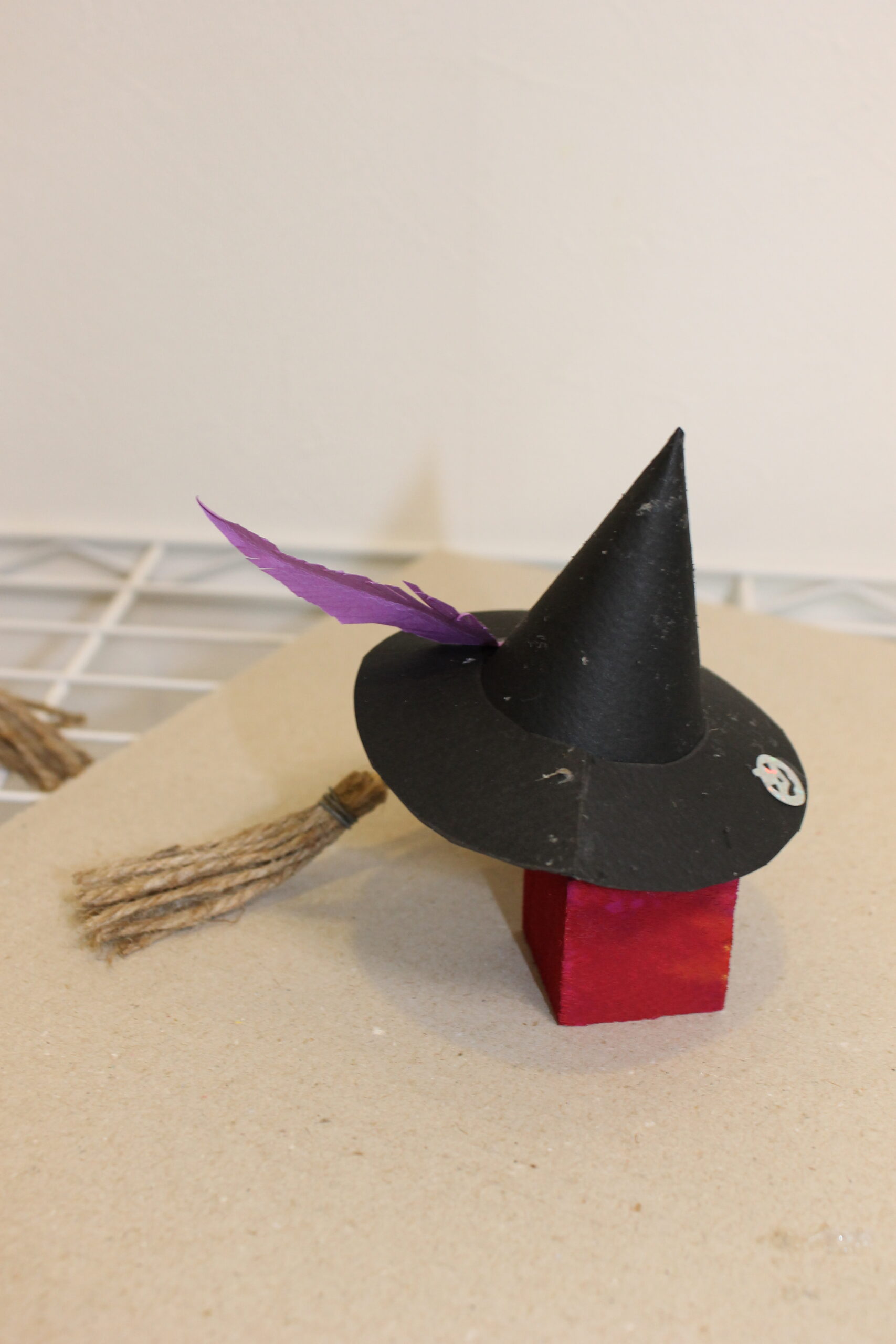 今回の工作では、ハロウィンの帽子と箒の作り方をお伝えし、その帽子と箒をディスプレイデザインしていただくことにしました。