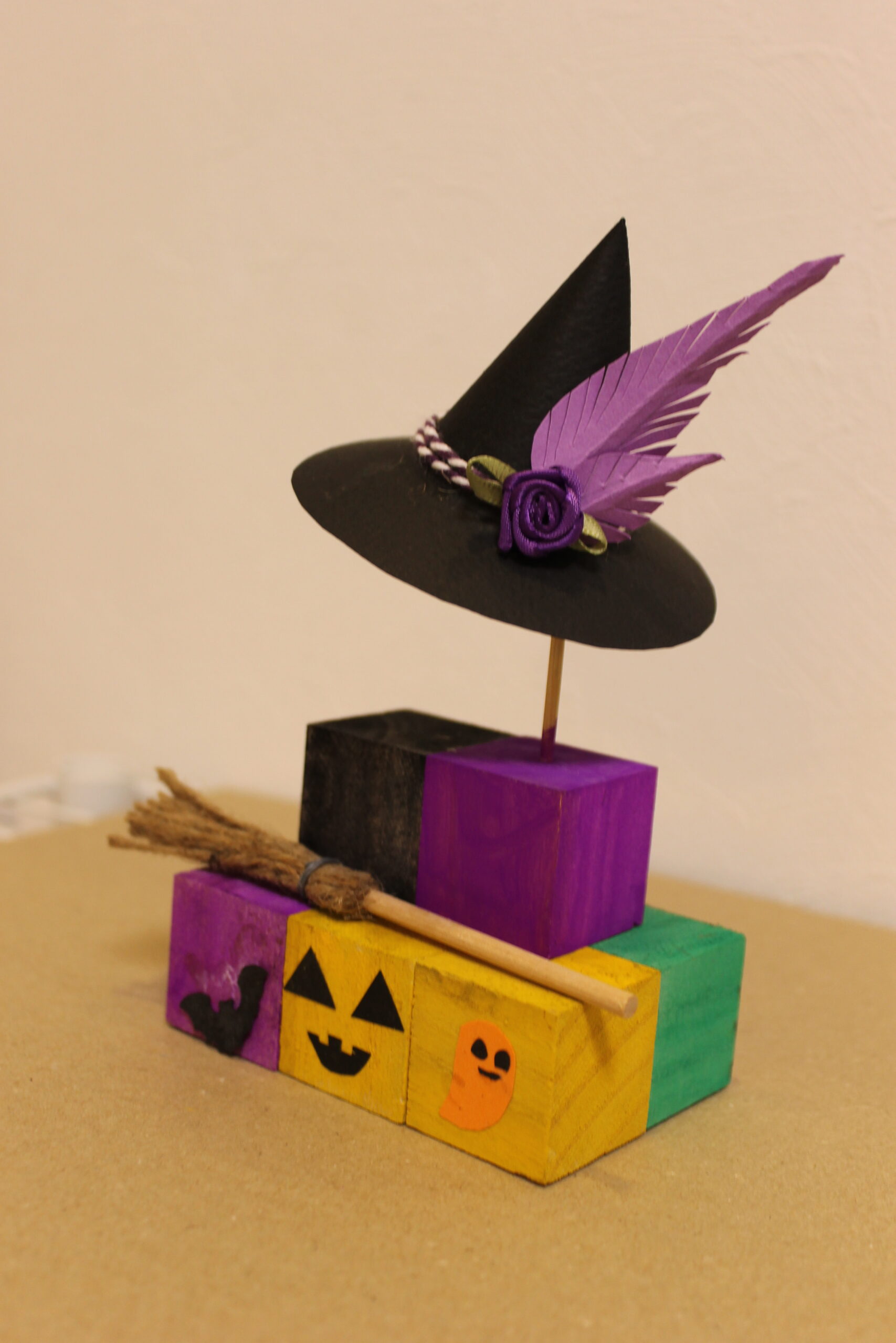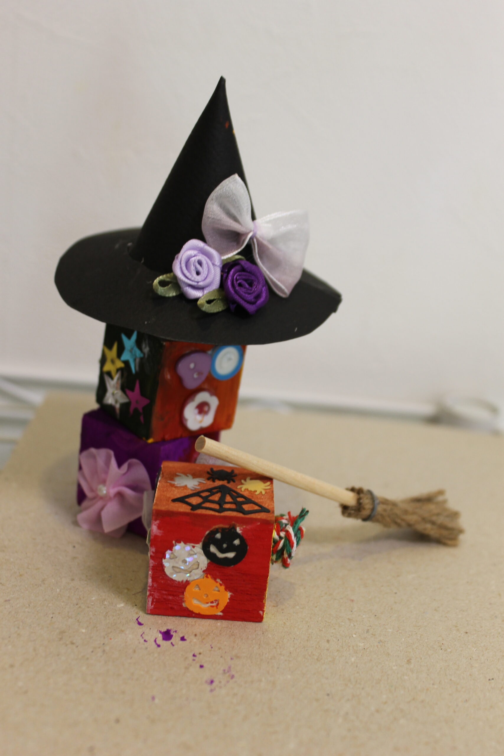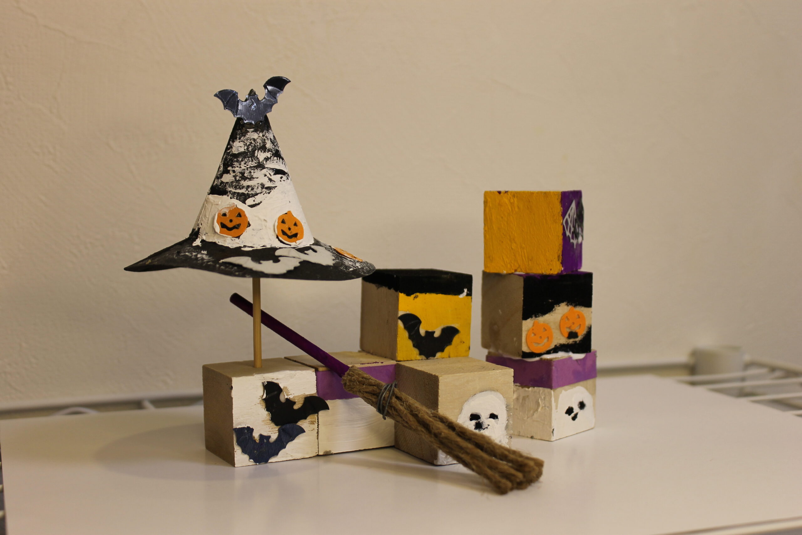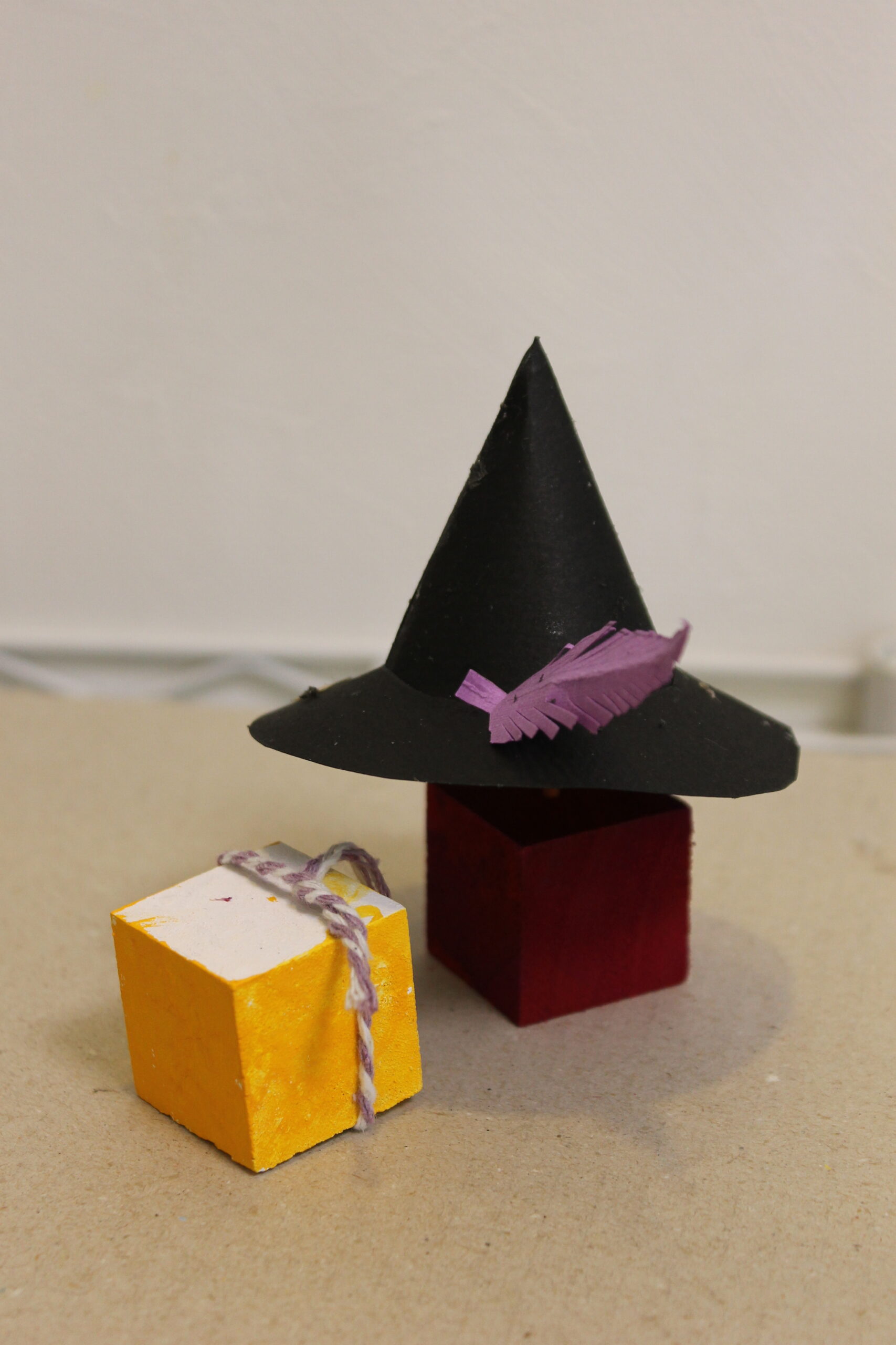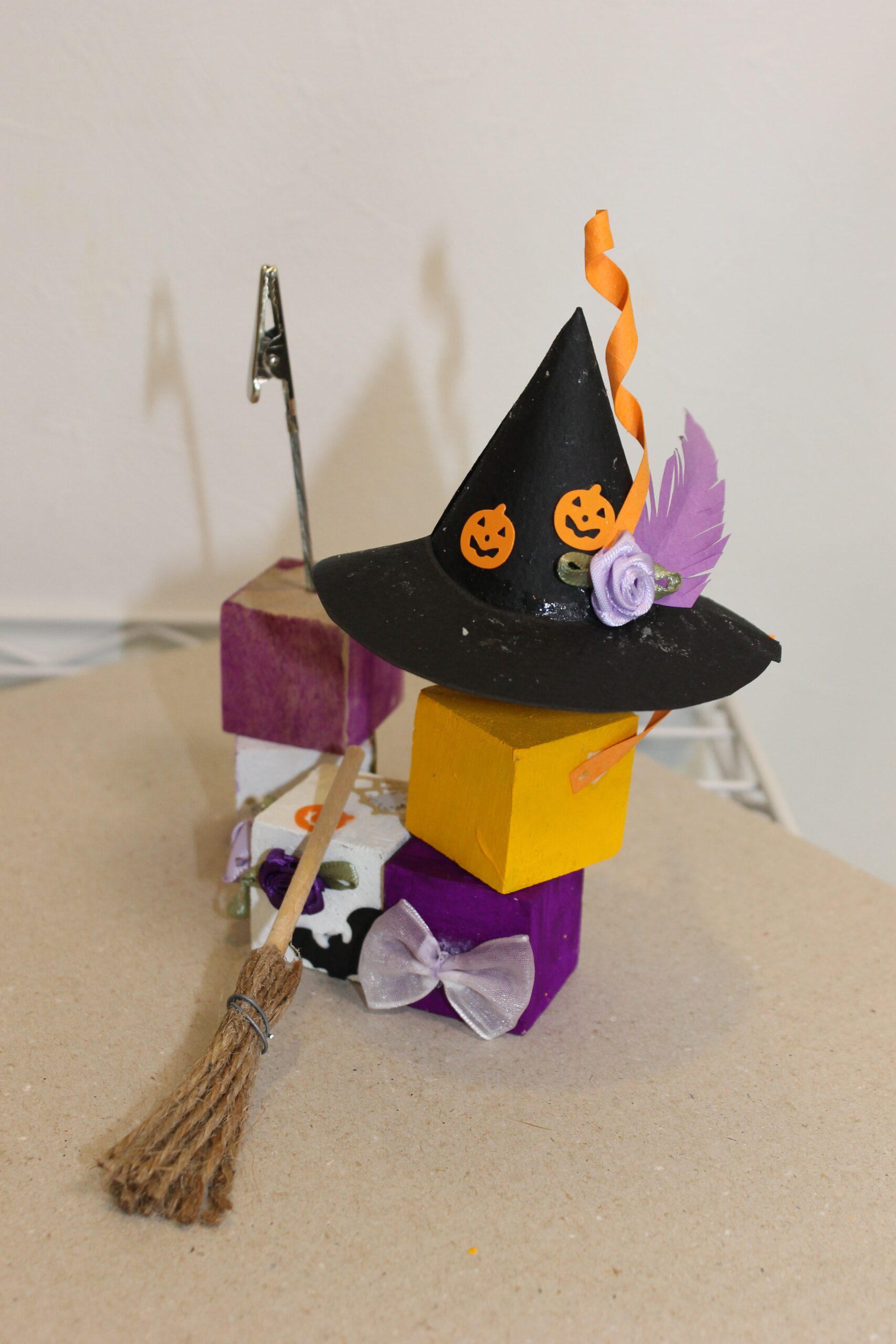今回の工作では、ハロウィンの帽子と箒の作り方をお伝えし、その帽子と箒をディスプレイデザインしていただくことにしました。
