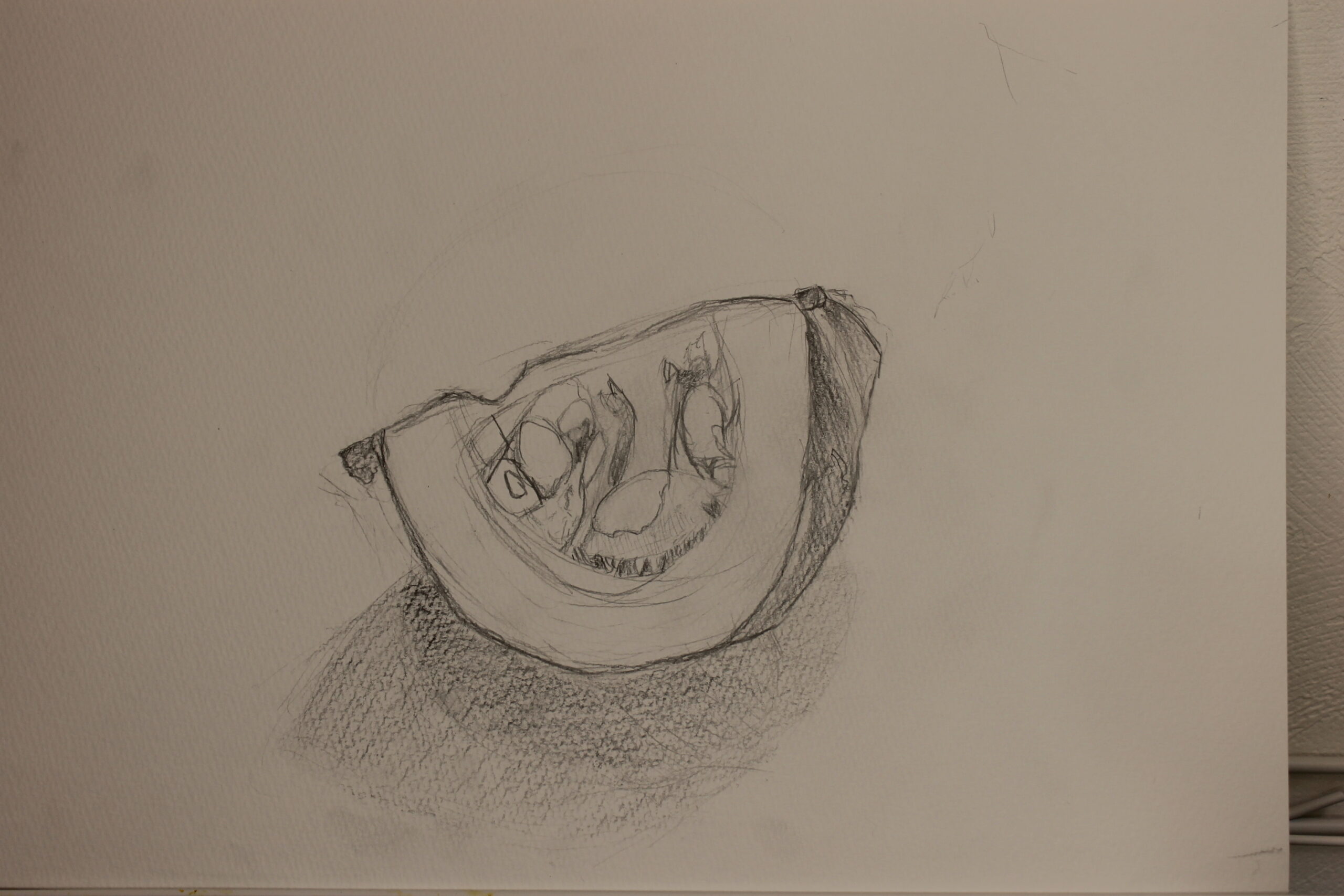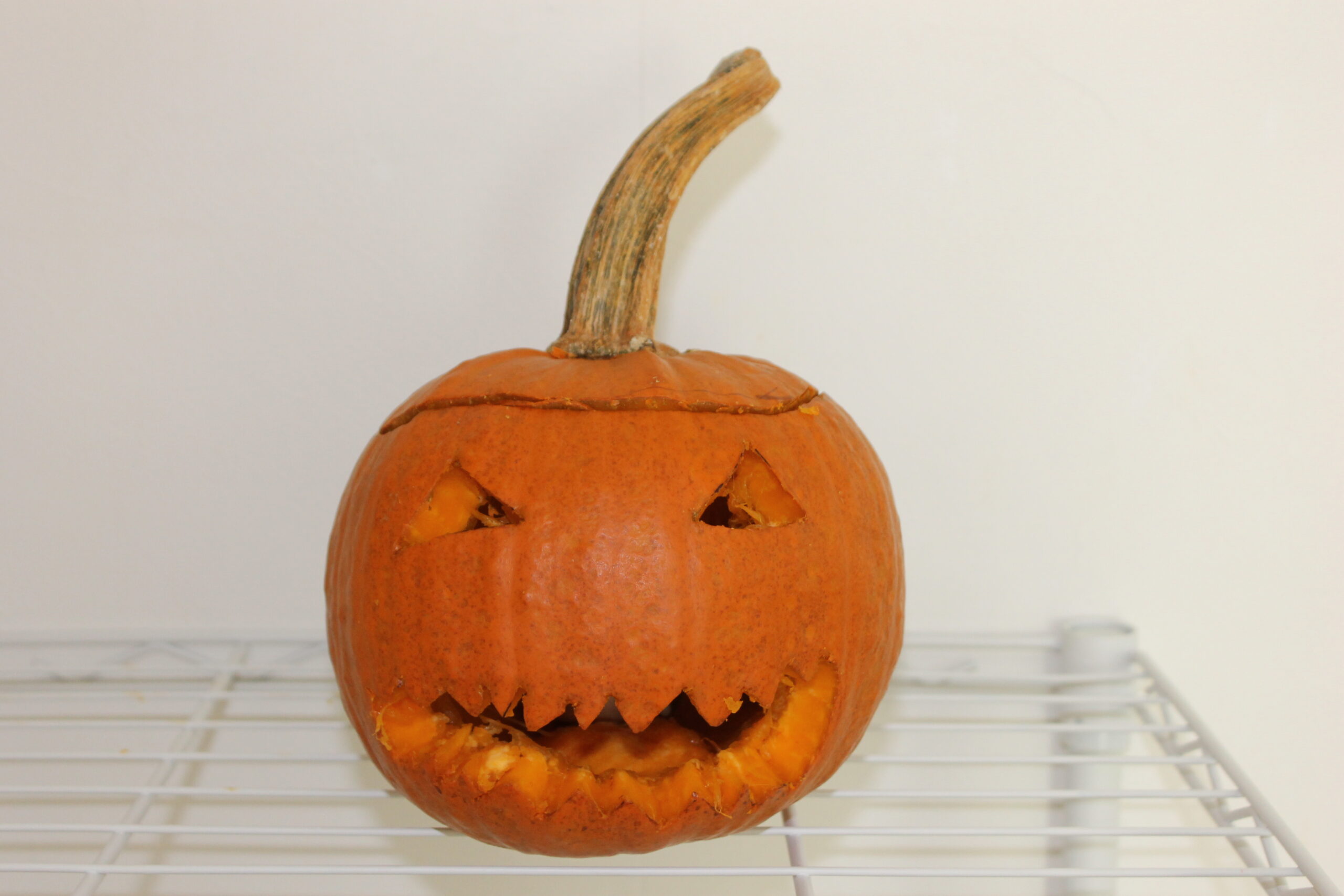 ジャックオーランタンを作ってみたい!という生徒さんの声から、各クラスに一個のカボチャで、作業を分担し、カボチャの絵を描く傍らで、ジャックオーランタンも作ってみることにしました。ジャックオーランタン用のカボチャは、普段私たちがよく目にするセイヨウカボチャのえびすカボチャなどに比べ格段に切りやすいのですが、ジャックオーランタンを作るのは初めてという生徒さんが多かったので、切るのがなかなか難しかったようです。