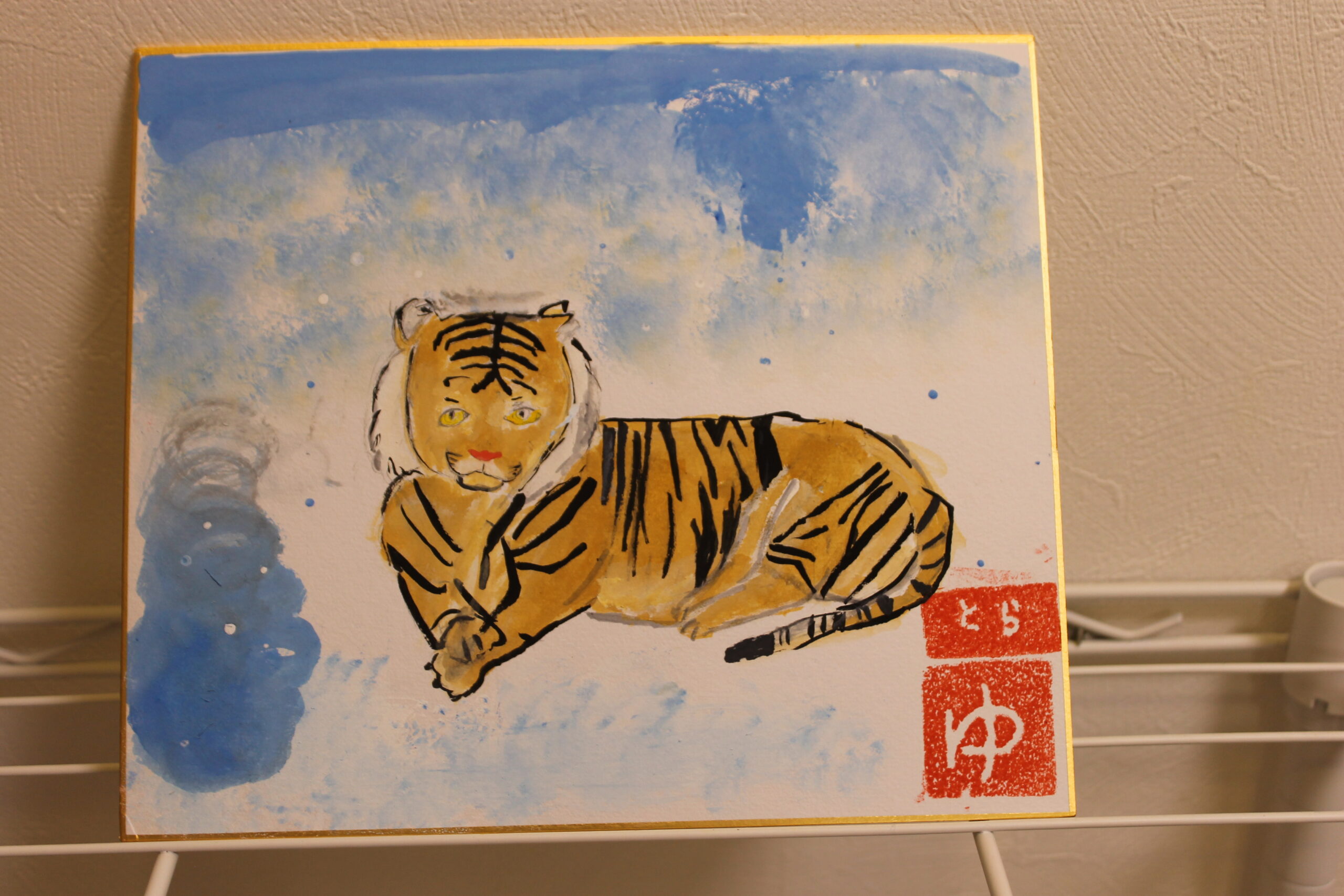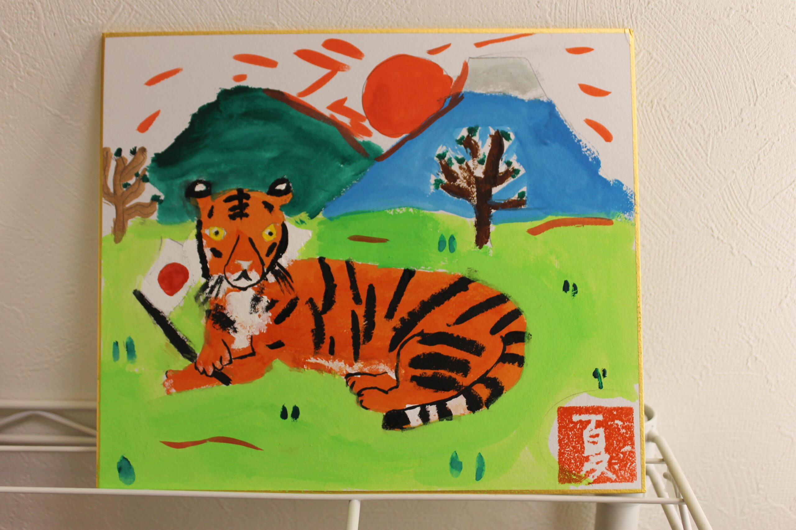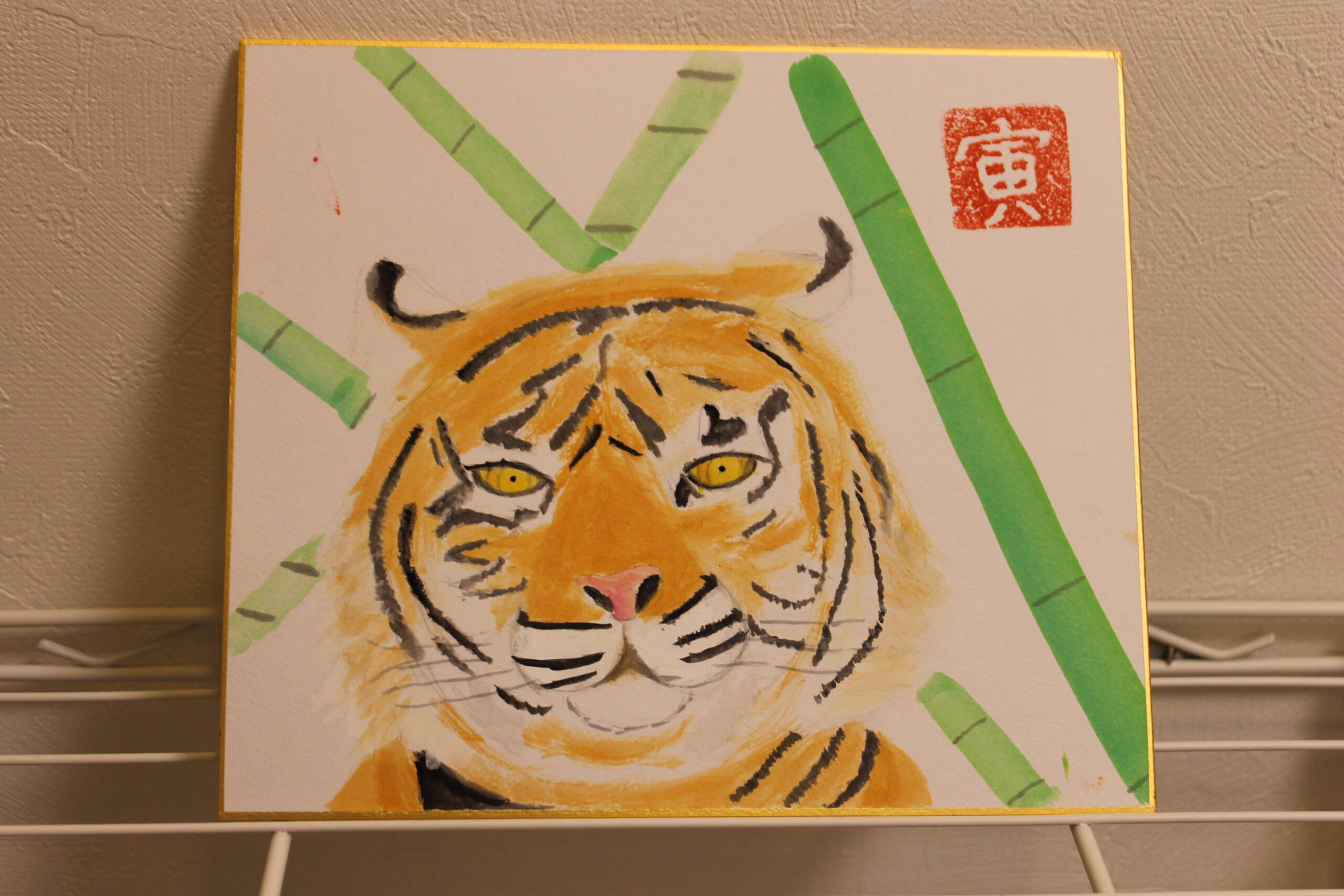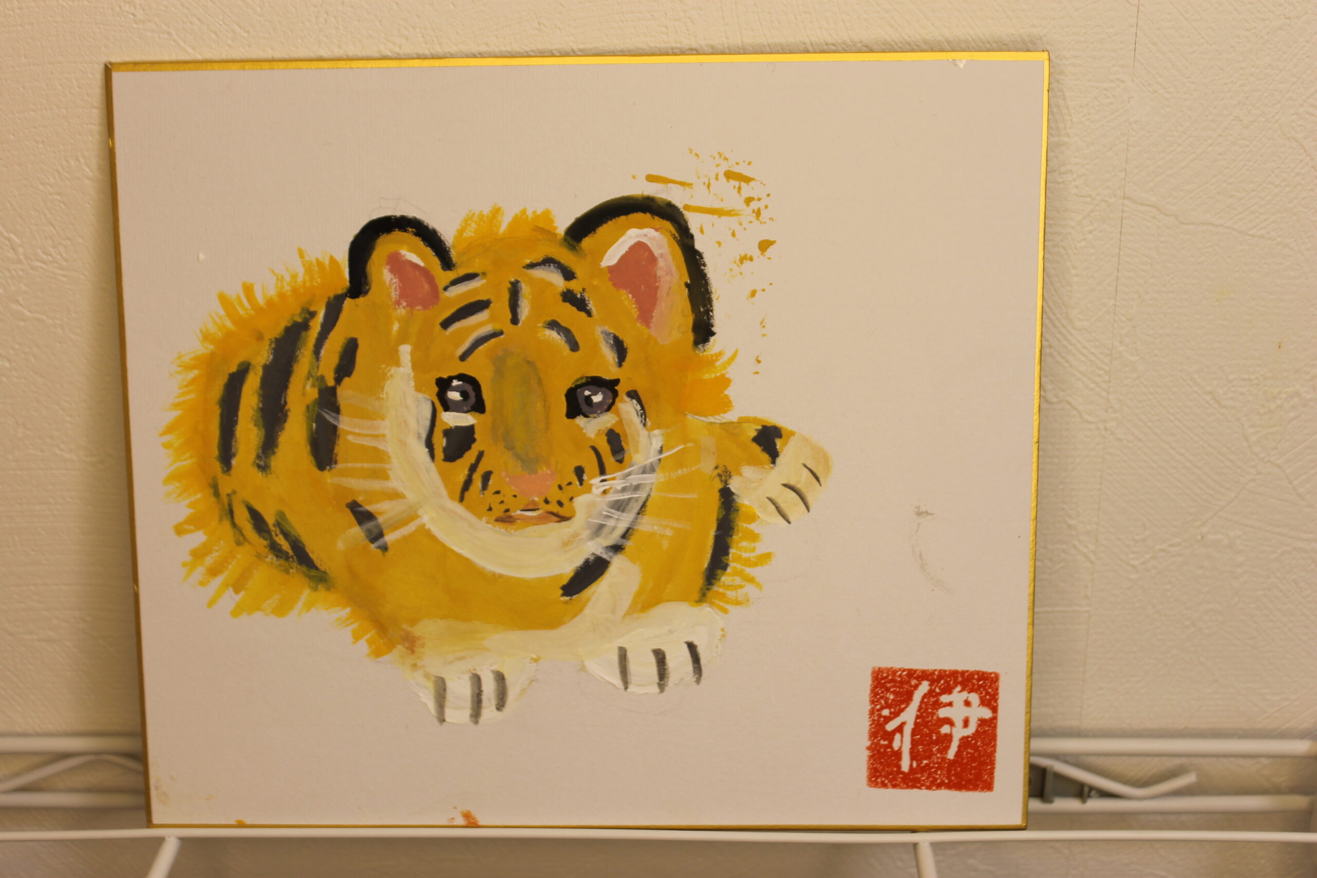 お子さん達にとって虎の絵は、黒い模様があることで描くことが難しかったようですが、可愛らしい虎、迫力のある虎、背景もそれぞれのオリジナリティーある絵が完成しました。来年1年間ご自宅に飾って楽しんでいただけたらと思います。