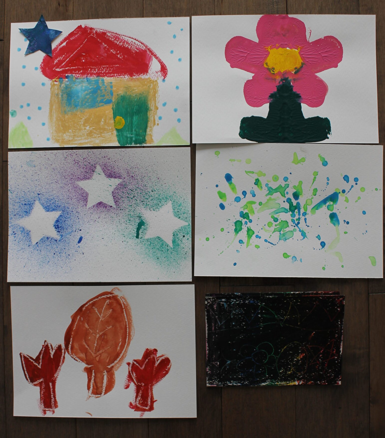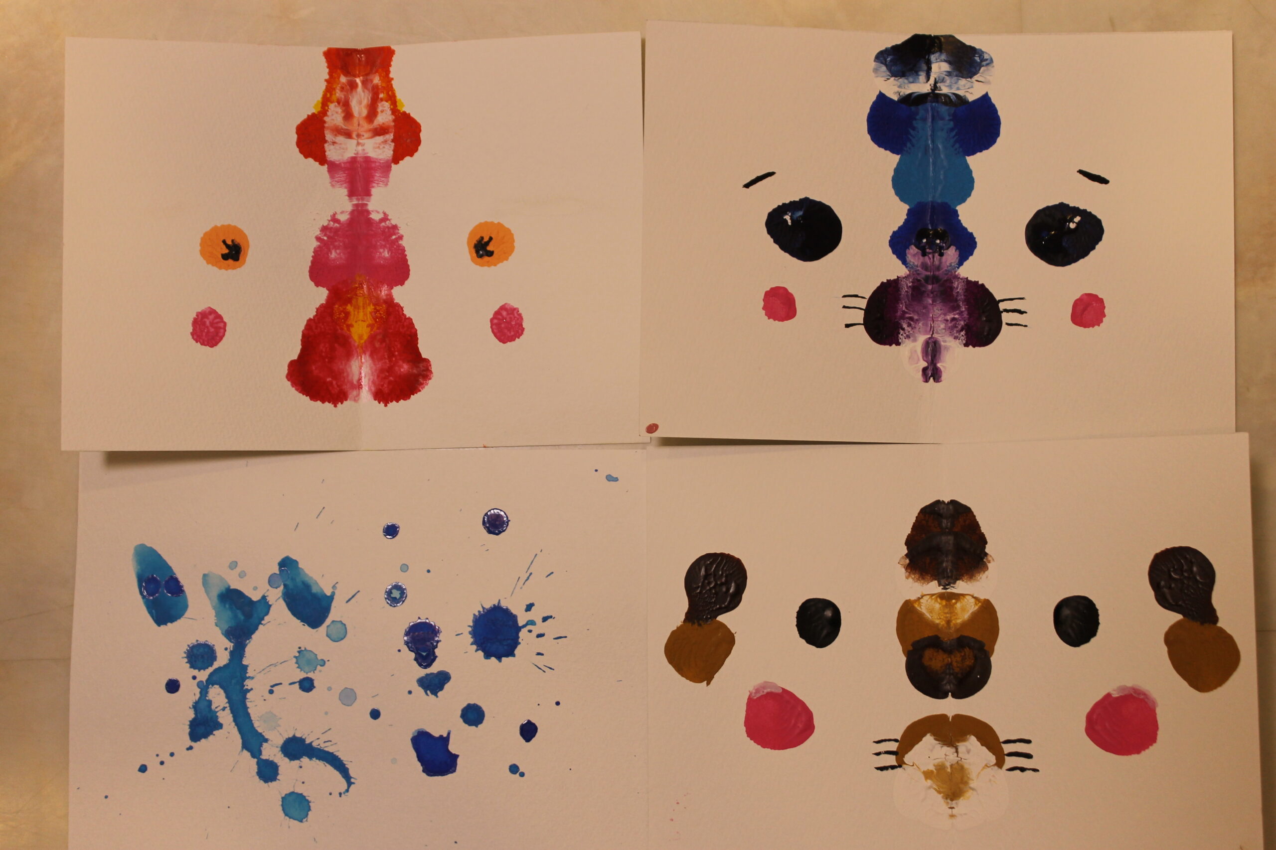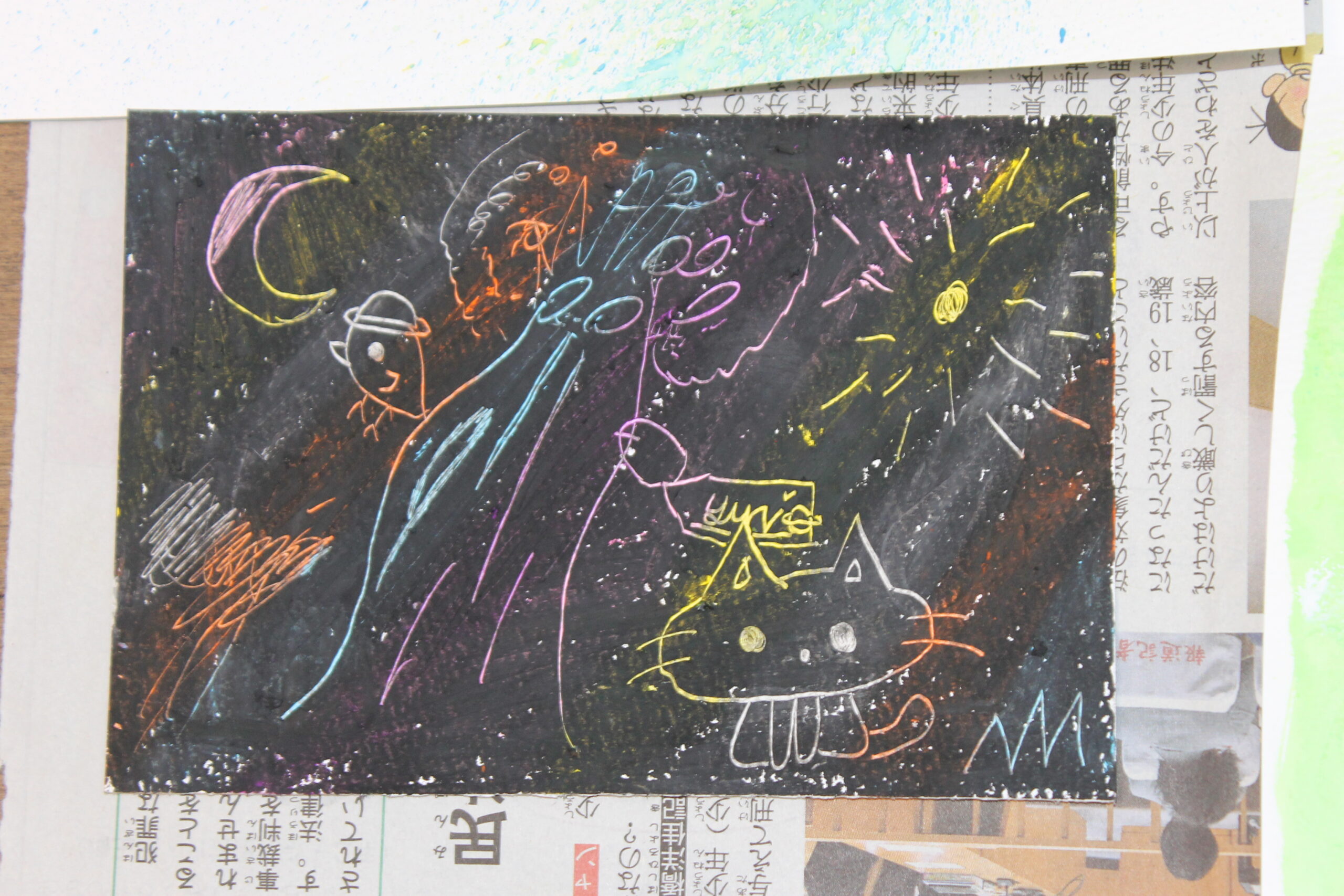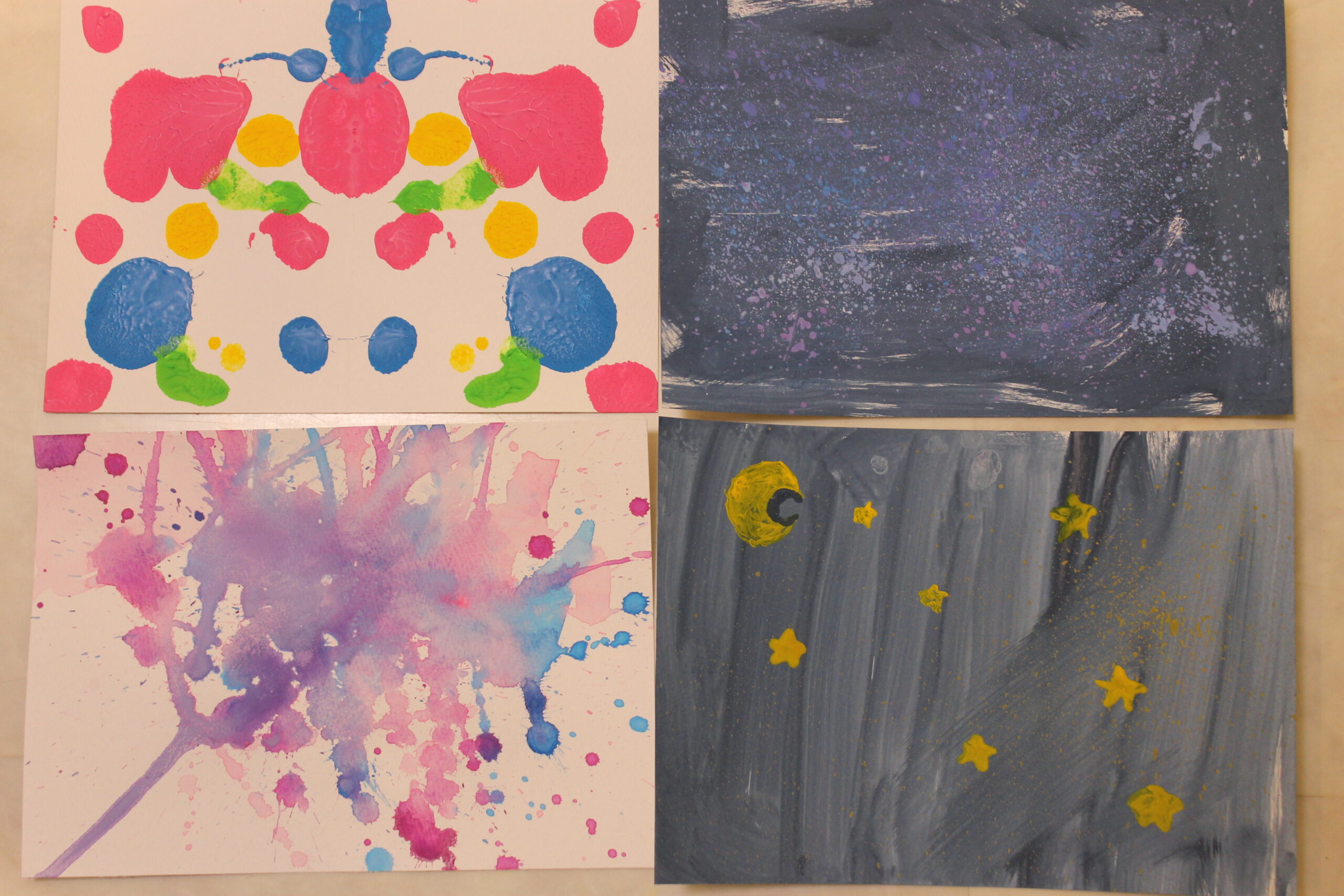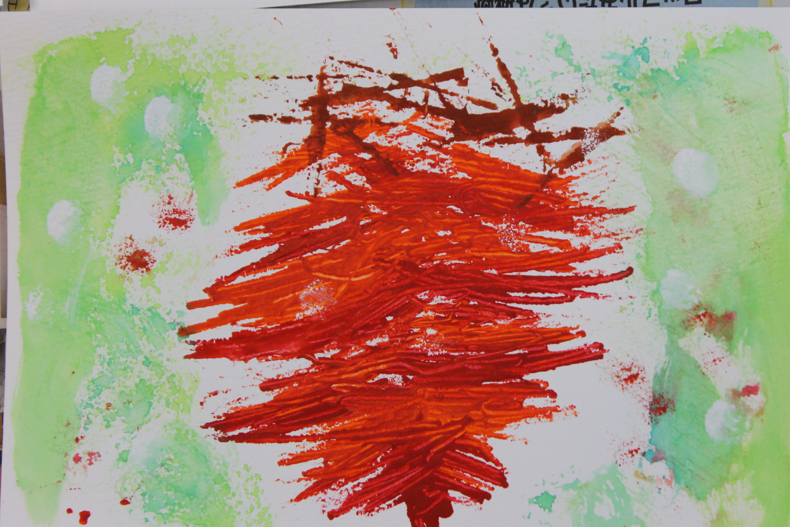 絵画の技法には、ドリッピング、デカルコマニー、コラージュ、スタンピング、バチック、スパッタリング、スクラッチ、にじみ、マスキングなどの技法があり、実際にそれらの技法を試しておくことで、お子さんたちが描きたい表現に応用してゆくことができます。そのため、お教室では一年に一回は技法を試すために、技法を使った絵や工作を制作してきました。