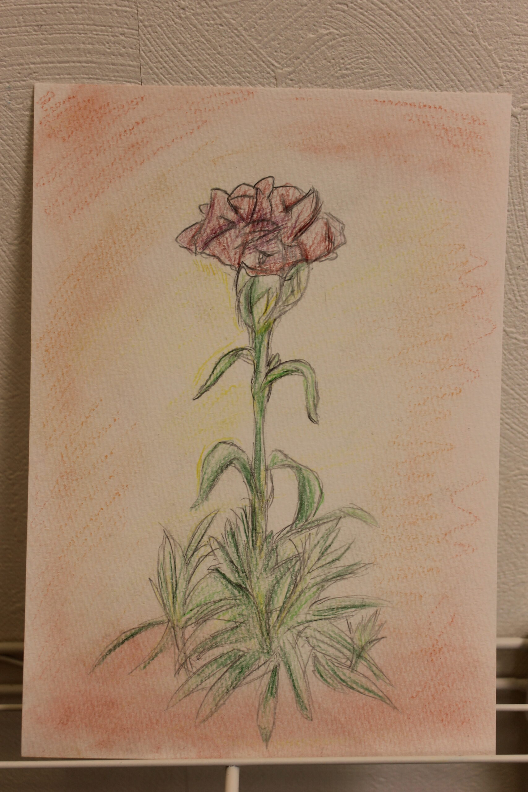 4月のこどもクラスでは花を描いております。今回描いている花はダイアンサス、和名はナデシコです。カーネーションもナデシコ属でよく似ているため、母の日まで飾っていただくのにちょうど良いかとこの花を描くことにいたしました。