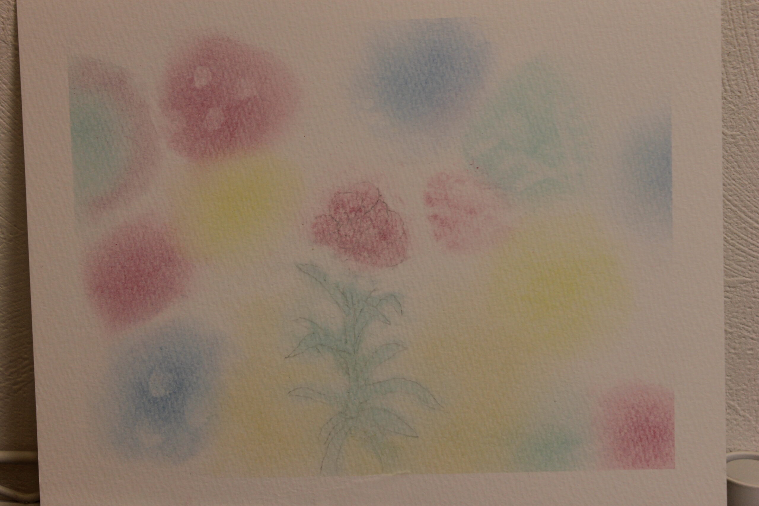 さて、ダイアンサスの花をどのように描いたかですが、最初は一分間で短く2回スケッチをし、次に丁寧に線で捉えて1回じっくりスケッチをし、最後にダイアンサスの花を自分らしく自由な構想で描いてもらいました。