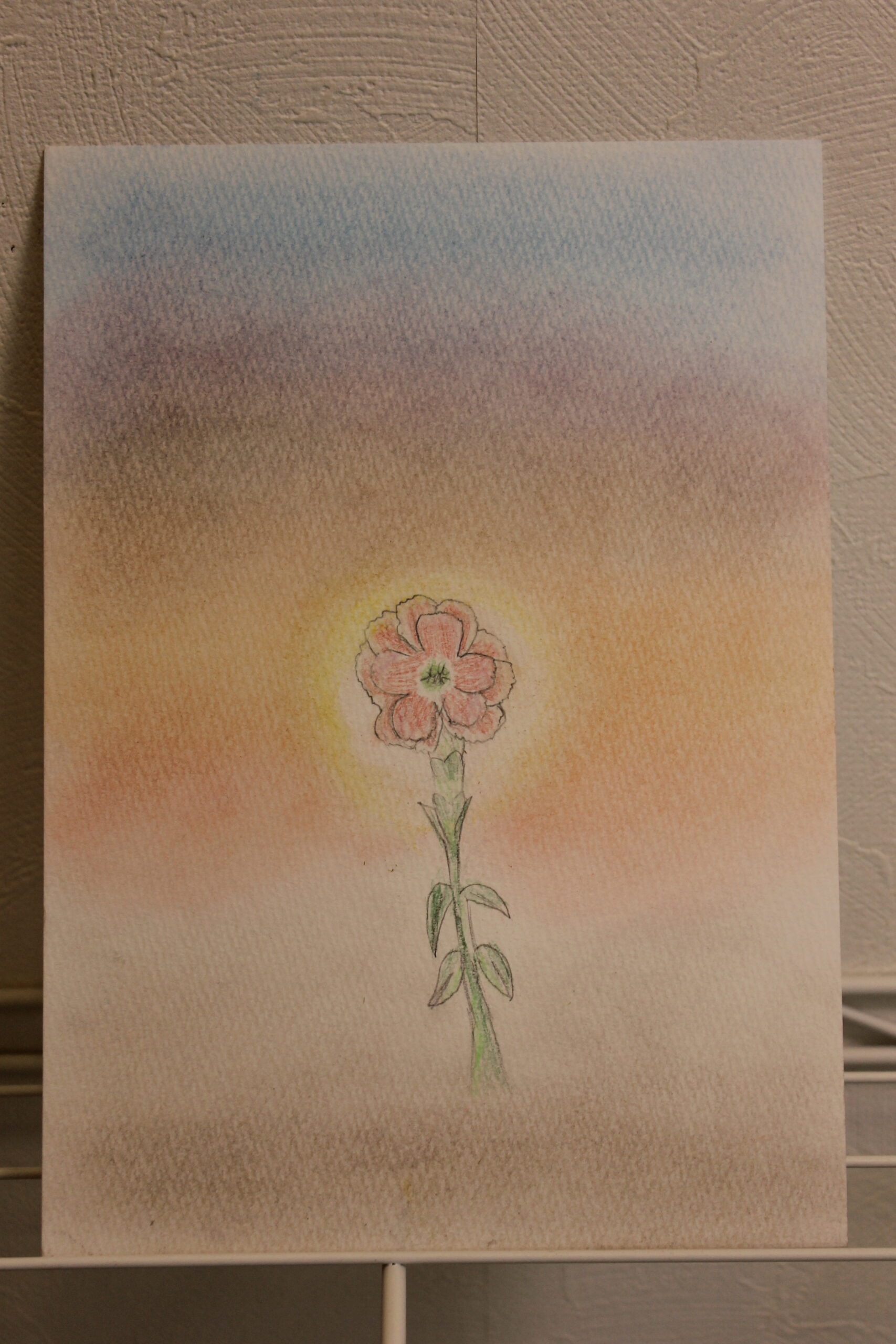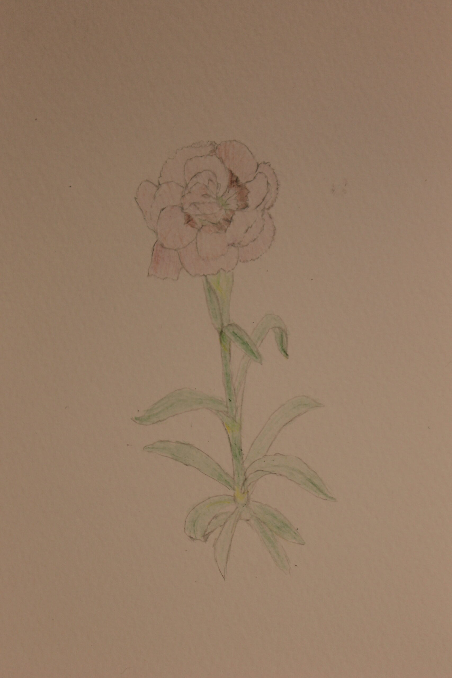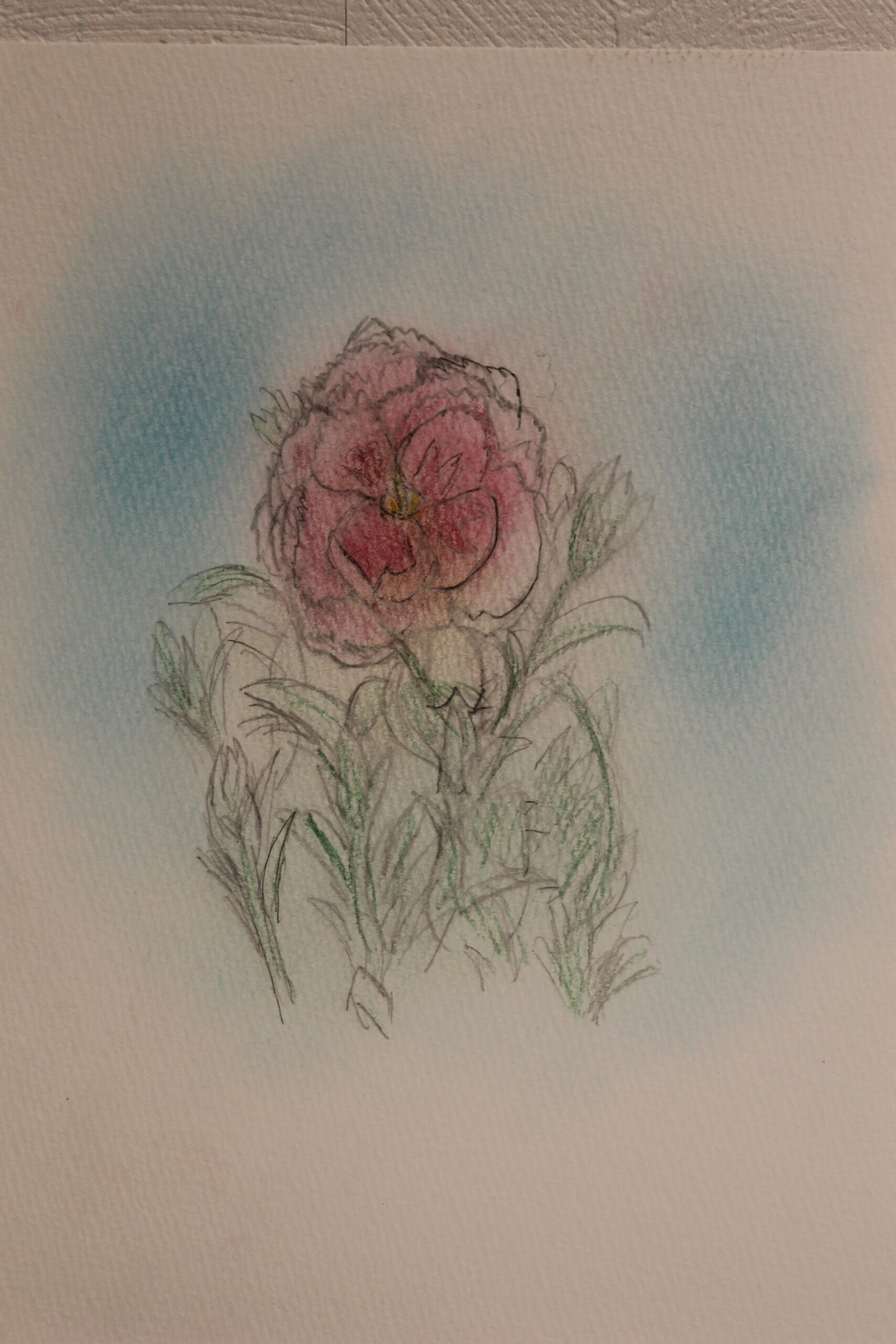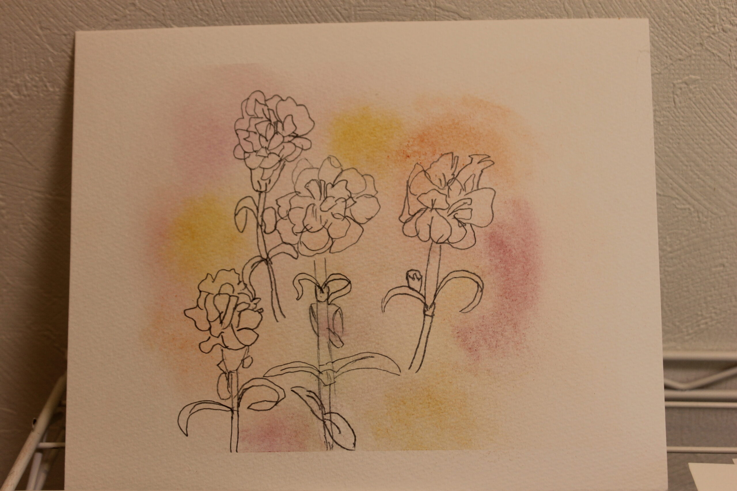 さて、ダイアンサスの花をどのように描いたかですが、最初は一分間で短く2回スケッチをし、次に丁寧に線で捉えて1回じっくりスケッチをし、最後にダイアンサスの花を自分らしく自由な構想で描いてもらいました。