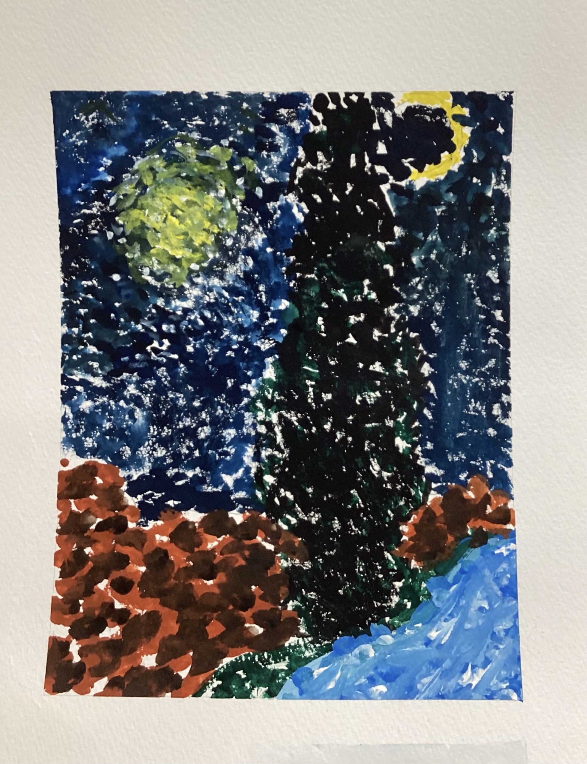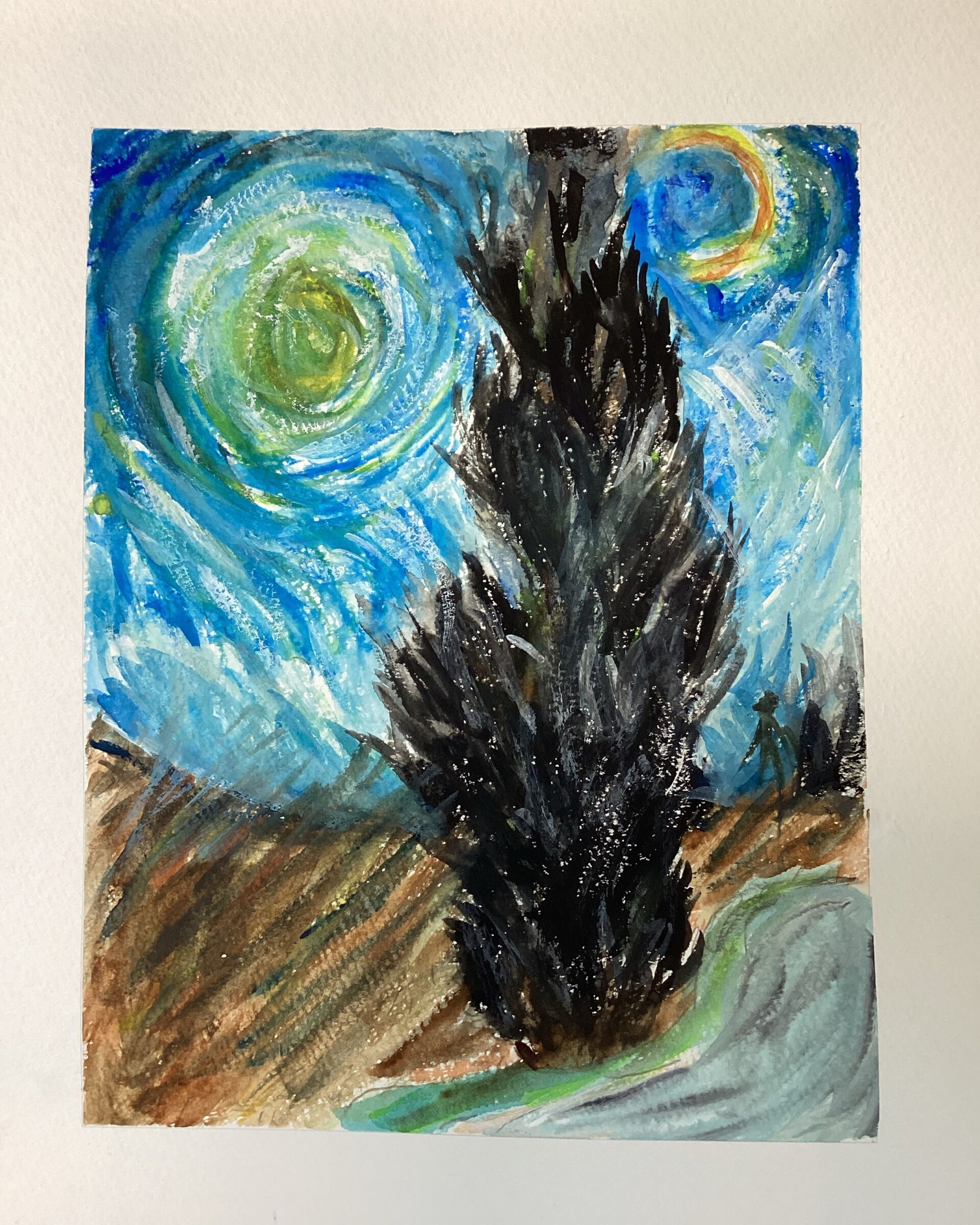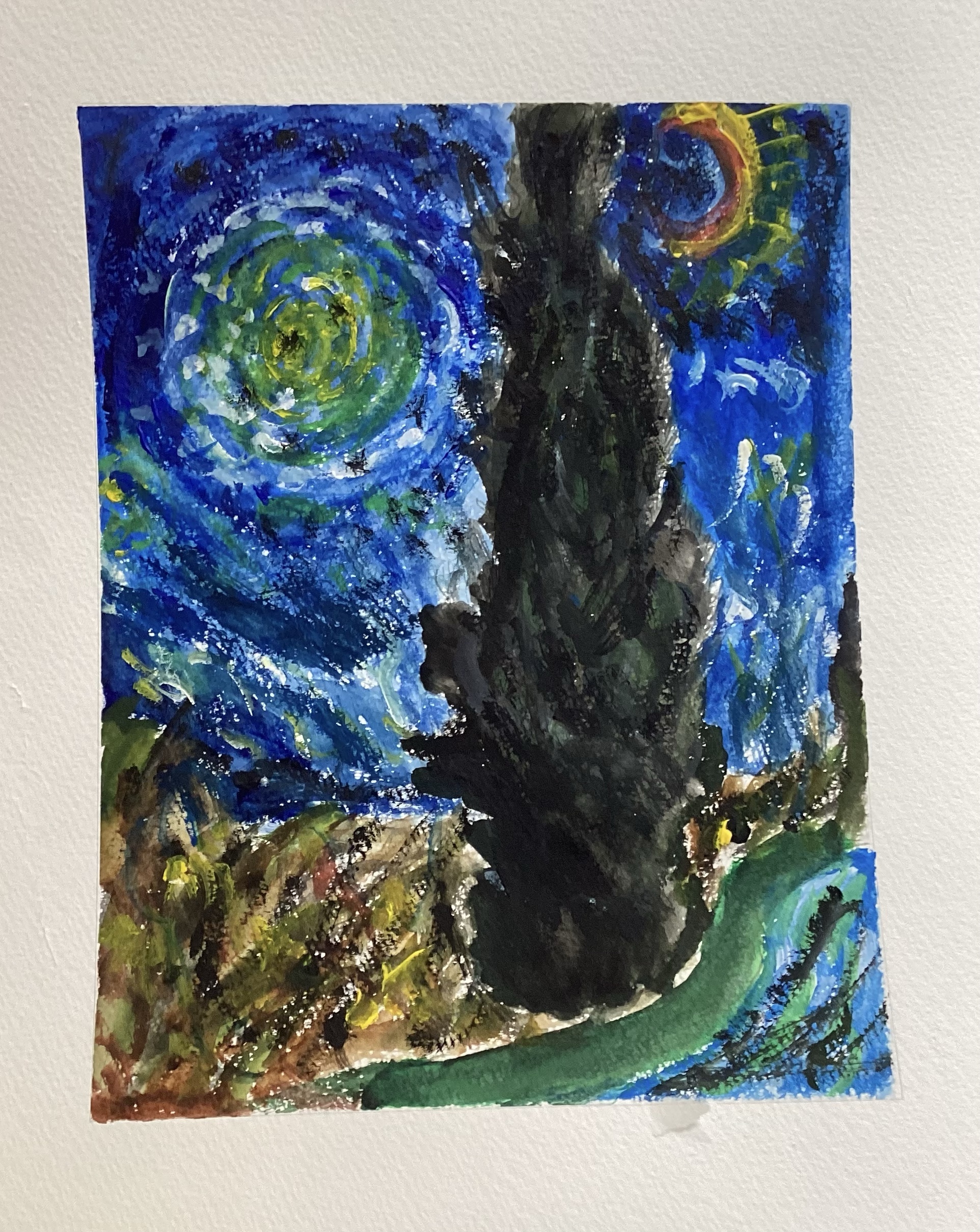 今年の模写はゴッホの最後の作品《糸杉と星の見える道》です。児童のための伝記漫画にもなっていることもあり、ゴッホはお子さんたちにもよく知られています。