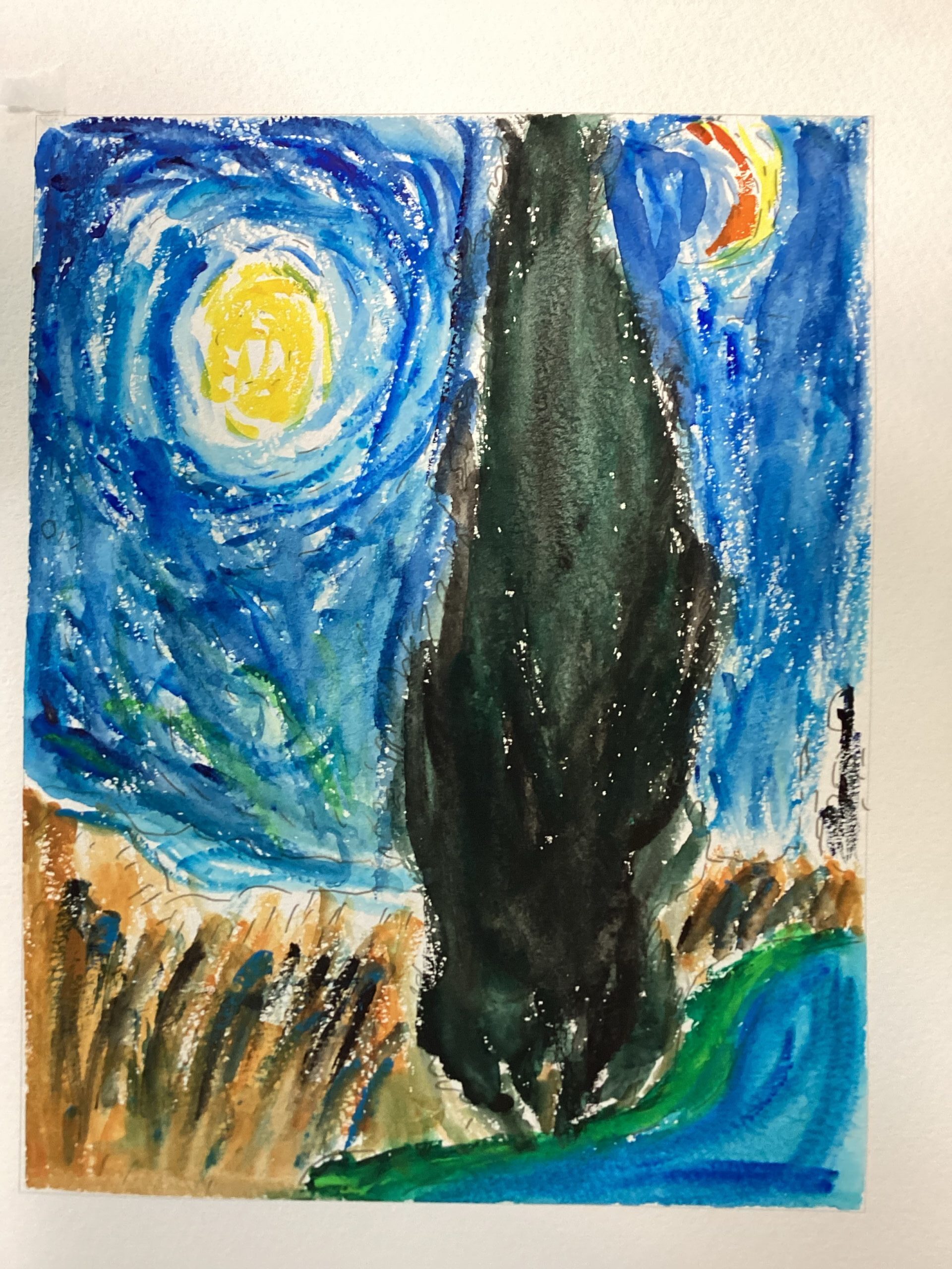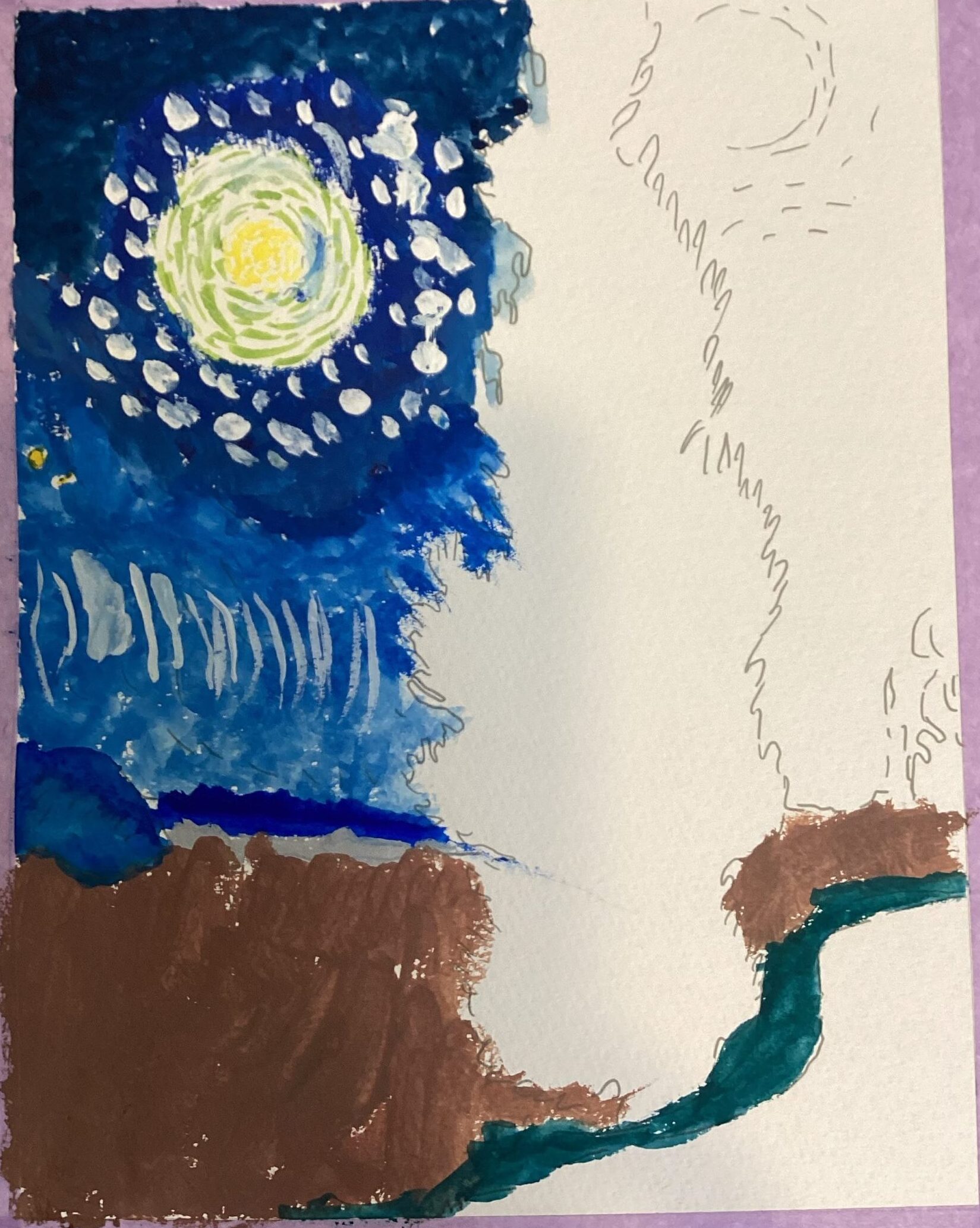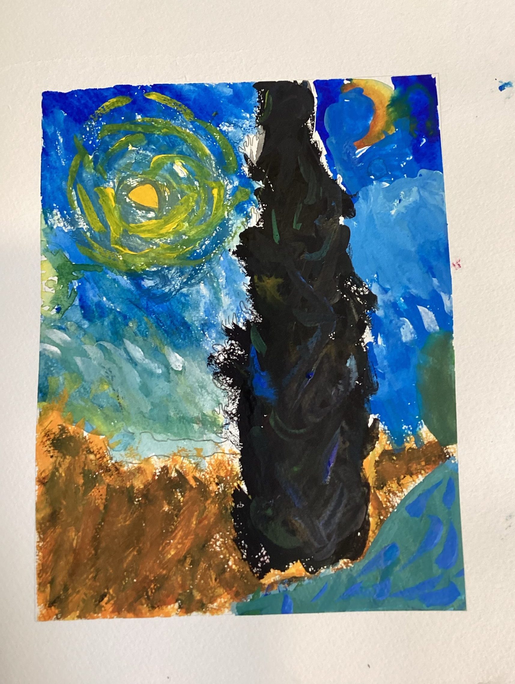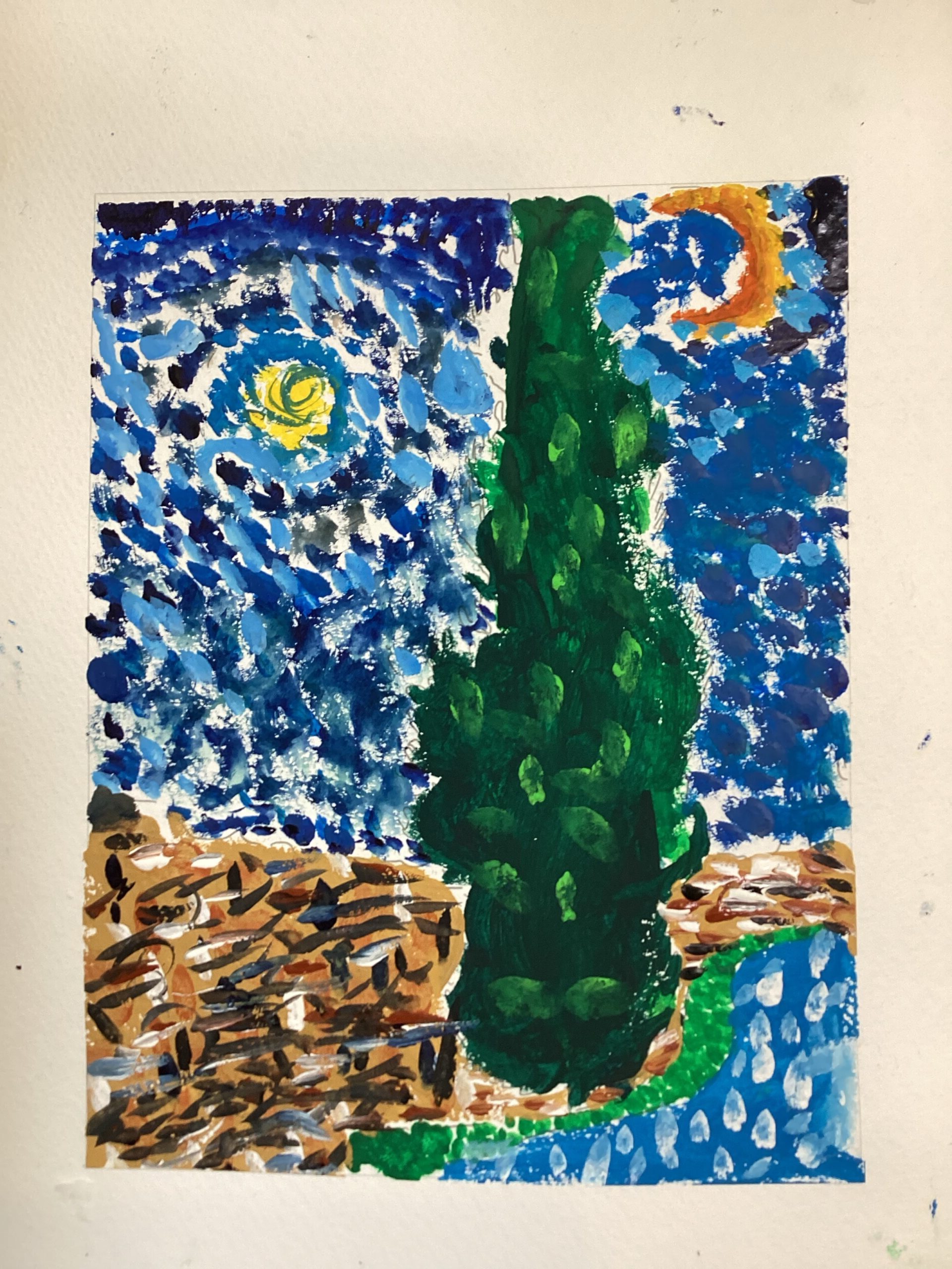 お子さんたちが水色か青色一色で一気に塗りがちな空の絵ですが、月や星をぐるぐると筆で囲むように描かれたゴッホの絵を模写することで、空にも色々な表現の方法がある事を体験的に知ってもらえたのではないでしょうか。