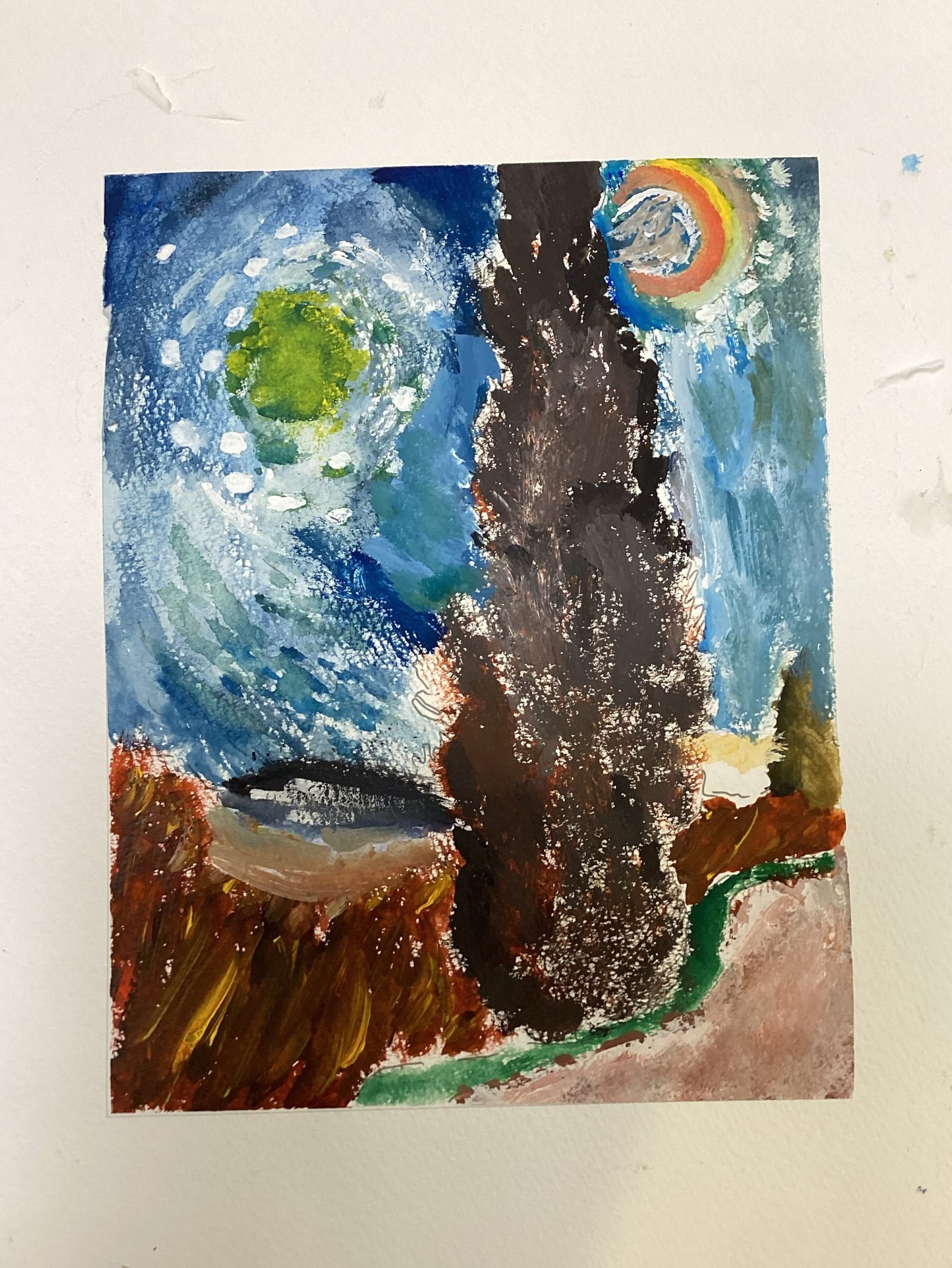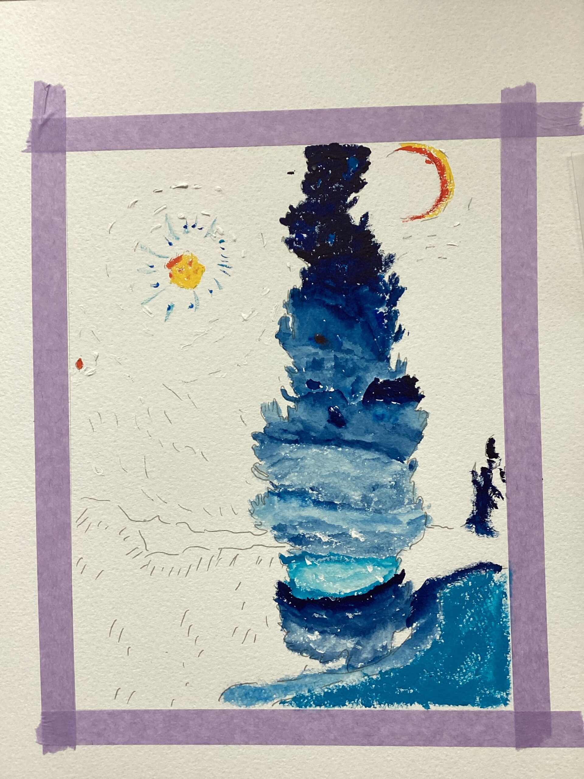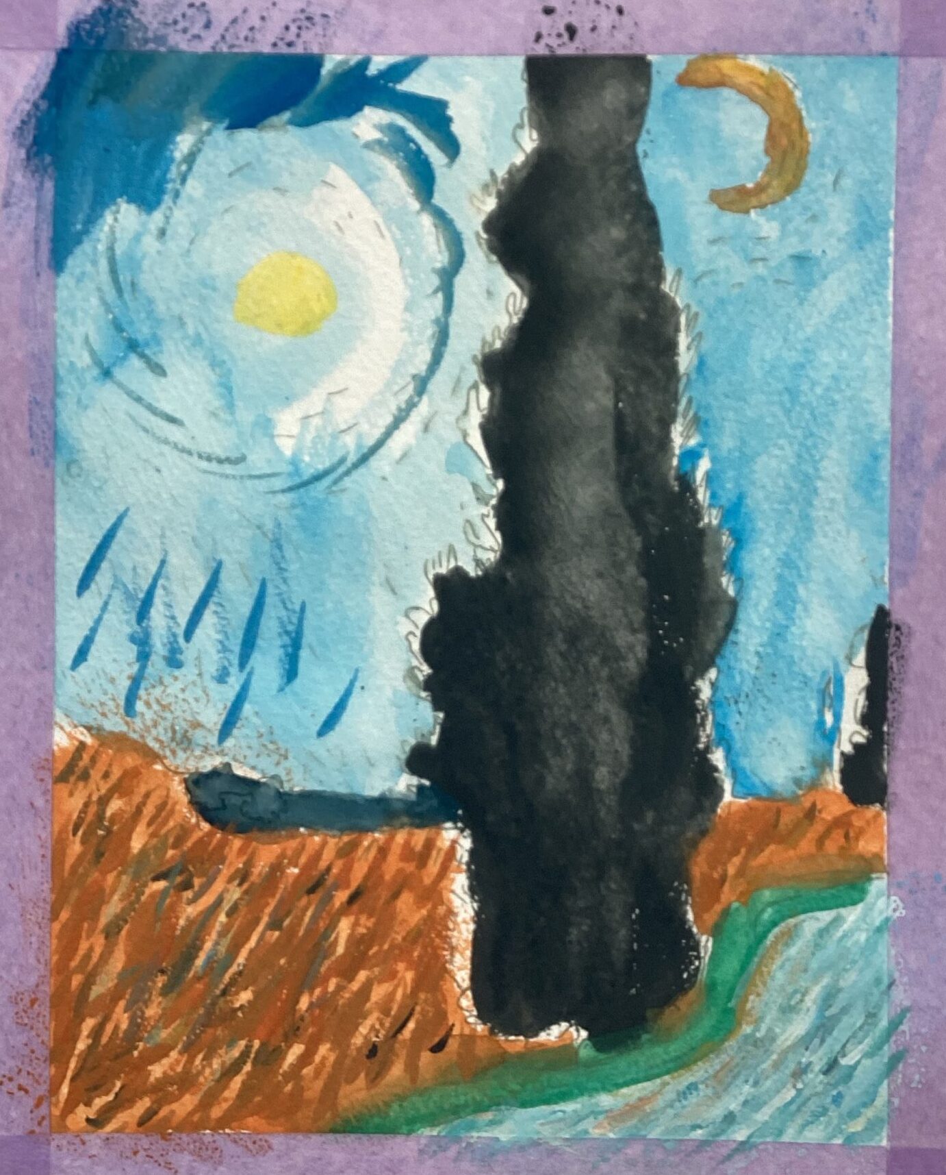 お子さんたちが水色か青色一色で一気に塗りがちな空の絵ですが、月や星をぐるぐると筆で囲むように描かれたゴッホの絵を模写することで、空にも色々な表現の方法がある事を体験的に知ってもらえたのではないでしょうか。