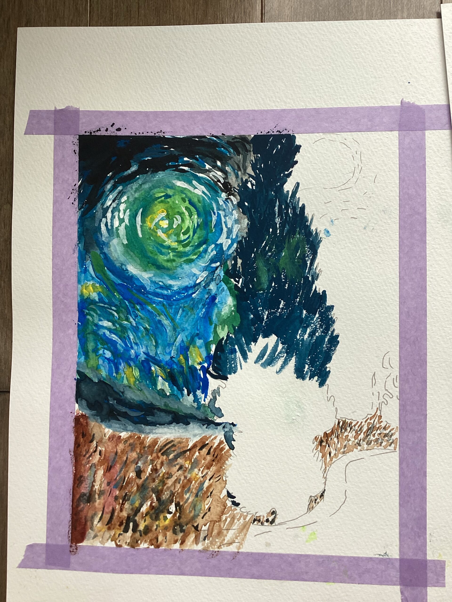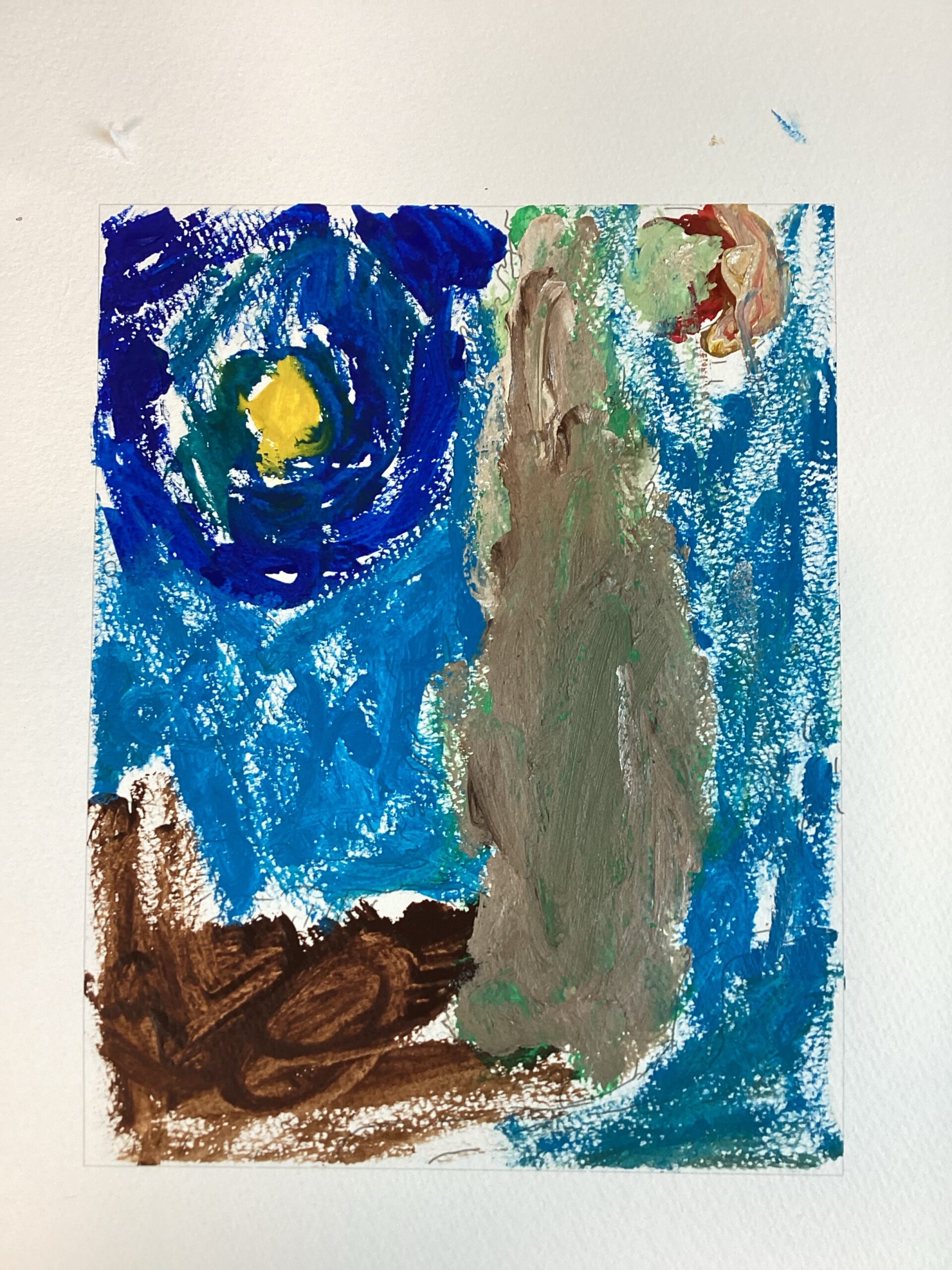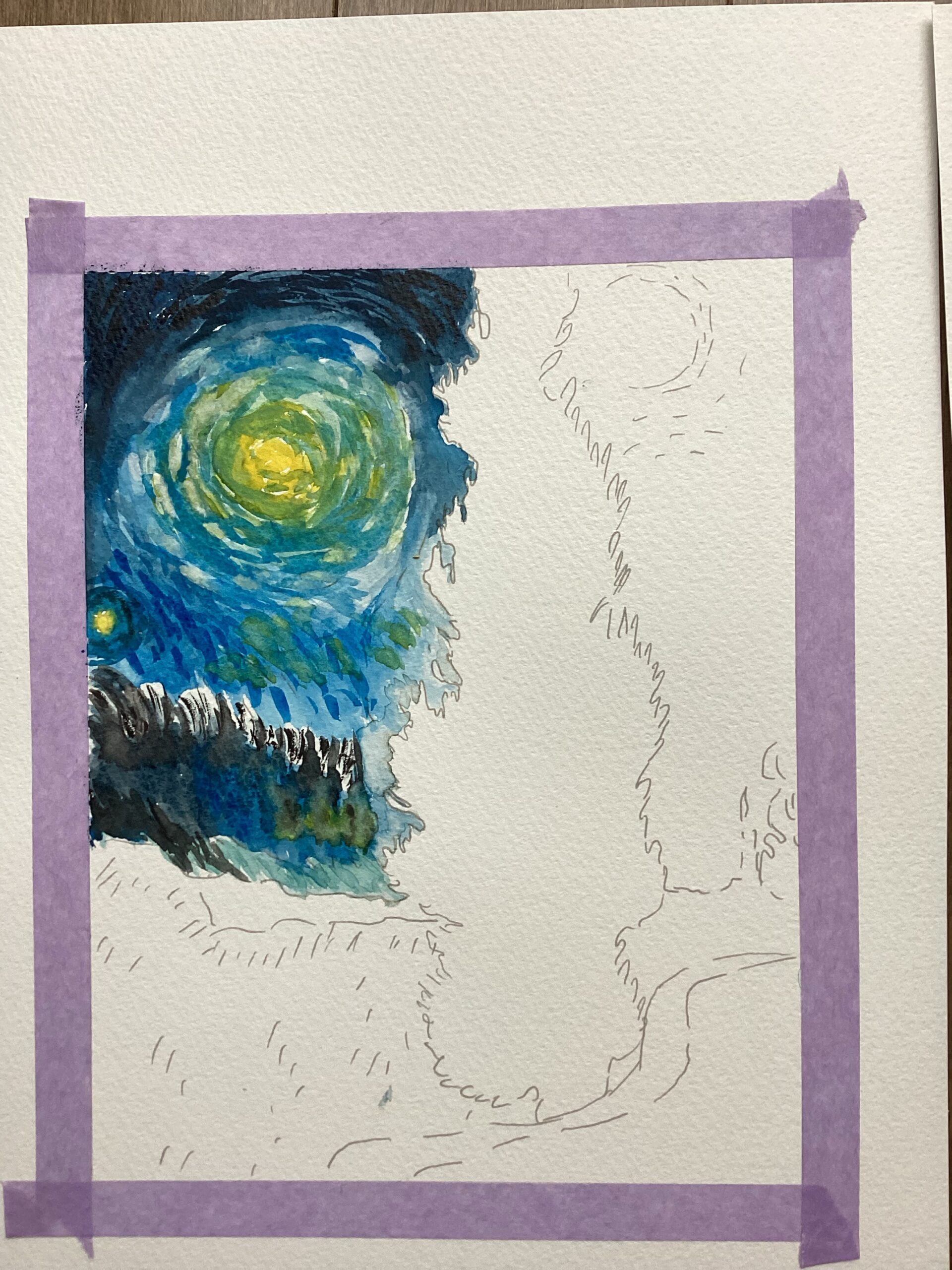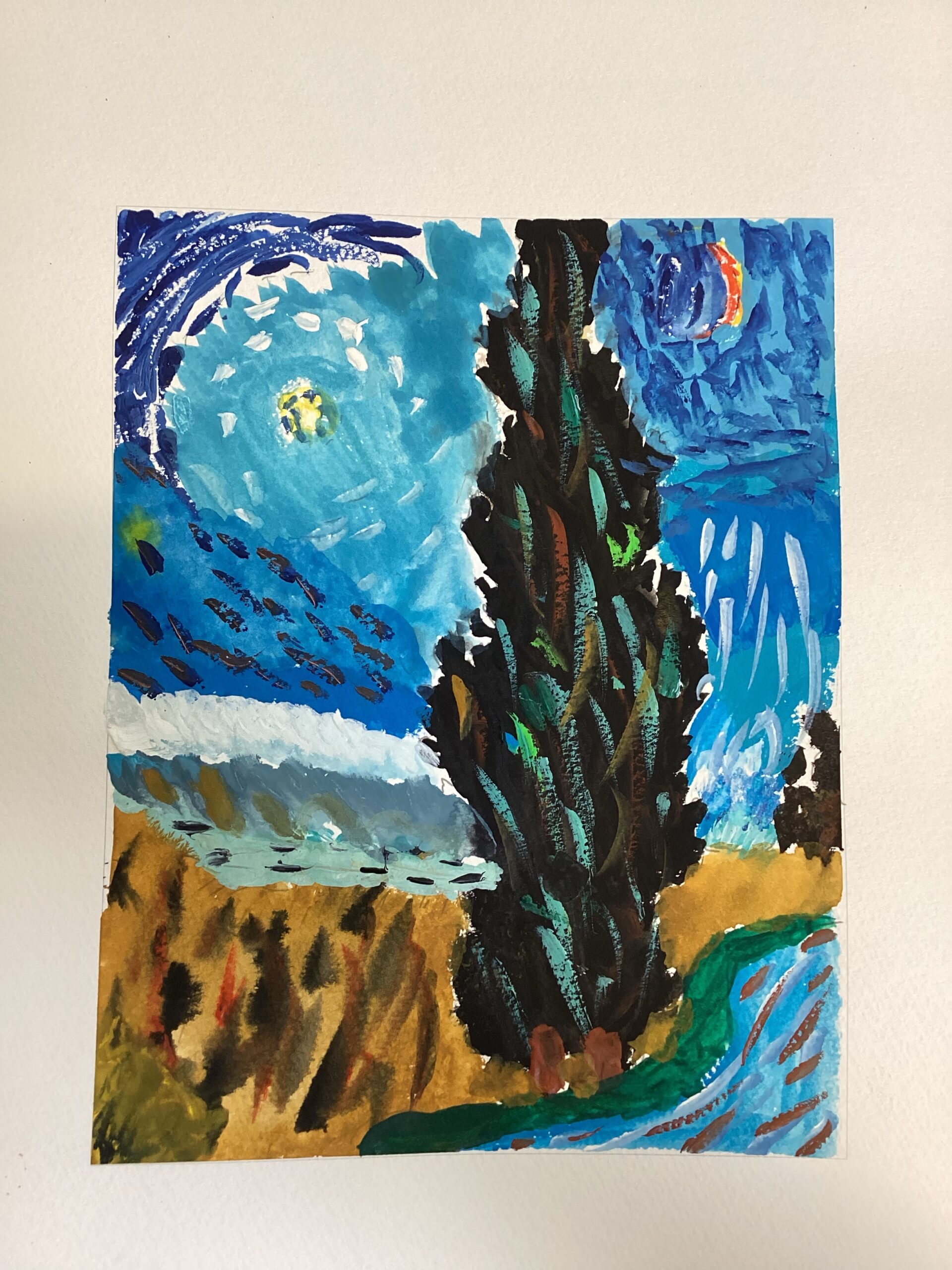 お子さんたちが水色か青色一色で一気に塗りがちな空の絵ですが、月や星をぐるぐると筆で囲むように描かれたゴッホの絵を模写することで、空にも色々な表現の方法がある事を体験的に知ってもらえたのではないでしょうか。