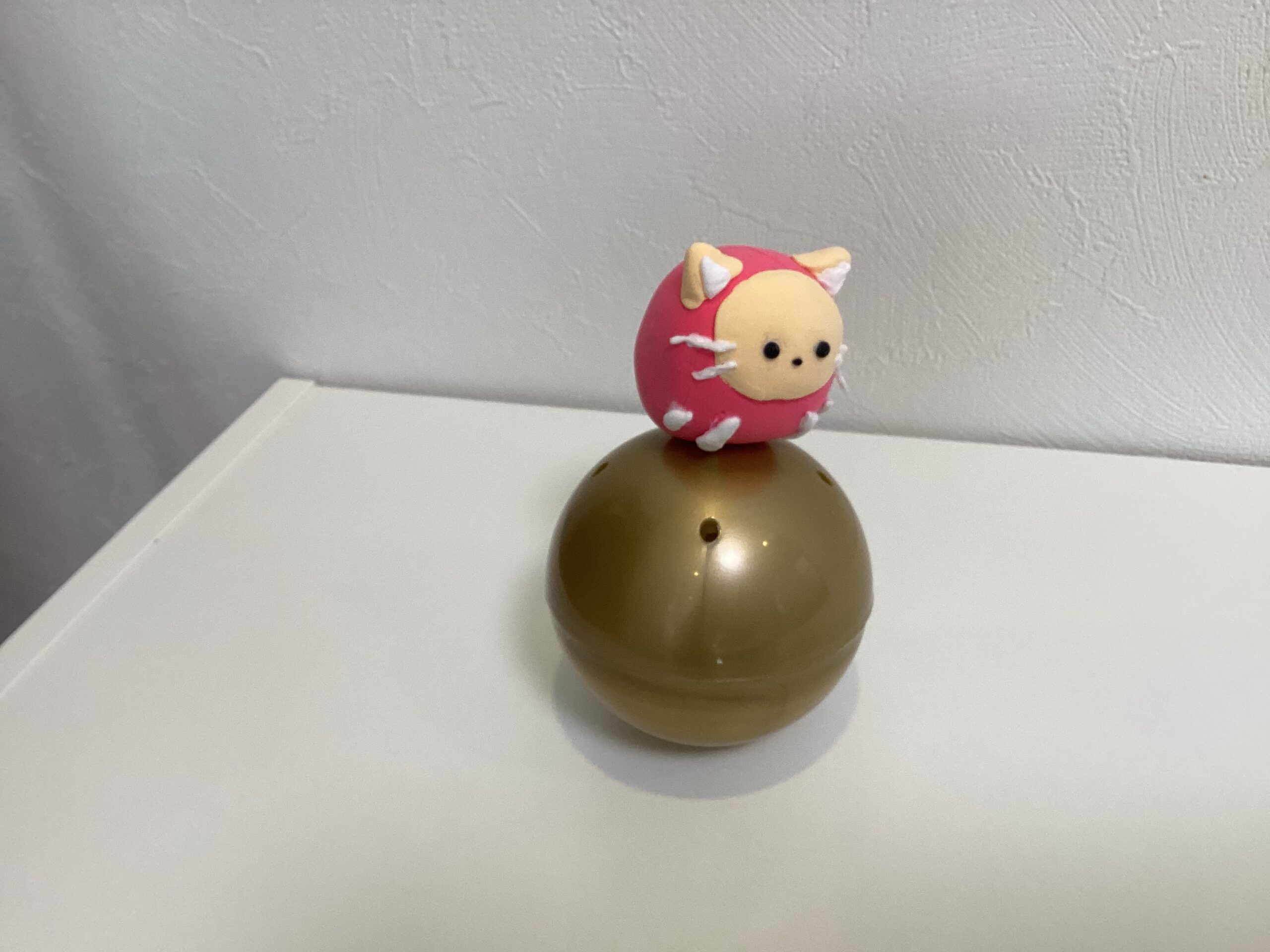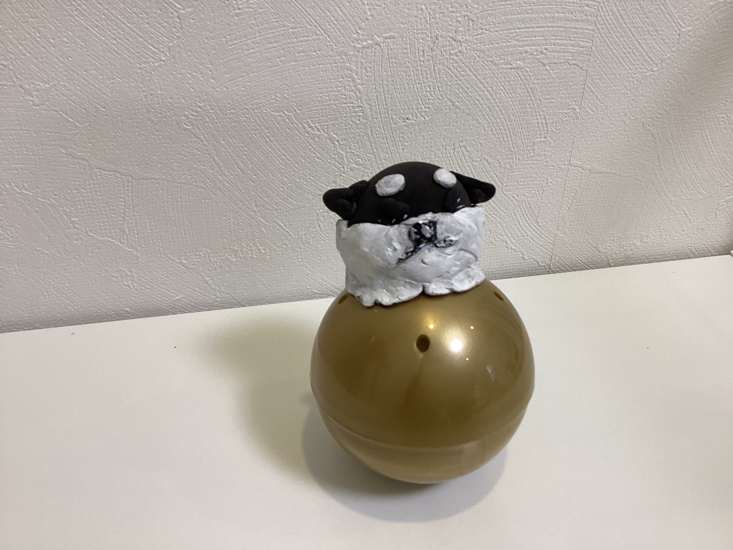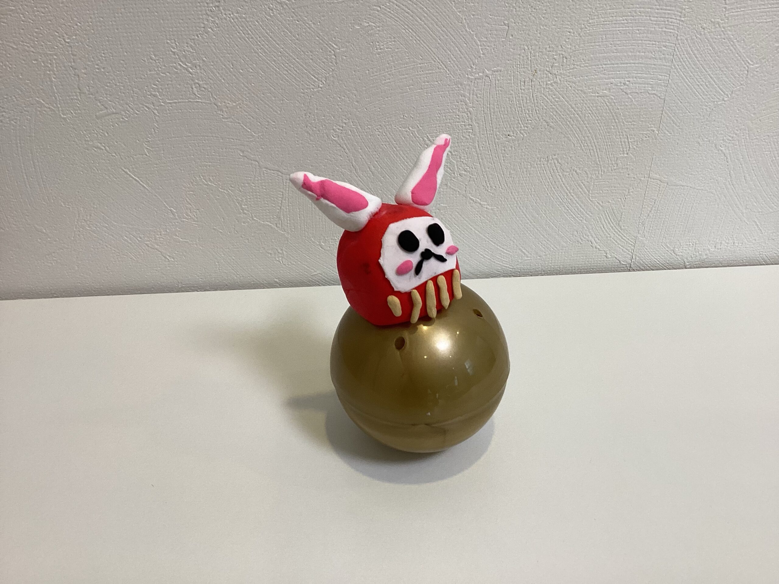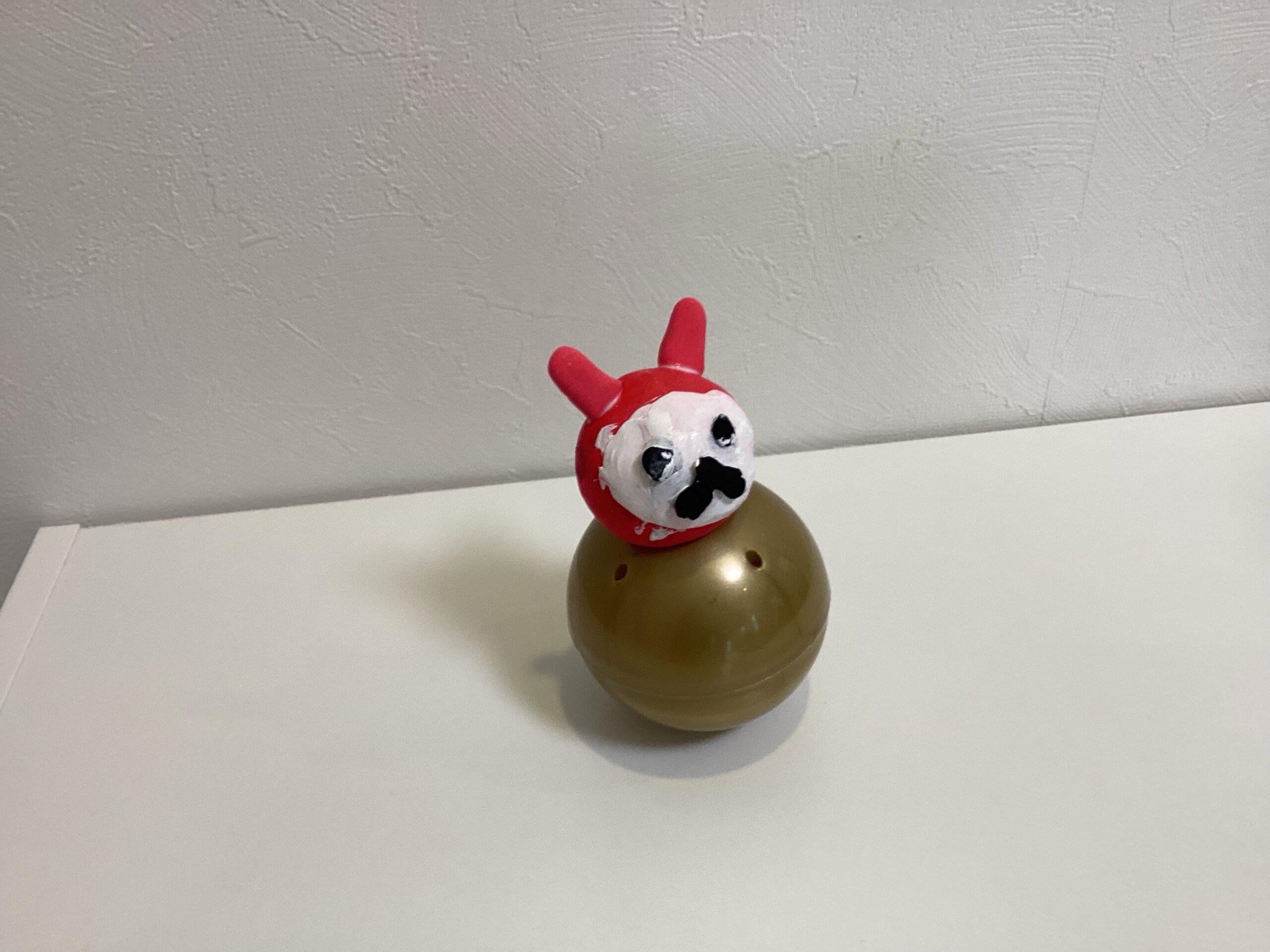 薄い紙を貼り合わせ張り子を作り、その中に錘を入れて作るのが伝統的な起き上がり小法師の作り方ですが、張り子は型を作ったり、乾くまでに数日間かかるため、今回はカプセルトイと紙粘土を使用して作ることにしました。カプセルトイとはガチャガチャ、ガチャポンなどの正式名称です。