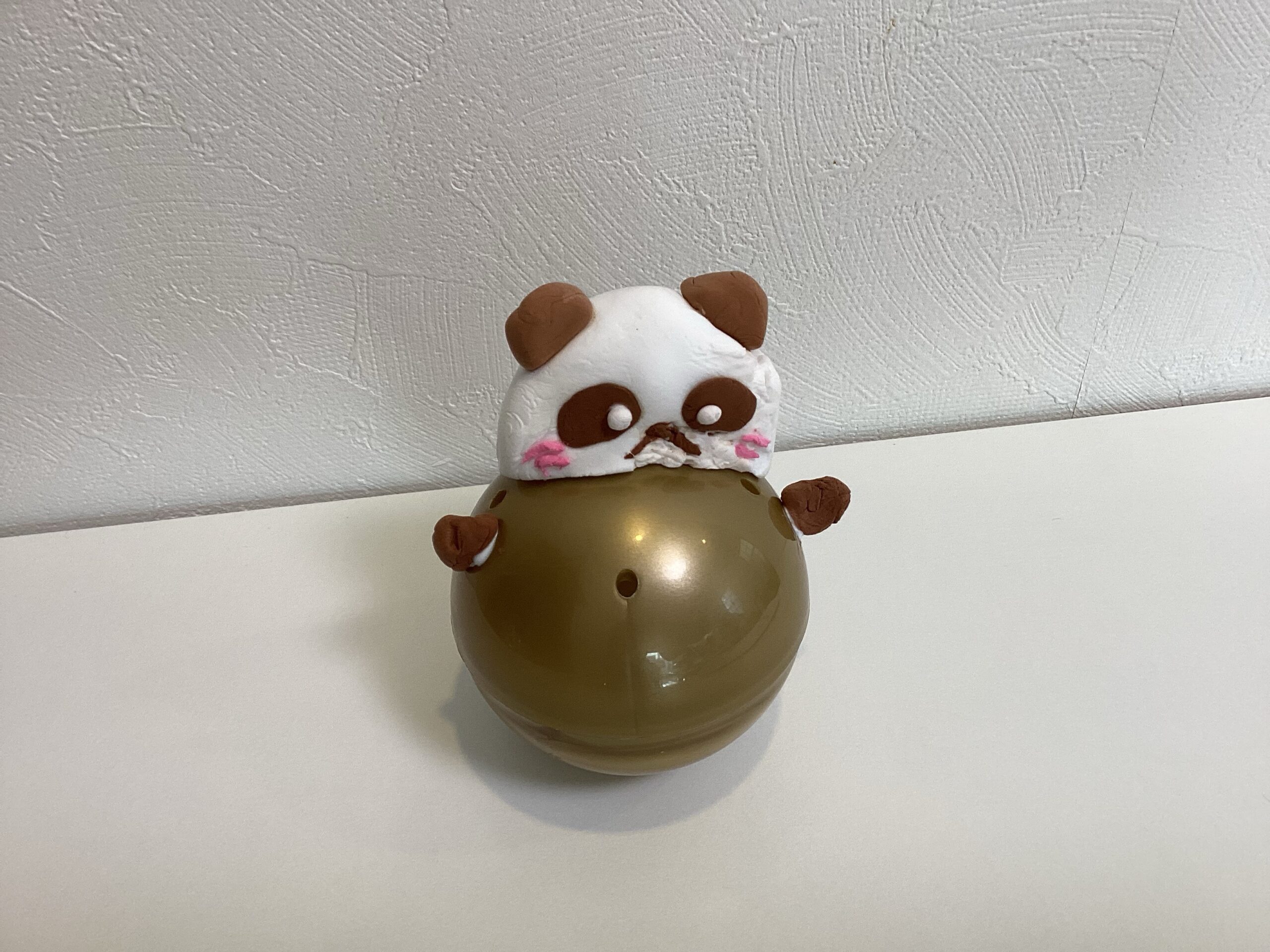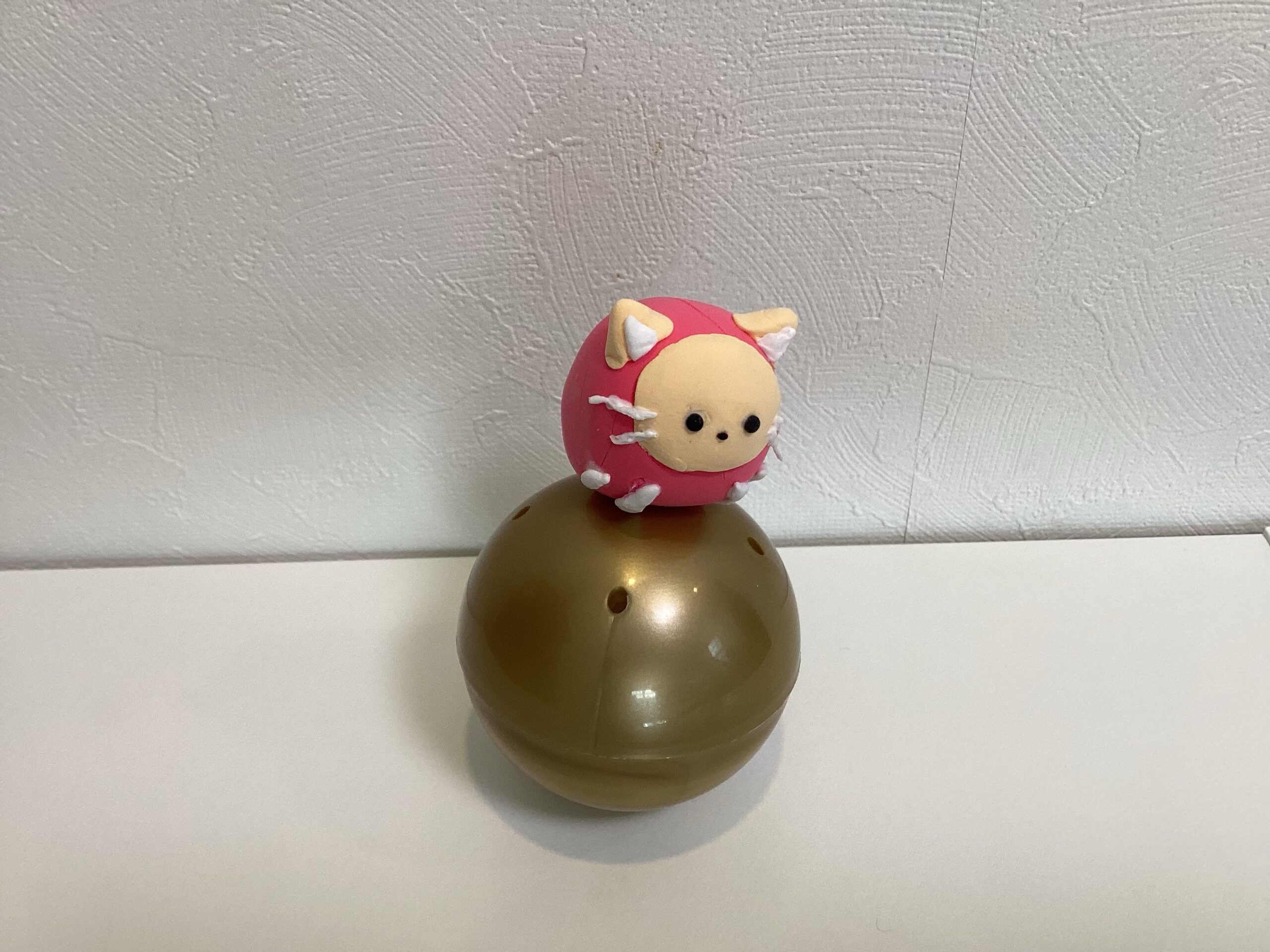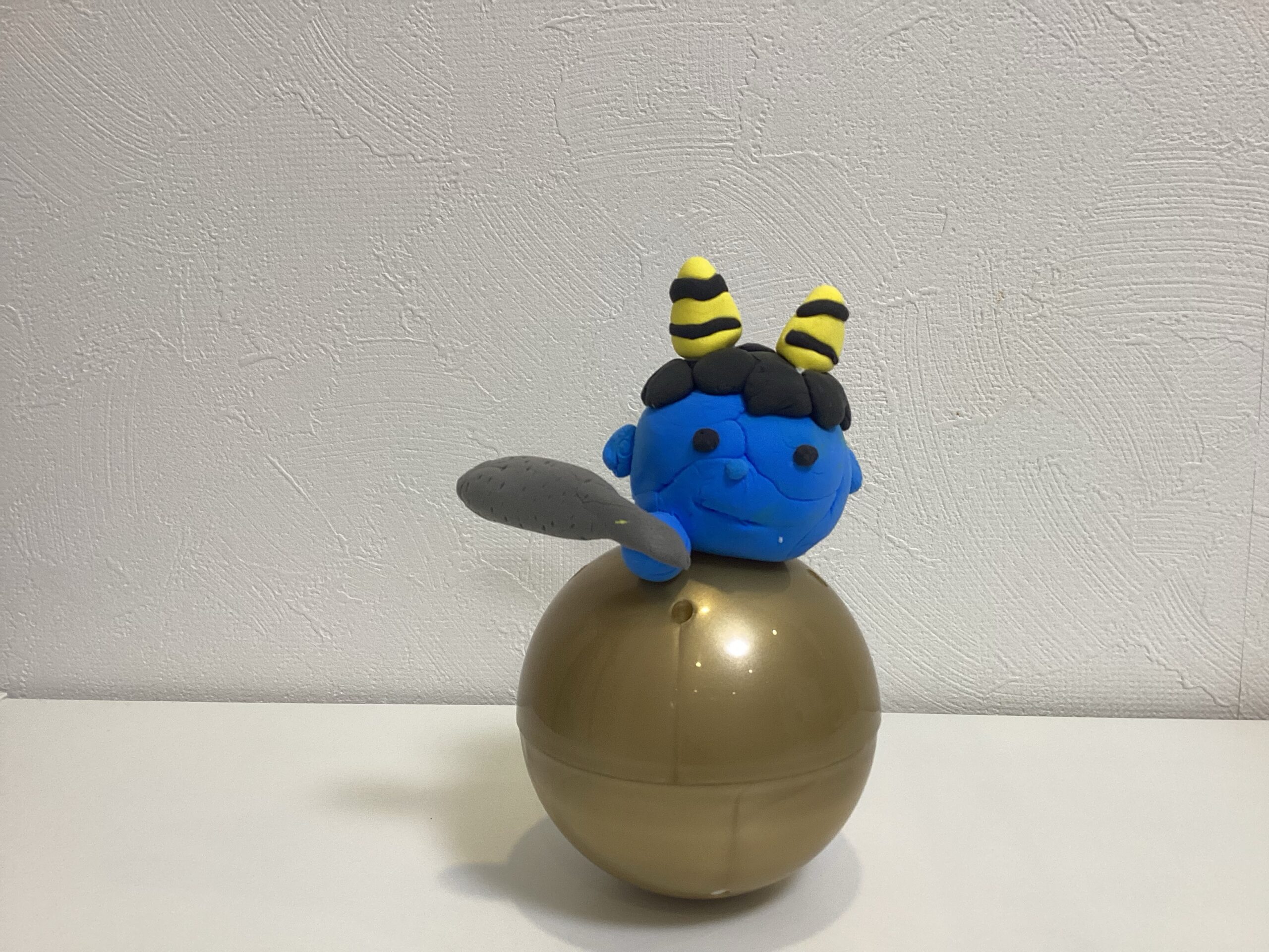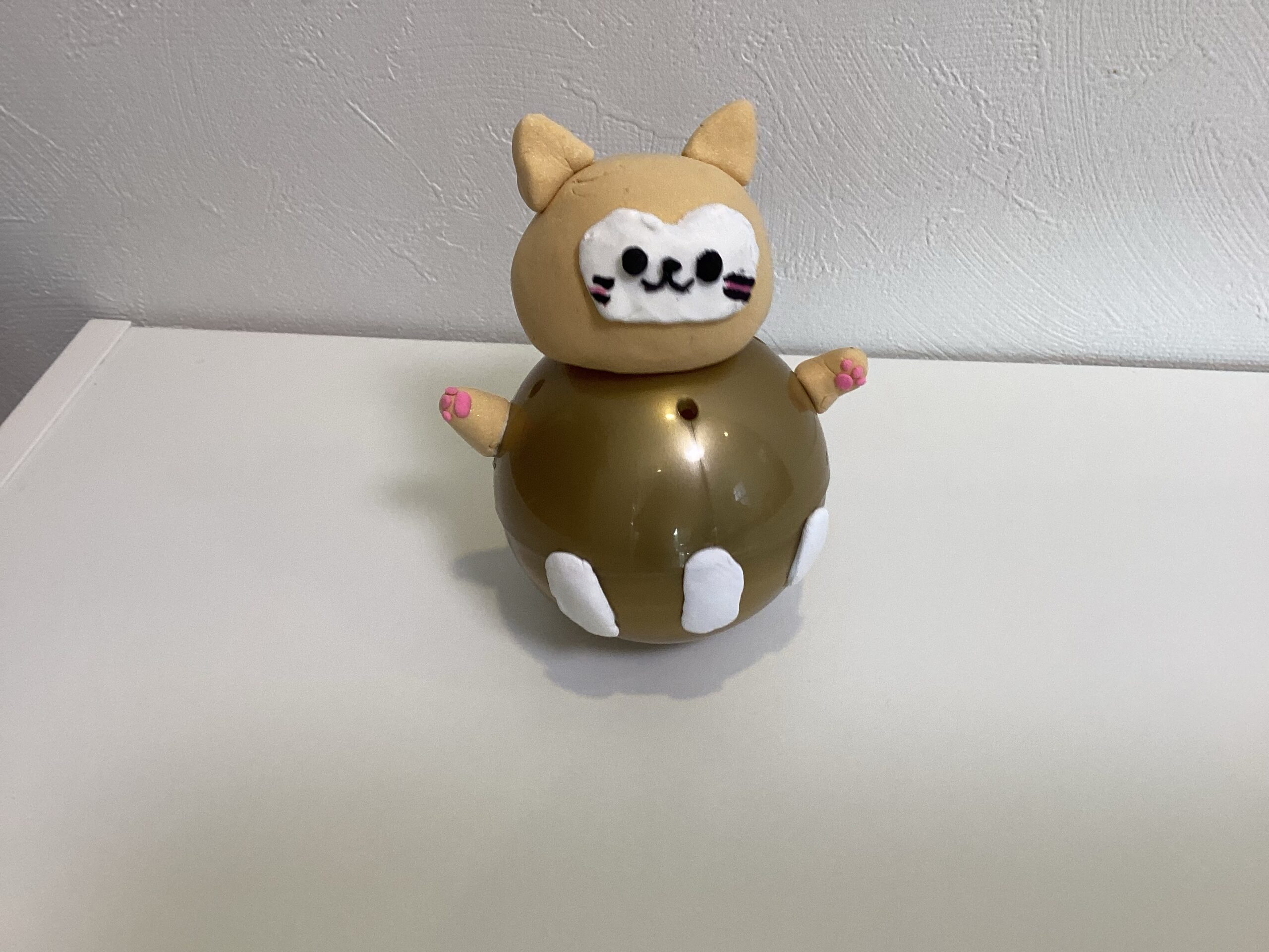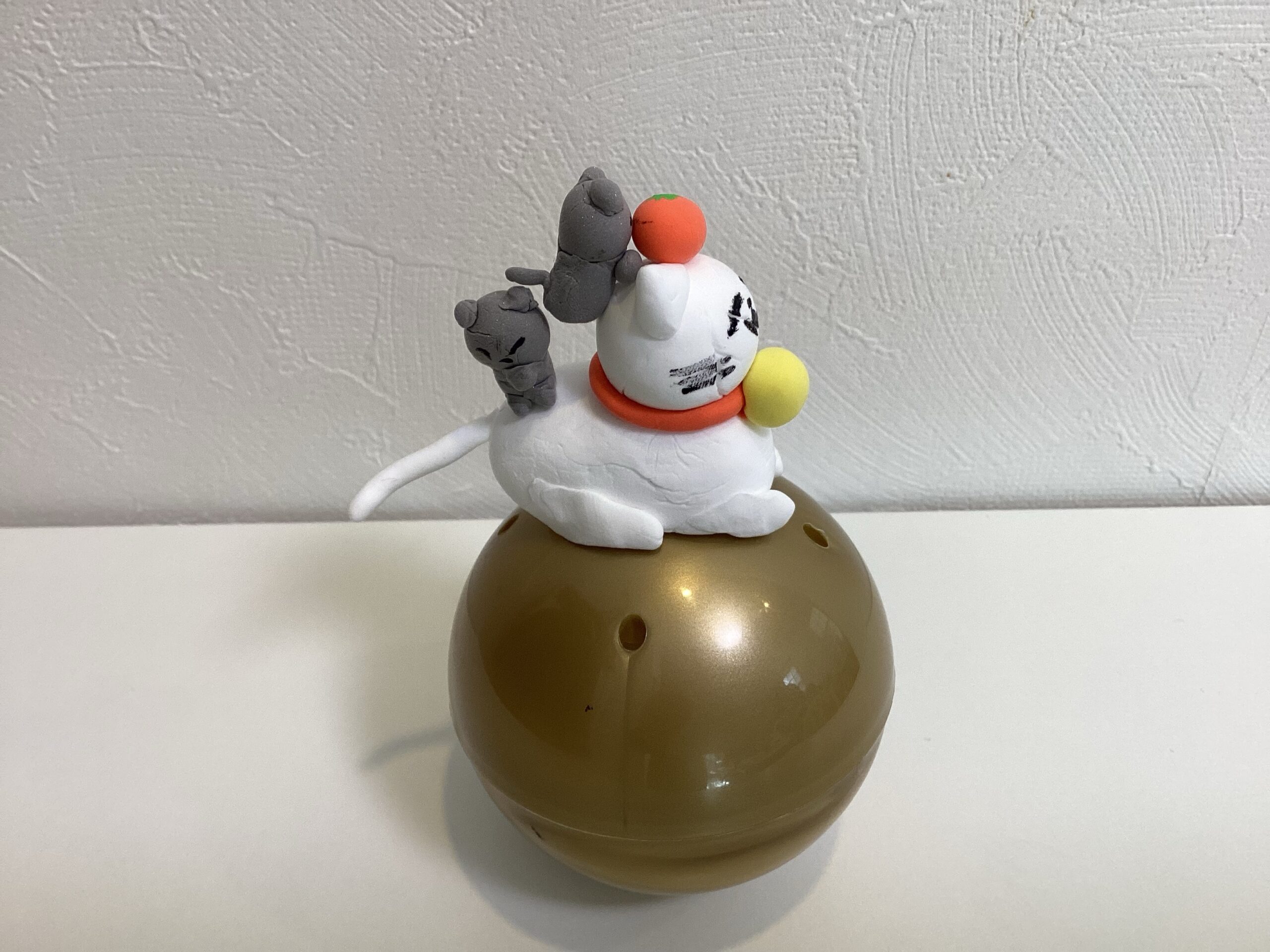 薄い紙を貼り合わせ張り子を作り、その中に錘を入れて作るのが伝統的な起き上がり小法師の作り方ですが、張り子は型を作ったり、乾くまでに数日間かかるため、今回はカプセルトイと紙粘土を使用して作ることにしました。カプセルトイとはガチャガチャ、ガチャポンなどの正式名称です。