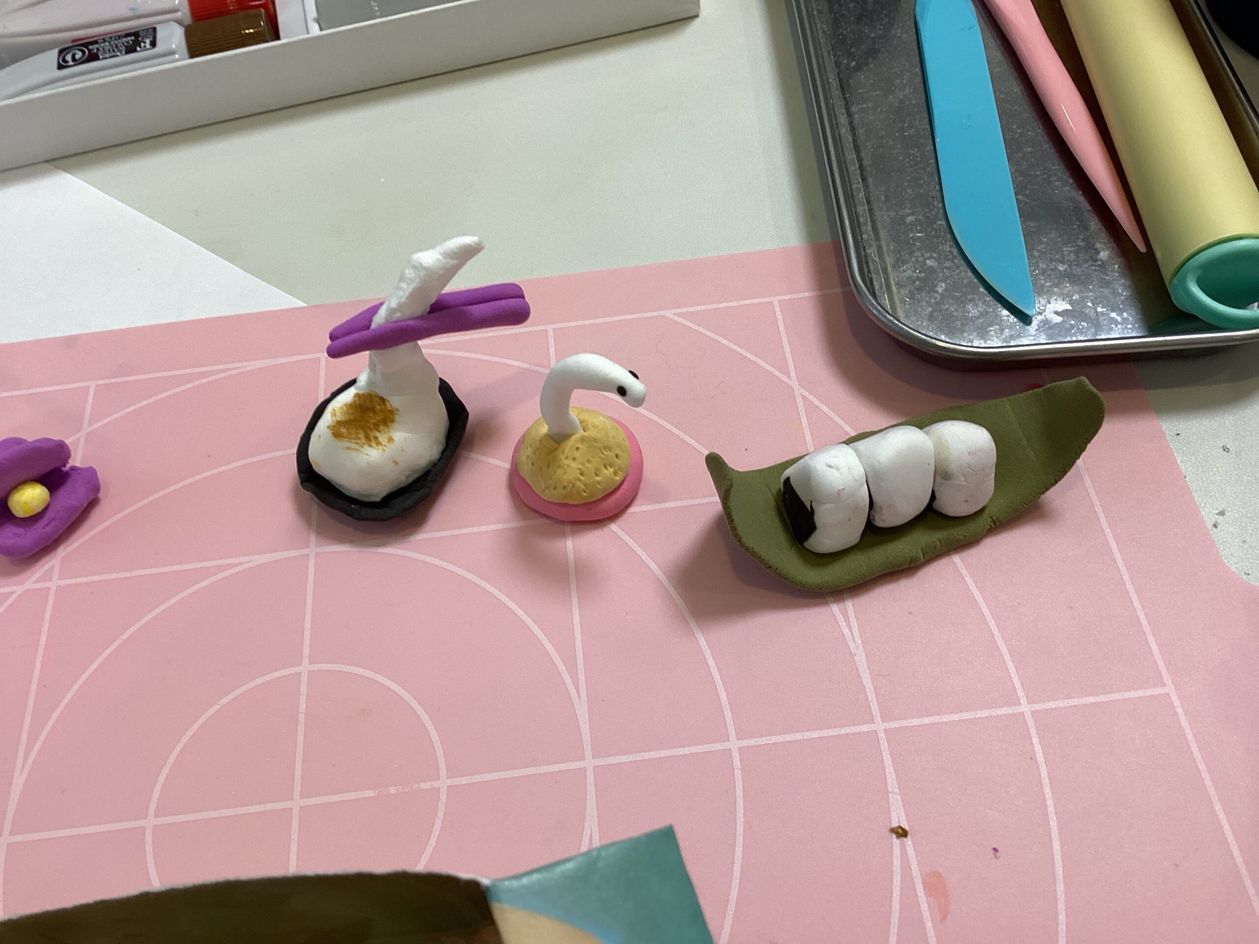 カプセルトイの底に重たい油粘土を入れて、起き上がり小法師の土台となる部分を一斉に作ったら、後は楽しい紙粘土工作です。
