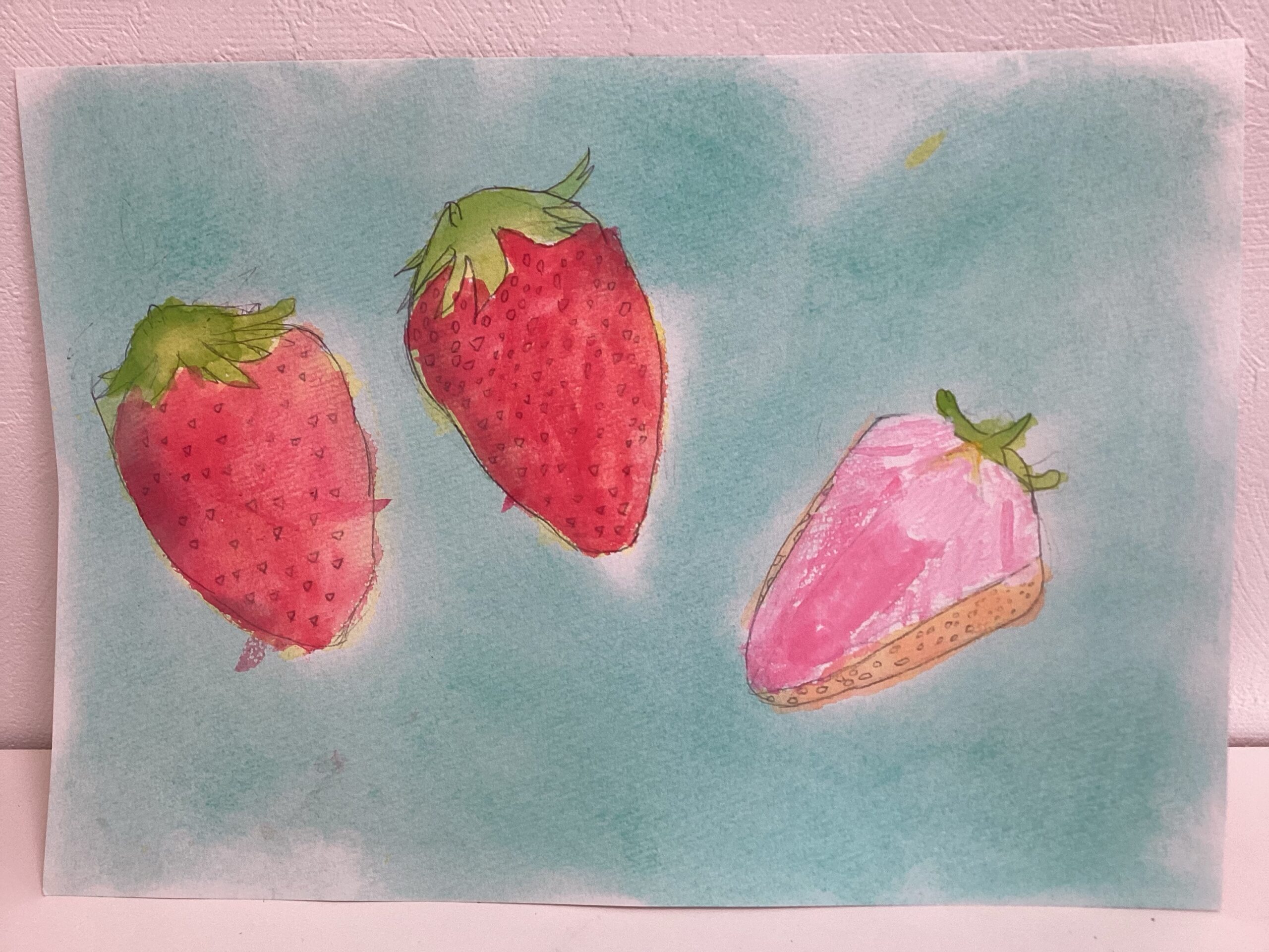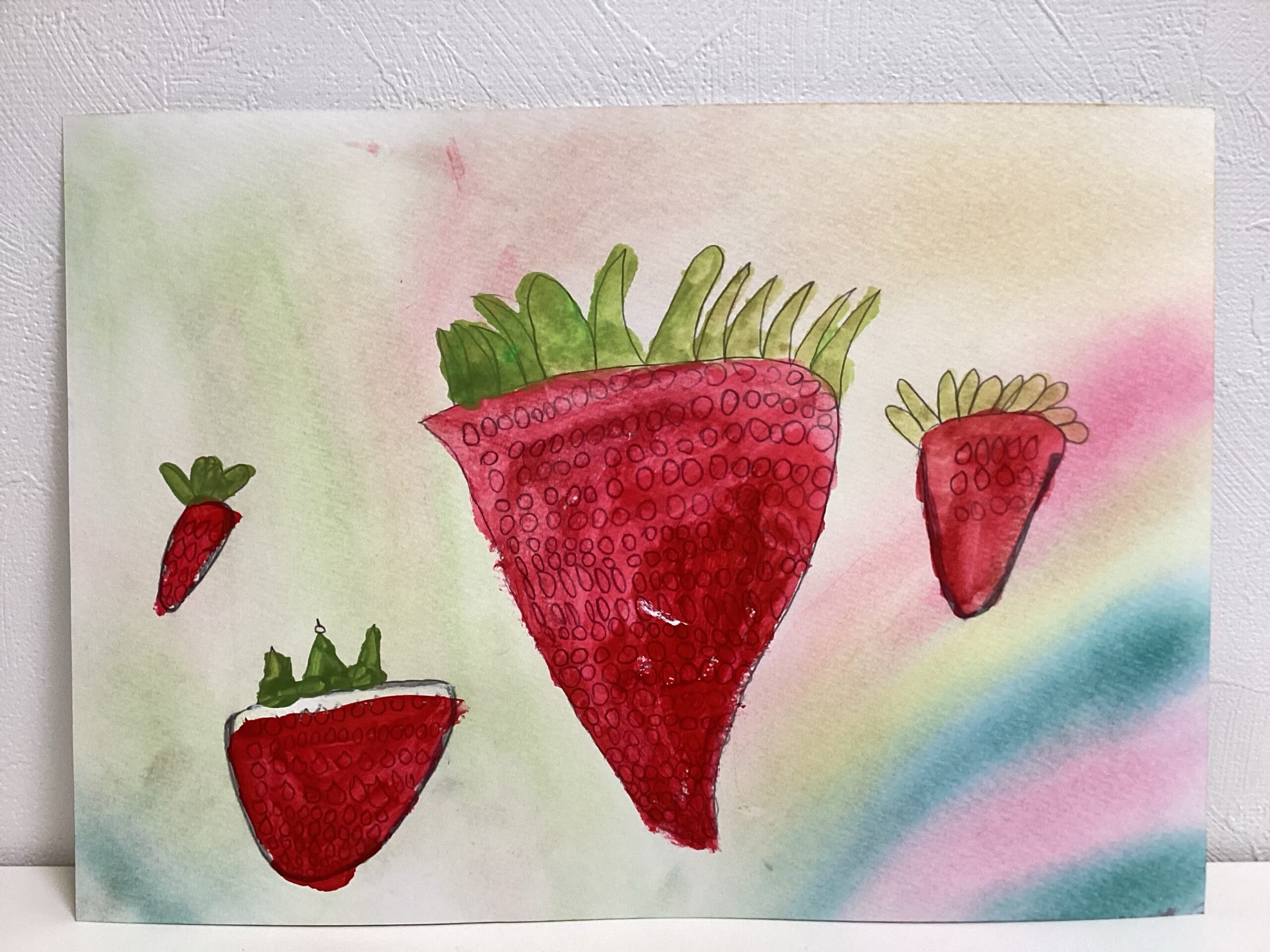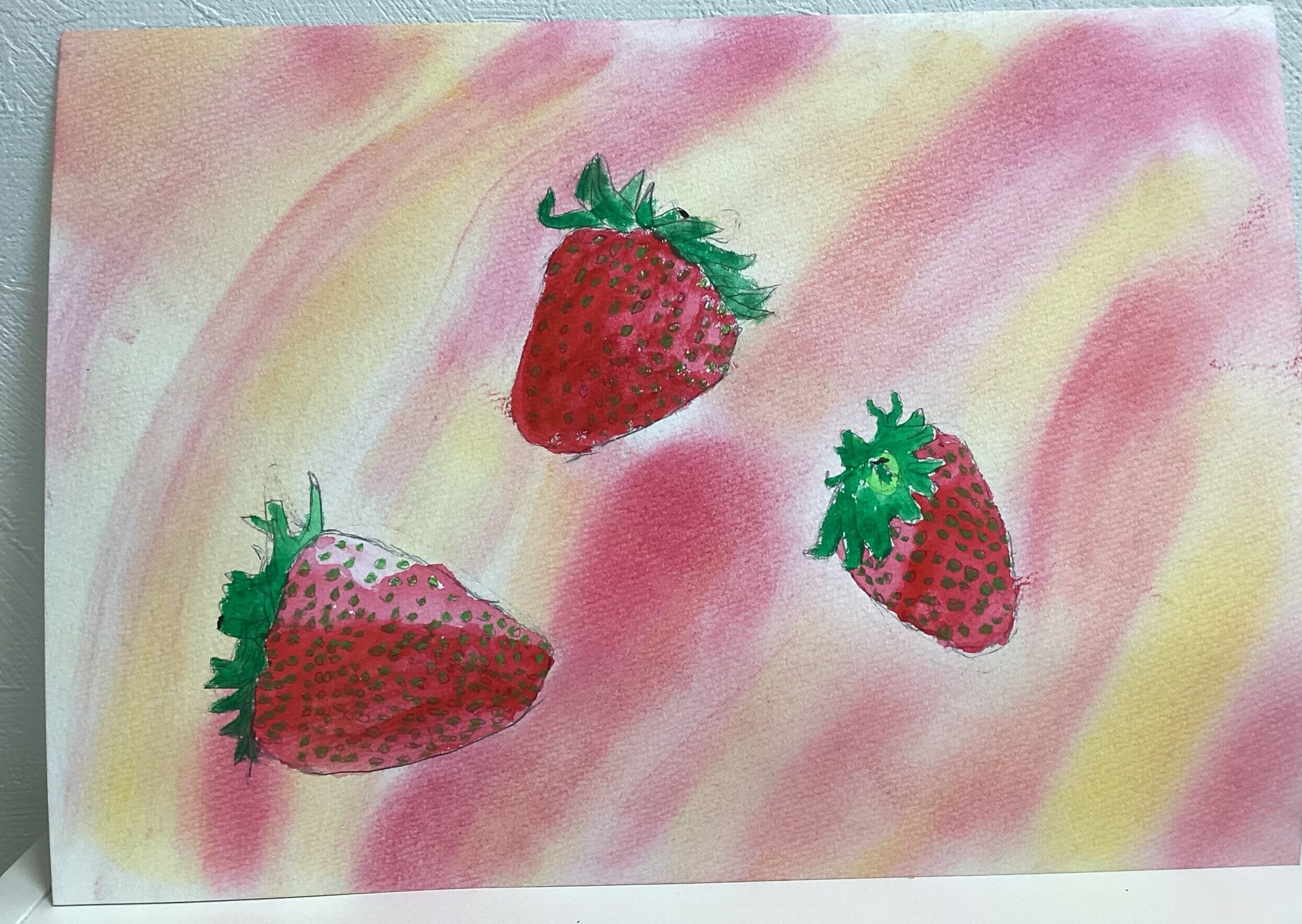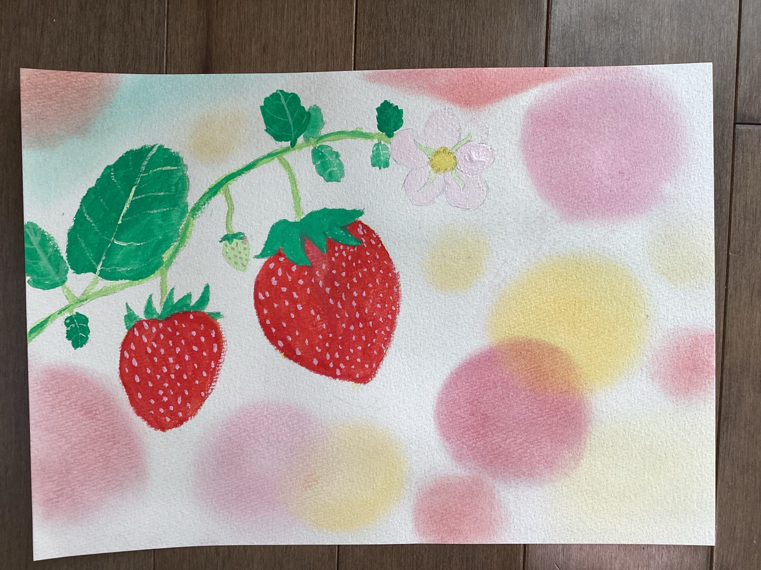 苺が描き終わったら、春らしさが表現し易いパステルで背景を塗りました。同じ描き方をしている背景が殆どないことに、生き生きとした個性を感じたレッスンでした。