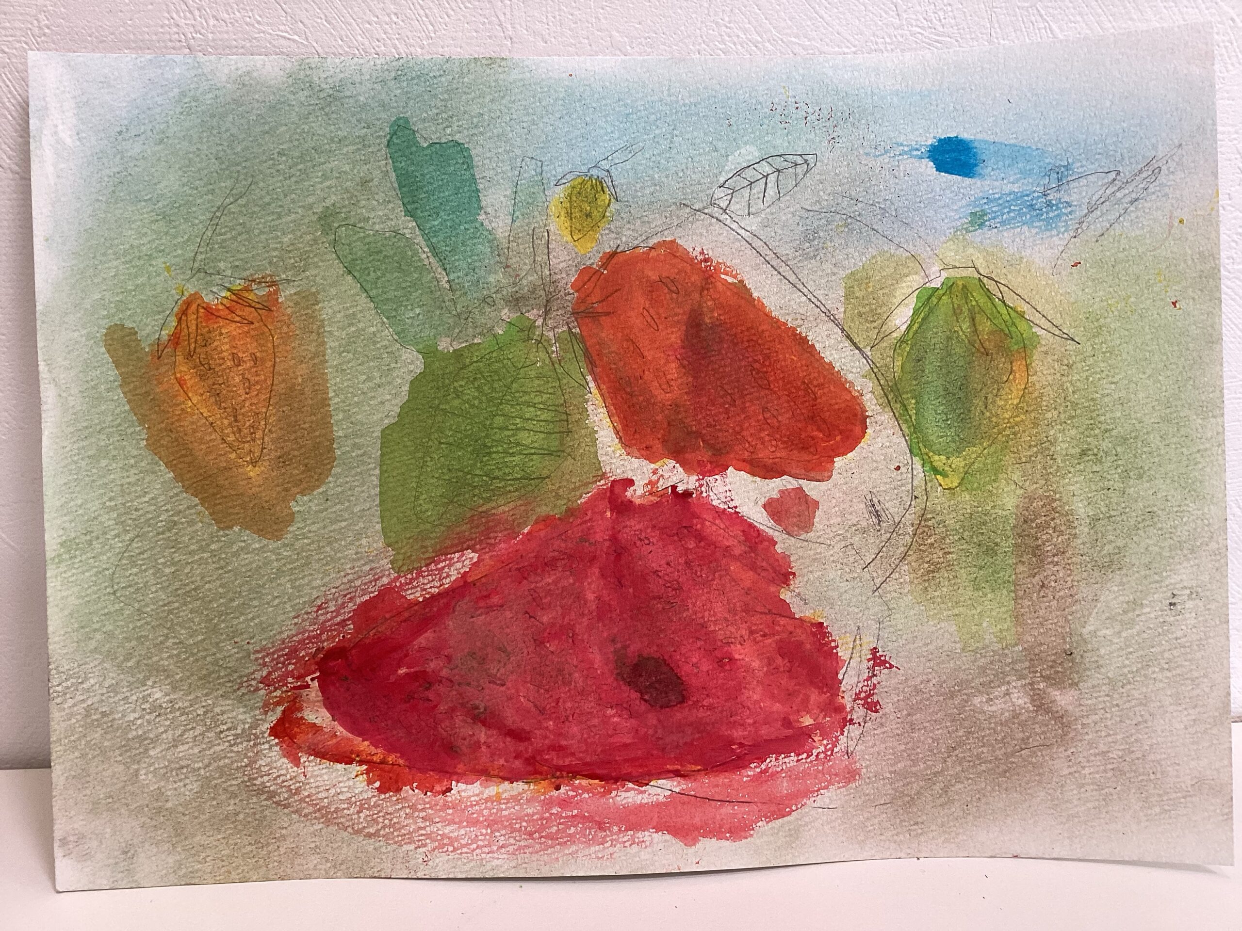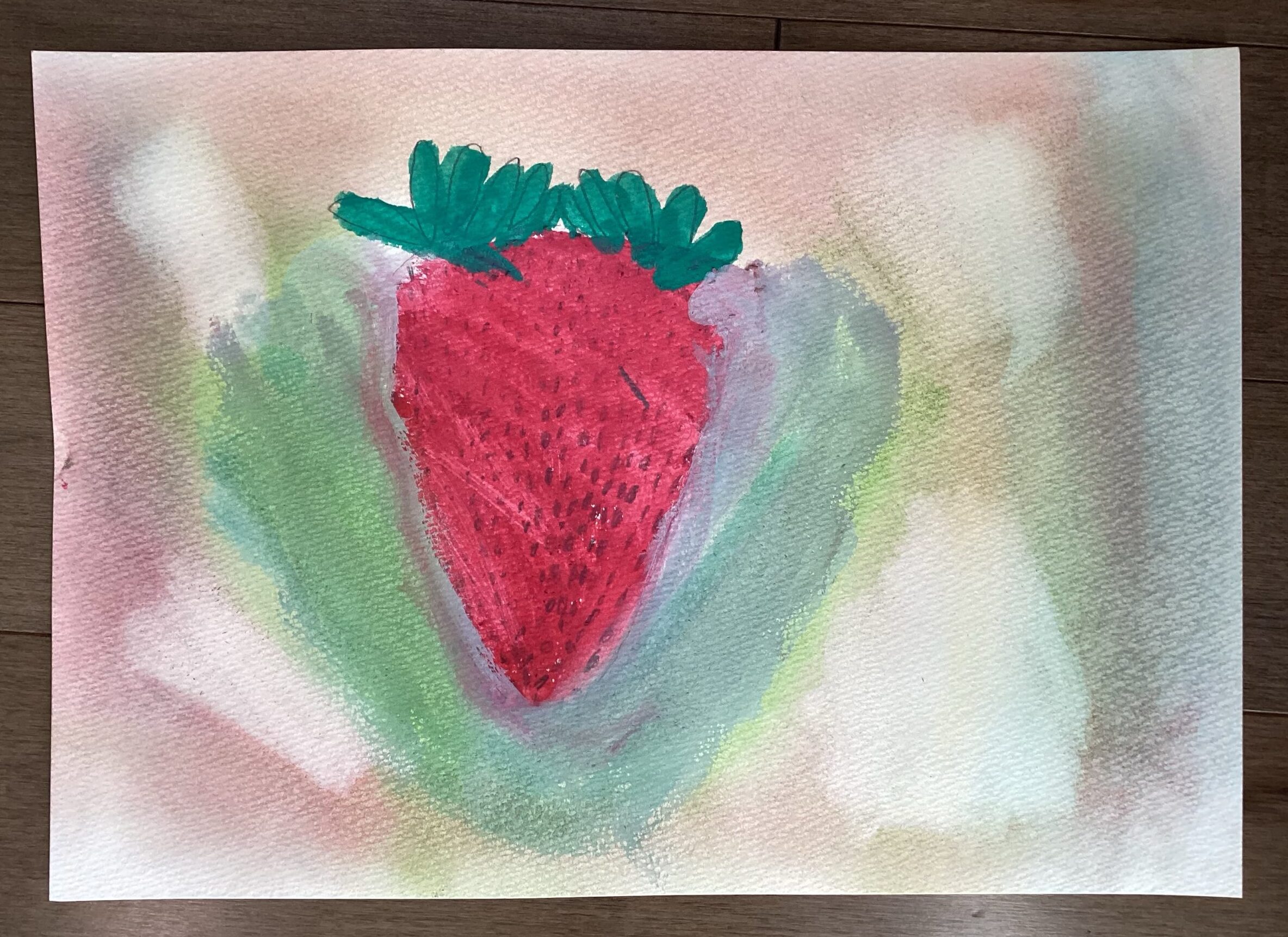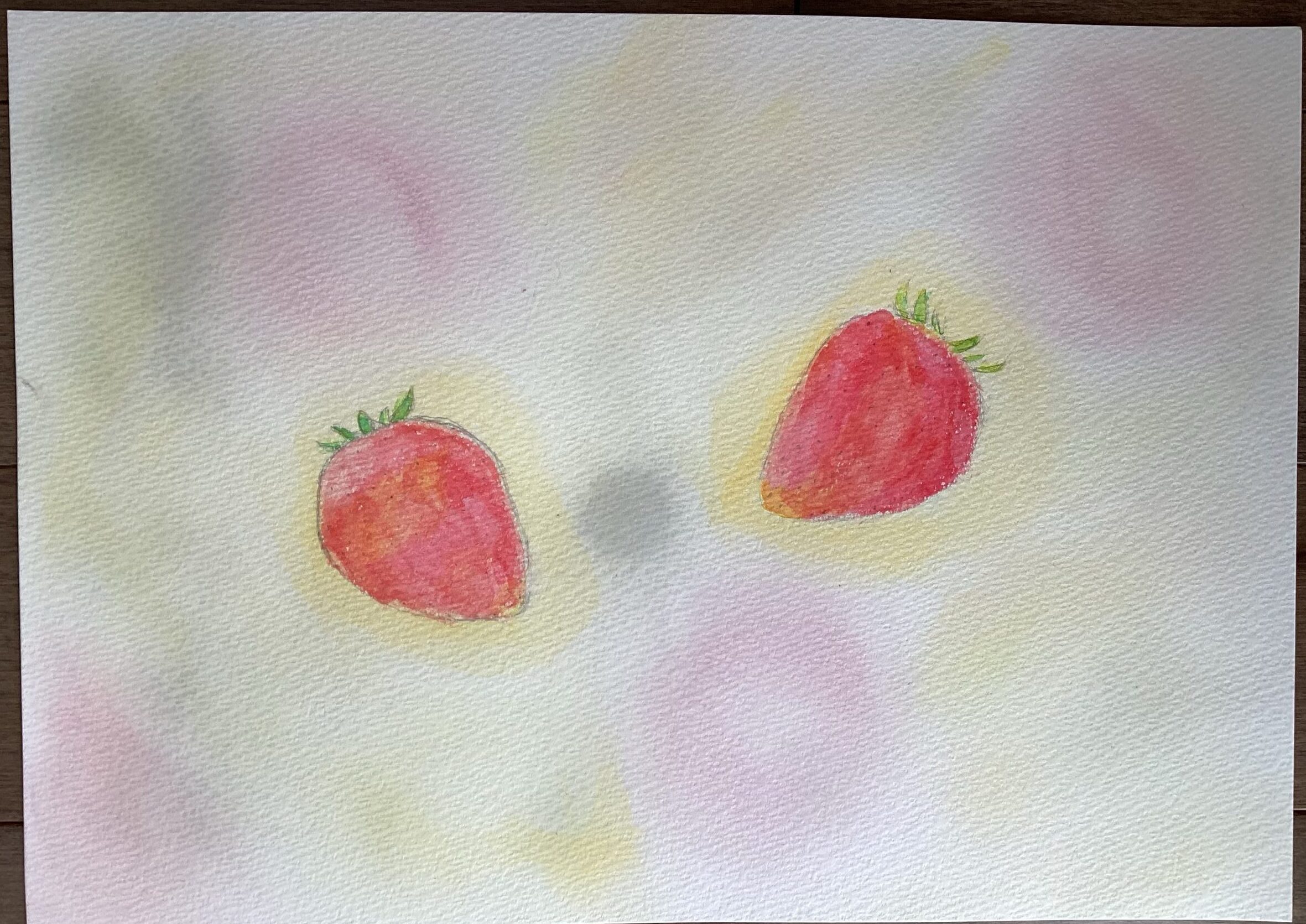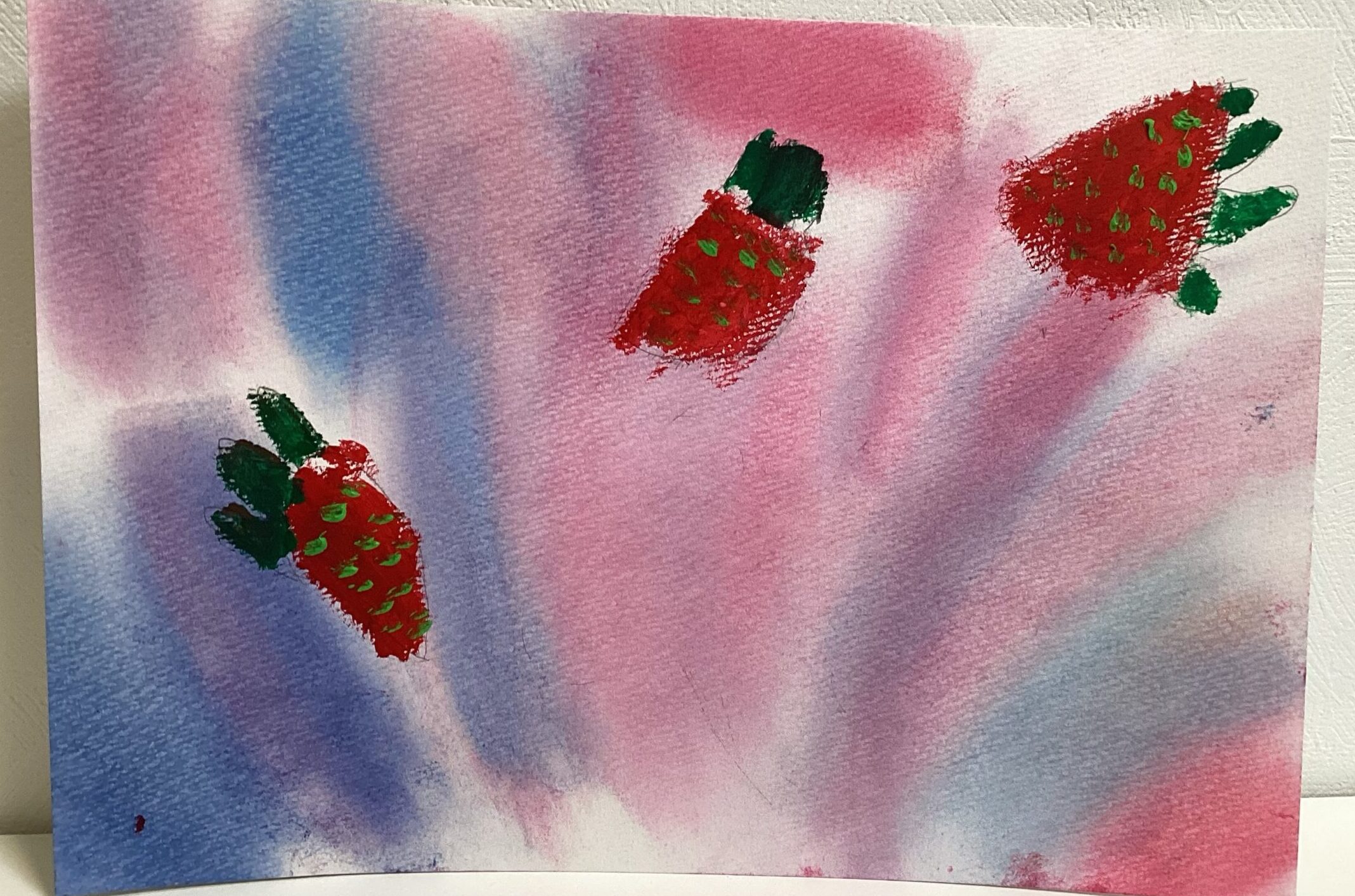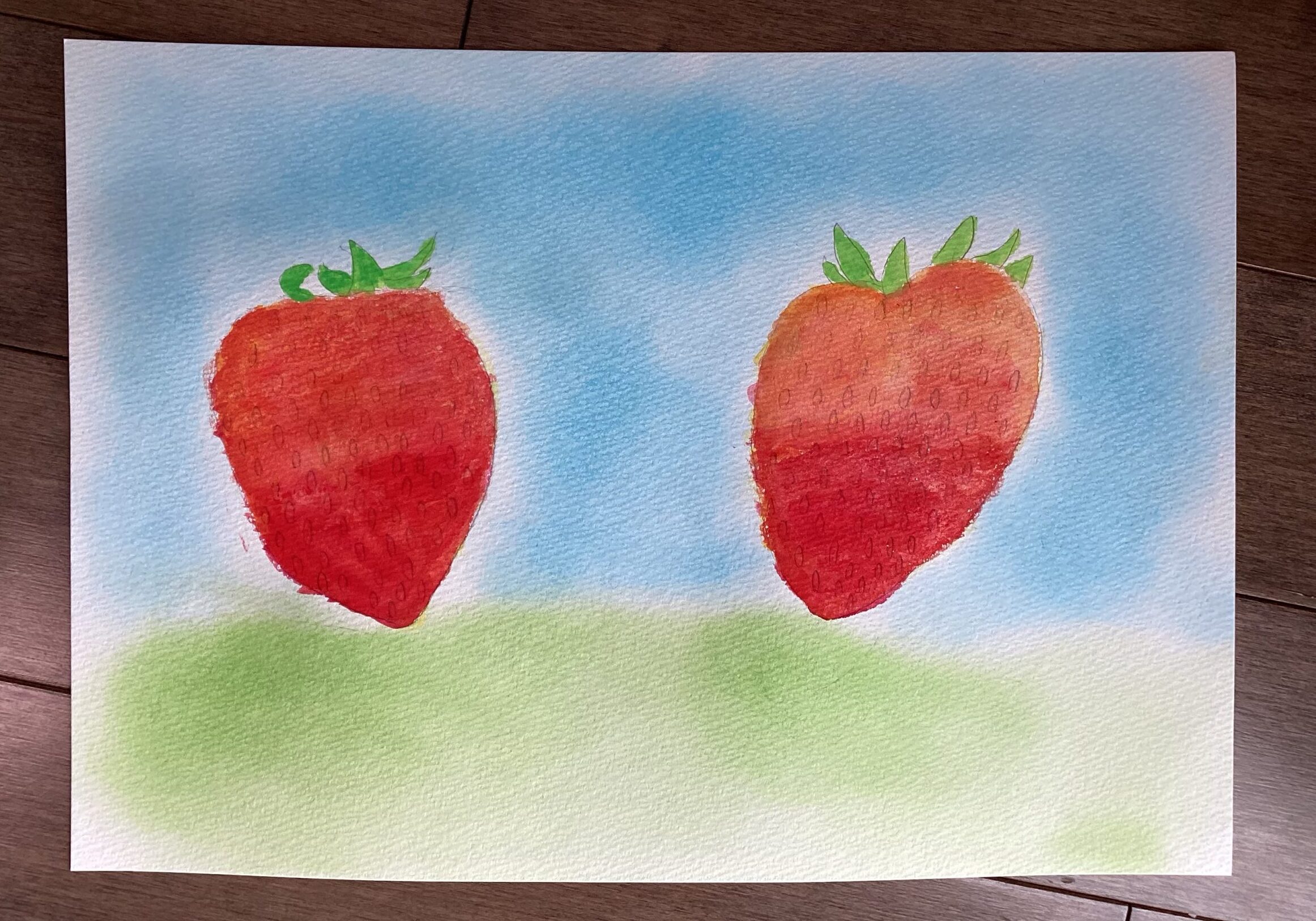 苺が描き終わったら、春らしさが表現し易いパステルで背景を塗りました。同じ描き方をしている背景が殆どないことに、生き生きとした個性を感じたレッスンでした。