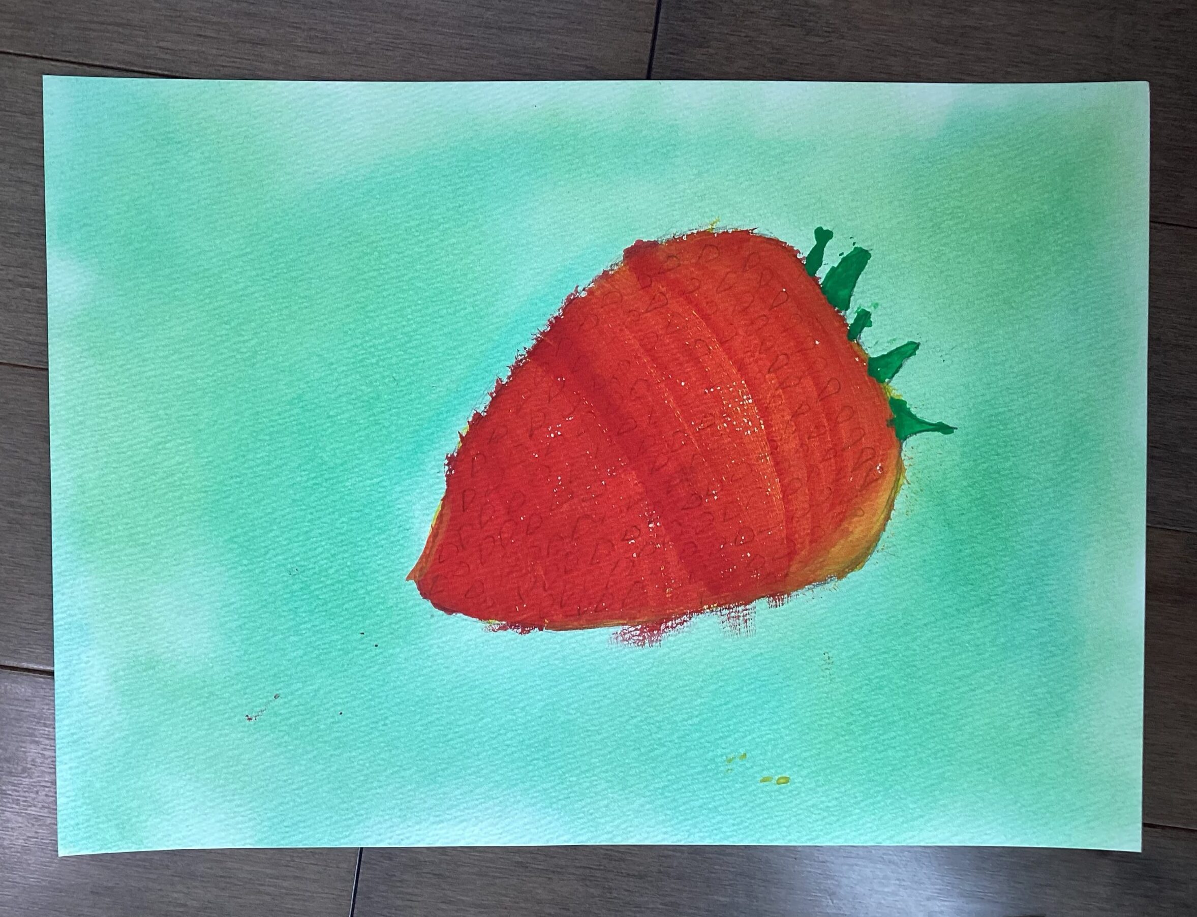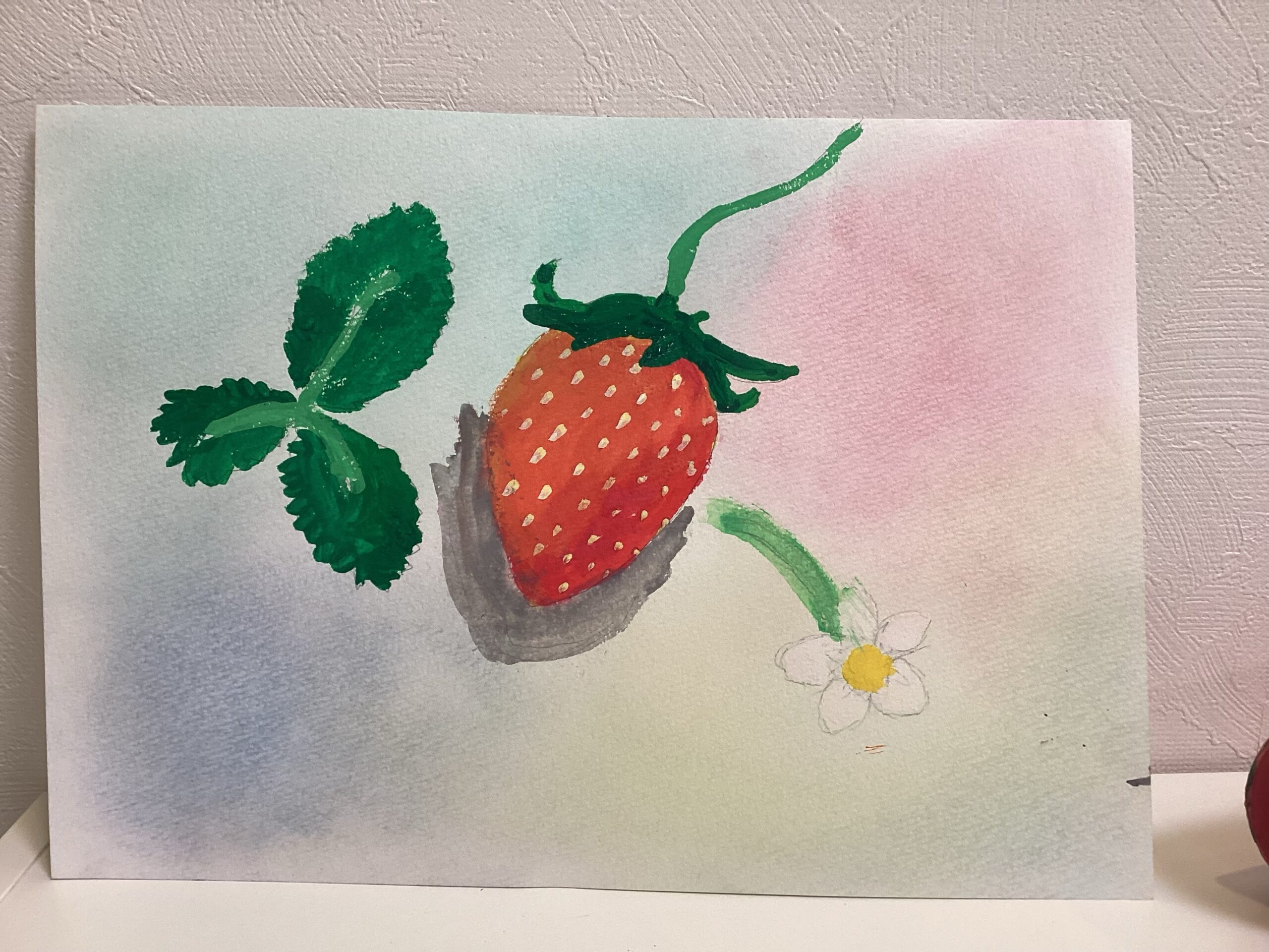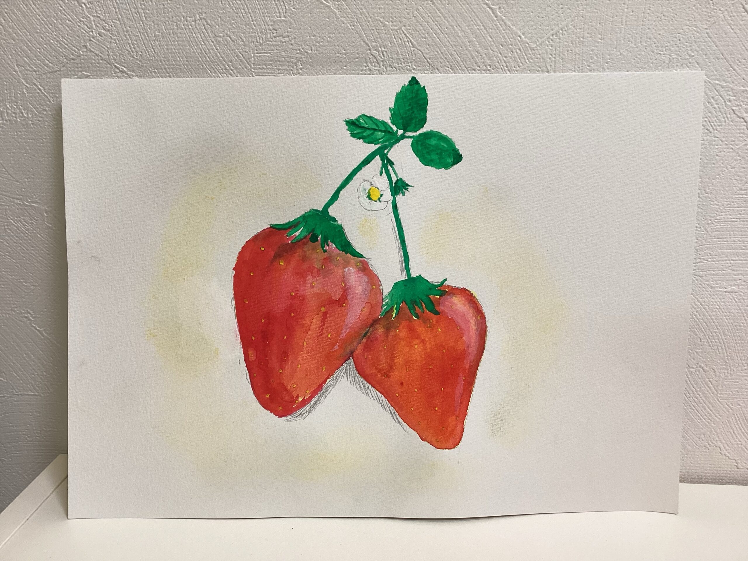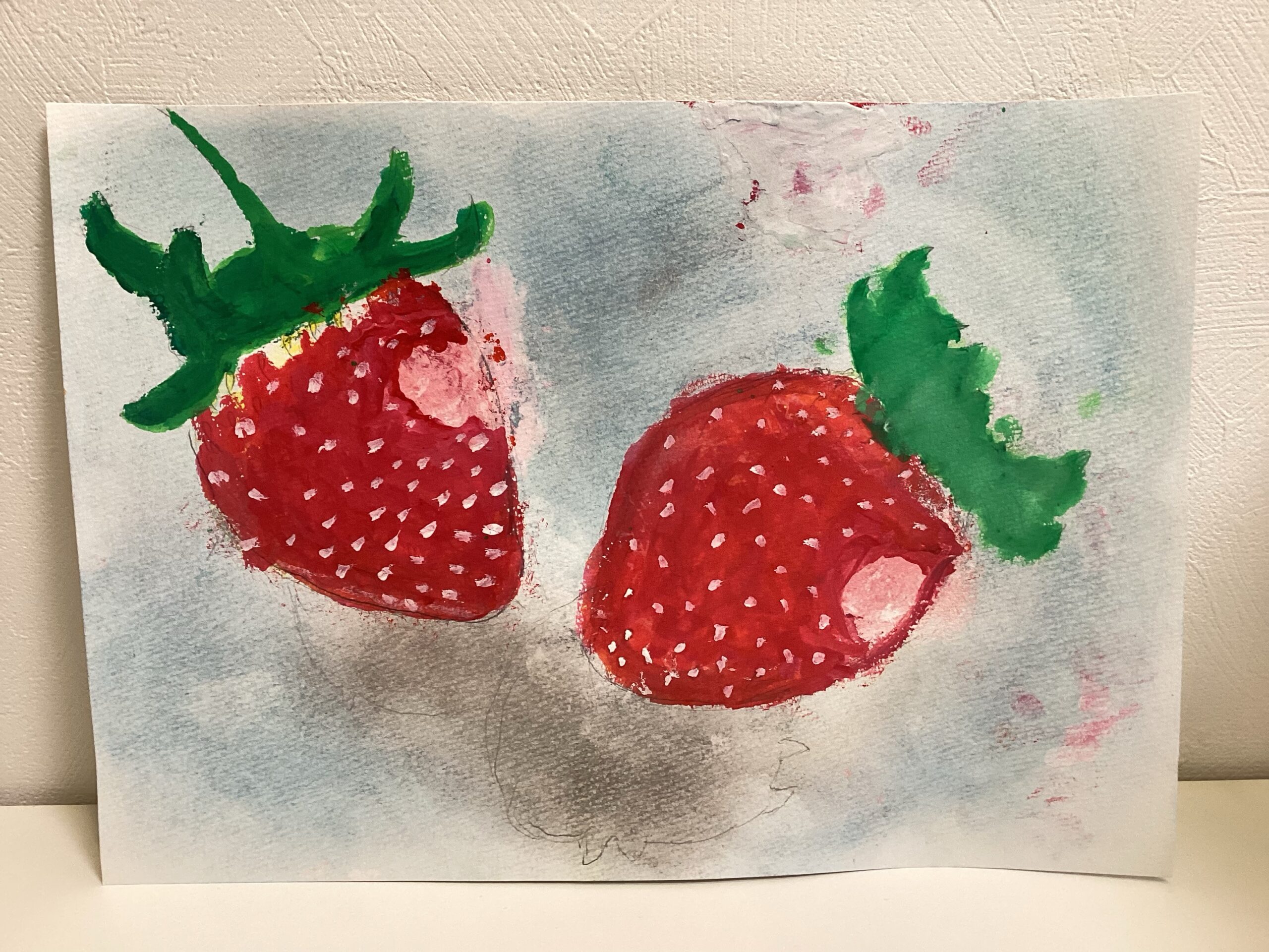 苺は鉛筆で下書きをした後に、絵の具で描きました。苺を描く際に、どうしてもチューブから出した赤をそのまま使った絵になりがちなため、最初に淡く黄色を塗ってから乾かし、赤を重ね塗りしていただく方法を今回は試しました。