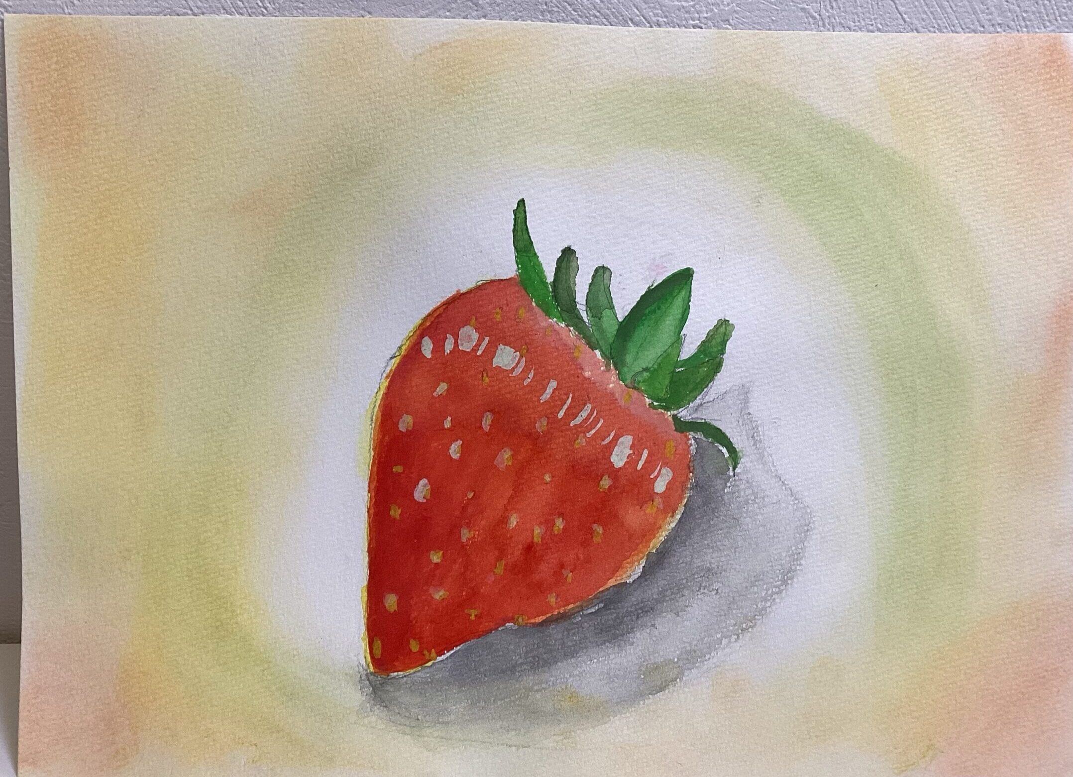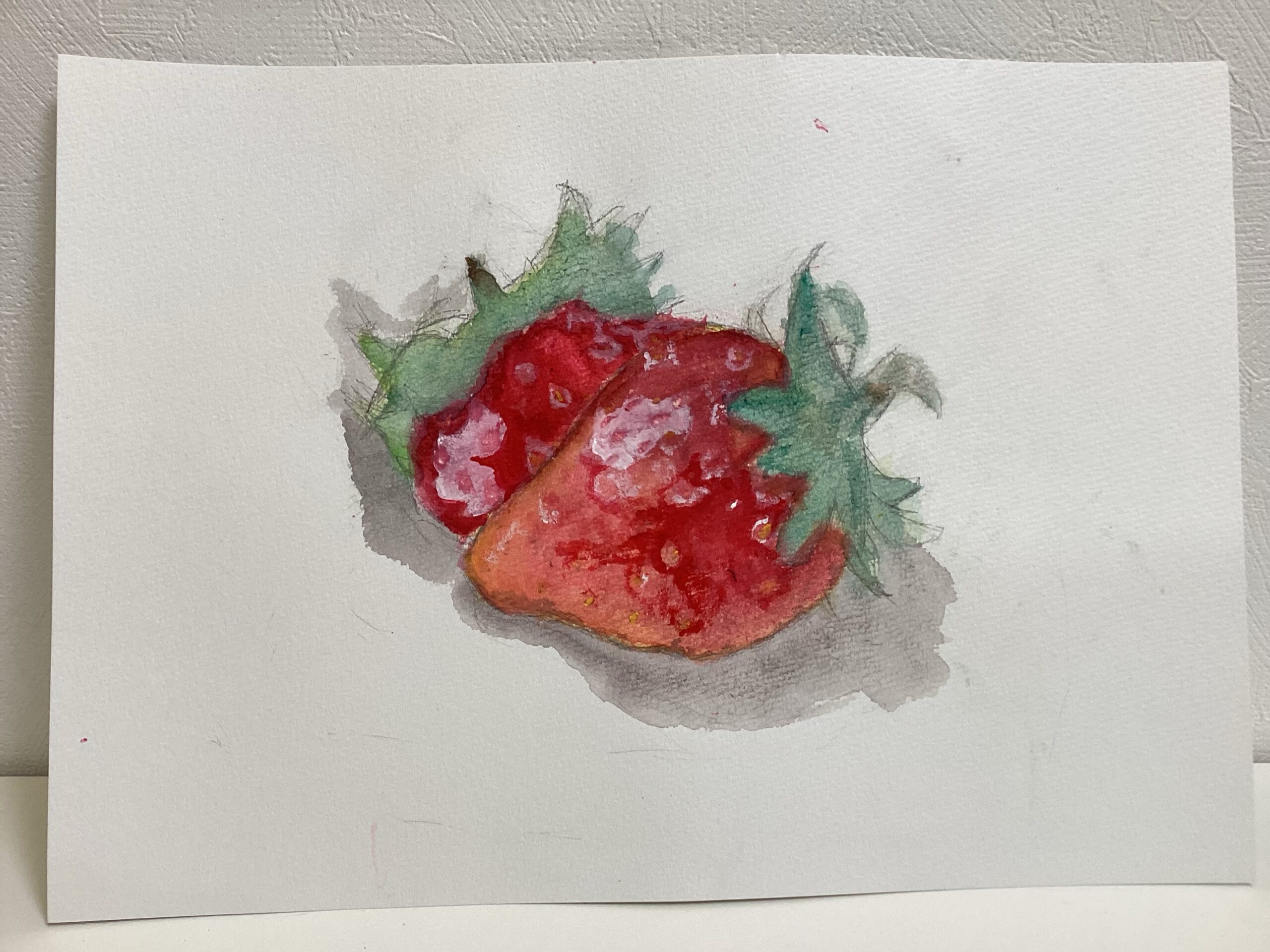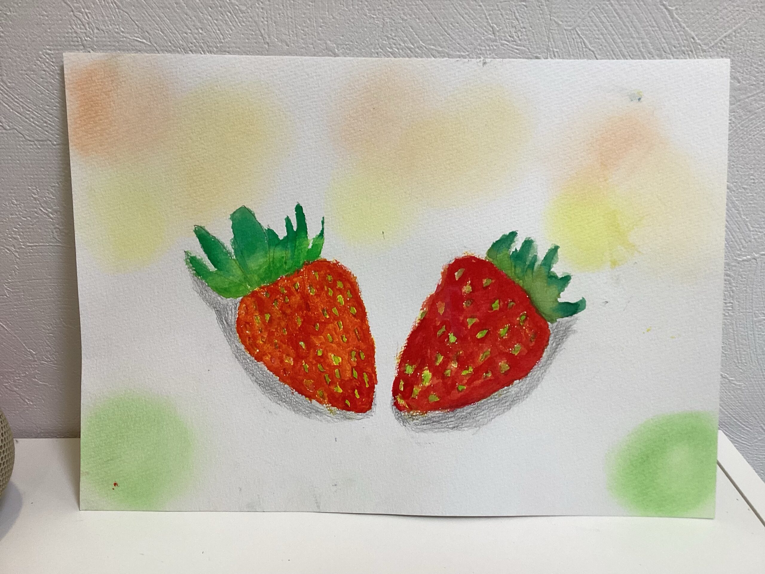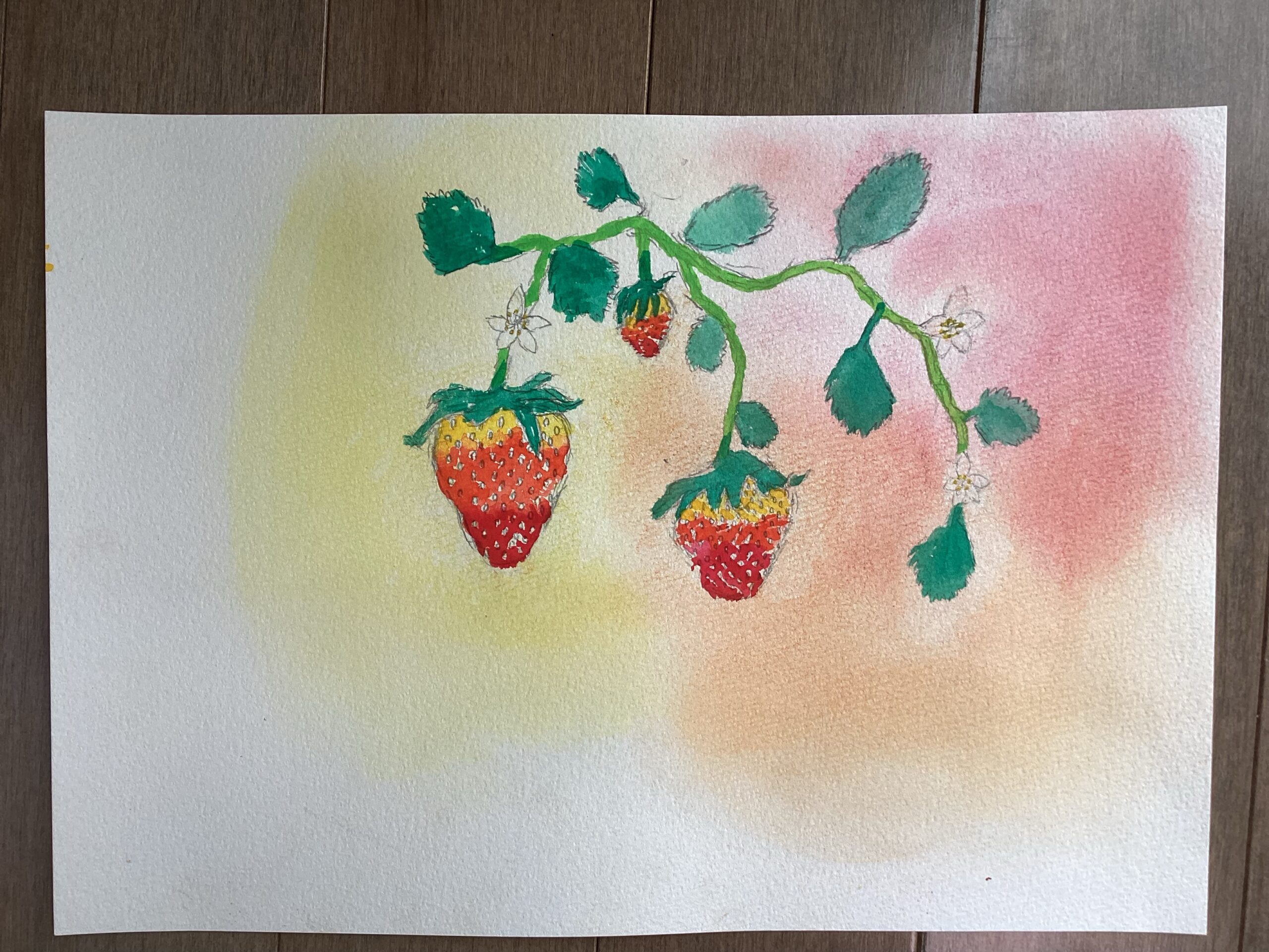 苺は鉛筆で下書きをした後に、絵の具で描きました。苺を描く際に、どうしてもチューブから出した赤をそのまま使った絵になりがちなため、最初に淡く黄色を塗ってから乾かし、赤を重ね塗りしていただく方法を今回は試しました。